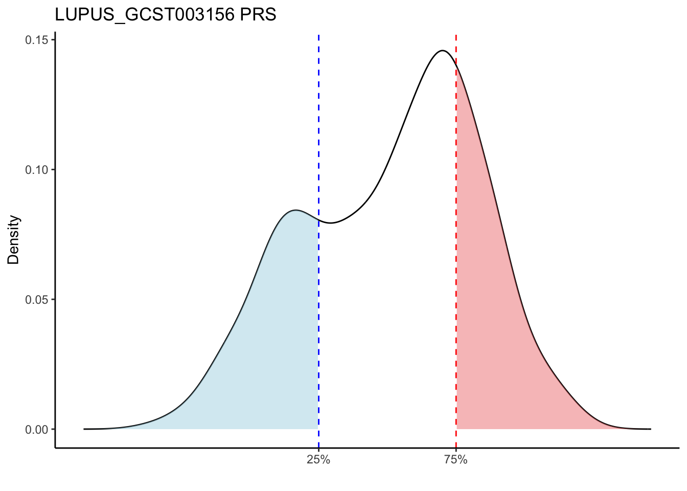 Compared to other traits, LUPUS_GCST011096 and LUPUS_GCST003156 traits are more sensitive to population substructures. The LUPUS_GCST011096 and LUPUS_GCST003156 traits show a bimodal distribution of PRS, which can likely be attributed to the presence of both non-European and European ancestry data in the GTEx data. These two groups may have distinct genetic backgrounds or environmental exposures, leading to differing risk profiles, and thus a bimodal distribution of PRS.