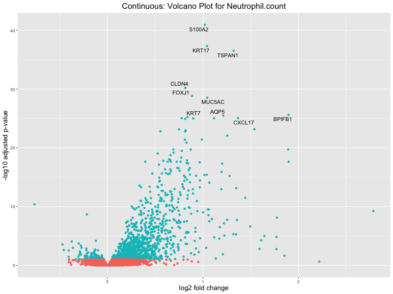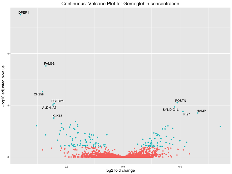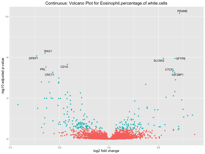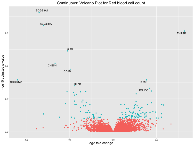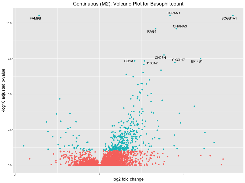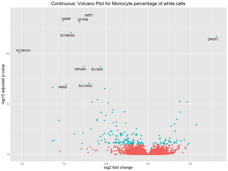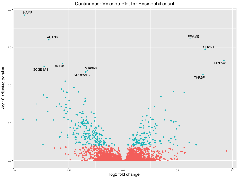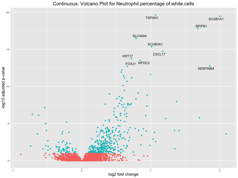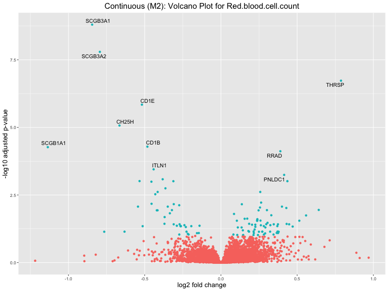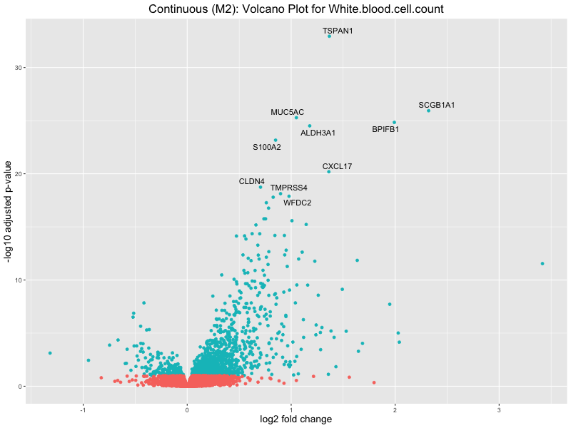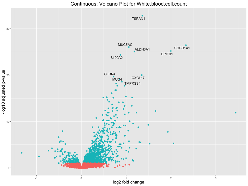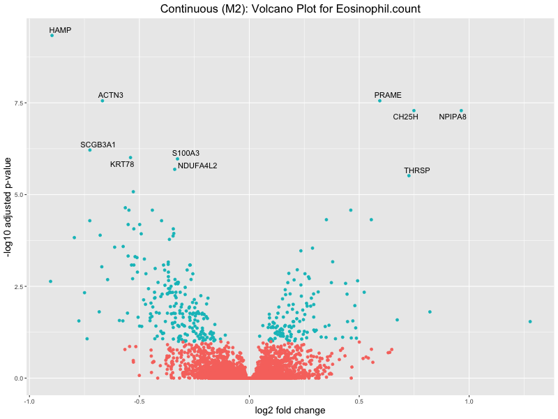 To account for population stratification, we adjusted the model by including the first two genotype principal components (PCs), as they explain most of the genetic variation in the data. For Eosinophil count, we observed that genes were consistently identified as top differentially expressed with and without adjustment. The only difference is that instead of SLC6A9, WFDC2 was detected as top 10 DEGs when adjusting for the first two genotype PCs. WFBC2 is a protease inhibitor with a potential role in innate immune defense (L Bingle, 2006). Although same genes are identified as top DEGs for continuous analysis, additional pathways such as response to inactivity were highlighted when adjusting for the first two genotype PCs.