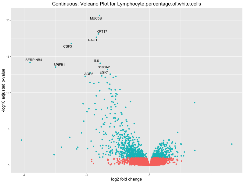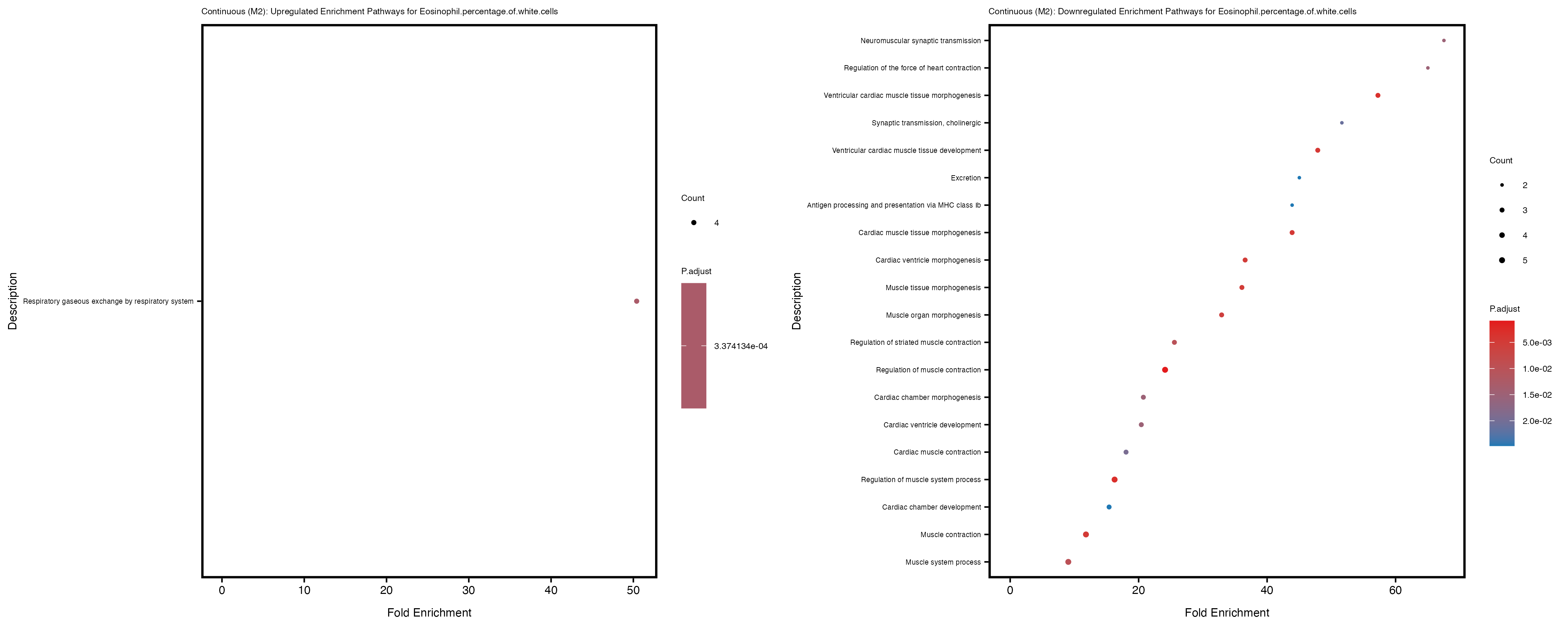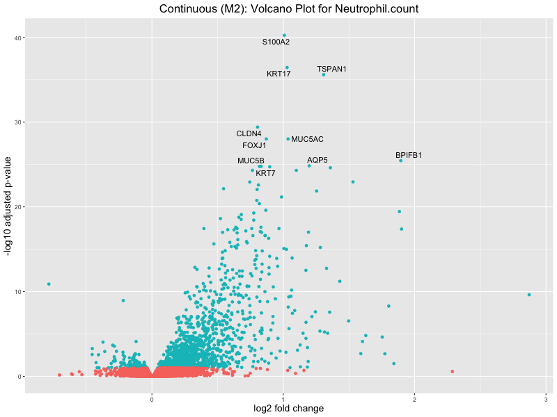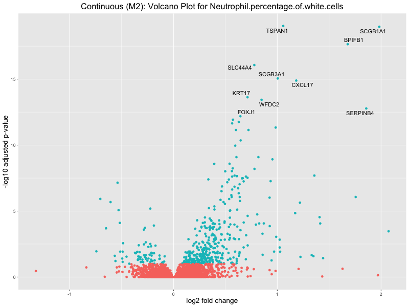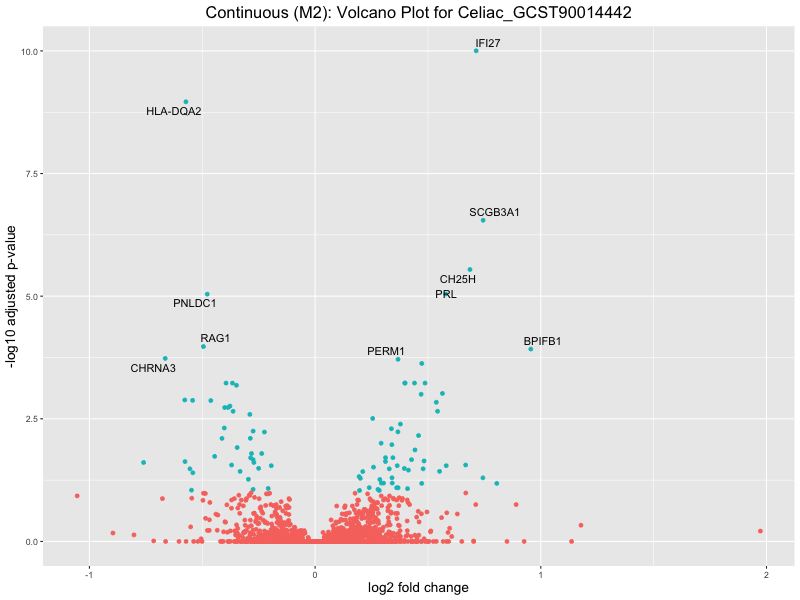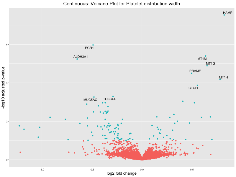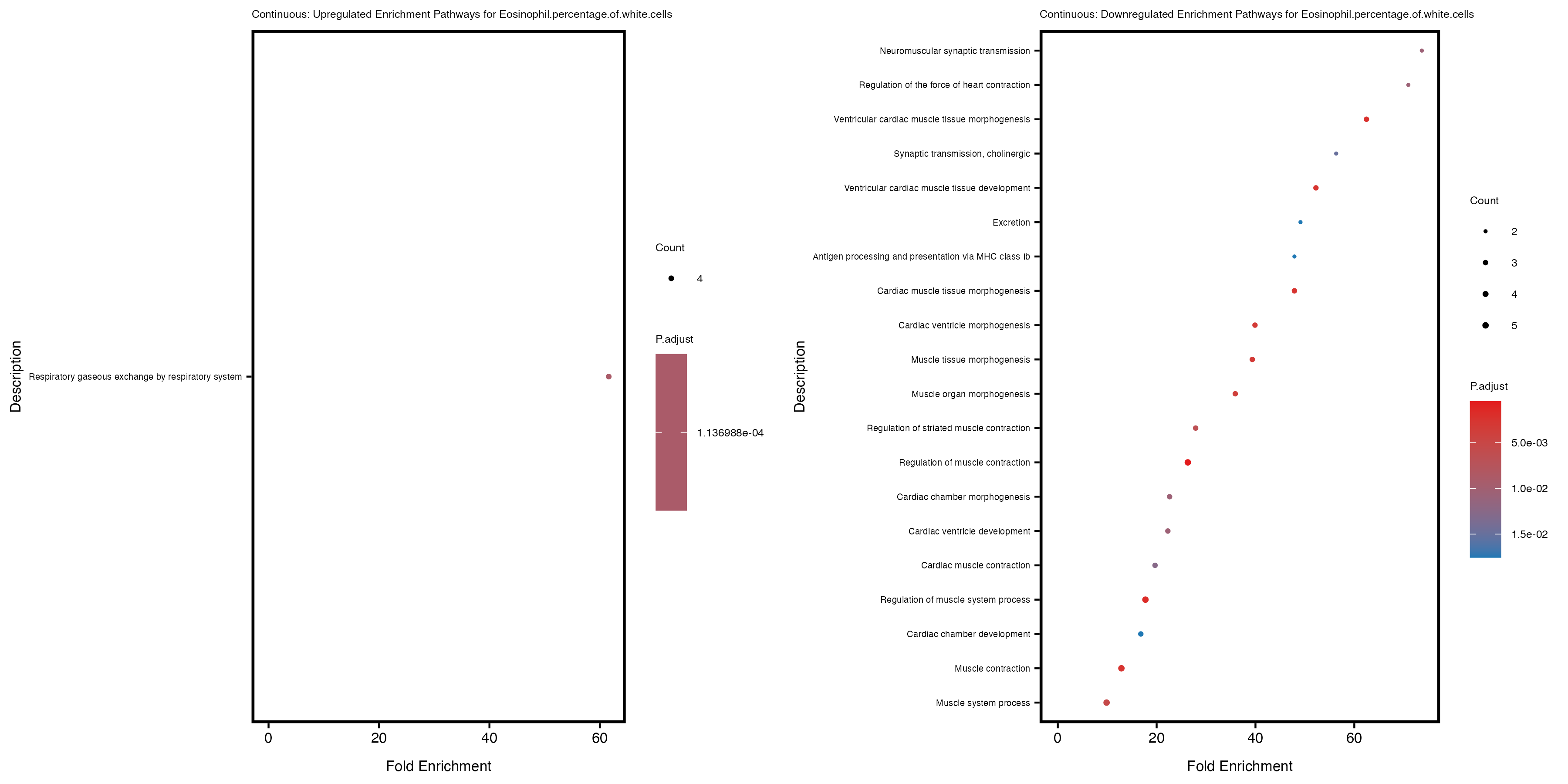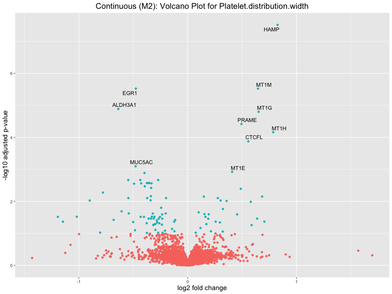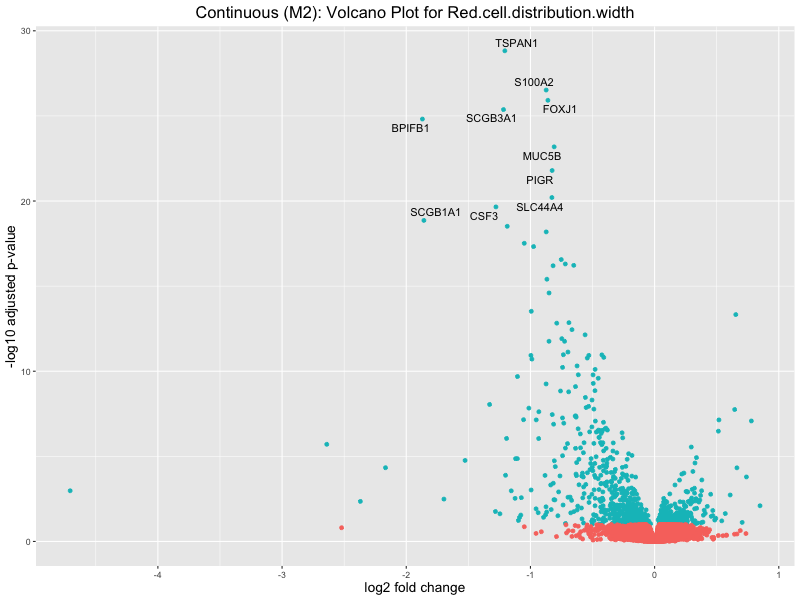 To account for population stratification, we adjusted the model by including the first two genotype principal components (PCs), as they explain most of the genetic variation in the data. For Eosinophil count, we observed that genes were consistently identified as top differentially expressed with and without adjustment. The only difference is that instead of SLC6A9, WFDC2 was detected as top 10 DEGs when adjusting for the first two genotype PCs. WFBC2 is a protease inhibitor with a potential role in innate immune defense (L Bingle, 2006). Although same genes are identified as top DEGs for continuous analysis, additional pathways such as response to inactivity were highlighted when adjusting for the first two genotype PCs.