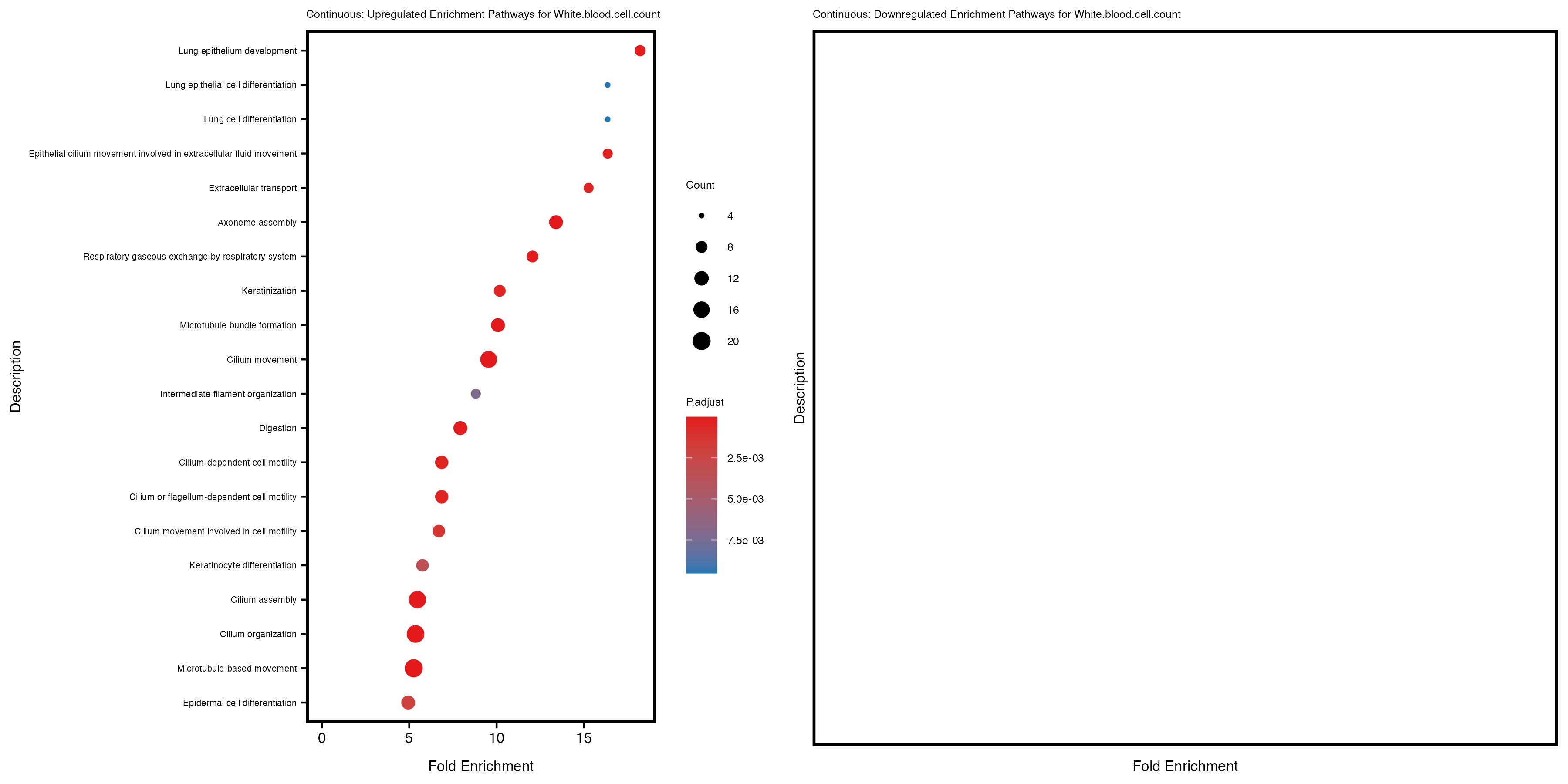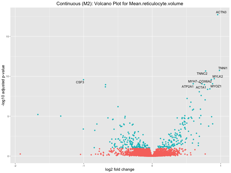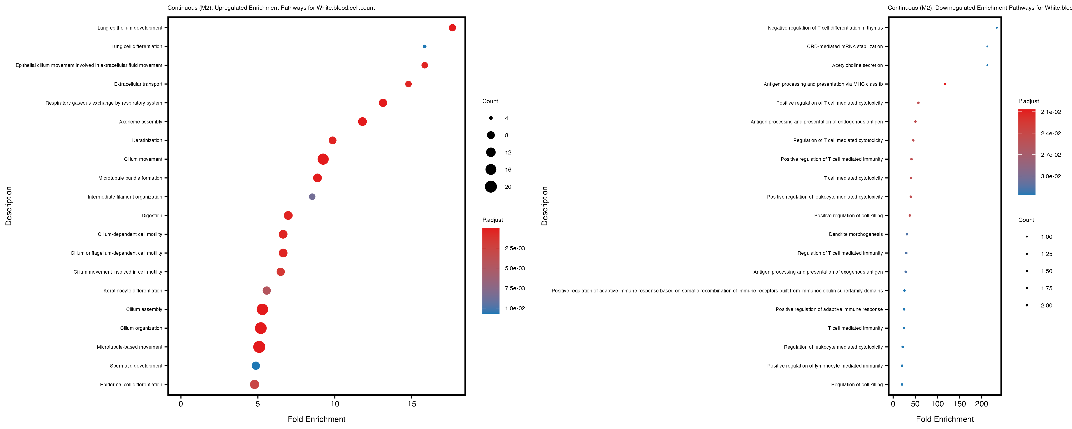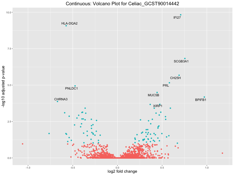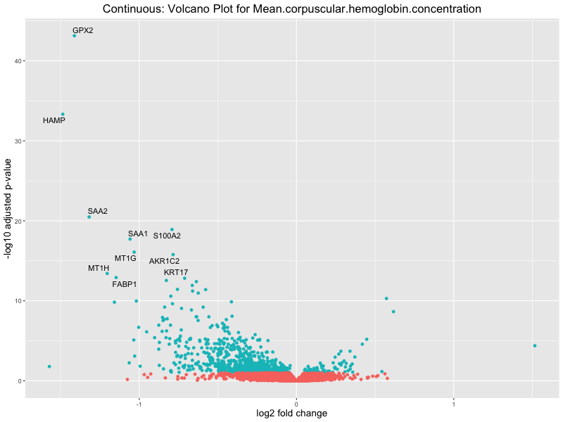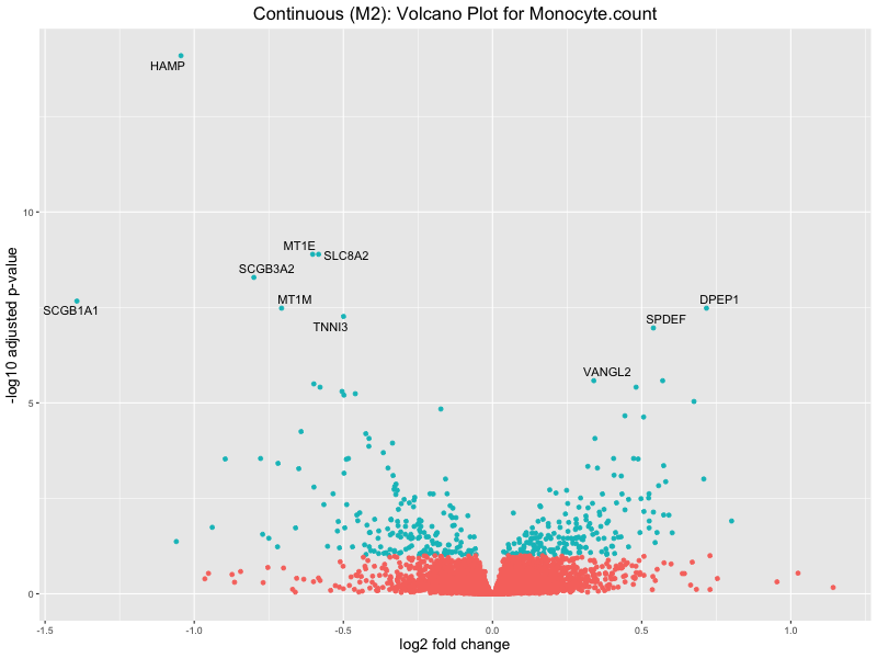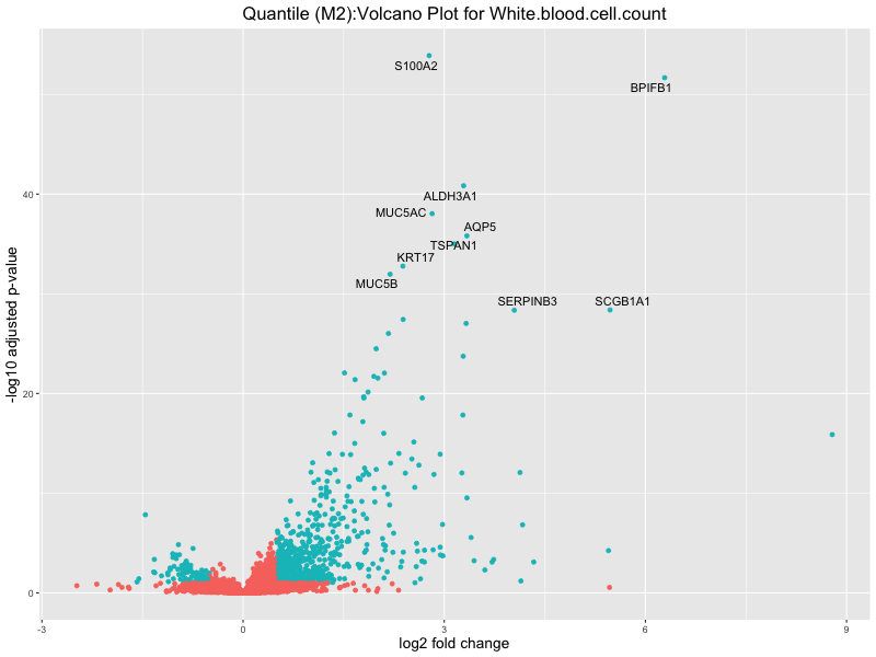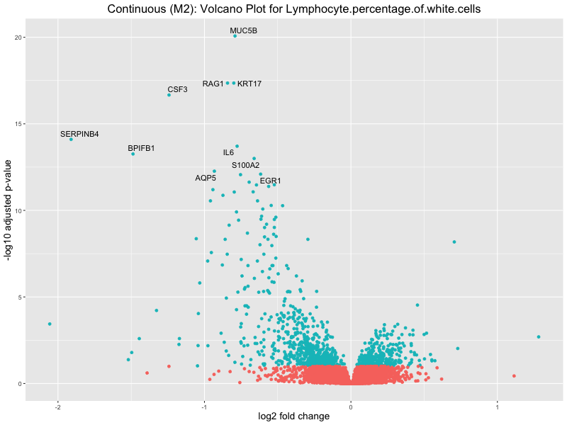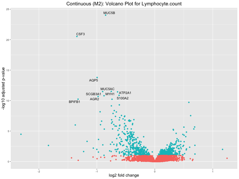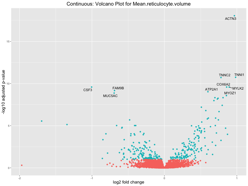 To account for population stratification, we adjusted the model by including the first two genotype principal components (PCs), as they explain most of the genetic variation in the data. For Eosinophil count, we observed that genes were consistently identified as top differentially expressed with and without adjustment. The only difference is that instead of SLC6A9, WFDC2 was detected as top 10 DEGs when adjusting for the first two genotype PCs. WFBC2 is a protease inhibitor with a potential role in innate immune defense (L Bingle, 2006). Although same genes are identified as top DEGs for continuous analysis, additional pathways such as response to inactivity were highlighted when adjusting for the first two genotype PCs.