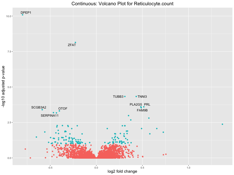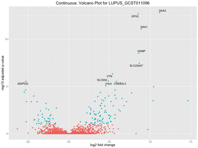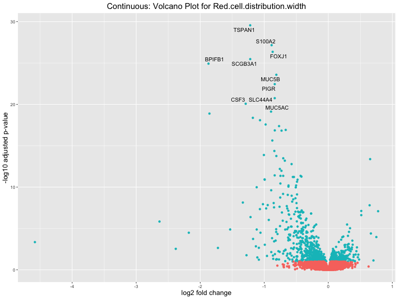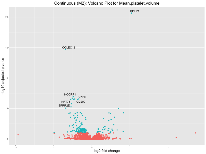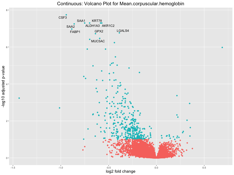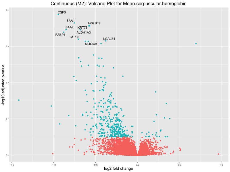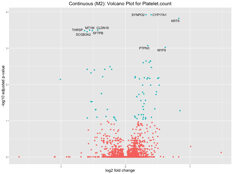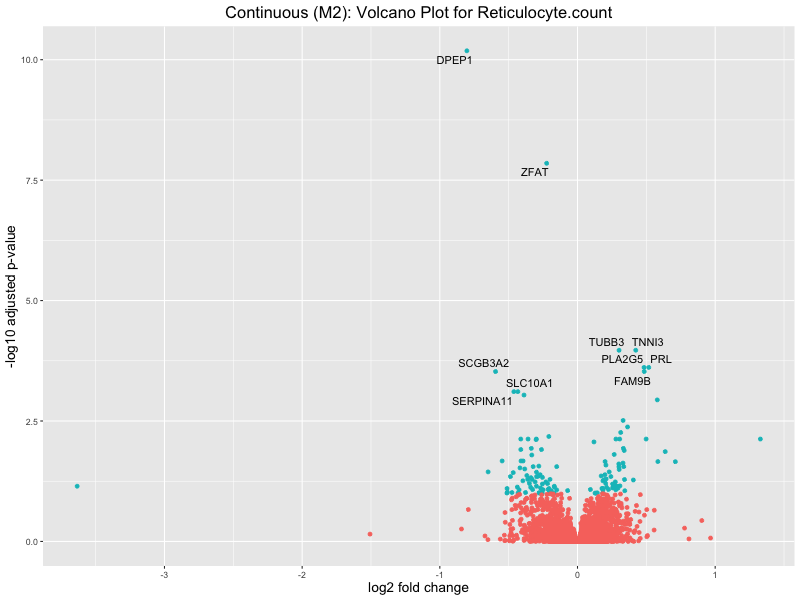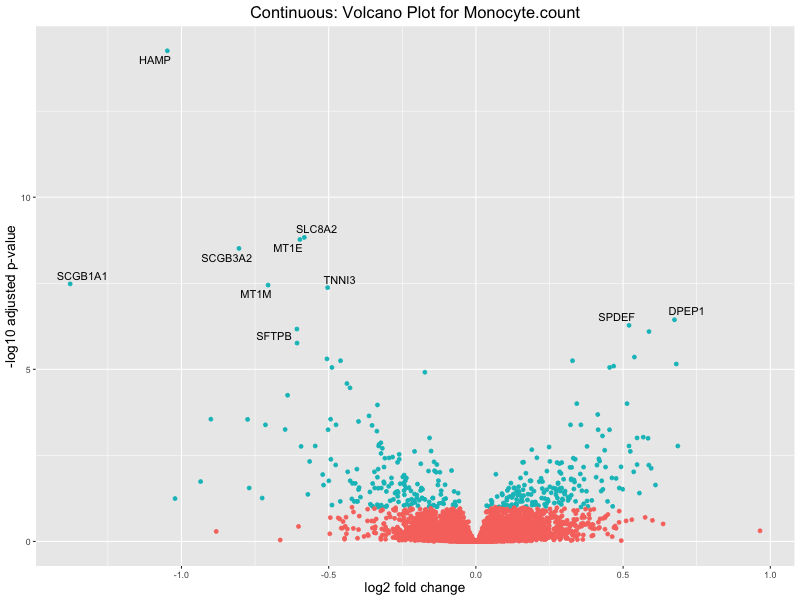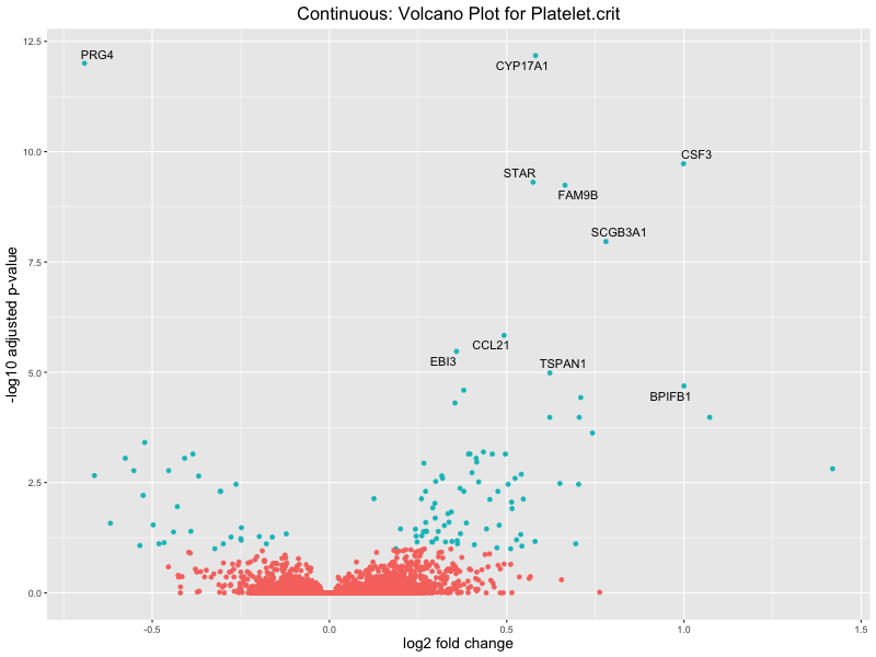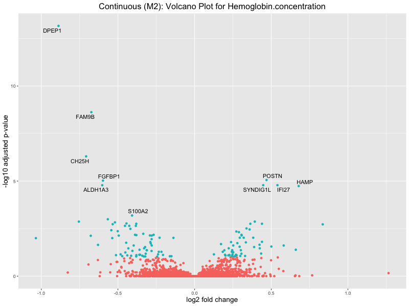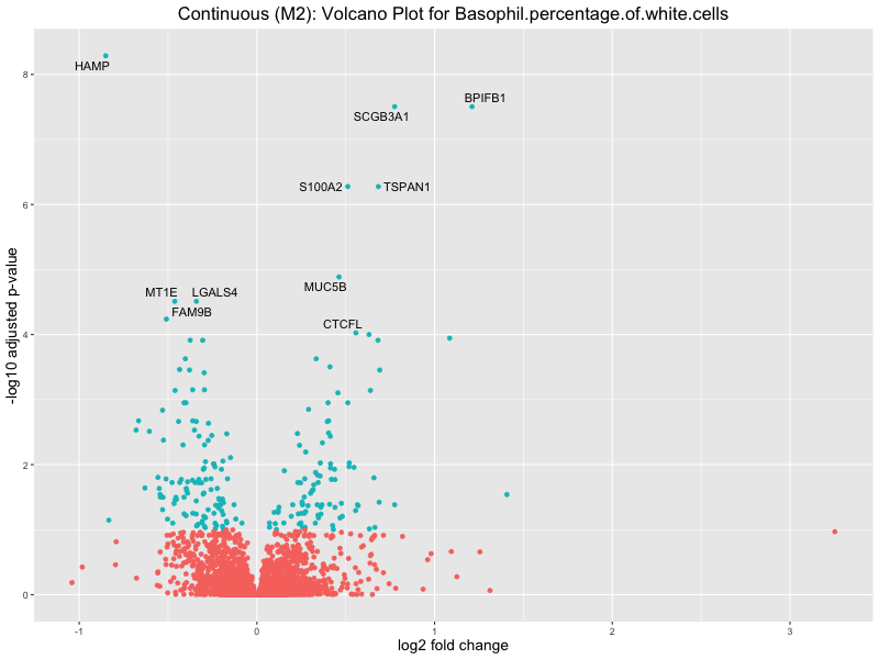 To account for population stratification, we adjusted the model by including the first two genotype principal components (PCs), as they explain most of the genetic variation in the data. For Eosinophil count, we observed that genes were consistently identified as top differentially expressed with and without adjustment. The only difference is that instead of SLC6A9, WFDC2 was detected as top 10 DEGs when adjusting for the first two genotype PCs. WFBC2 is a protease inhibitor with a potential role in innate immune defense (L Bingle, 2006). Although same genes are identified as top DEGs for continuous analysis, additional pathways such as response to inactivity were highlighted when adjusting for the first two genotype PCs.