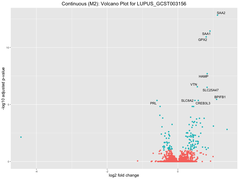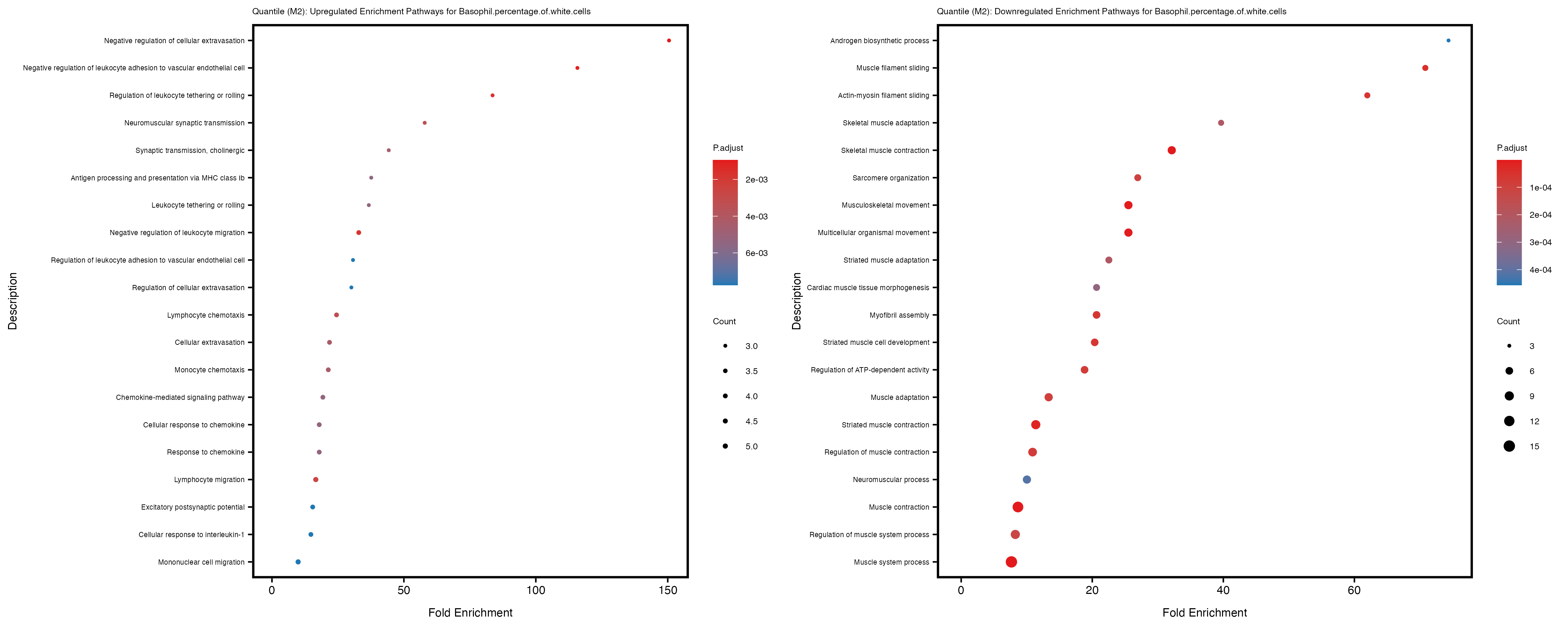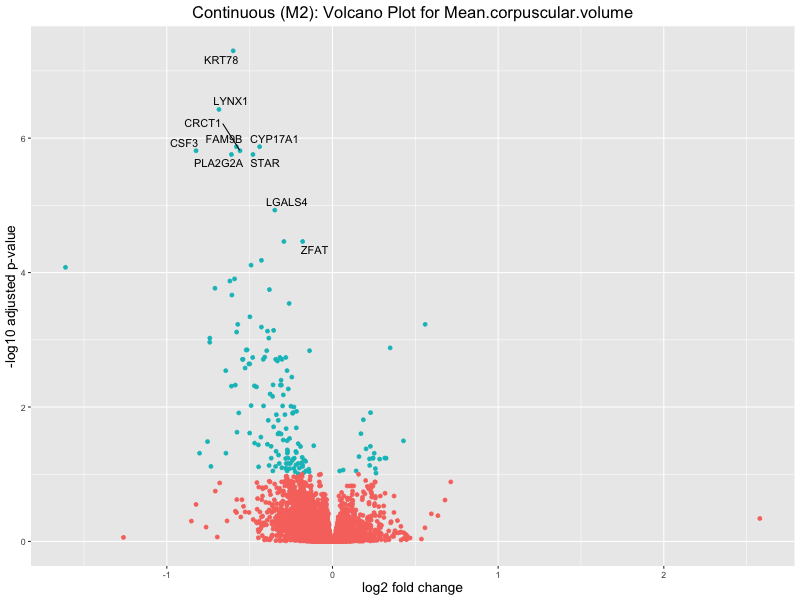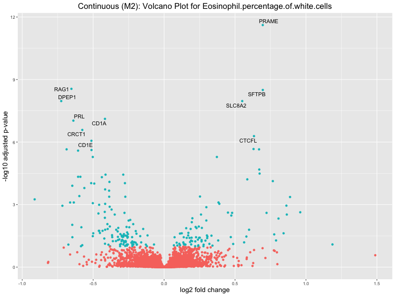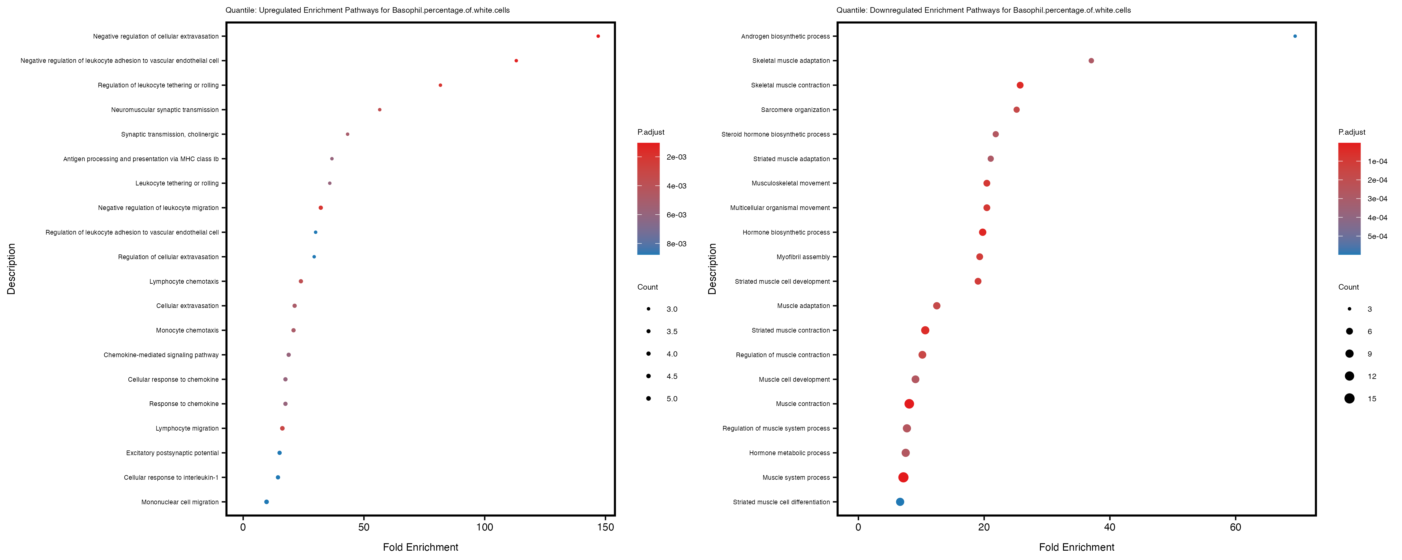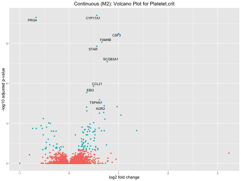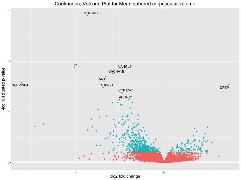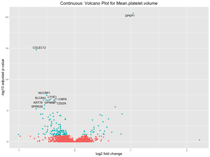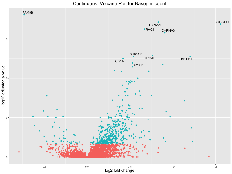 To account for population stratification, we adjusted the model by including the first two genotype principal components (PCs), as they explain most of the genetic variation in the data. For Eosinophil count, we observed that genes were consistently identified as top differentially expressed with and without adjustment. The only difference is that instead of SLC6A9, WFDC2 was detected as top 10 DEGs when adjusting for the first two genotype PCs. WFBC2 is a protease inhibitor with a potential role in innate immune defense (L Bingle, 2006). Although same genes are identified as top DEGs for continuous analysis, additional pathways such as response to inactivity were highlighted when adjusting for the first two genotype PCs.