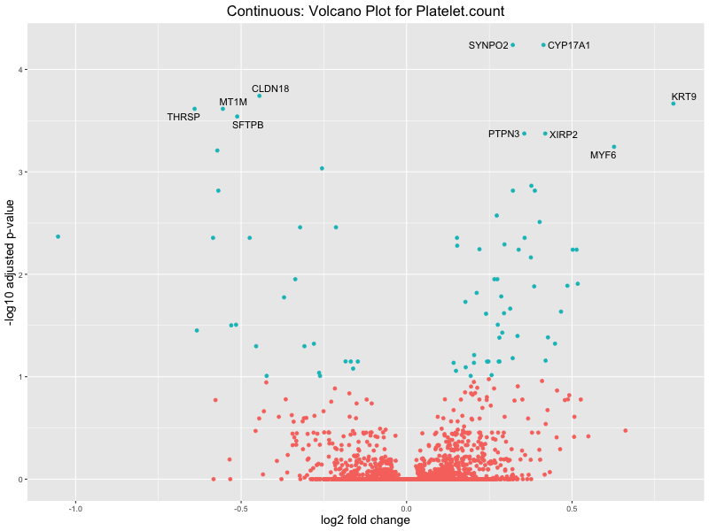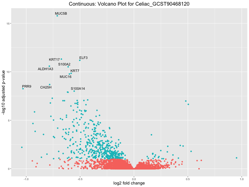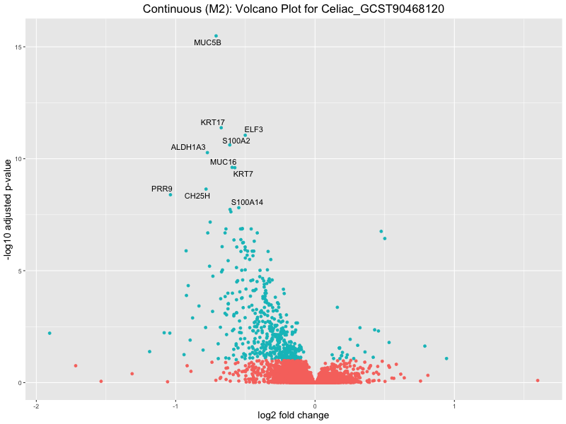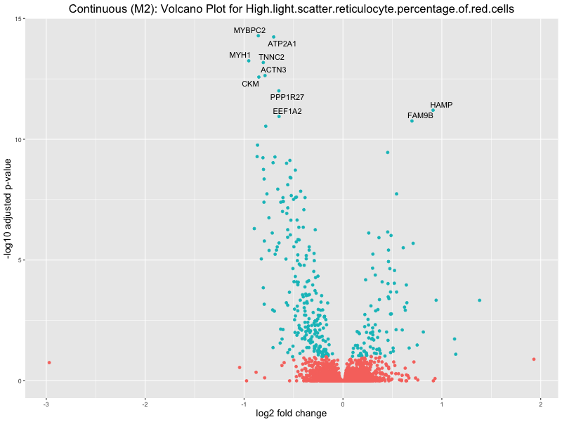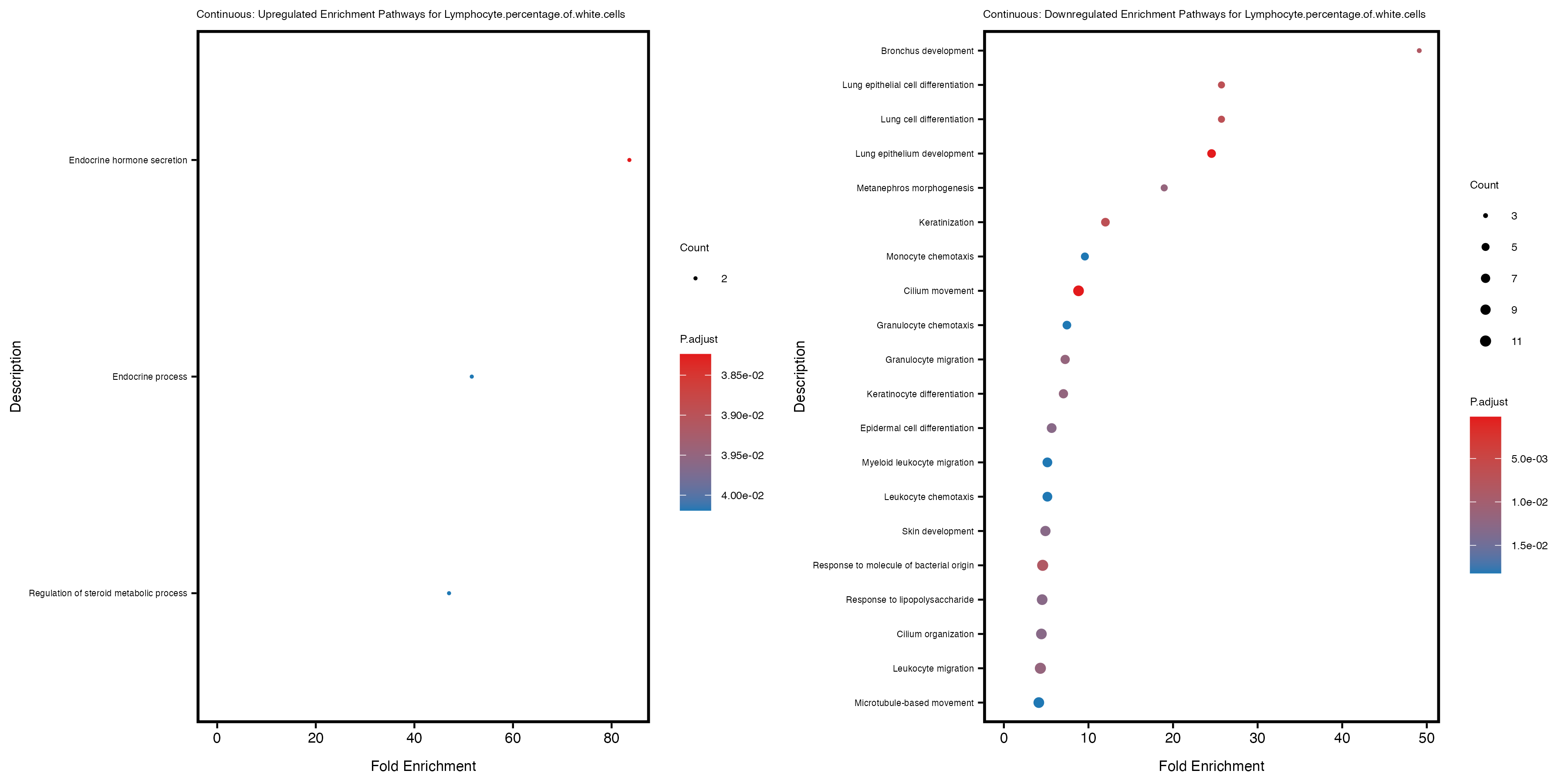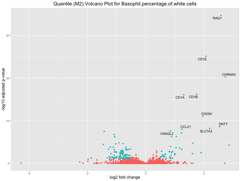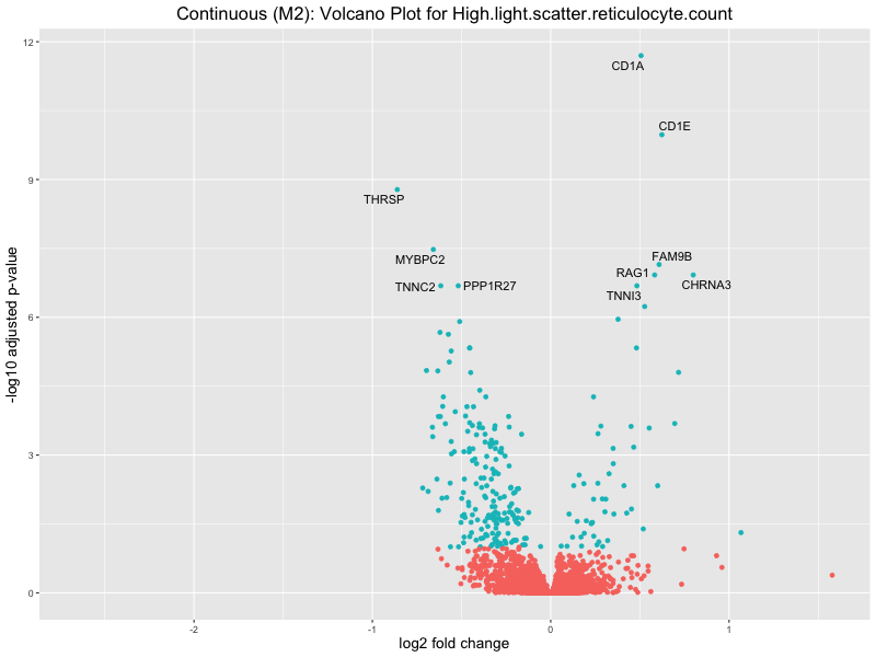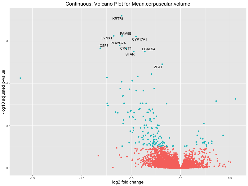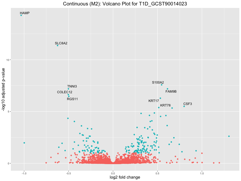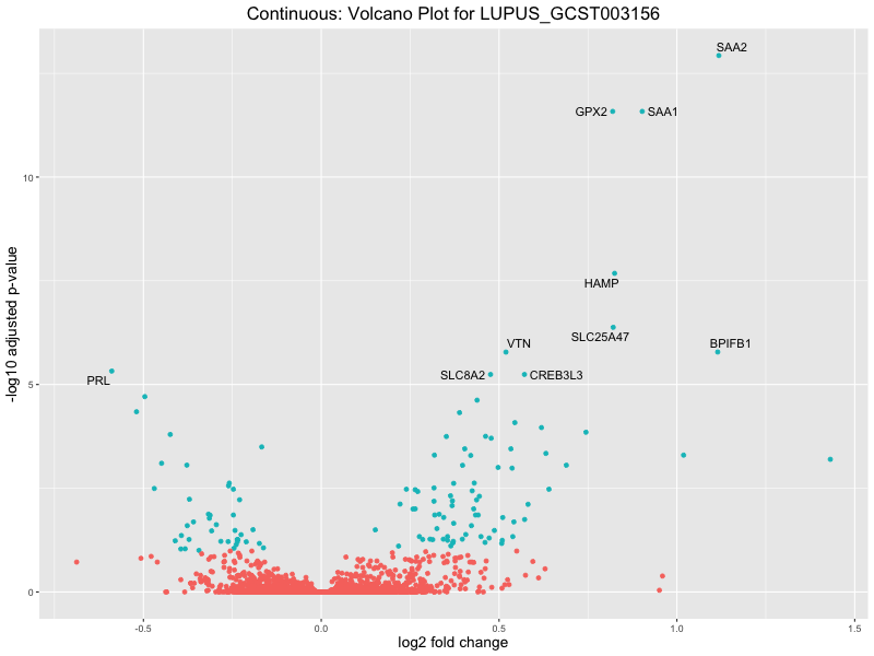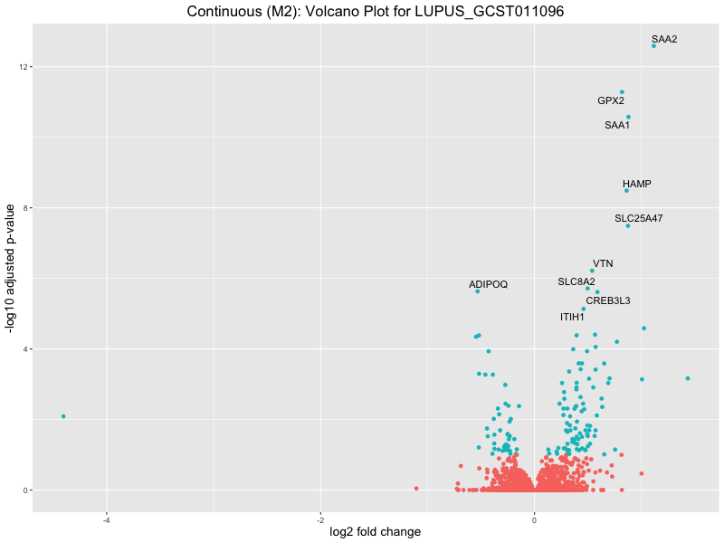 To account for population stratification, we adjusted the model by including the first two genotype principal components (PCs), as they explain most of the genetic variation in the data. For Eosinophil count, we observed that genes were consistently identified as top differentially expressed with and without adjustment. The only difference is that instead of SLC6A9, WFDC2 was detected as top 10 DEGs when adjusting for the first two genotype PCs. WFBC2 is a protease inhibitor with a potential role in innate immune defense (L Bingle, 2006). Although same genes are identified as top DEGs for continuous analysis, additional pathways such as response to inactivity were highlighted when adjusting for the first two genotype PCs.