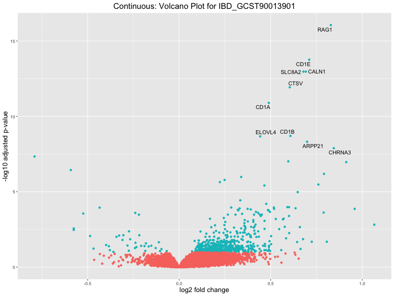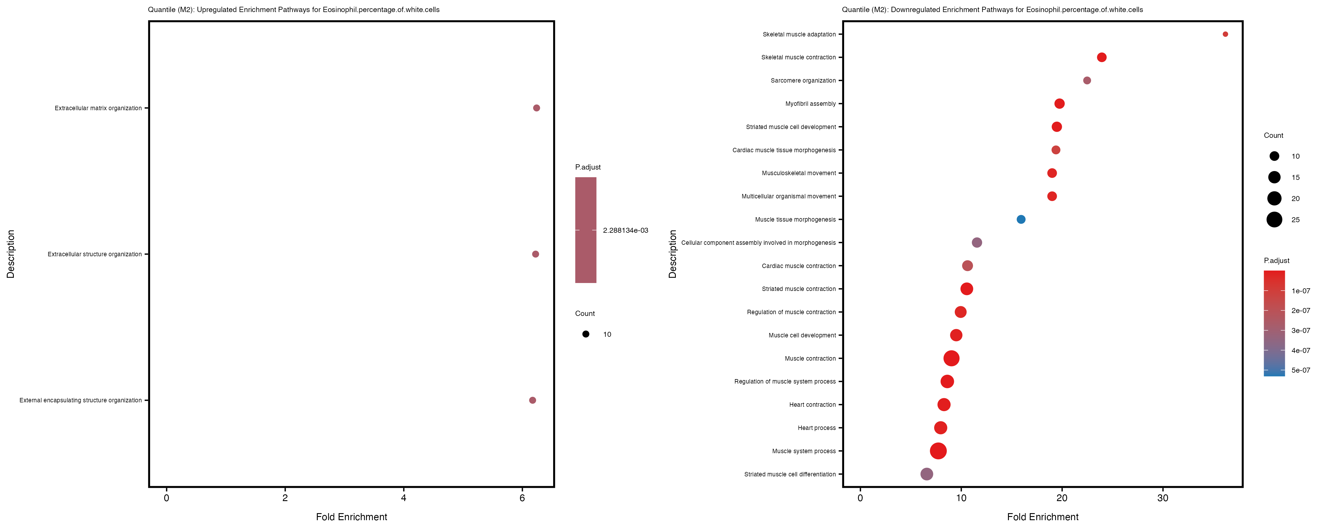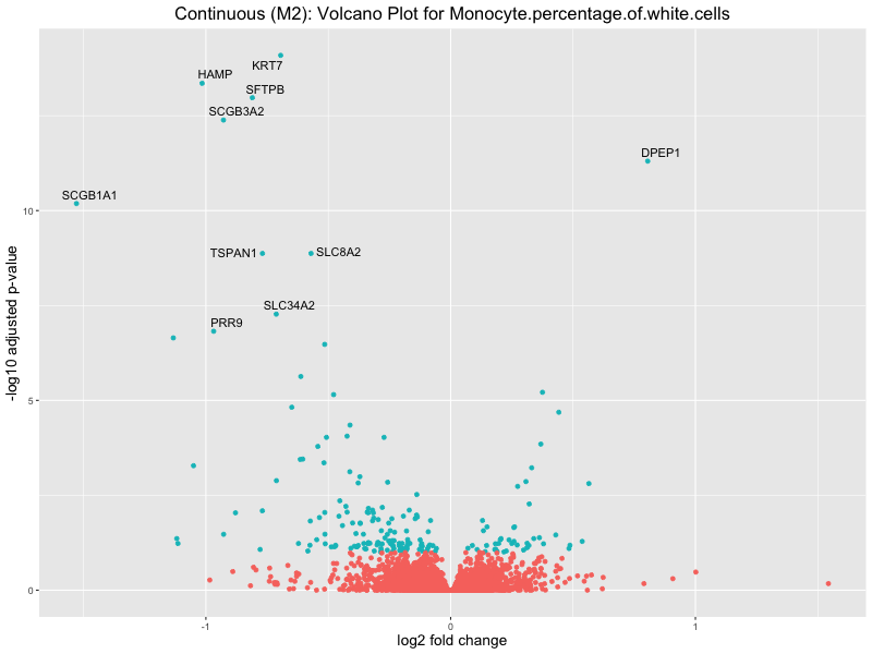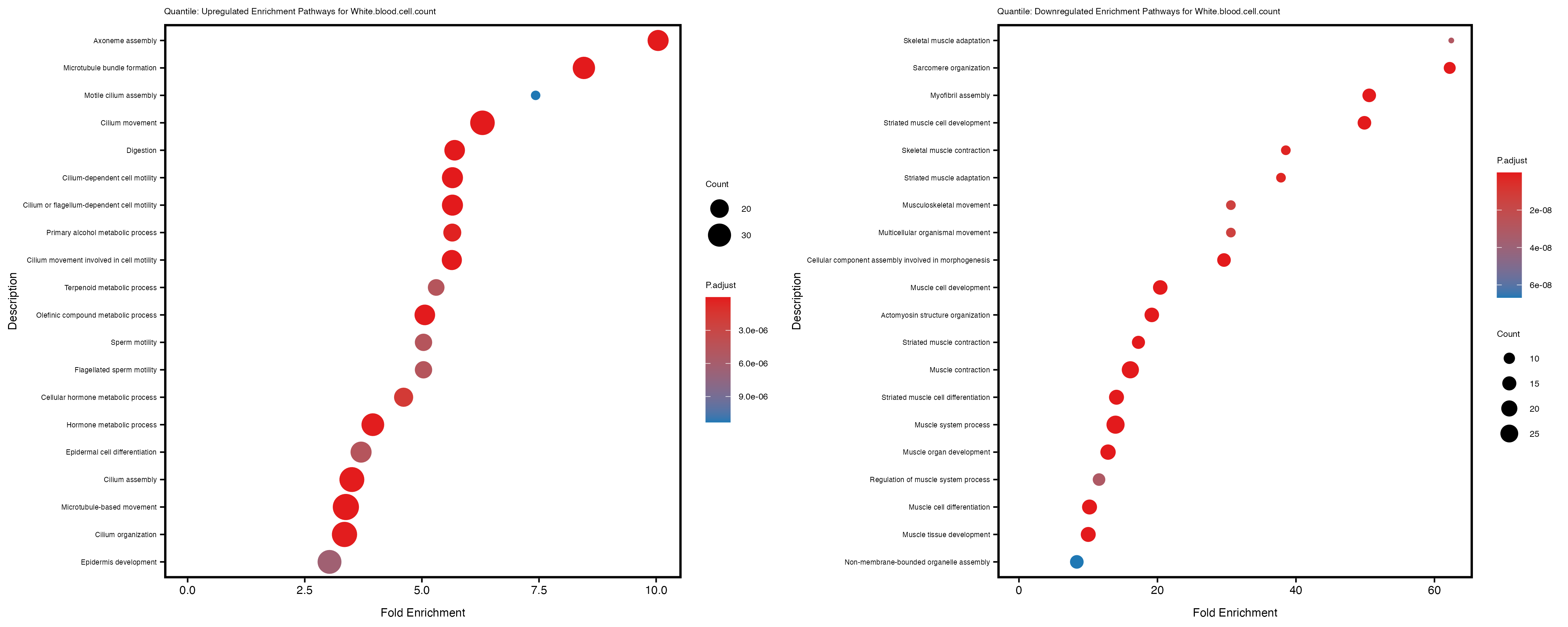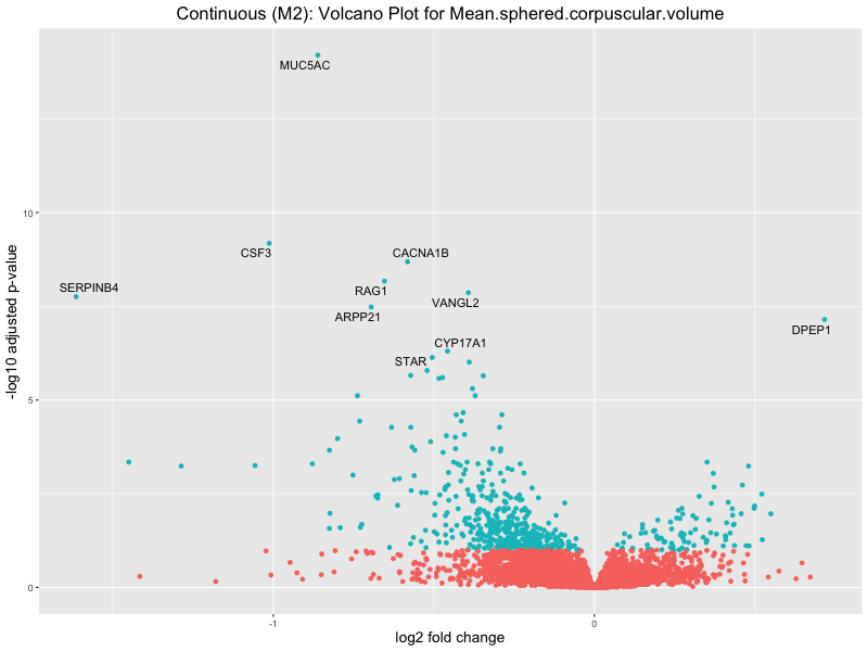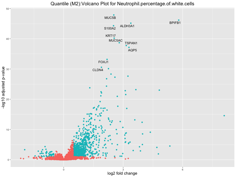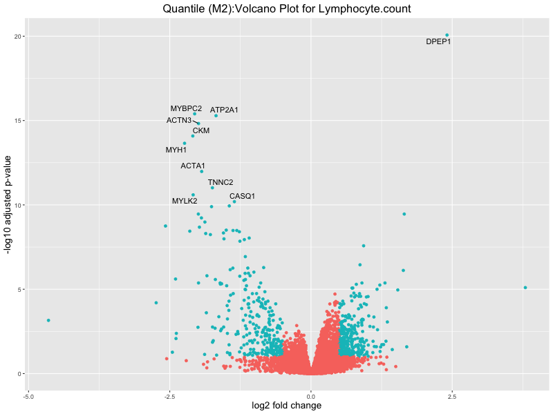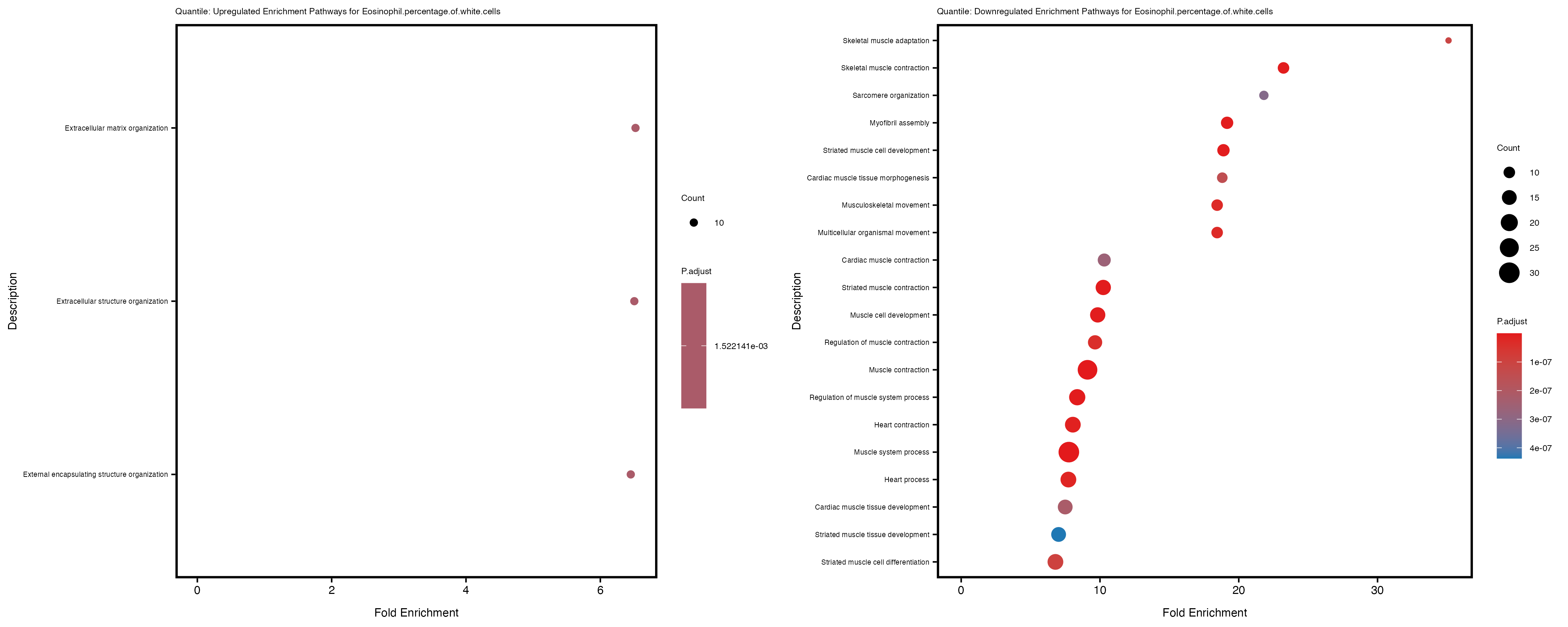 To account for population stratification, we adjusted the model by including the first two genotype principal components (PCs), as they explain most of the genetic variation in the data. For Eosinophil count, we observed that genes were consistently identified as top differentially expressed with and without adjustment. The only difference is that instead of SLC6A9, WFDC2 was detected as top 10 DEGs when adjusting for the first two genotype PCs. WFBC2 is a protease inhibitor with a potential role in innate immune defense (L Bingle, 2006). Although same genes are identified as top DEGs for continuous analysis, additional pathways such as response to inactivity were highlighted when adjusting for the first two genotype PCs.