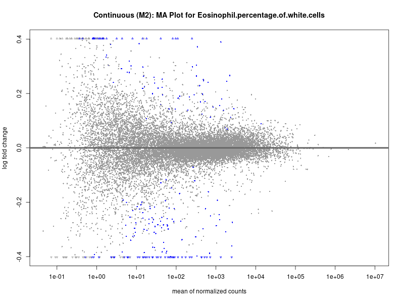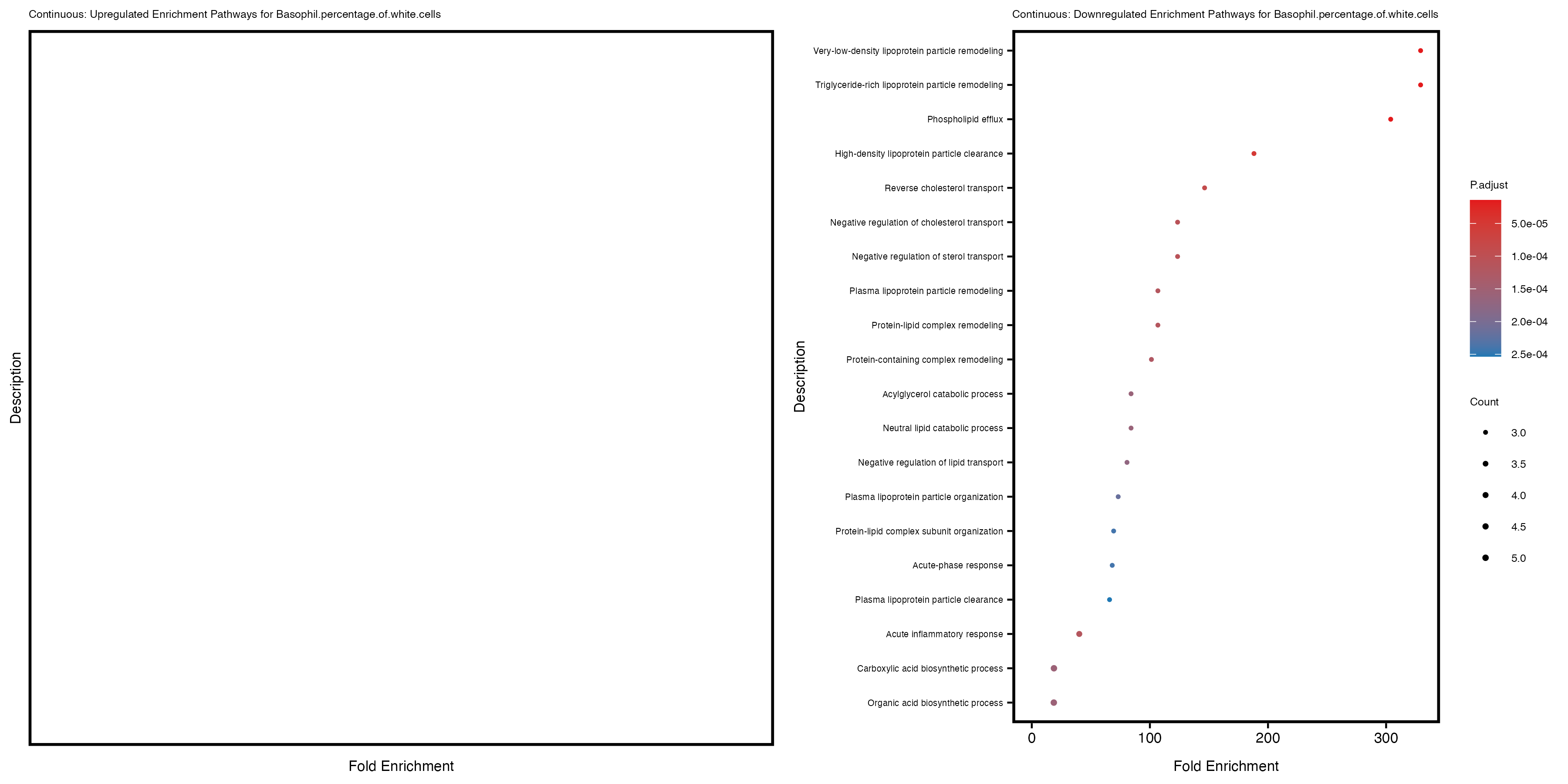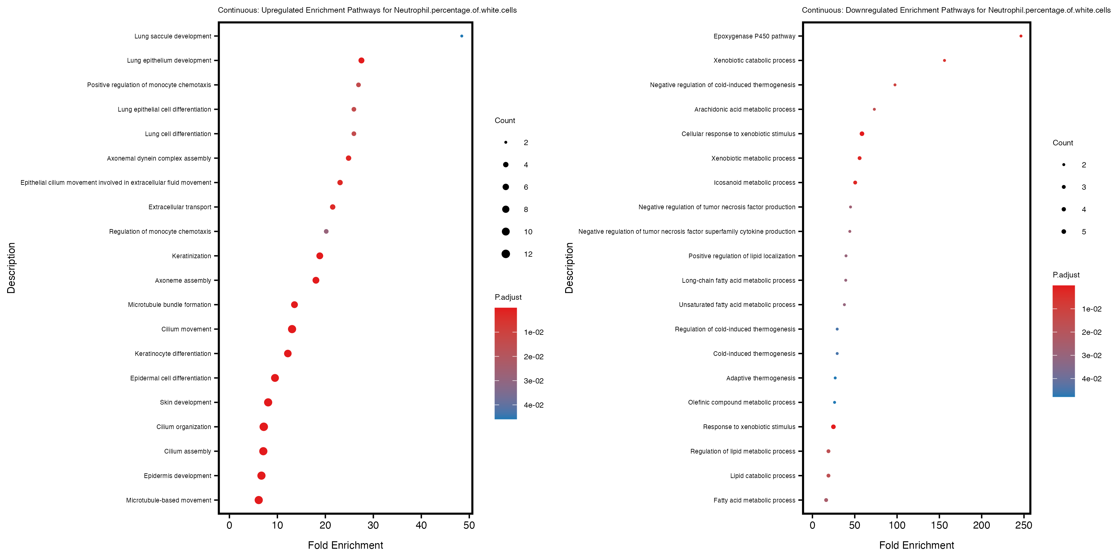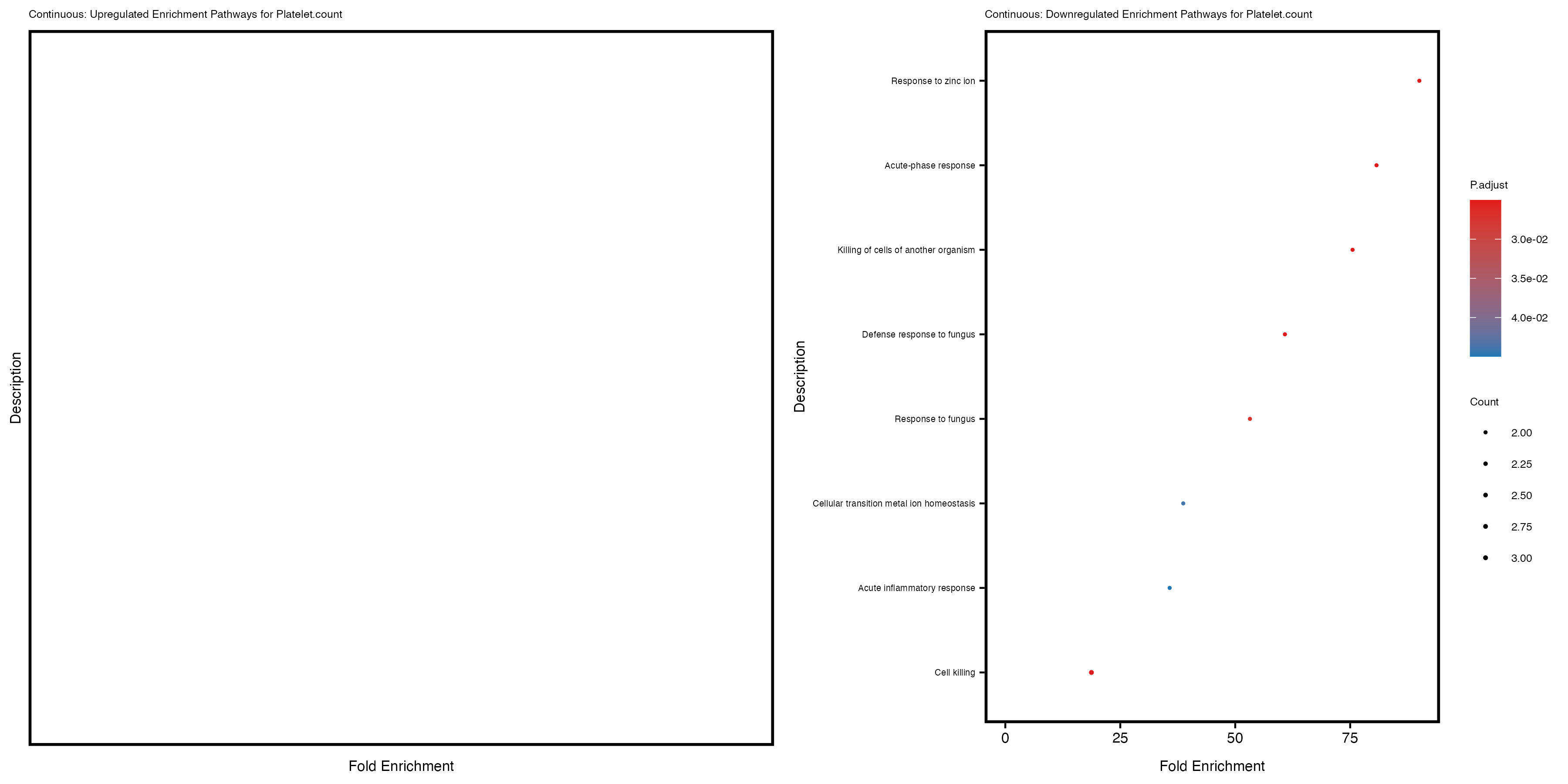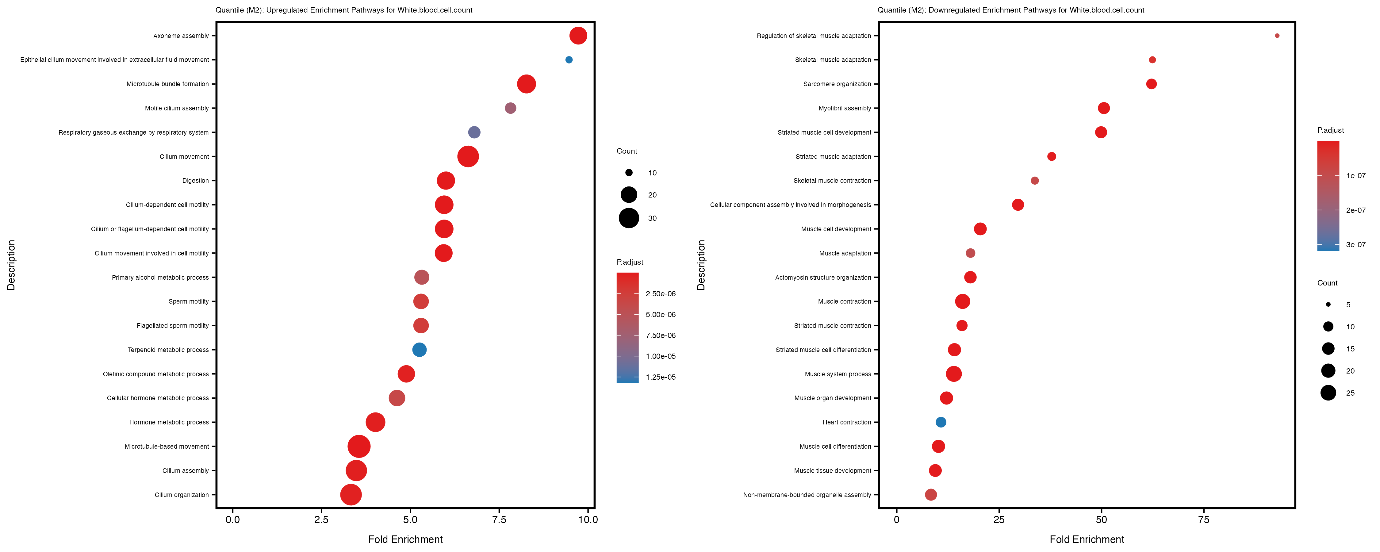 To account for population stratification, we adjusted the model by including the first two genotype principal components (PCs), as they explain most of the genetic variation in the data. For Eosinophil count, we observed that genes were consistently identified as top differentially expressed with and without adjustment. The only difference is that instead of SLC6A9, WFDC2 was detected as top 10 DEGs when adjusting for the first two genotype PCs. WFBC2 is a protease inhibitor with a potential role in innate immune defense (L Bingle, 2006). Although same genes are identified as top DEGs for continuous analysis, additional pathways such as response to inactivity were highlighted when adjusting for the first two genotype PCs.