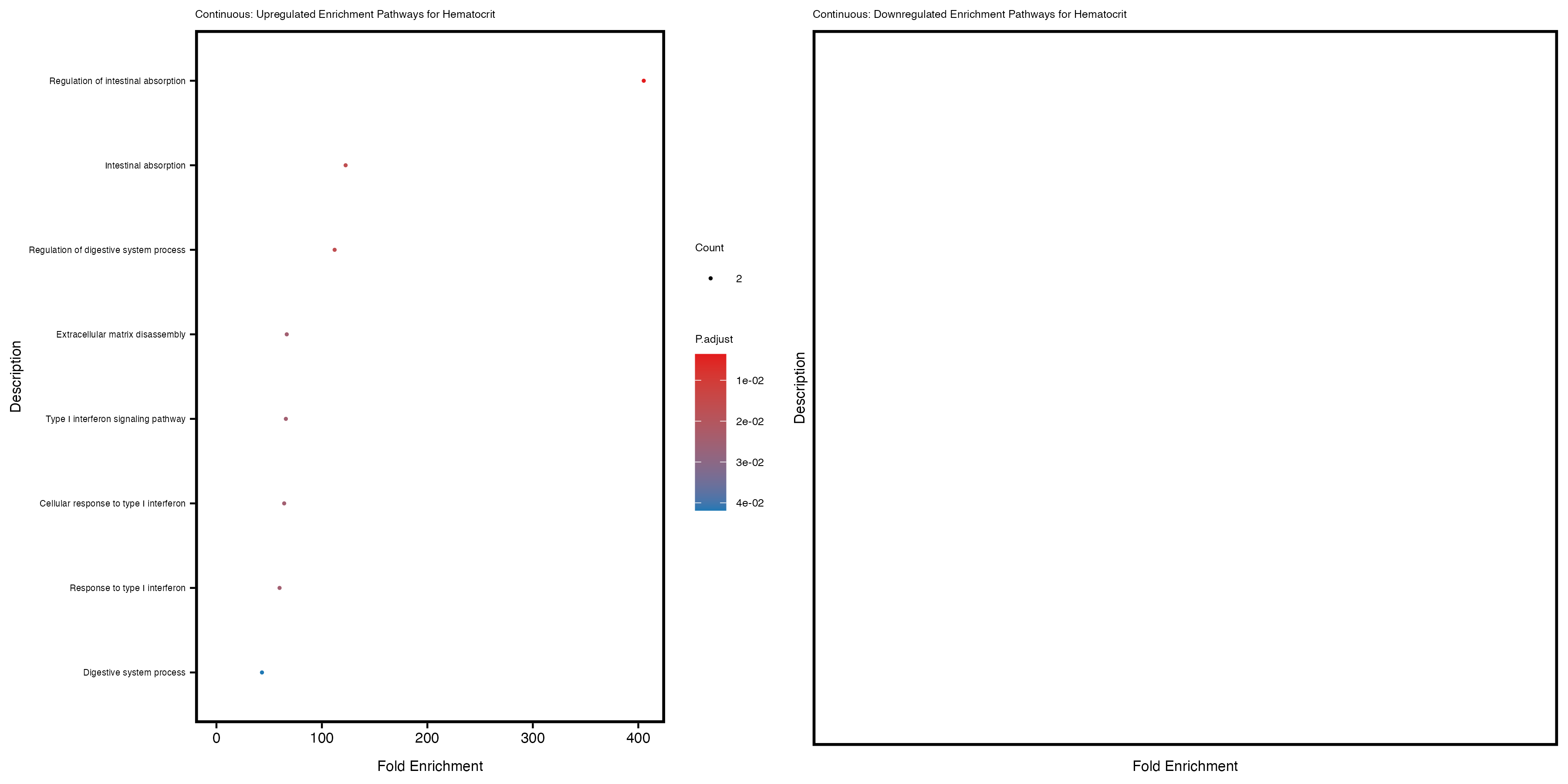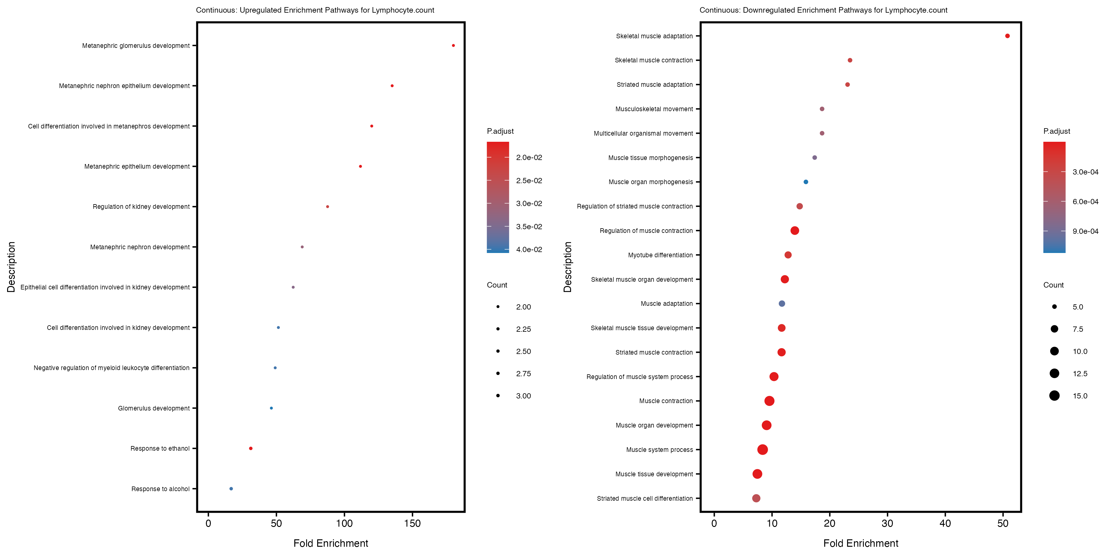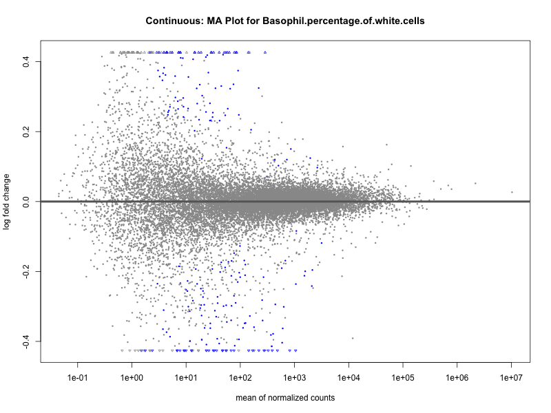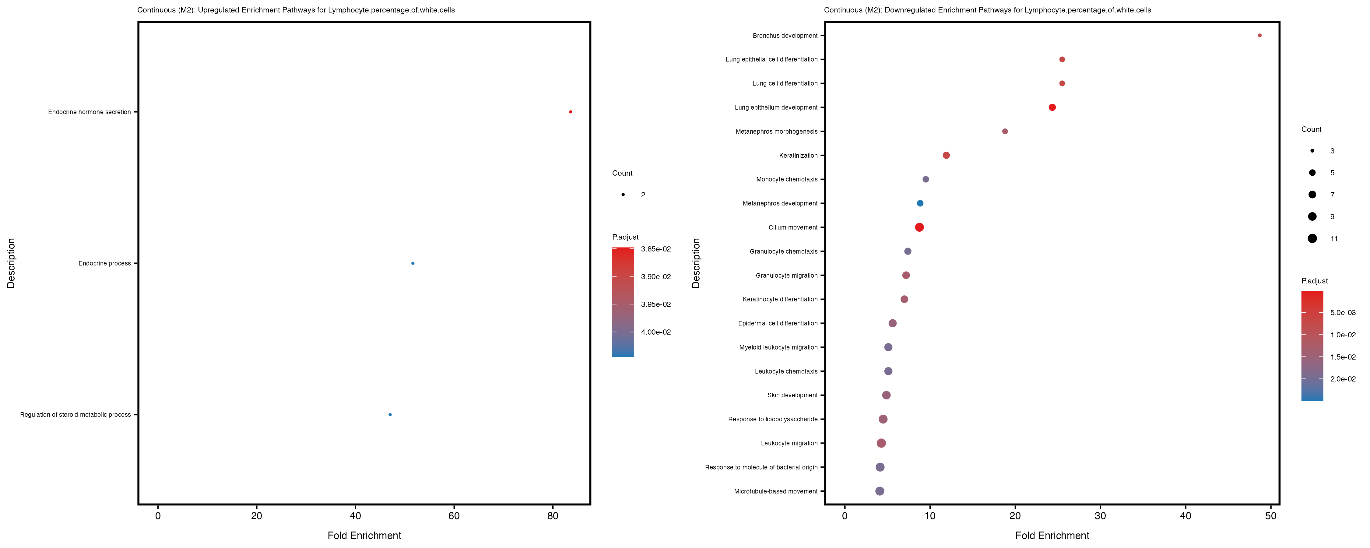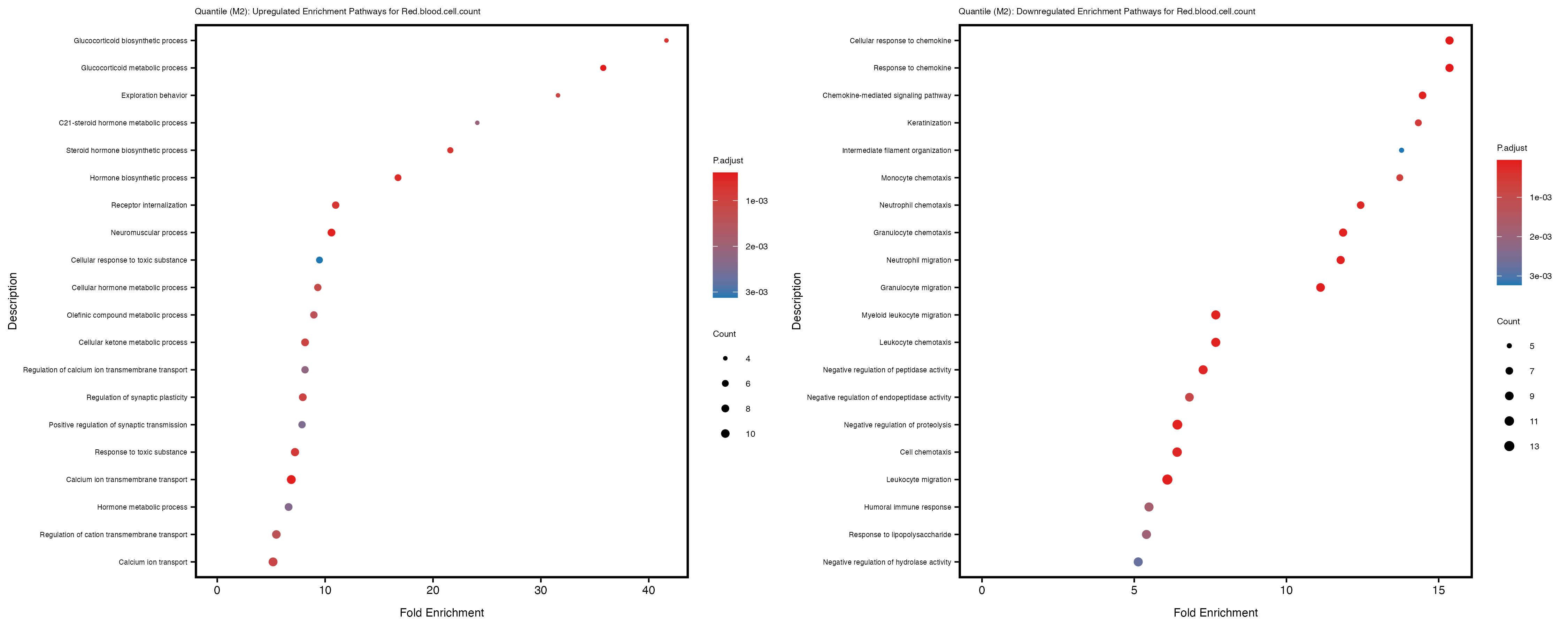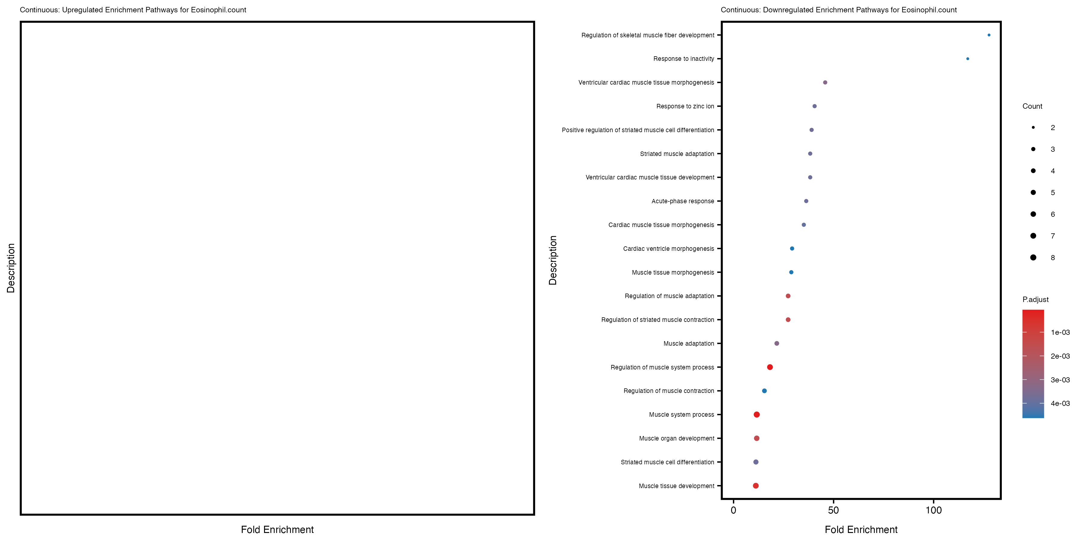 To account for population stratification, we adjusted the model by including the first two genotype principal components (PCs), as they explain most of the genetic variation in the data. For Eosinophil count, we observed that genes were consistently identified as top differentially expressed with and without adjustment. The only difference is that instead of SLC6A9, WFDC2 was detected as top 10 DEGs when adjusting for the first two genotype PCs. WFBC2 is a protease inhibitor with a potential role in innate immune defense (L Bingle, 2006). Although same genes are identified as top DEGs for continuous analysis, additional pathways such as response to inactivity were highlighted when adjusting for the first two genotype PCs.