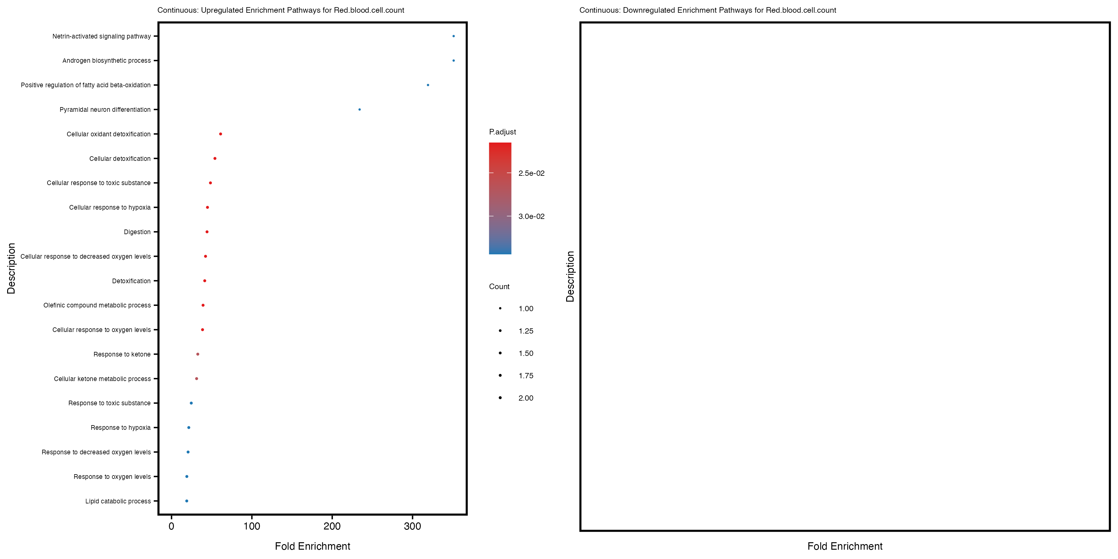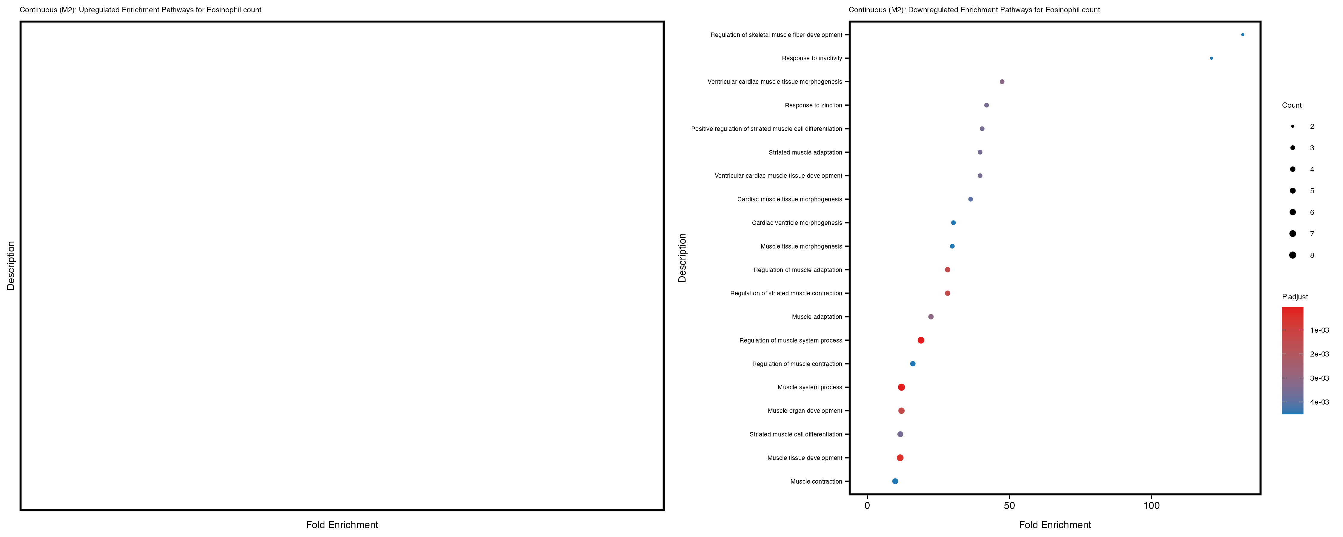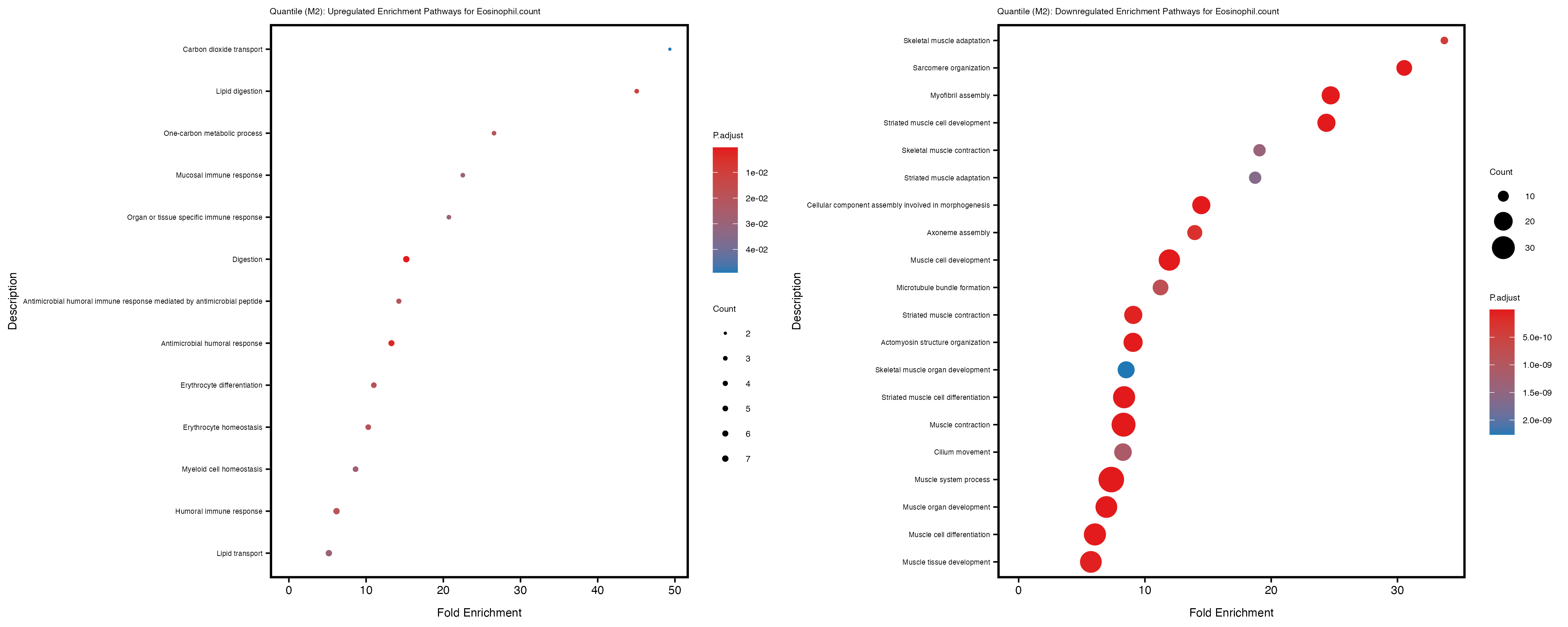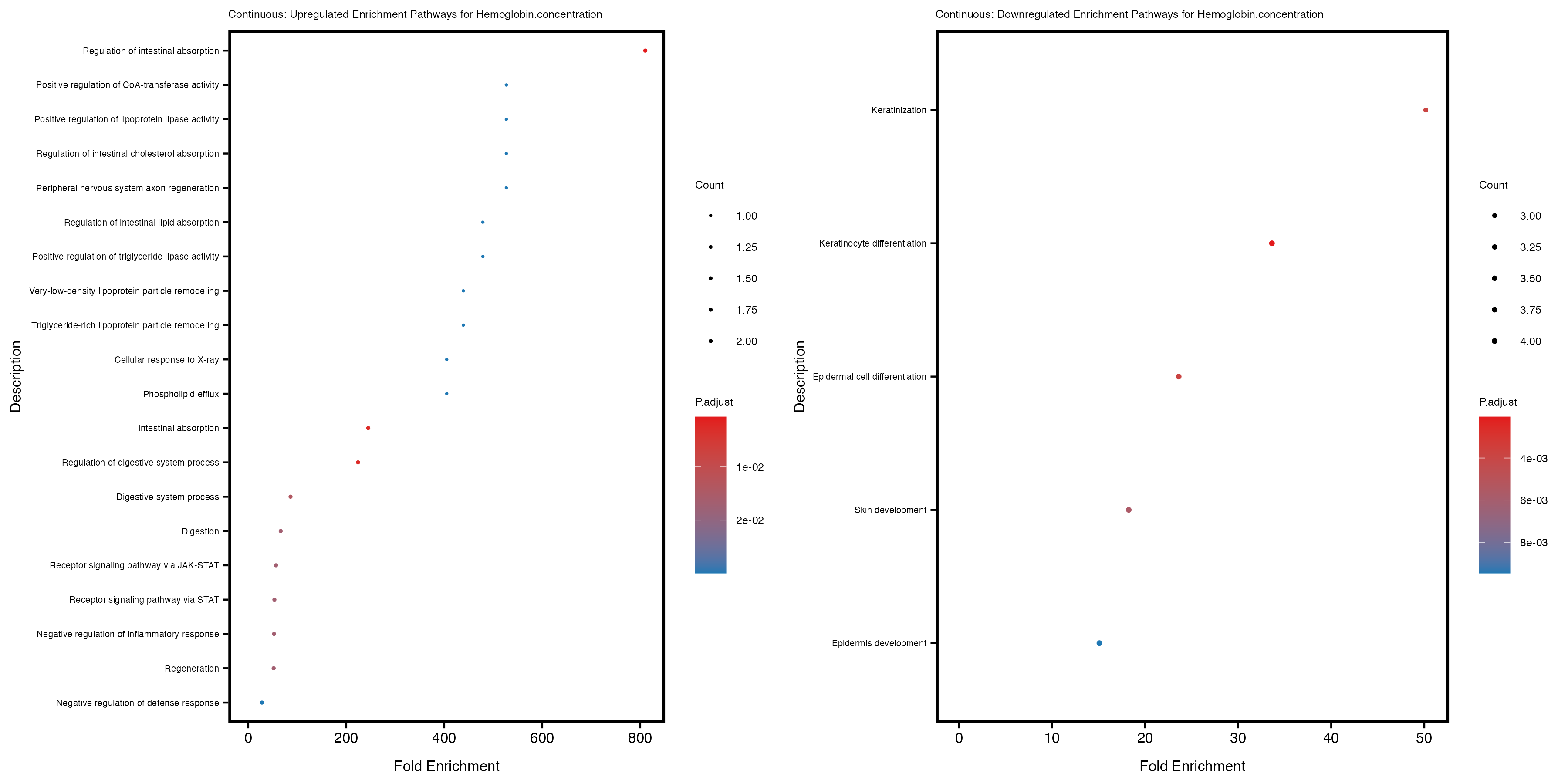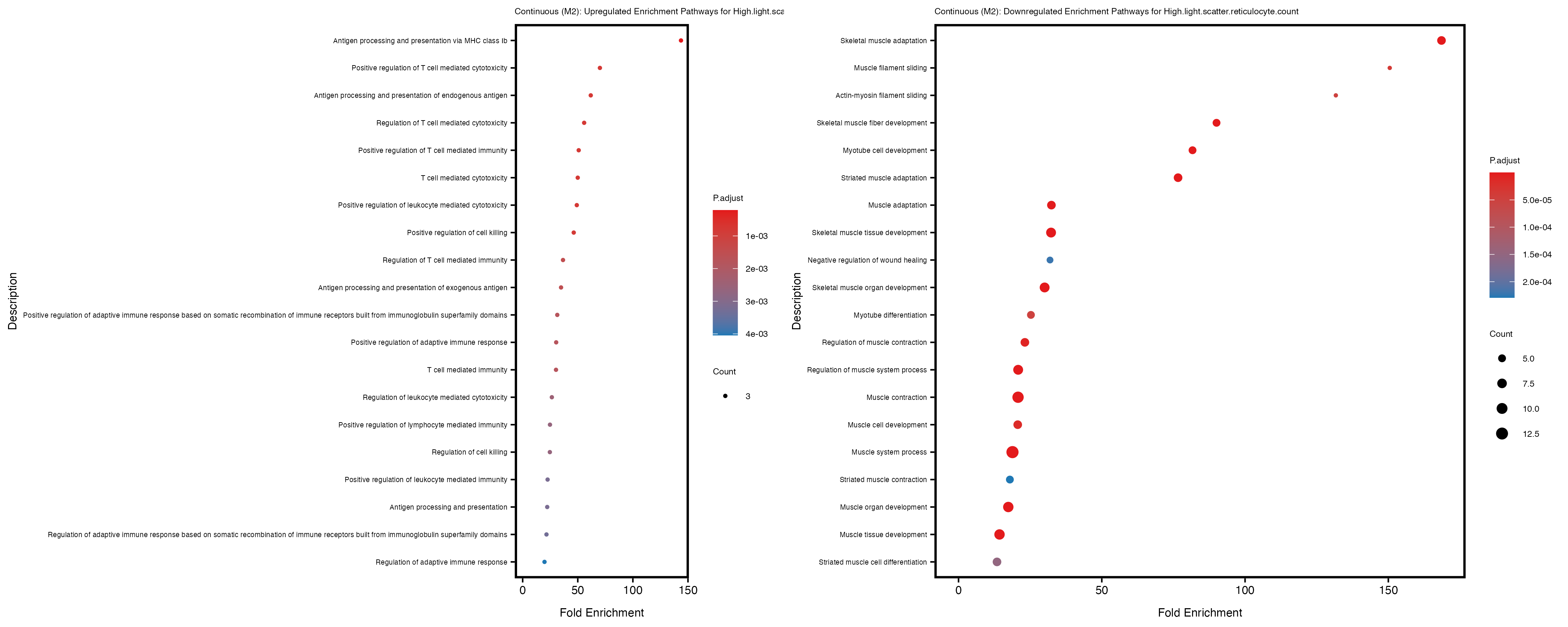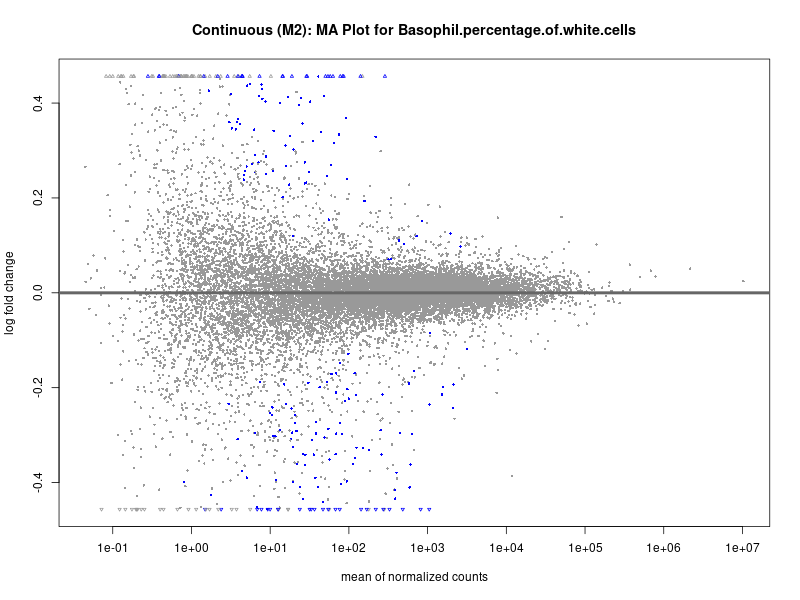 To account for population stratification, we adjusted the model by including the first two genotype principal components (PCs), as they explain most of the genetic variation in the data. For Eosinophil count, we observed that genes were consistently identified as top differentially expressed with and without adjustment. The only difference is that instead of SLC6A9, WFDC2 was detected as top 10 DEGs when adjusting for the first two genotype PCs. WFBC2 is a protease inhibitor with a potential role in innate immune defense (L Bingle, 2006). Although same genes are identified as top DEGs for continuous analysis, additional pathways such as response to inactivity were highlighted when adjusting for the first two genotype PCs.