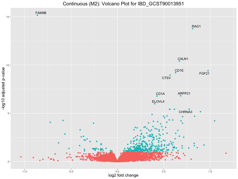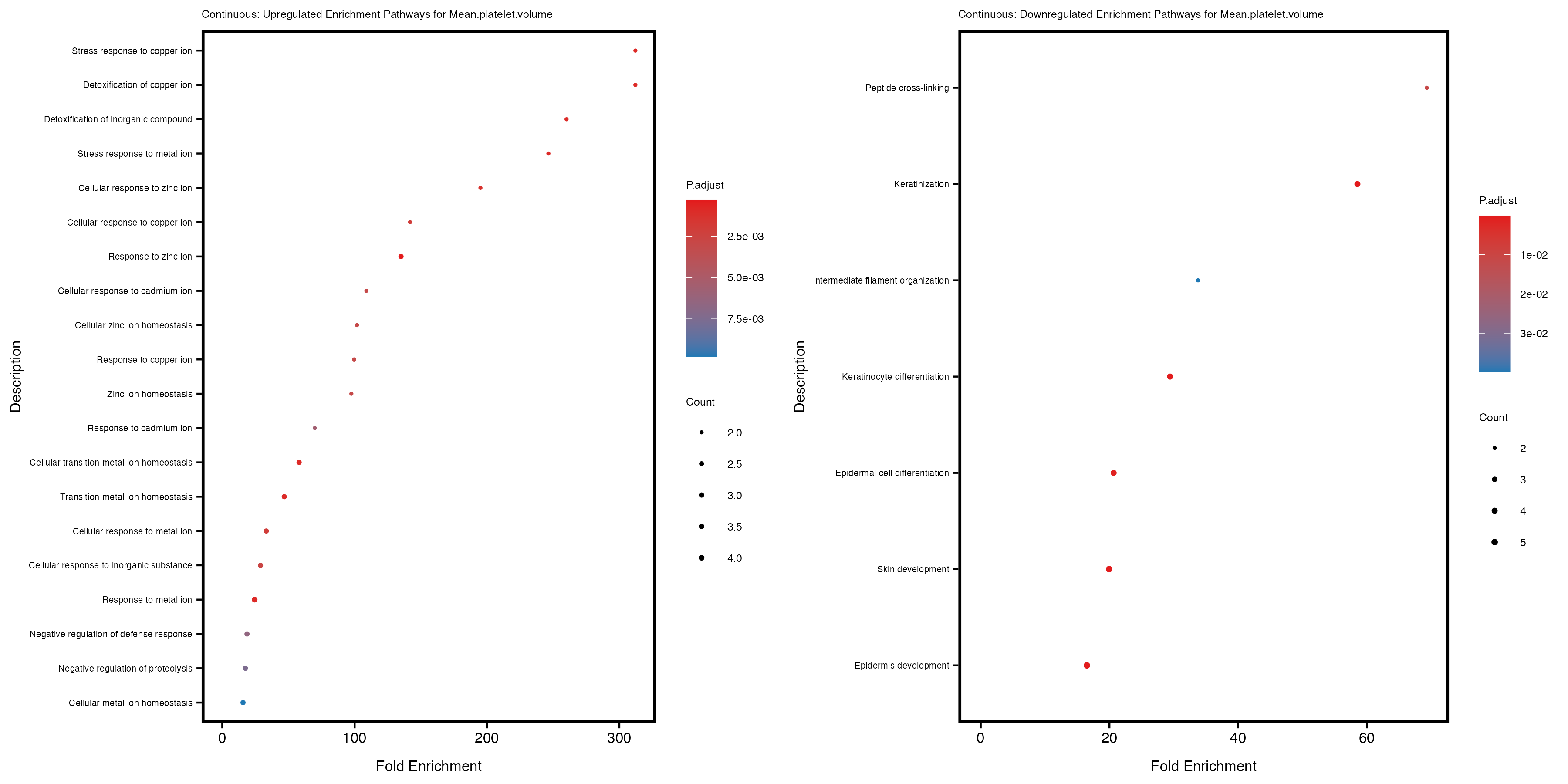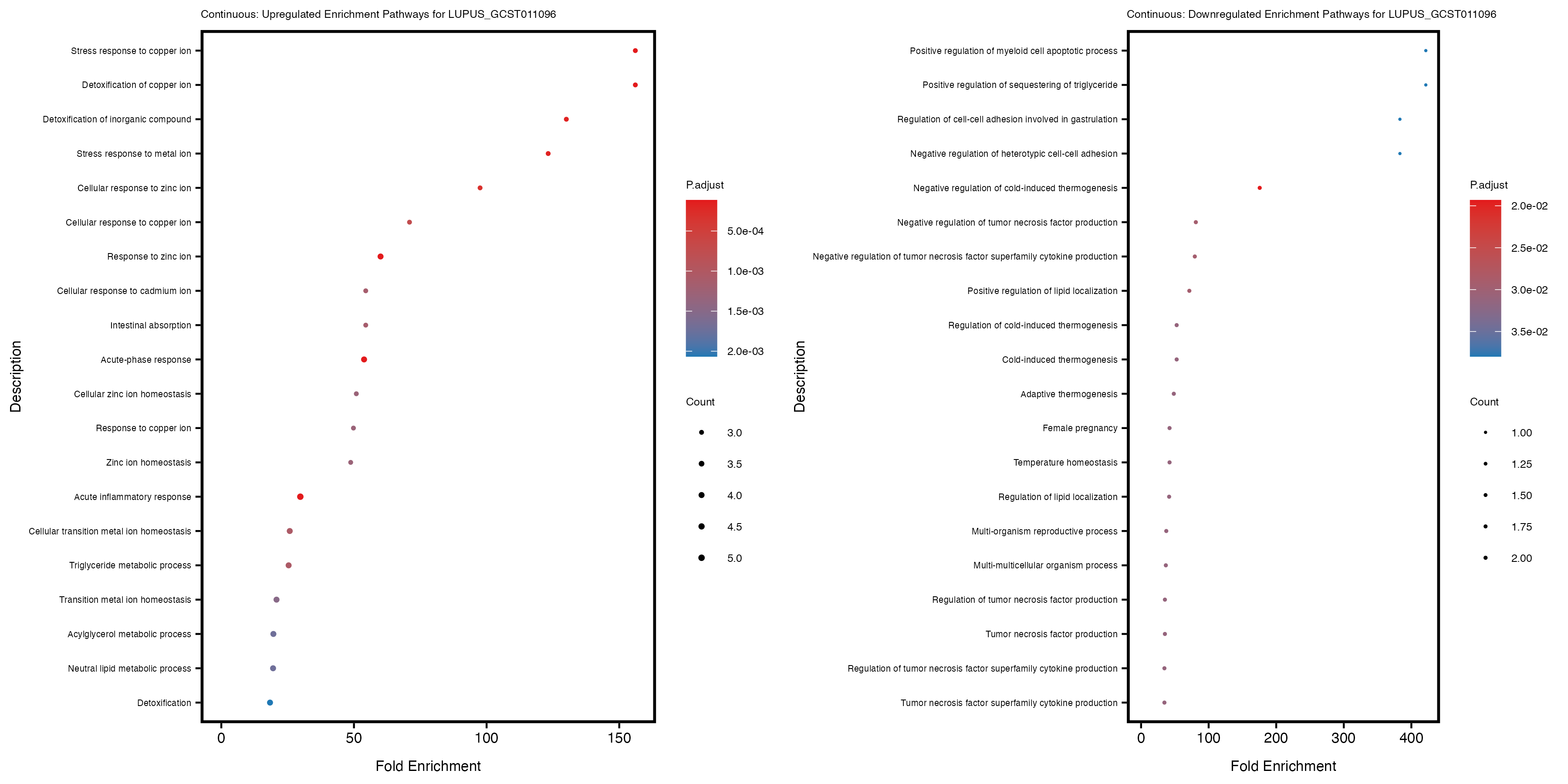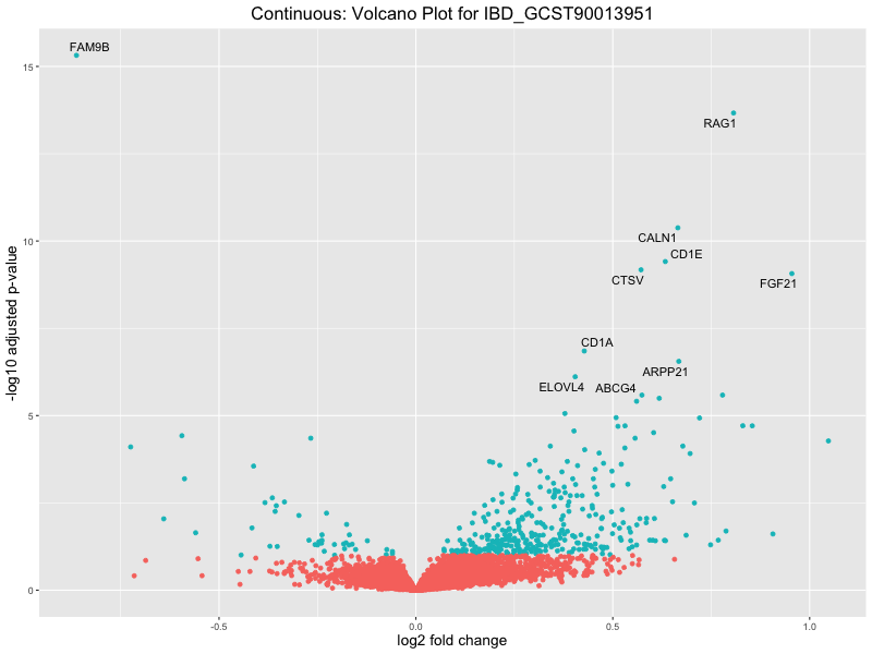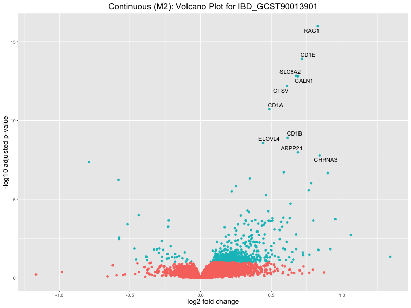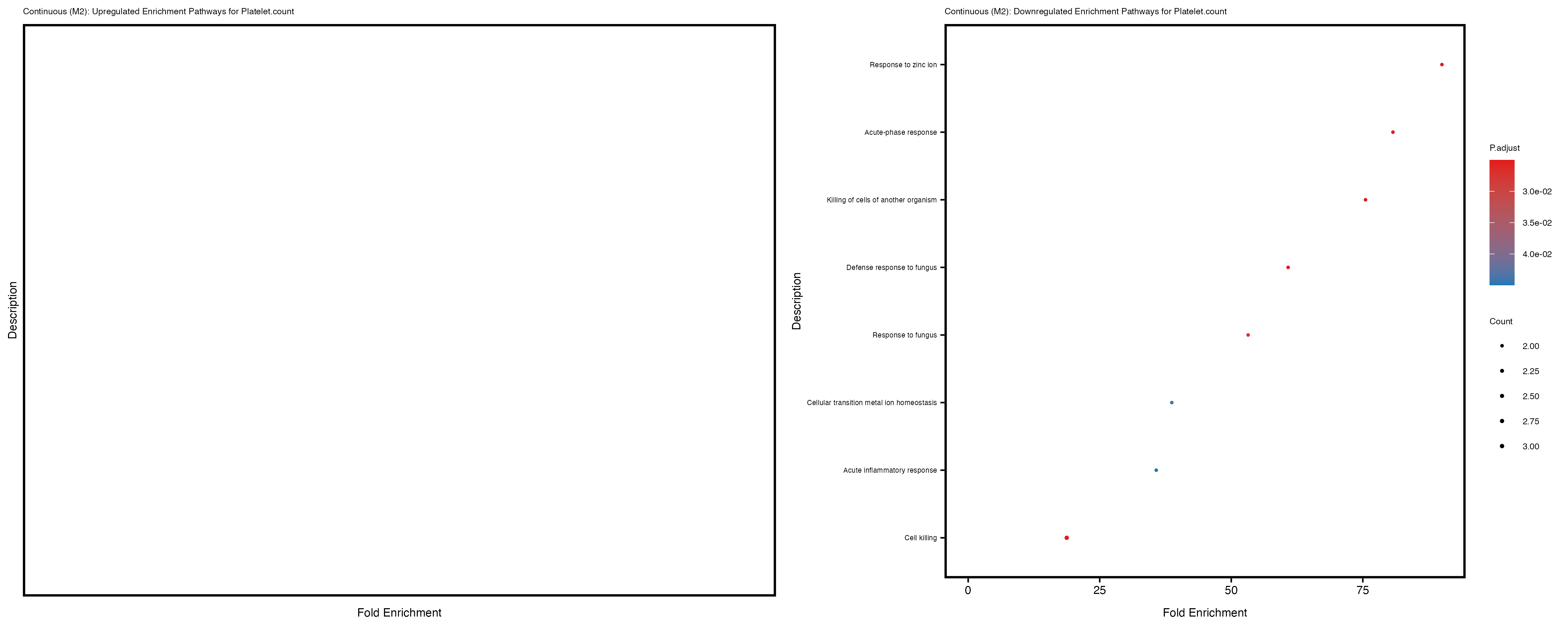 To account for population stratification, we adjusted the model by including the first two genotype principal components (PCs), as they explain most of the genetic variation in the data. For Eosinophil count, we observed that genes were consistently identified as top differentially expressed with and without adjustment. The only difference is that instead of SLC6A9, WFDC2 was detected as top 10 DEGs when adjusting for the first two genotype PCs. WFBC2 is a protease inhibitor with a potential role in innate immune defense (L Bingle, 2006). Although same genes are identified as top DEGs for continuous analysis, additional pathways such as response to inactivity were highlighted when adjusting for the first two genotype PCs.