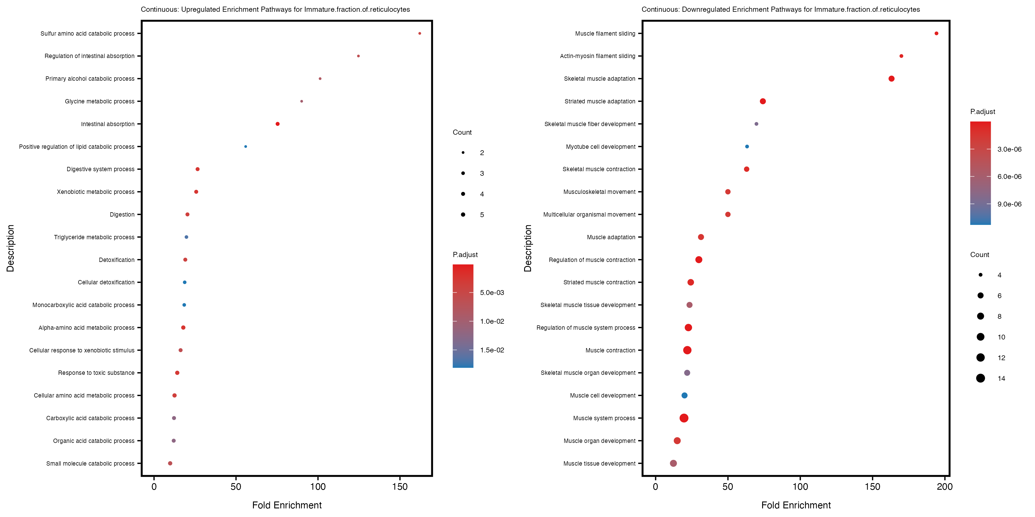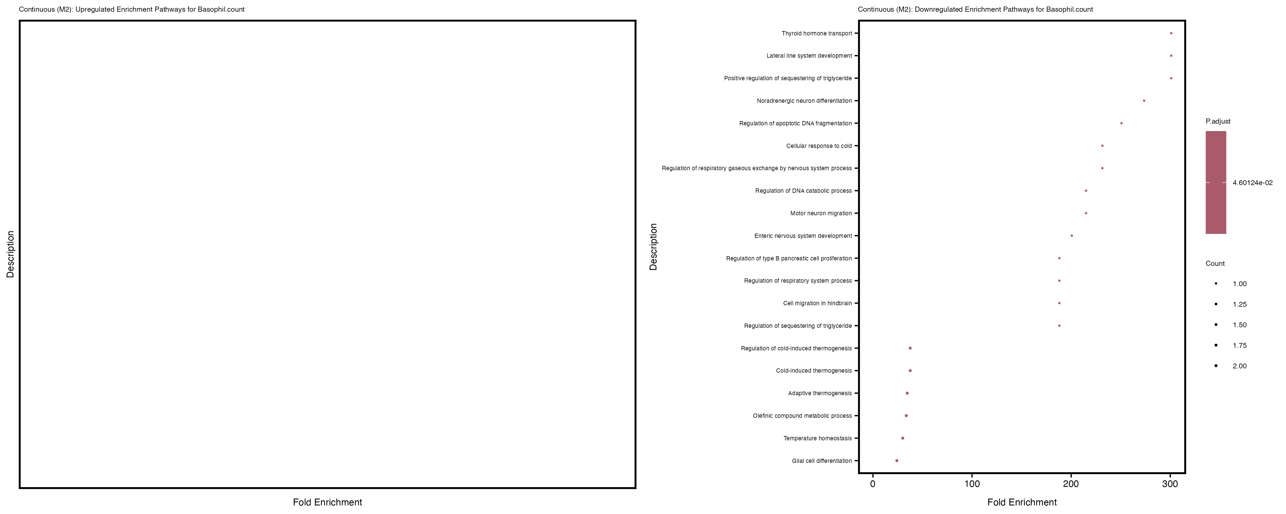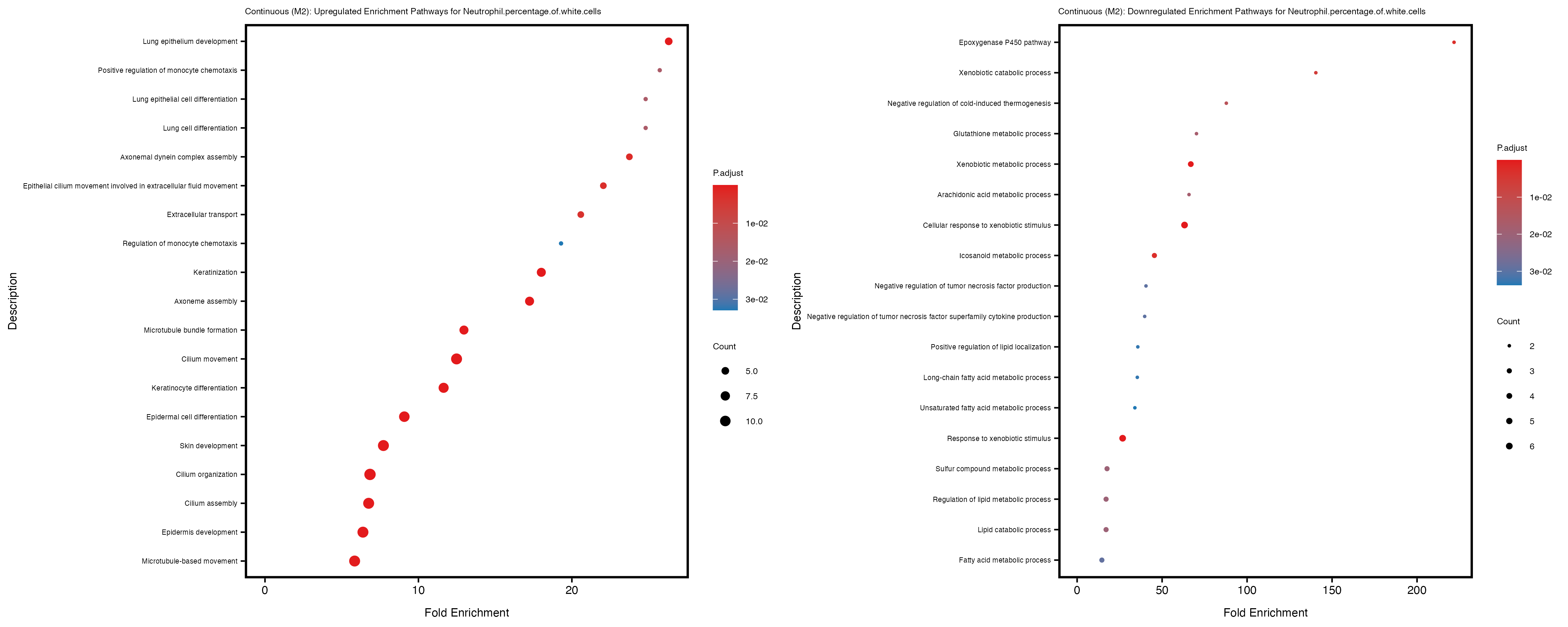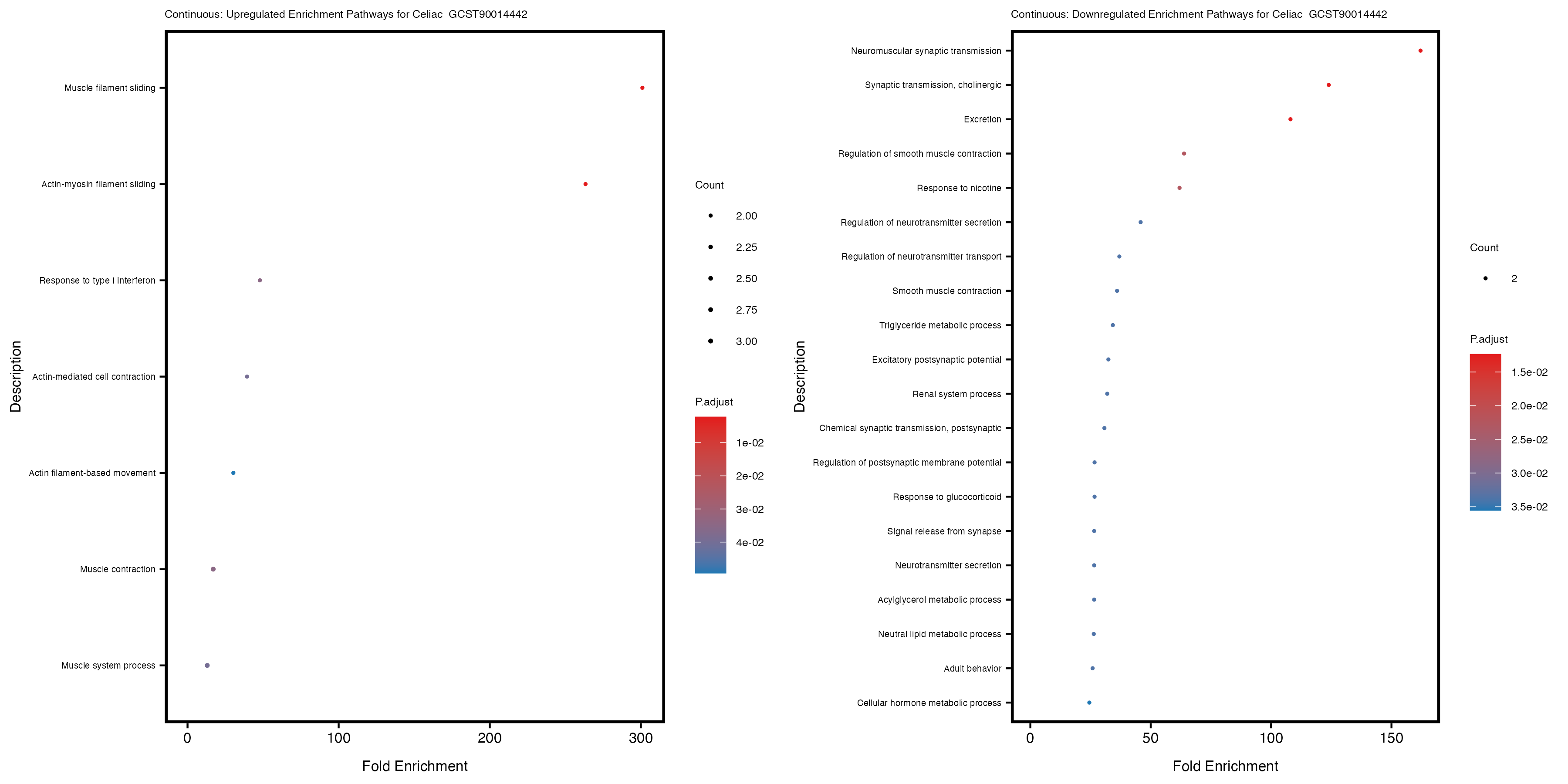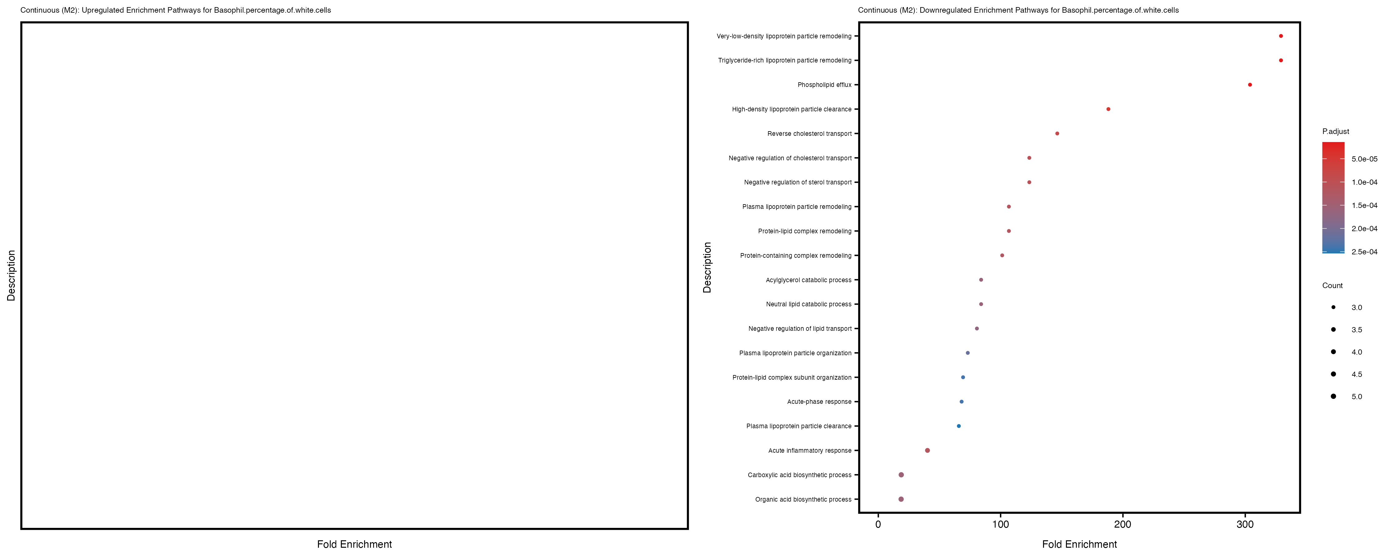 To account for population stratification, we adjusted the model by including the first two genotype principal components (PCs), as they explain most of the genetic variation in the data. For Eosinophil count, we observed that genes were consistently identified as top differentially expressed with and without adjustment. The only difference is that instead of SLC6A9, WFDC2 was detected as top 10 DEGs when adjusting for the first two genotype PCs. WFBC2 is a protease inhibitor with a potential role in innate immune defense (L Bingle, 2006). Although same genes are identified as top DEGs for continuous analysis, additional pathways such as response to inactivity were highlighted when adjusting for the first two genotype PCs.