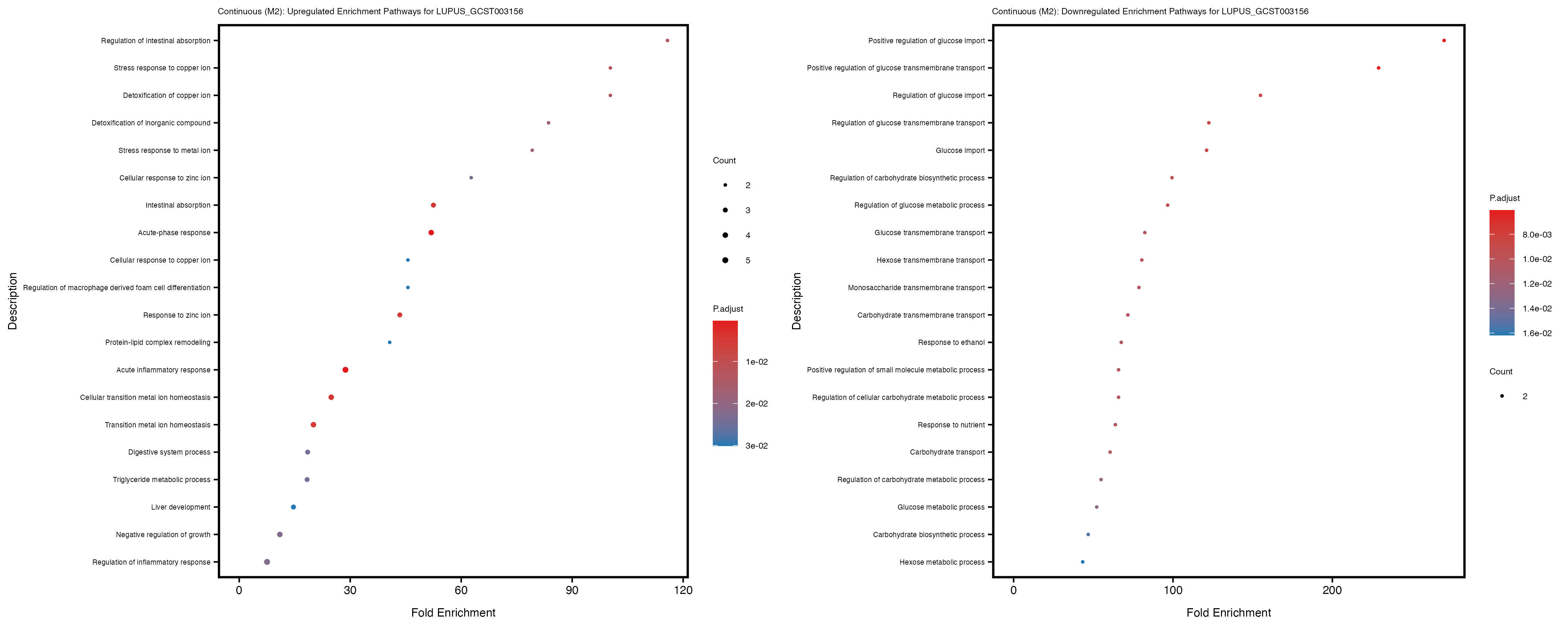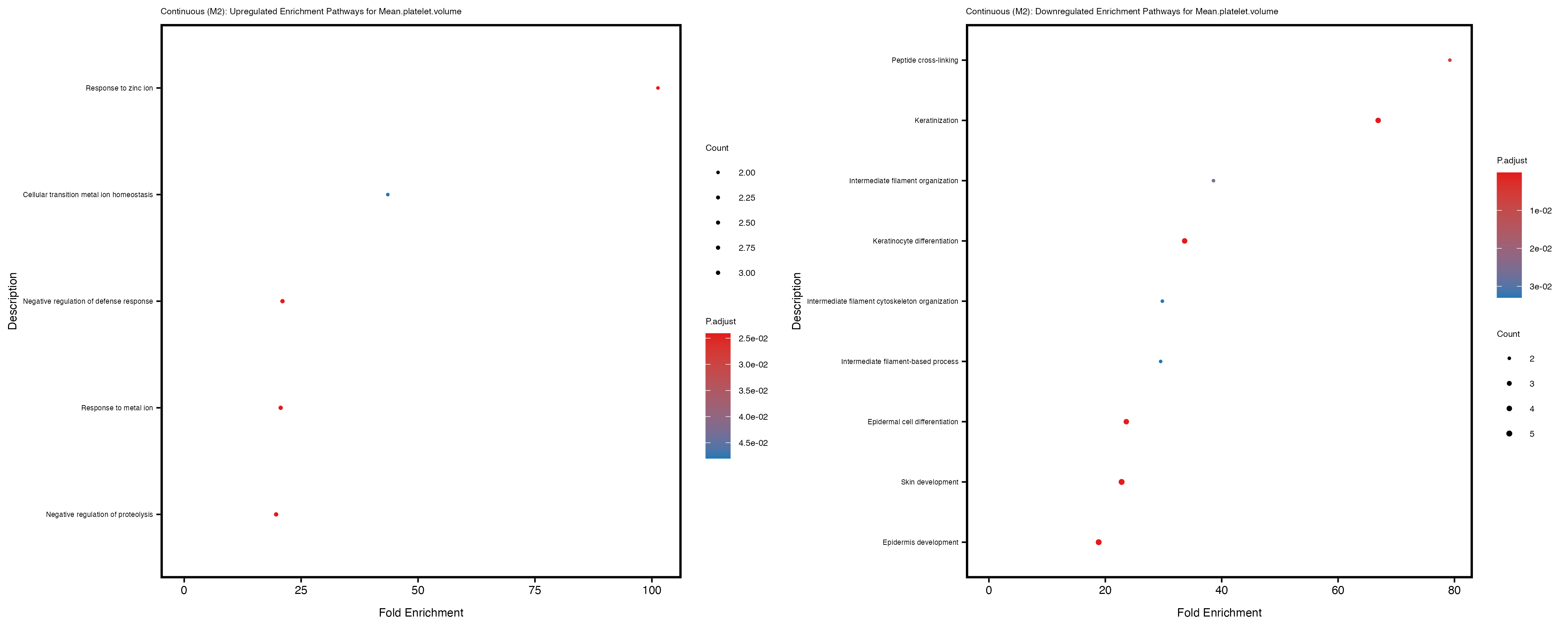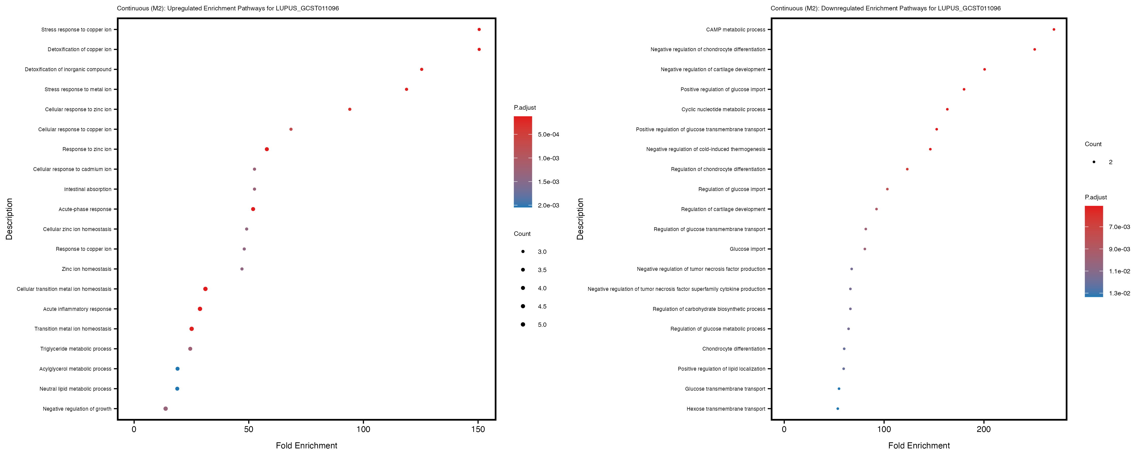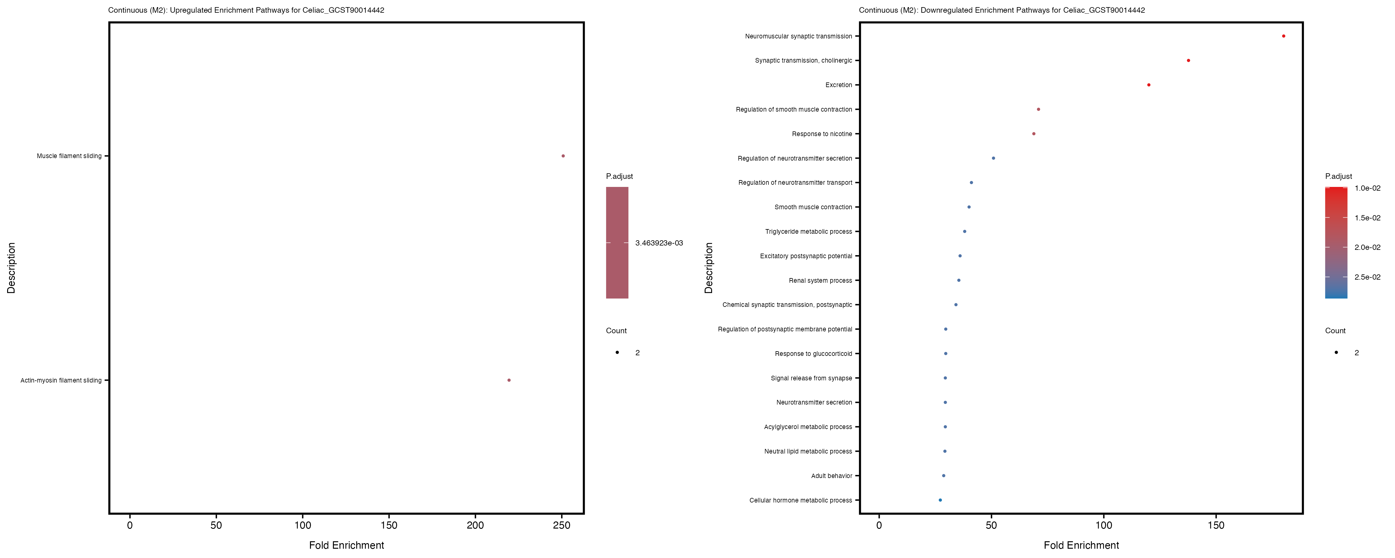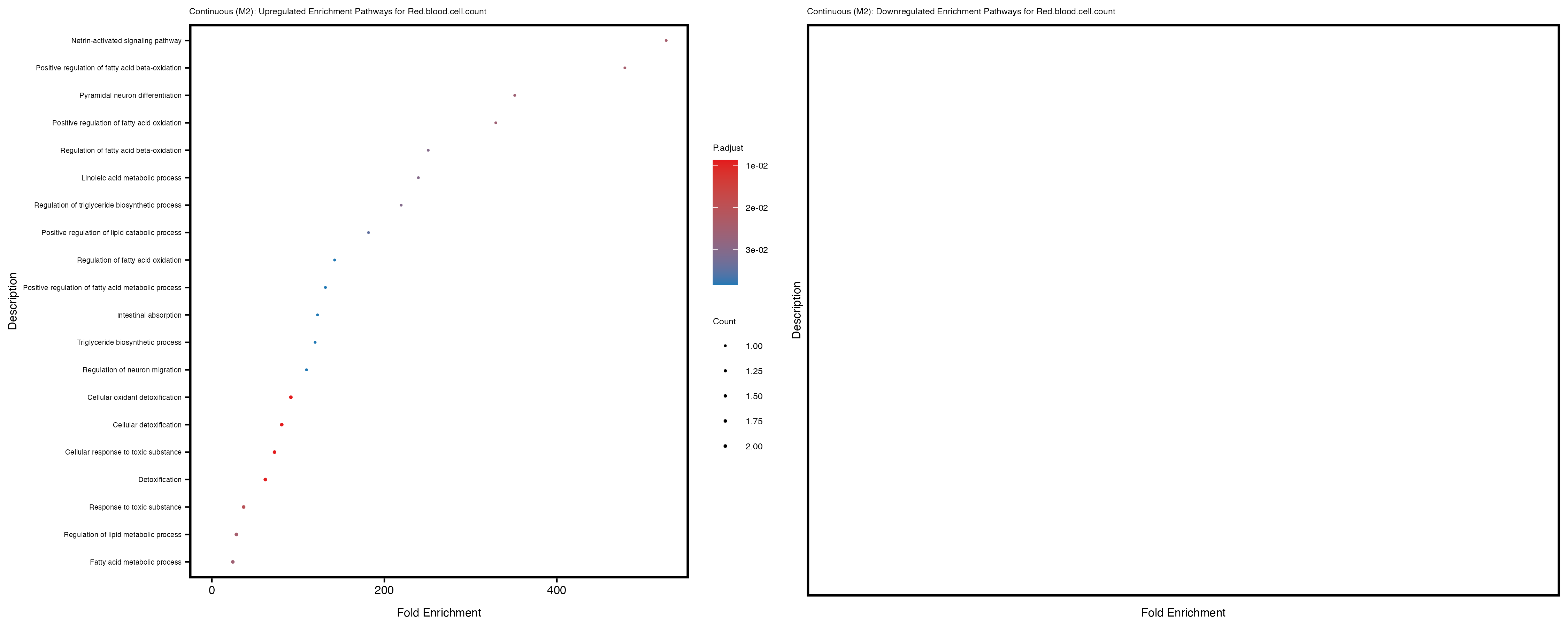 To account for population stratification, we adjusted the model by including the first two genotype principal components (PCs), as they explain most of the genetic variation in the data. For Eosinophil count, we observed that genes were consistently identified as top differentially expressed with and without adjustment. The only difference is that instead of SLC6A9, WFDC2 was detected as top 10 DEGs when adjusting for the first two genotype PCs. WFBC2 is a protease inhibitor with a potential role in innate immune defense (L Bingle, 2006). Although same genes are identified as top DEGs for continuous analysis, additional pathways such as response to inactivity were highlighted when adjusting for the first two genotype PCs.