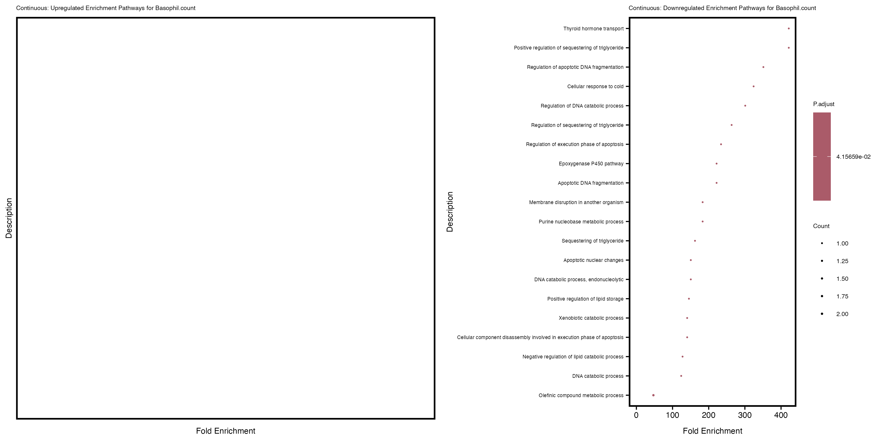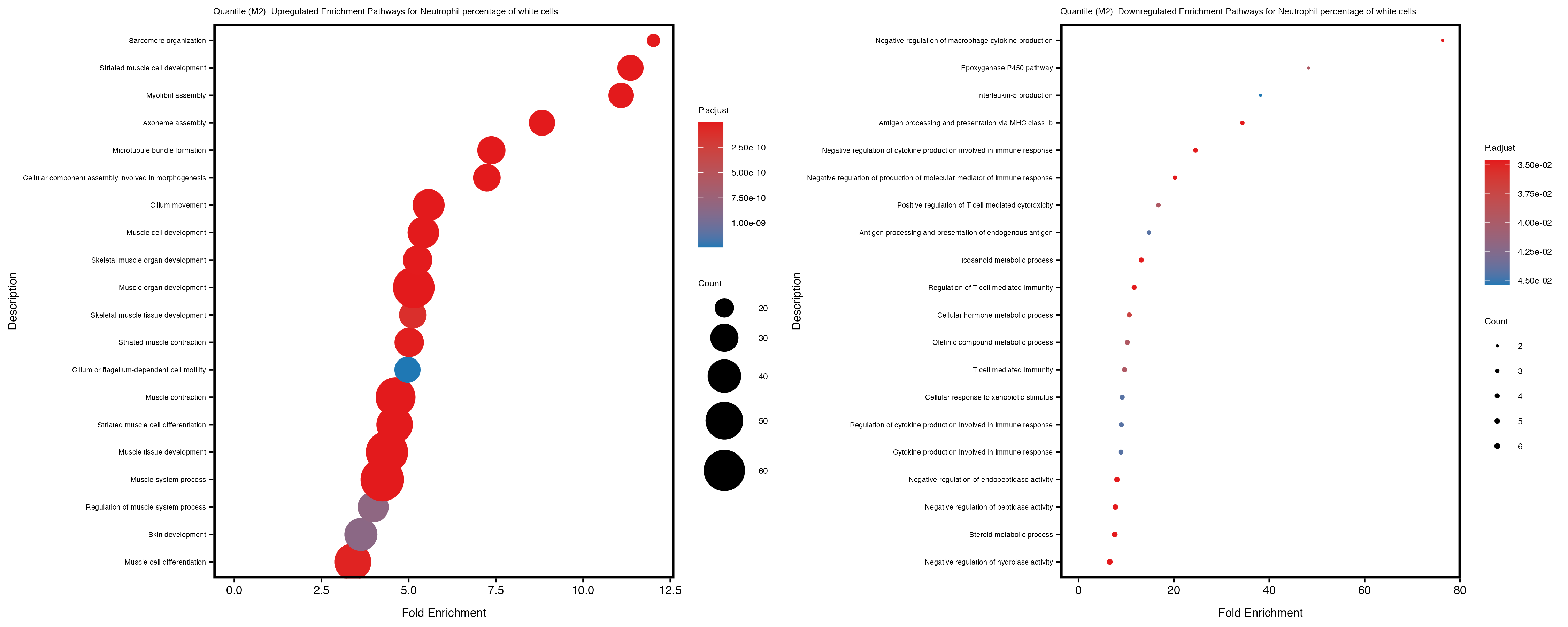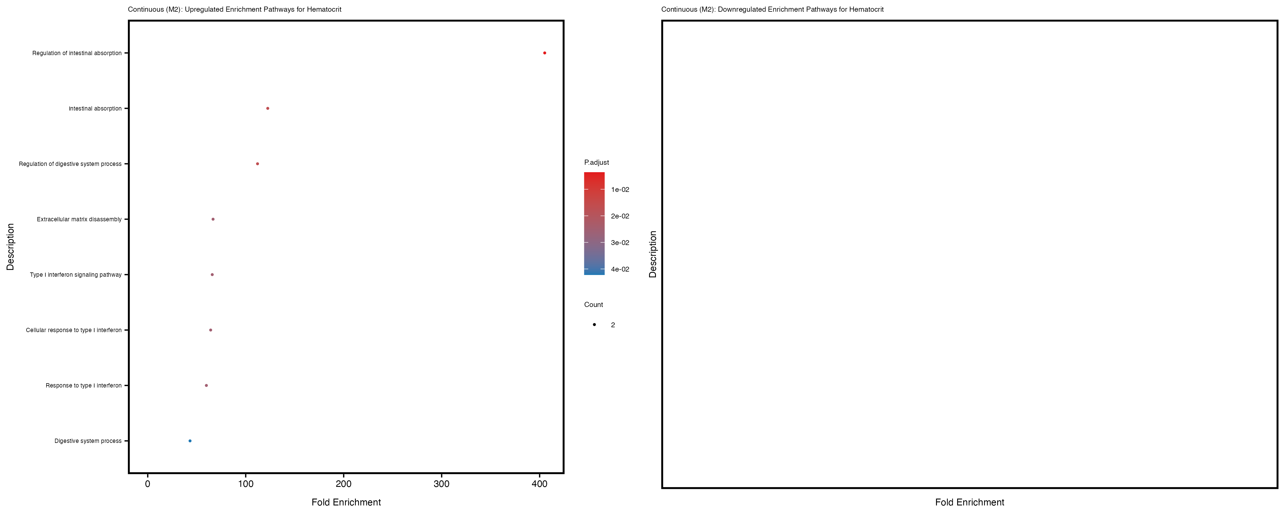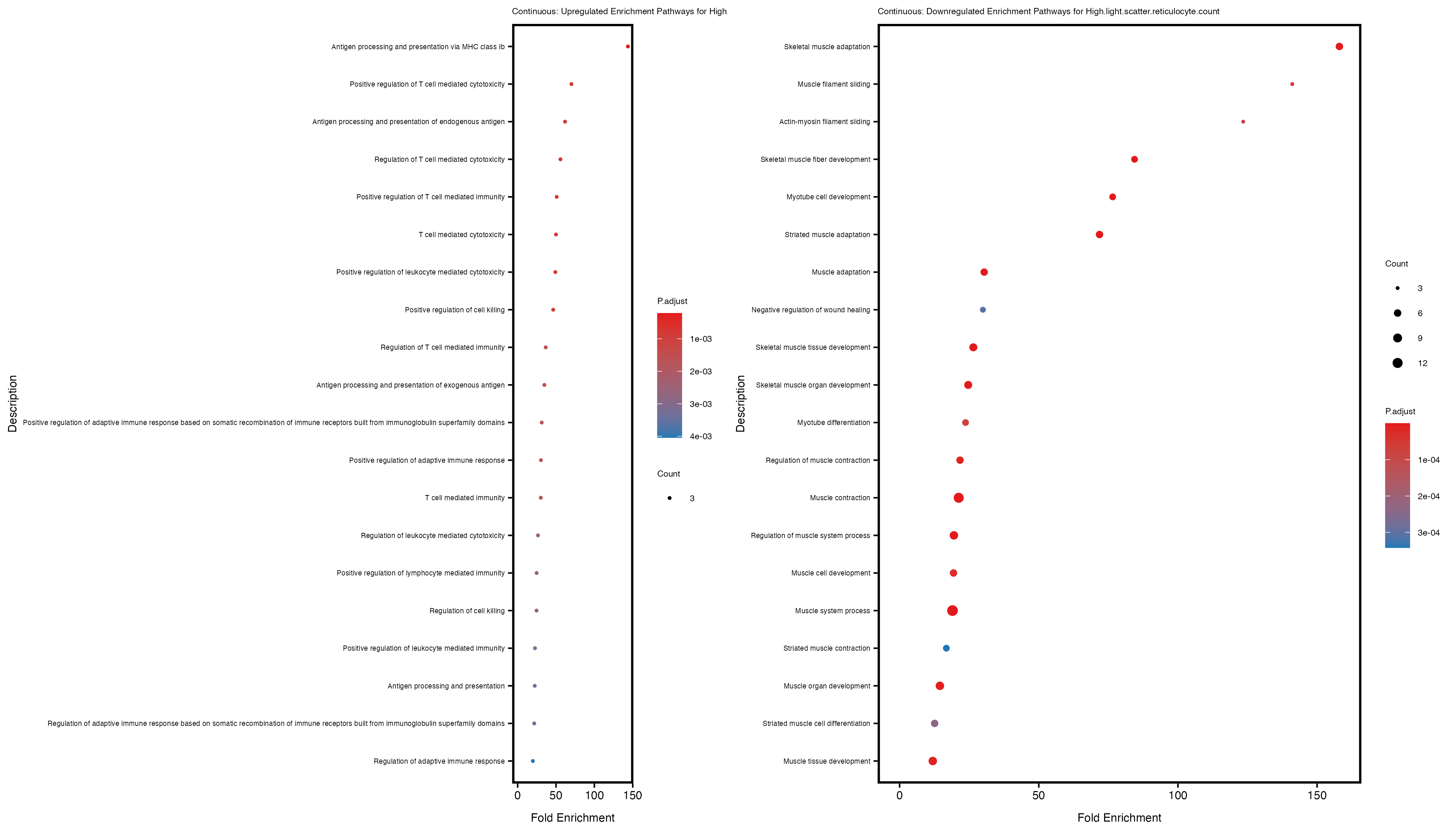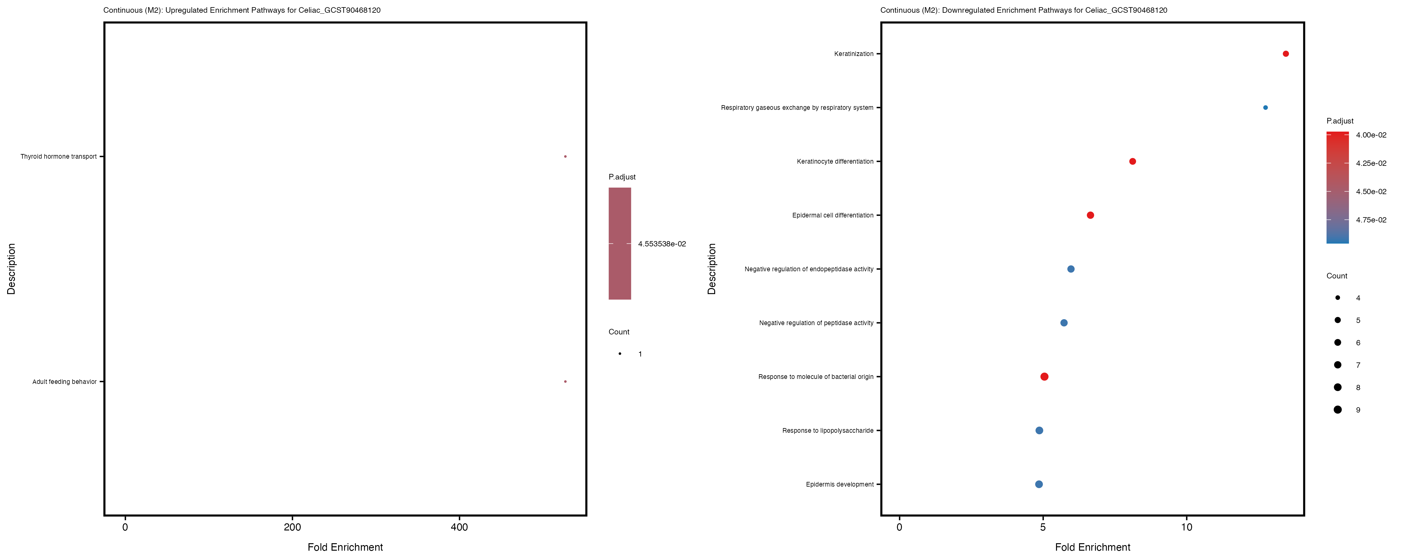 To account for population stratification, we adjusted the model by including the first two genotype principal components (PCs), as they explain most of the genetic variation in the data. For Eosinophil count, we observed that genes were consistently identified as top differentially expressed with and without adjustment. The only difference is that instead of SLC6A9, WFDC2 was detected as top 10 DEGs when adjusting for the first two genotype PCs. WFBC2 is a protease inhibitor with a potential role in innate immune defense (L Bingle, 2006). Although same genes are identified as top DEGs for continuous analysis, additional pathways such as response to inactivity were highlighted when adjusting for the first two genotype PCs.