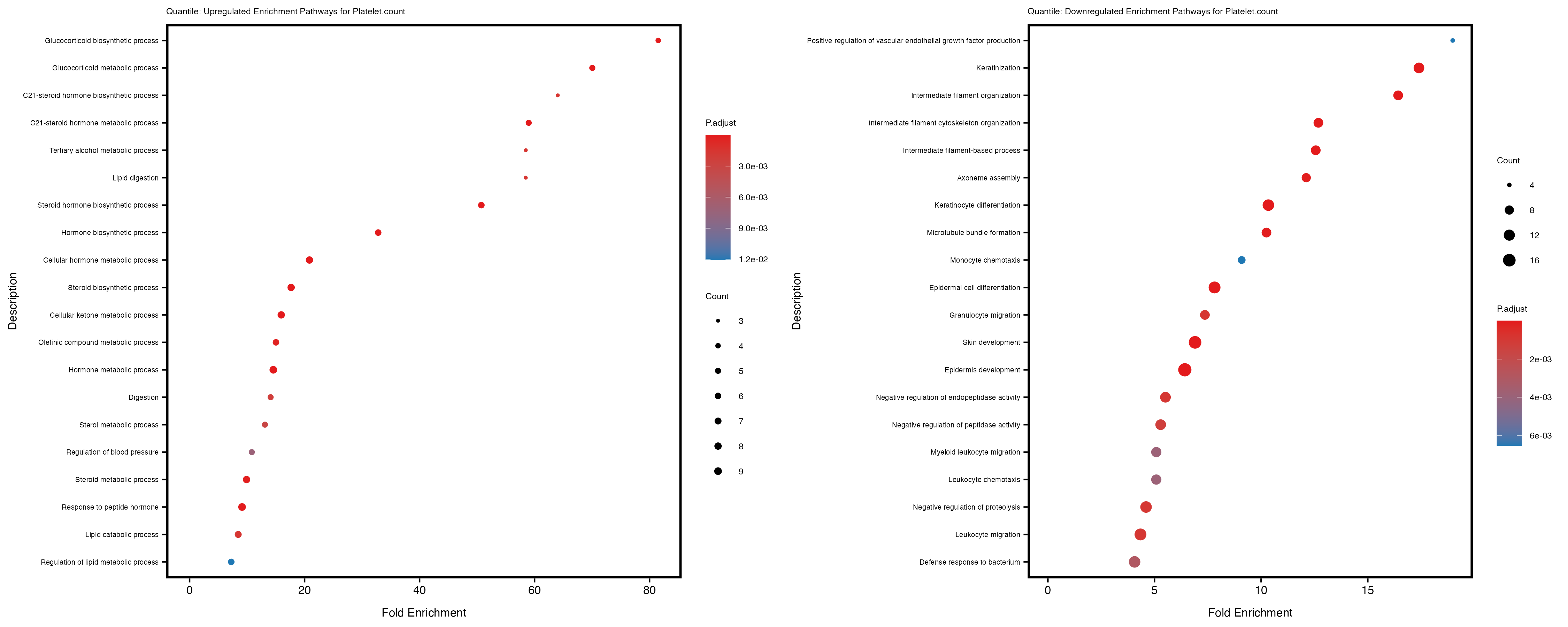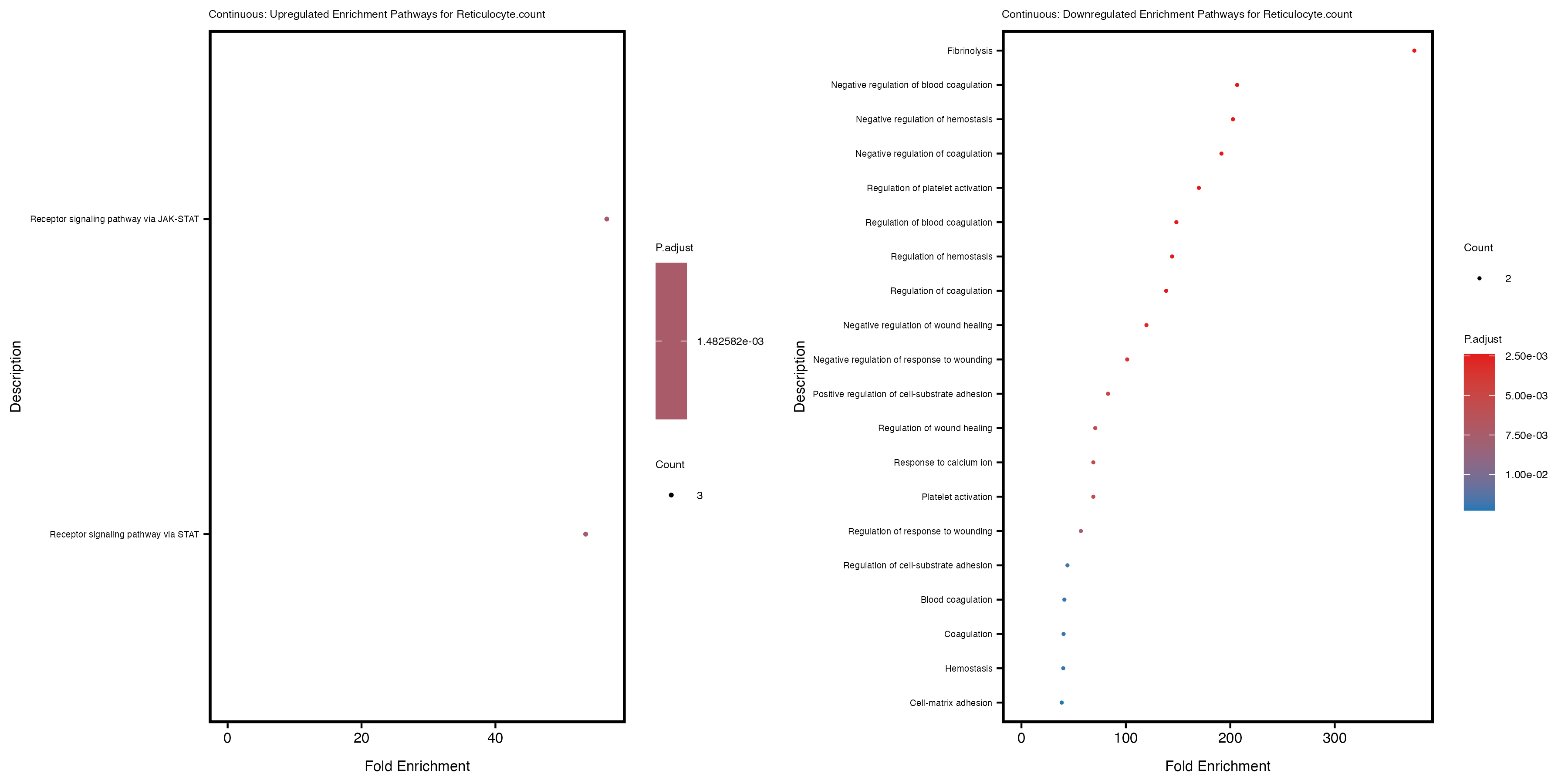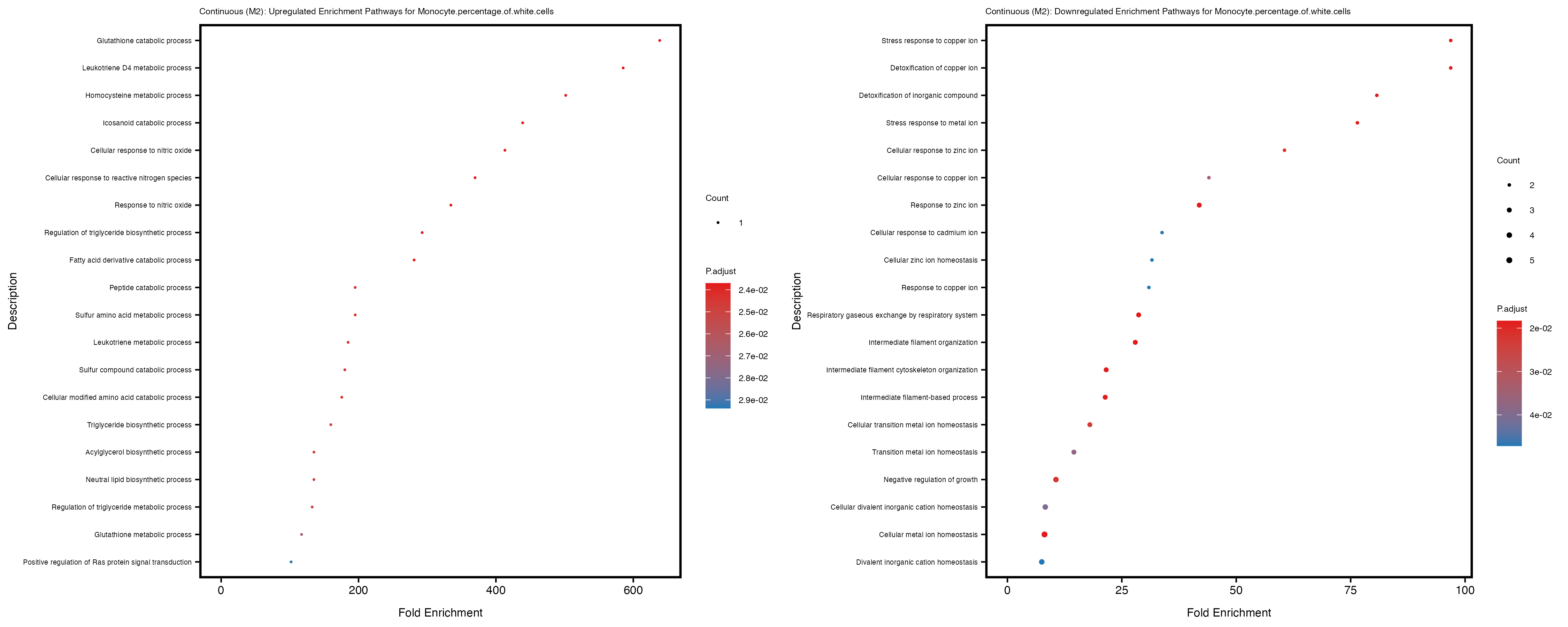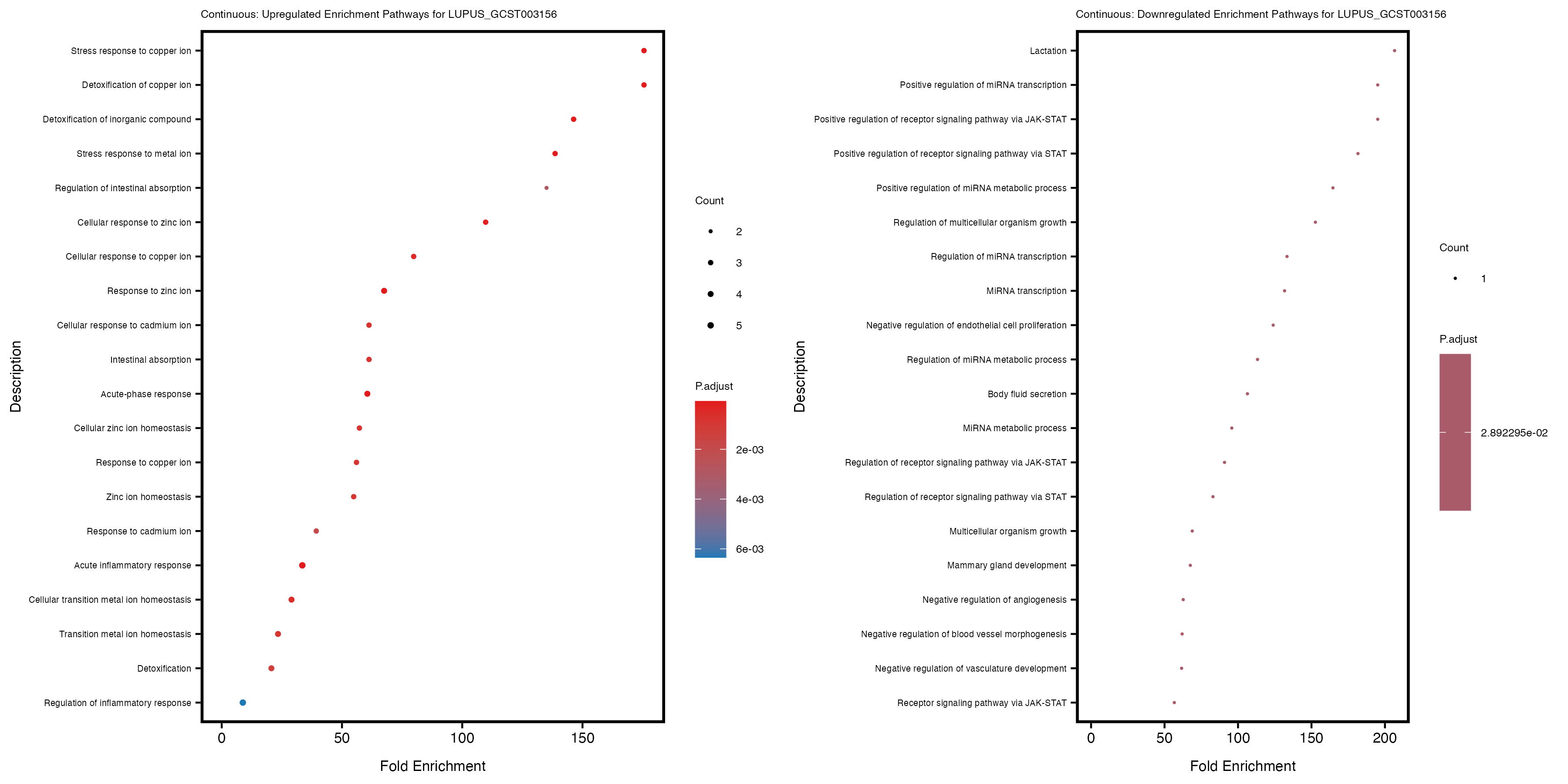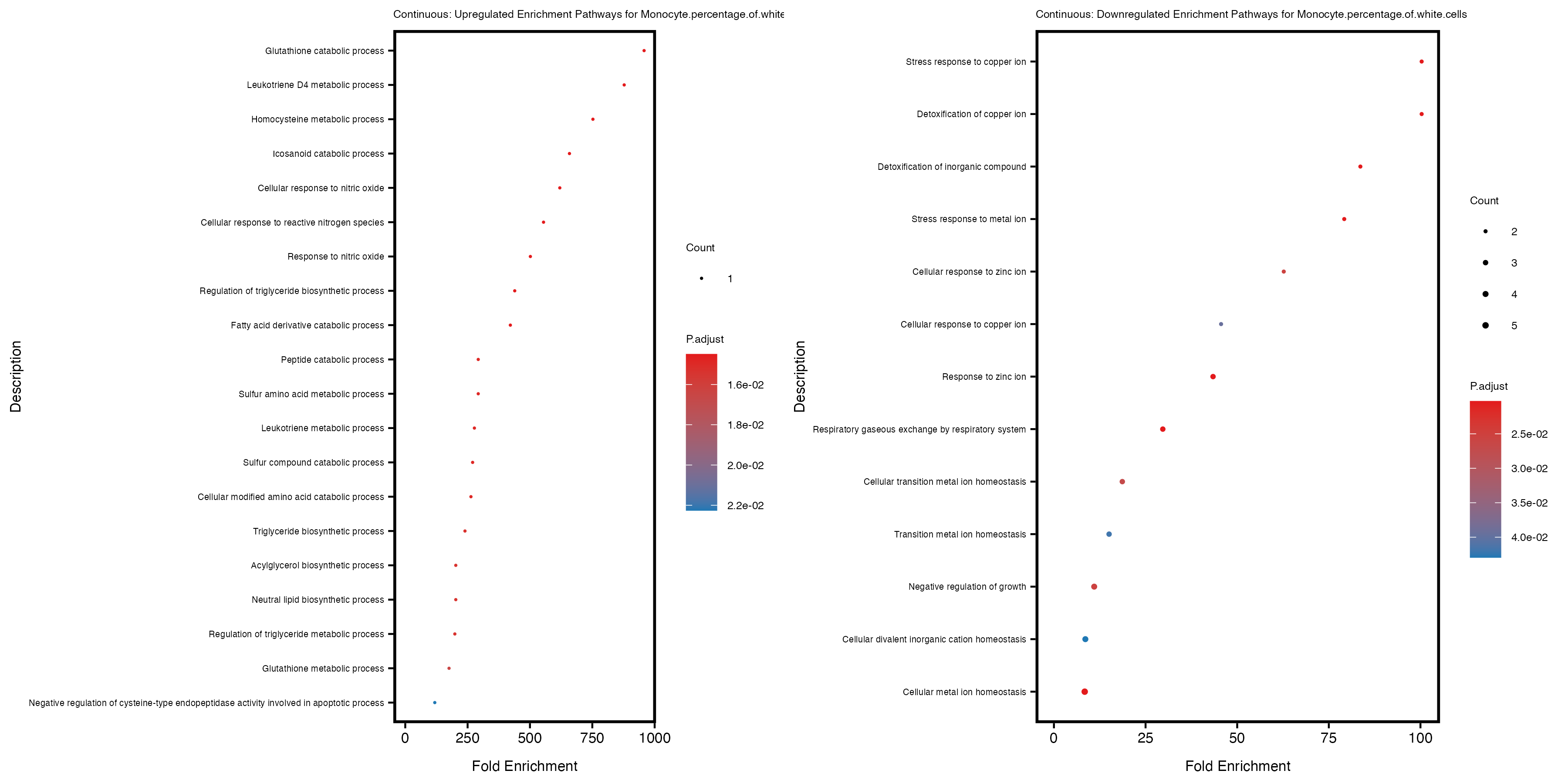 To account for population stratification, we adjusted the model by including the first two genotype principal components (PCs), as they explain most of the genetic variation in the data. For Eosinophil count, we observed that genes were consistently identified as top differentially expressed with and without adjustment. The only difference is that instead of SLC6A9, WFDC2 was detected as top 10 DEGs when adjusting for the first two genotype PCs. WFBC2 is a protease inhibitor with a potential role in innate immune defense (L Bingle, 2006). Although same genes are identified as top DEGs for continuous analysis, additional pathways such as response to inactivity were highlighted when adjusting for the first two genotype PCs.