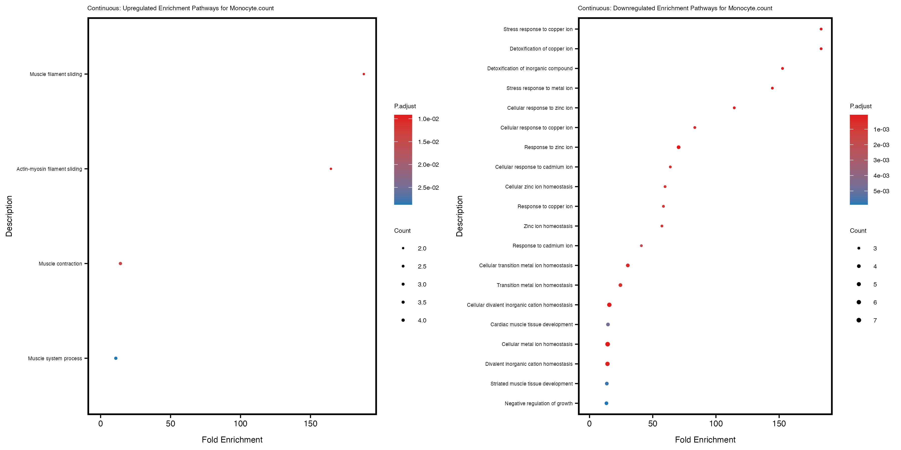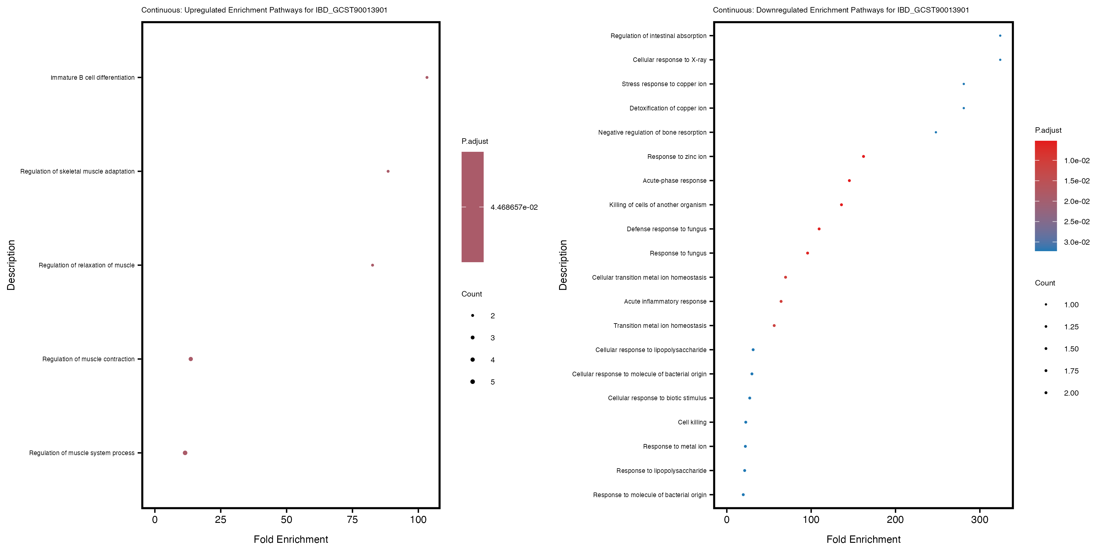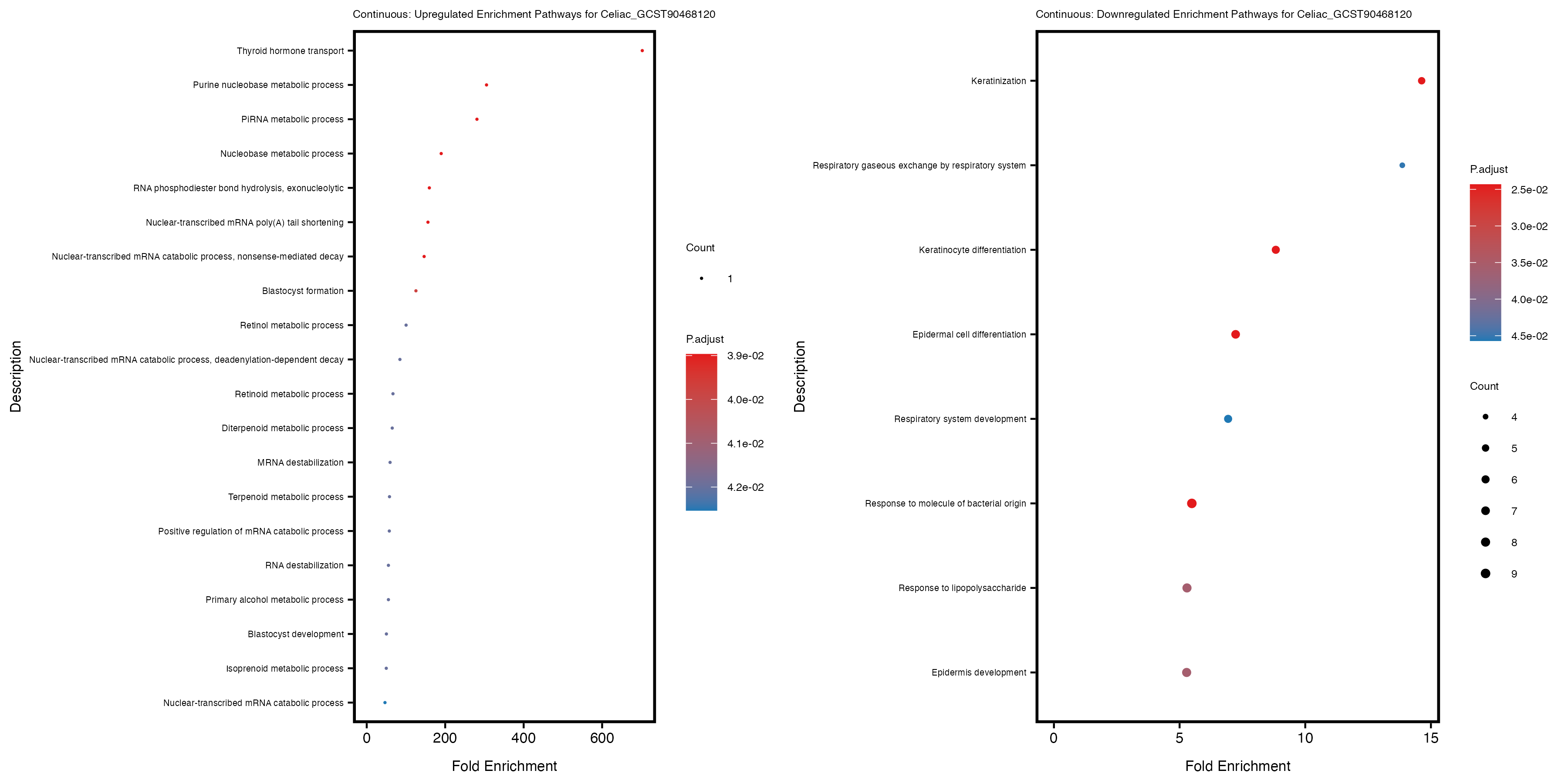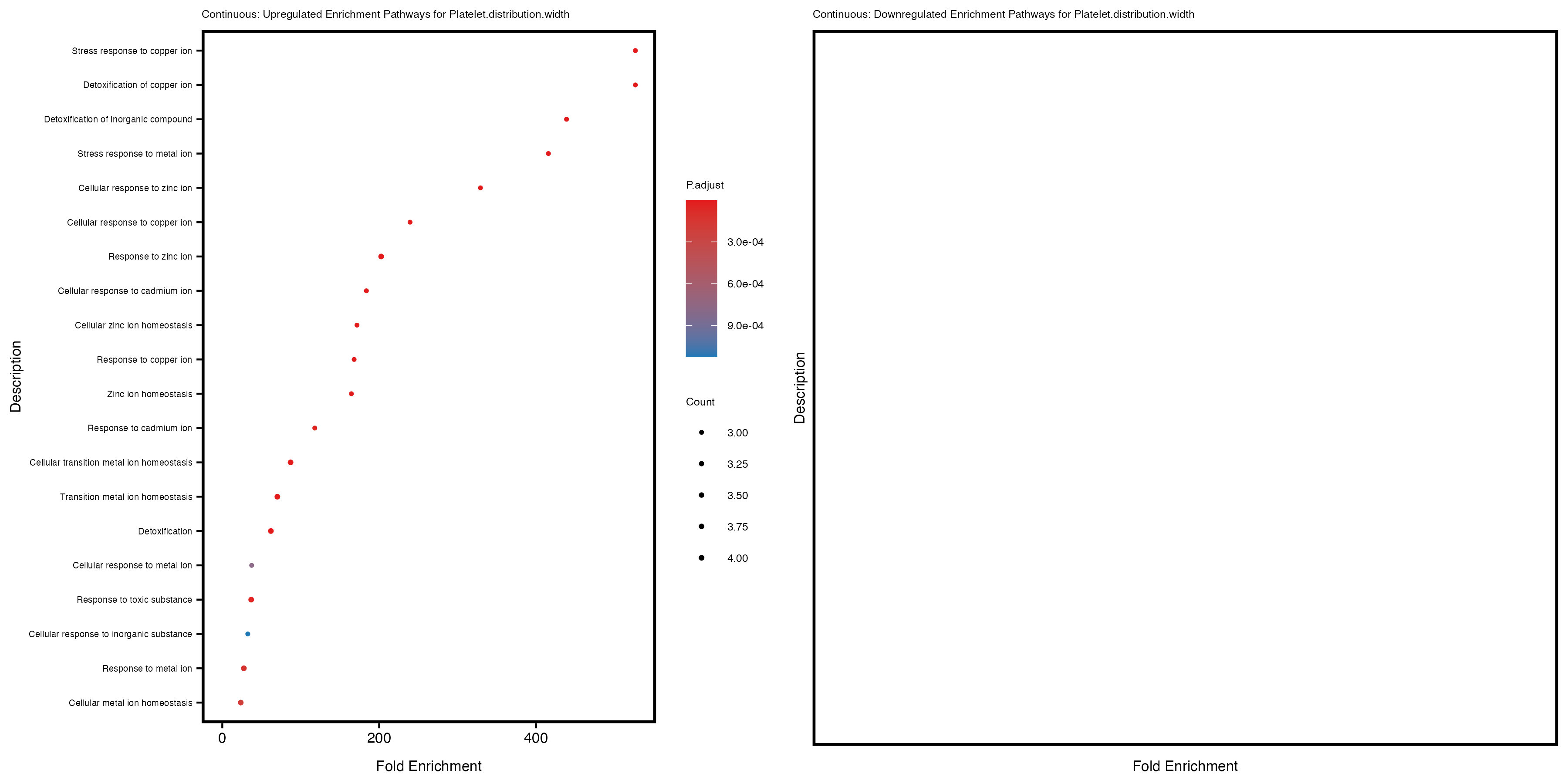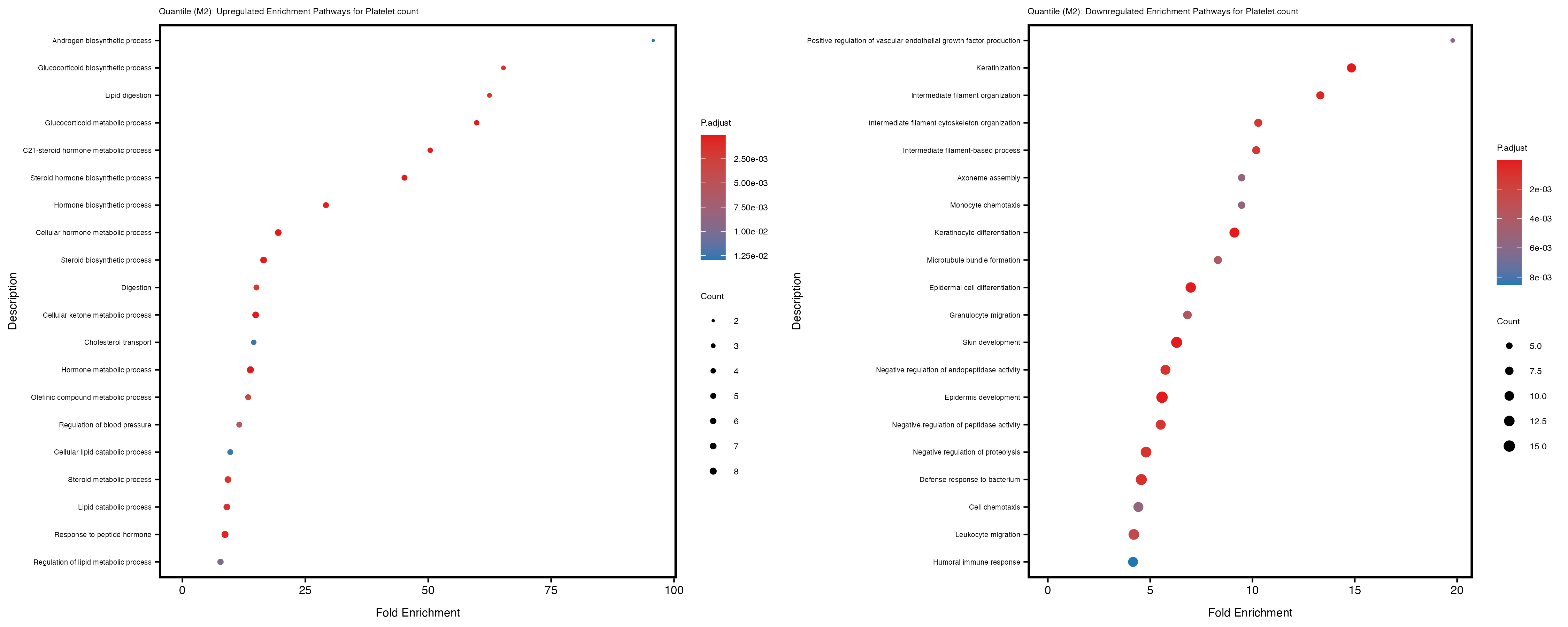 To account for population stratification, we adjusted the model by including the first two genotype principal components (PCs), as they explain most of the genetic variation in the data. For Eosinophil count, we observed that genes were consistently identified as top differentially expressed with and without adjustment. The only difference is that instead of SLC6A9, WFDC2 was detected as top 10 DEGs when adjusting for the first two genotype PCs. WFBC2 is a protease inhibitor with a potential role in innate immune defense (L Bingle, 2006). Although same genes are identified as top DEGs for continuous analysis, additional pathways such as response to inactivity were highlighted when adjusting for the first two genotype PCs.