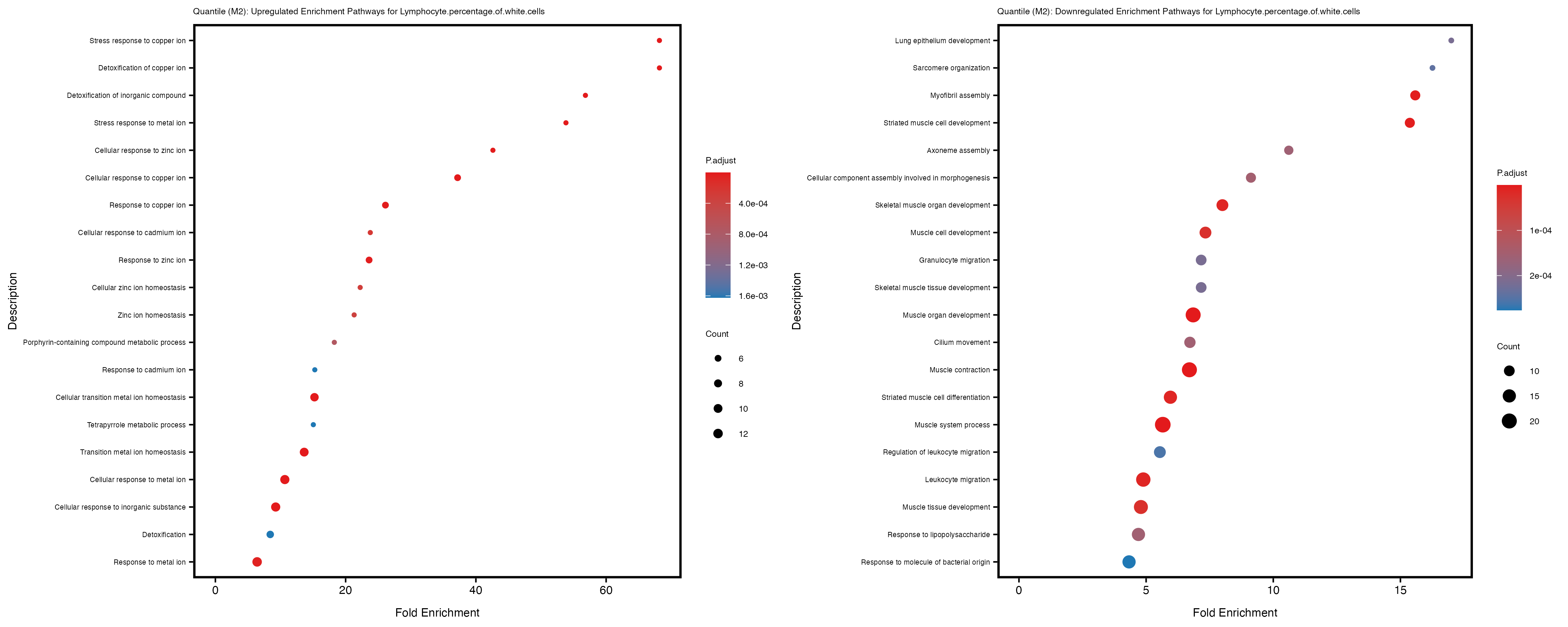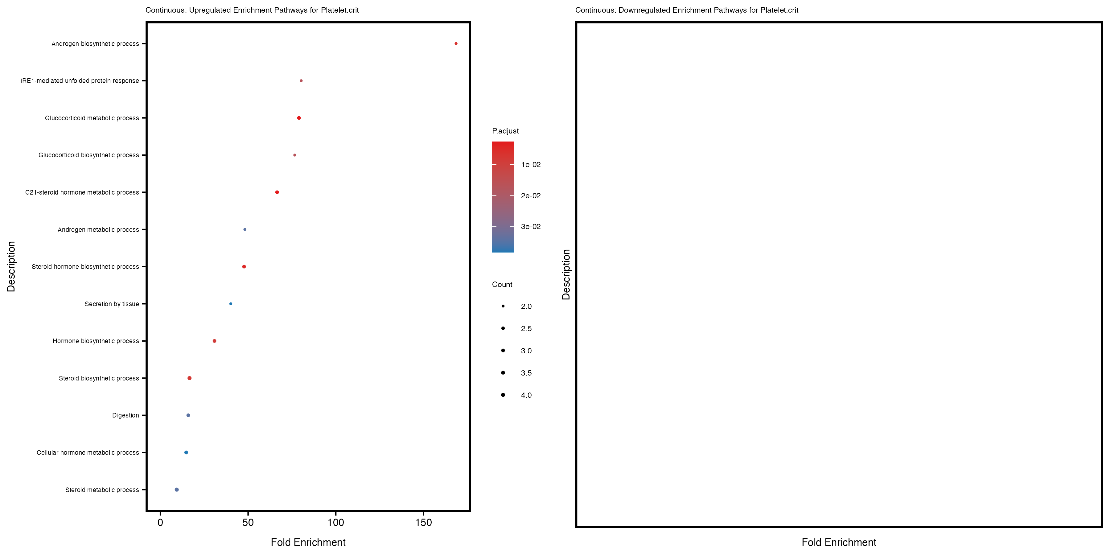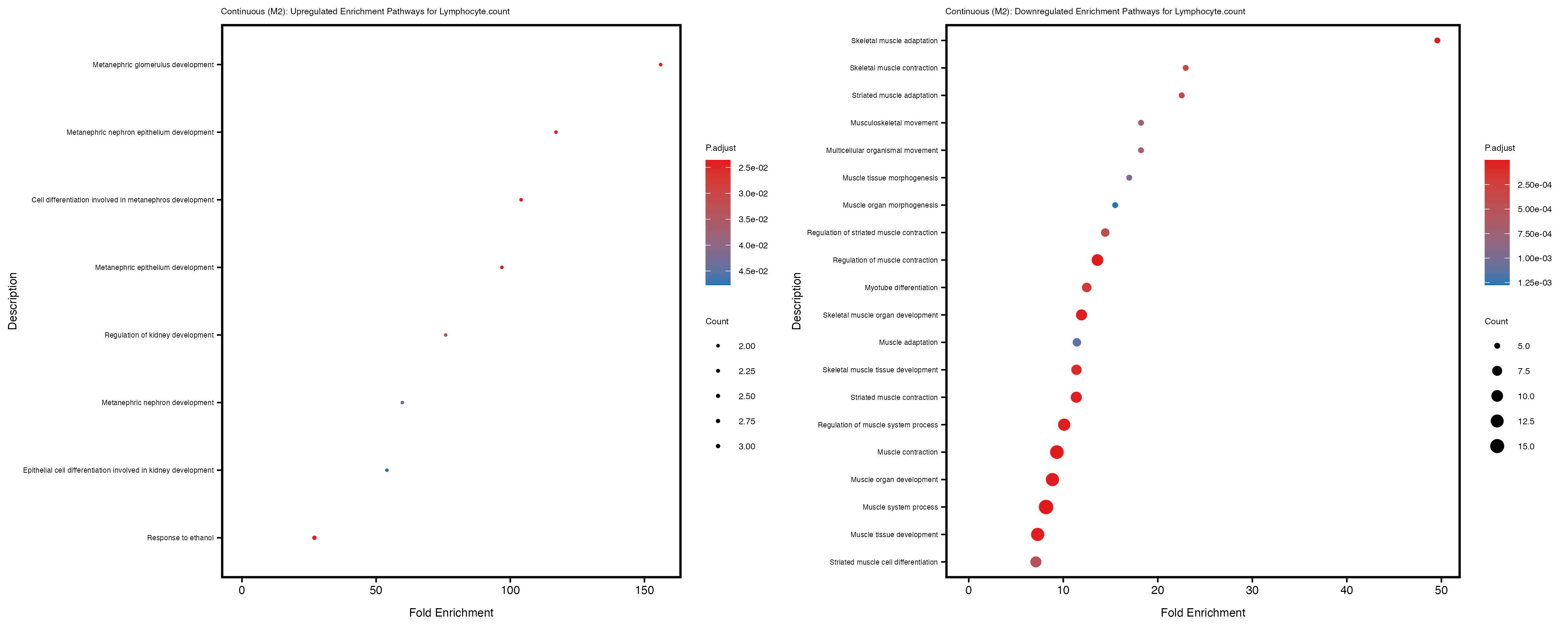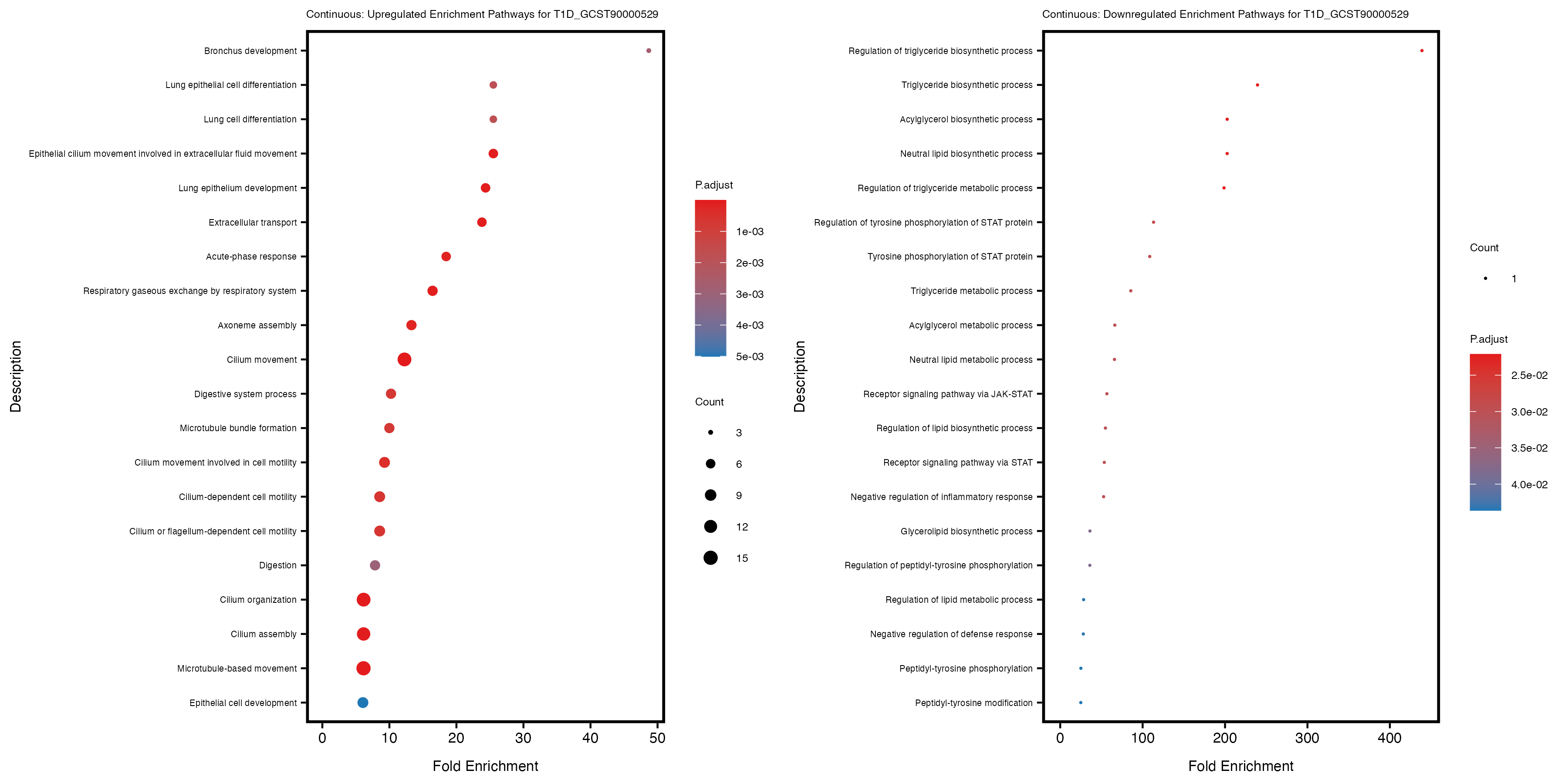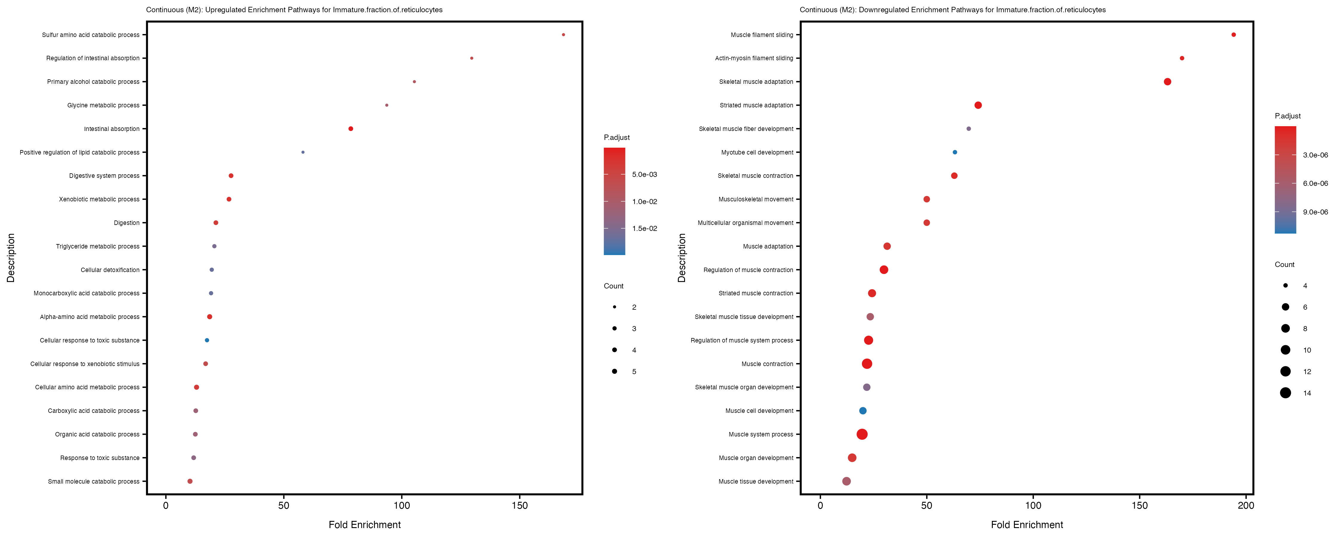 To account for population stratification, we adjusted the model by including the first two genotype principal components (PCs), as they explain most of the genetic variation in the data. For Eosinophil count, we observed that genes were consistently identified as top differentially expressed with and without adjustment. The only difference is that instead of SLC6A9, WFDC2 was detected as top 10 DEGs when adjusting for the first two genotype PCs. WFBC2 is a protease inhibitor with a potential role in innate immune defense (L Bingle, 2006). Although same genes are identified as top DEGs for continuous analysis, additional pathways such as response to inactivity were highlighted when adjusting for the first two genotype PCs.