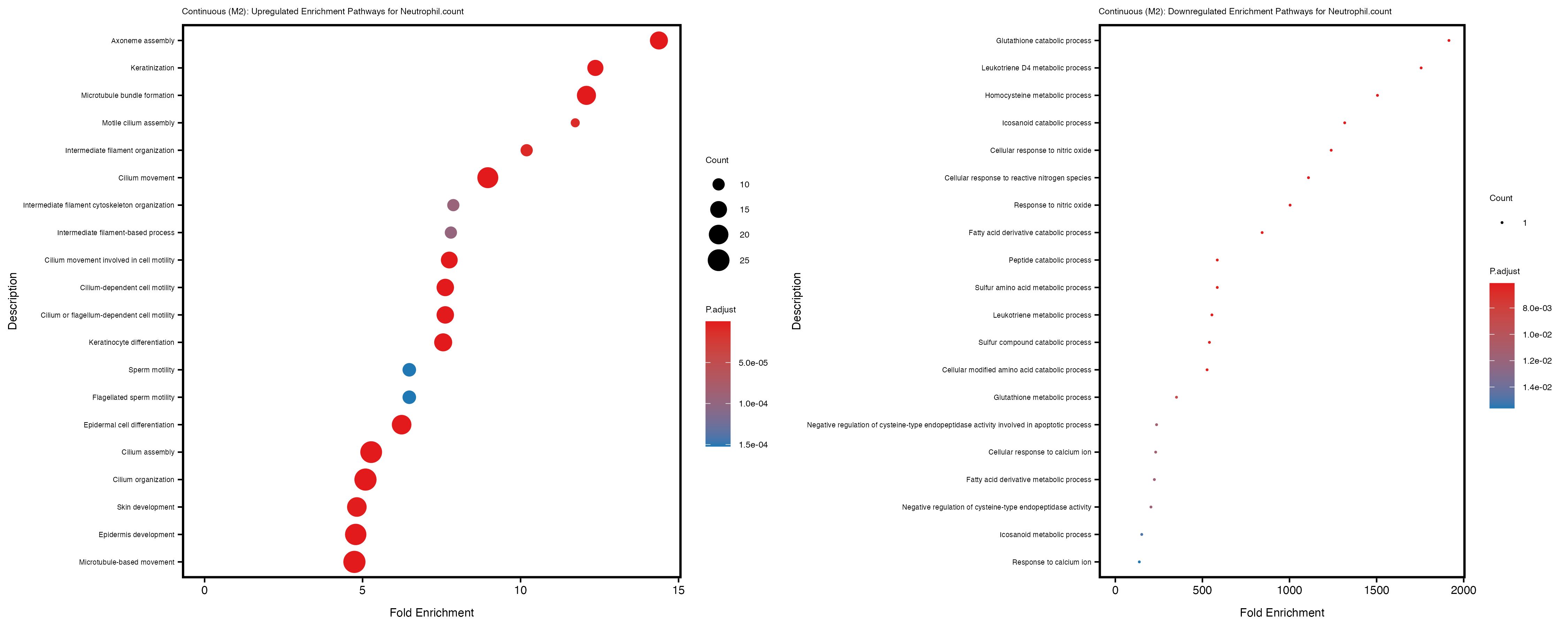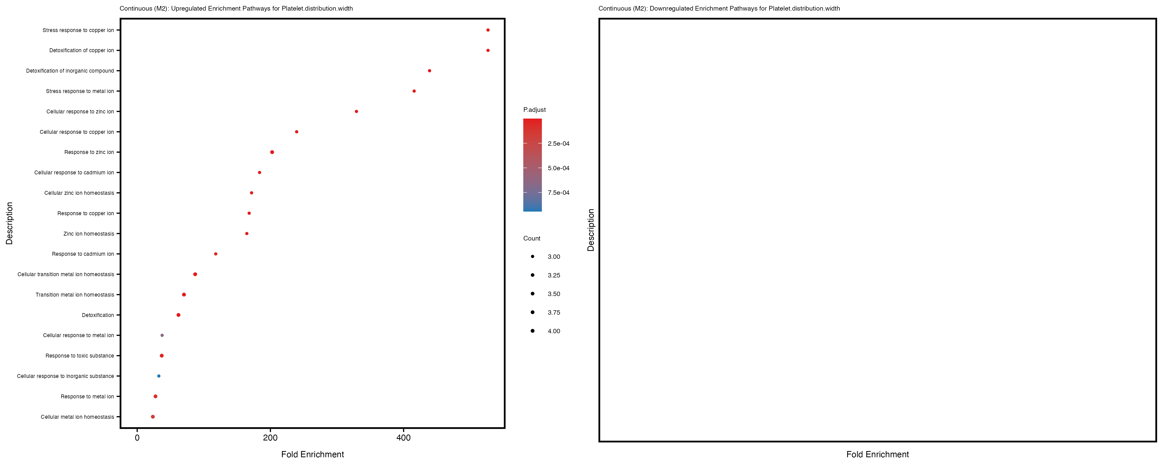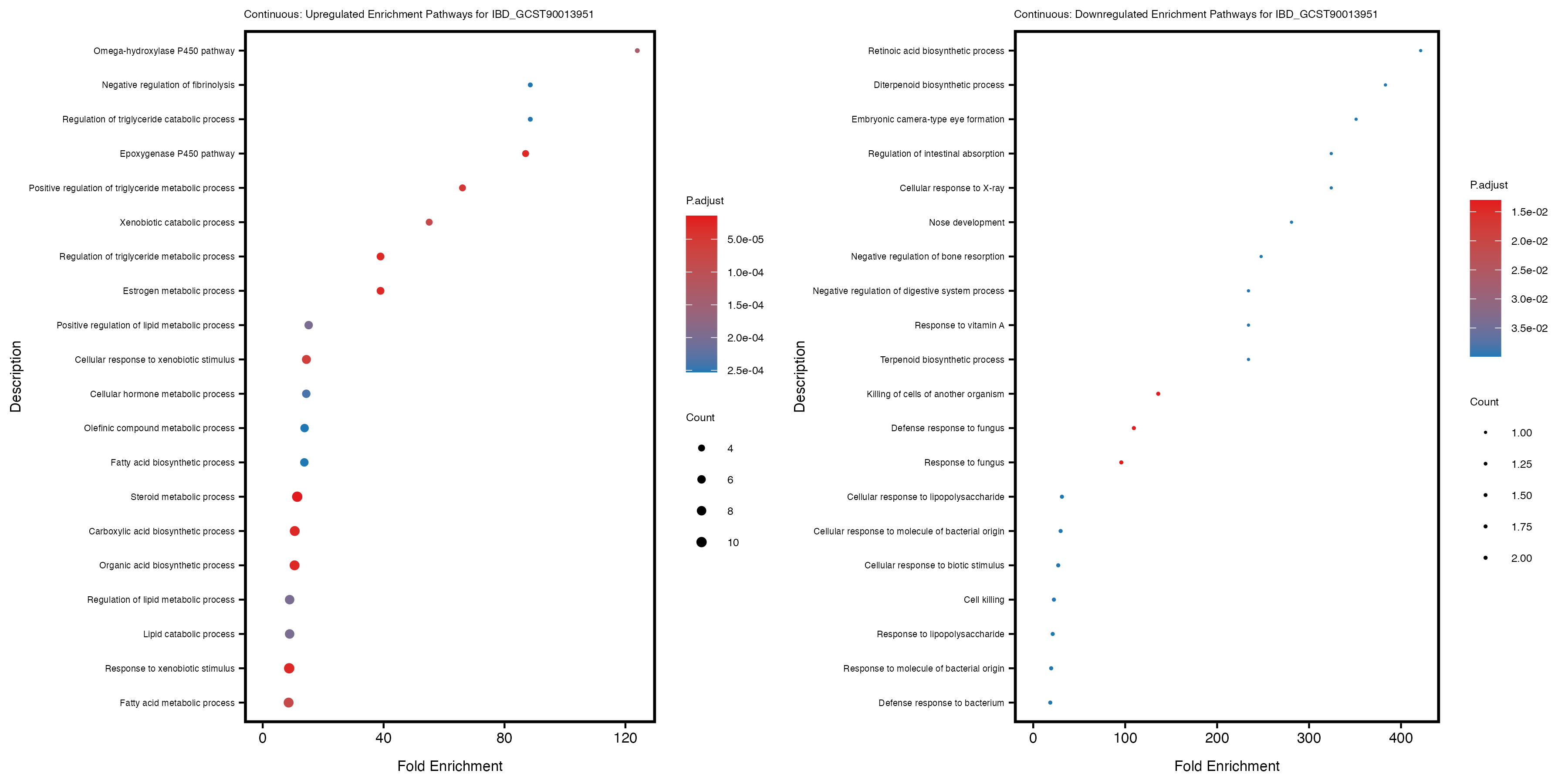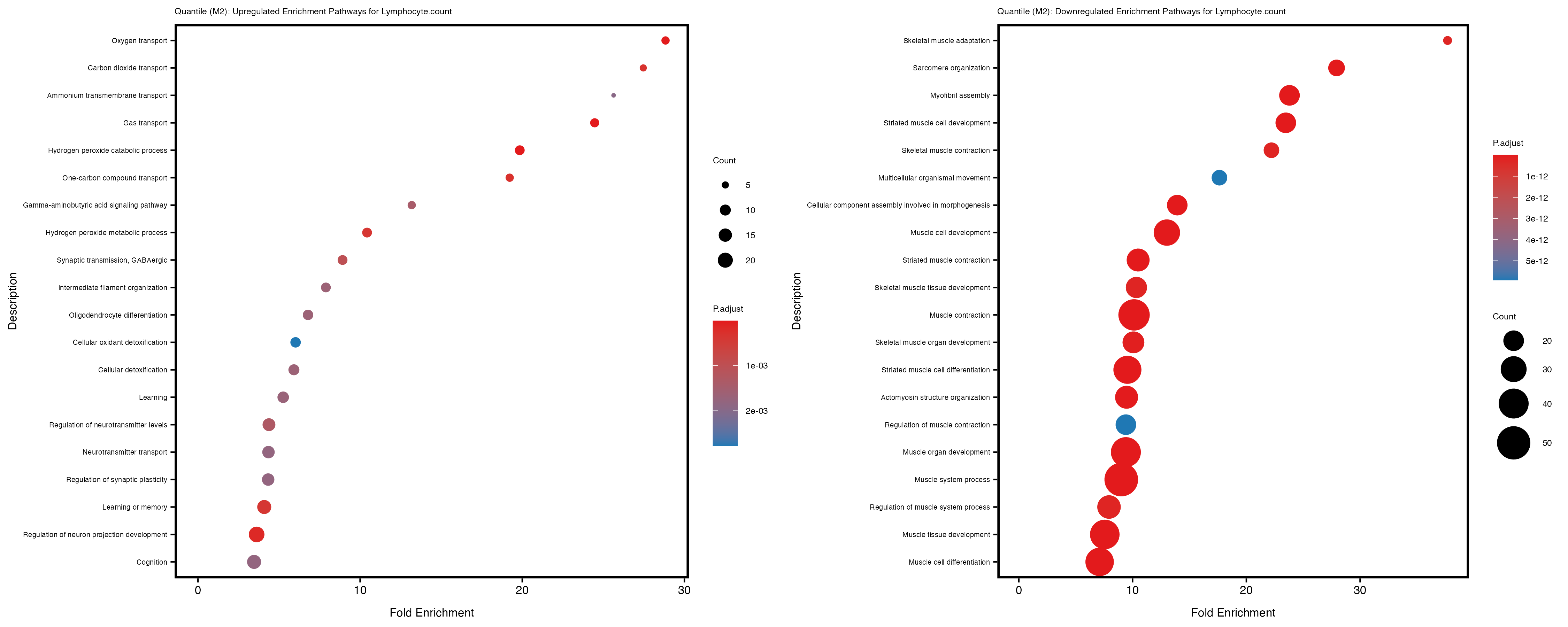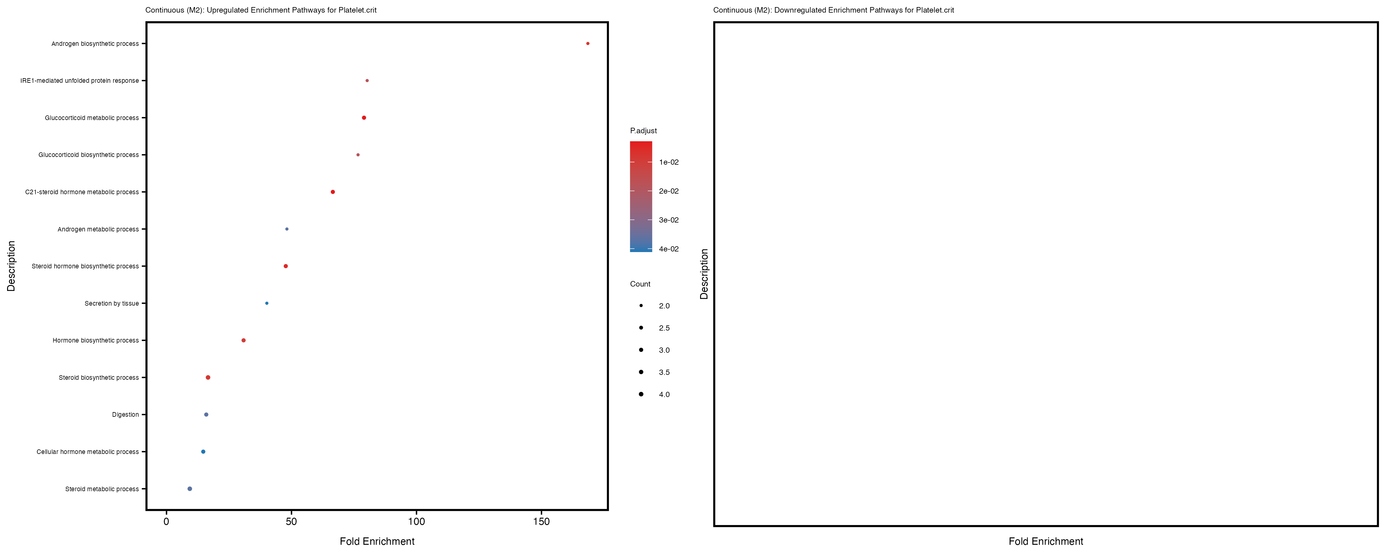To account for population stratification, we adjusted the model by including the first two genotype principal components (PCs), as they explain most of the genetic variation in the data. For Eosinophil count, we observed that genes were consistently identified as top differentially expressed with and without adjustment. The only difference is that instead of SLC6A9, WFDC2 was detected as top 10 DEGs when adjusting for the first two genotype PCs. WFBC2 is a protease inhibitor with a potential role in innate immune defense (L Bingle, 2006). Although same genes are identified as top DEGs for continuous analysis, additional pathways such as response to inactivity were highlighted when adjusting for the first two genotype PCs.