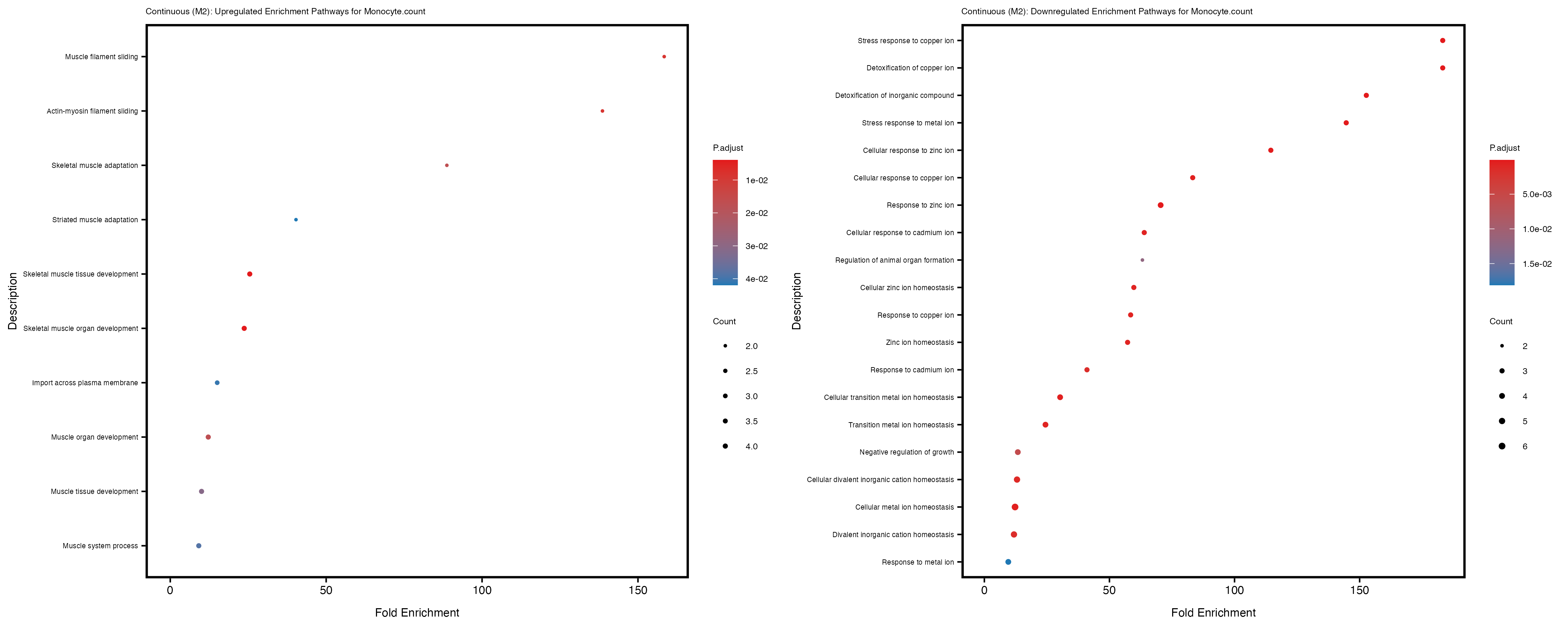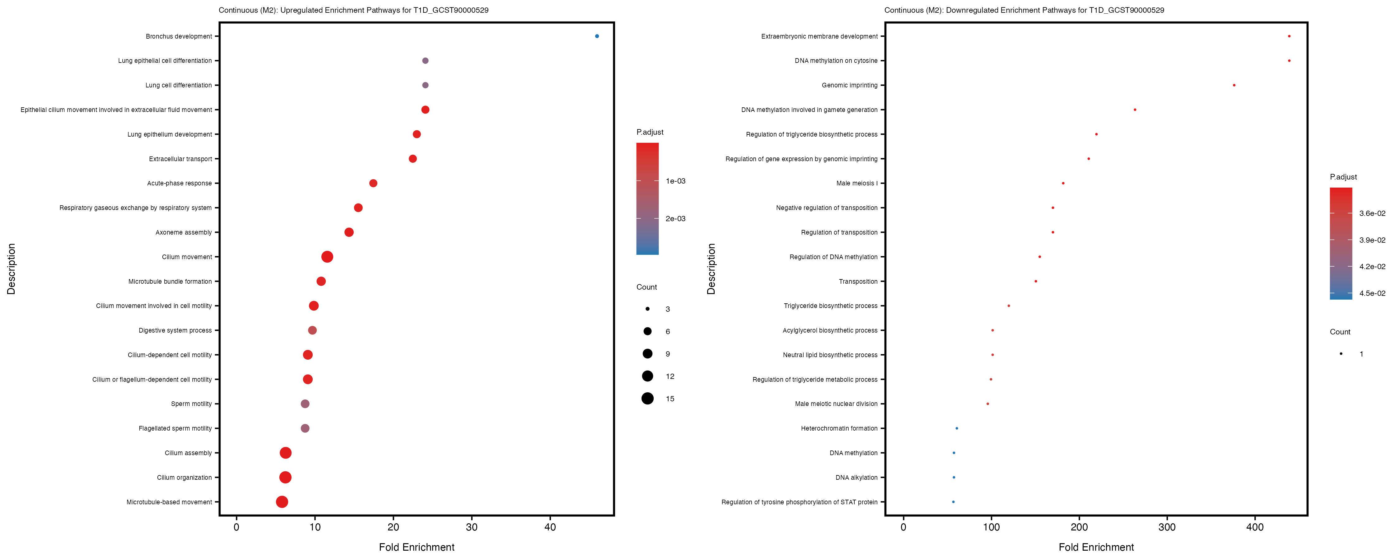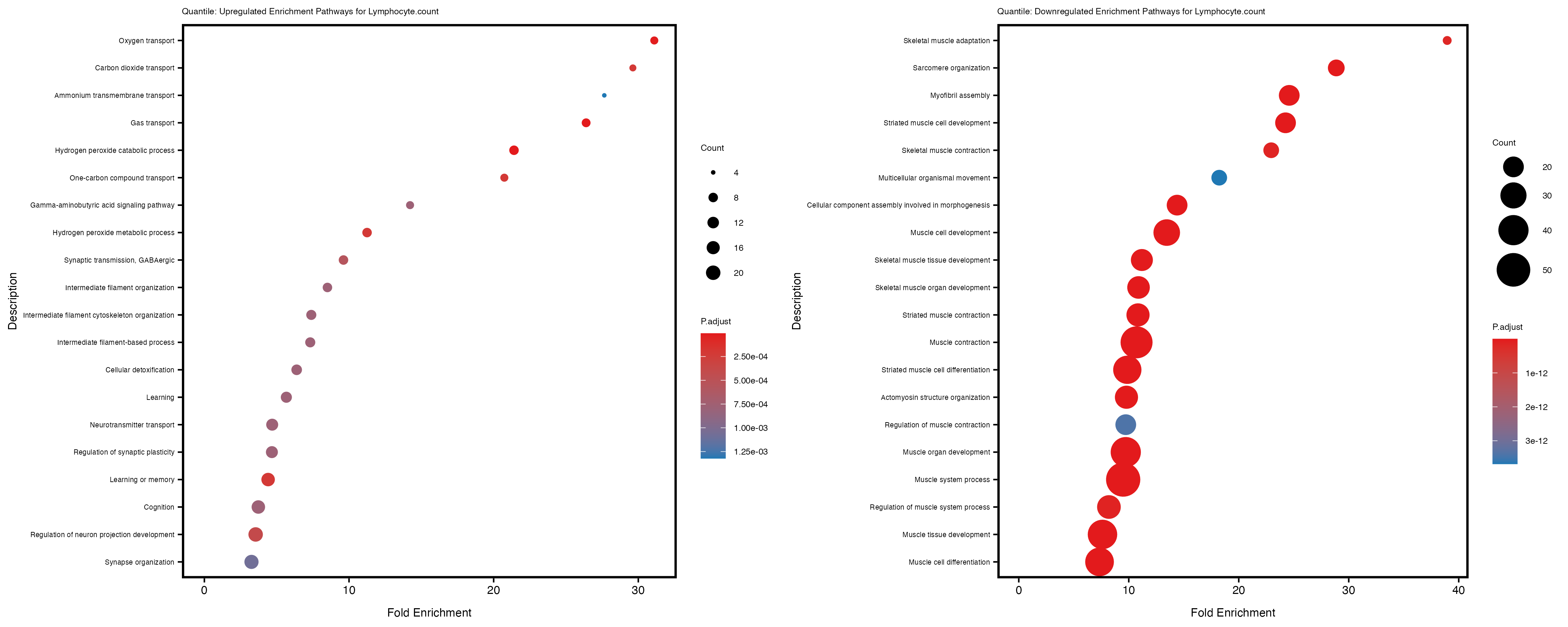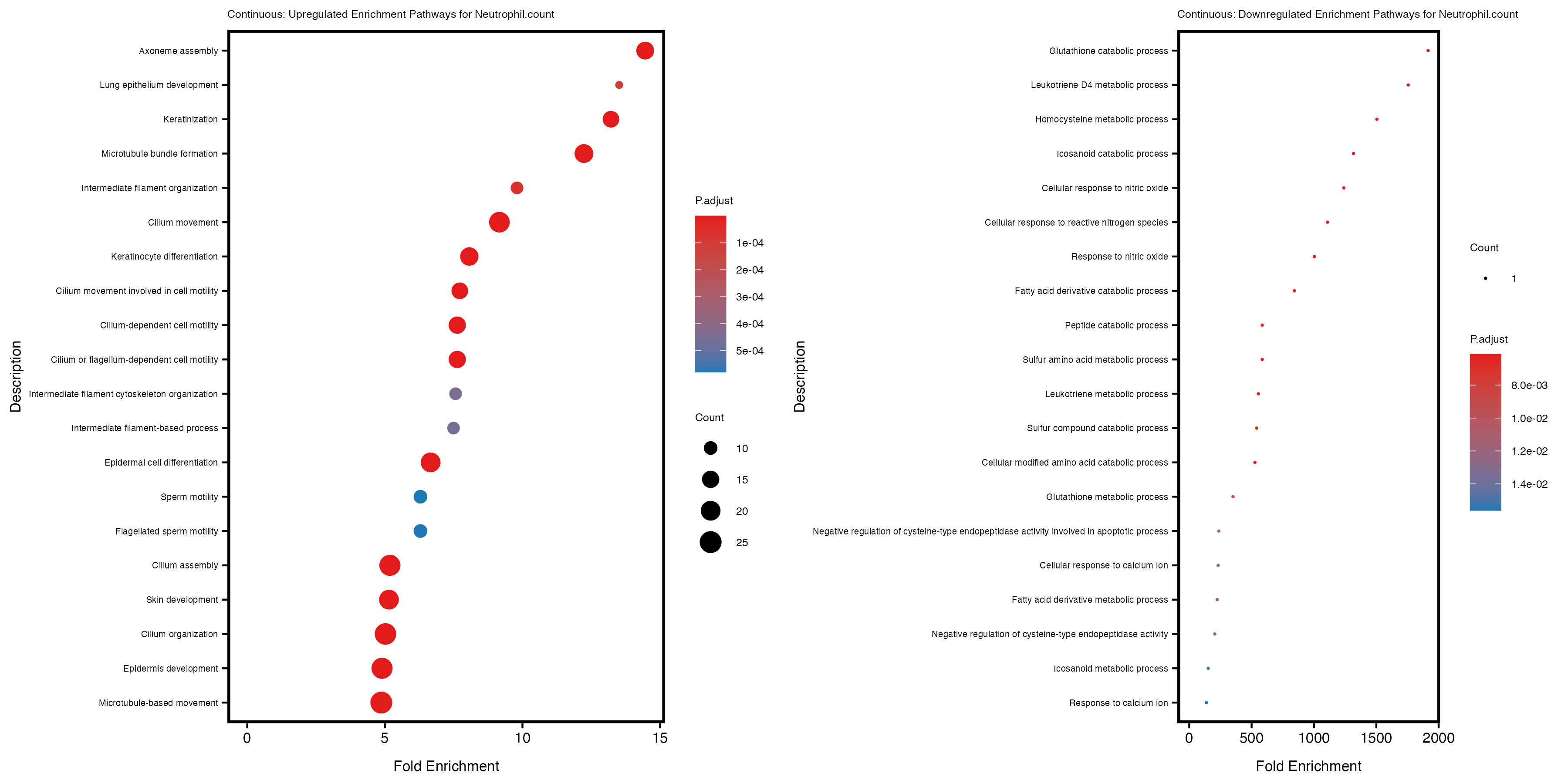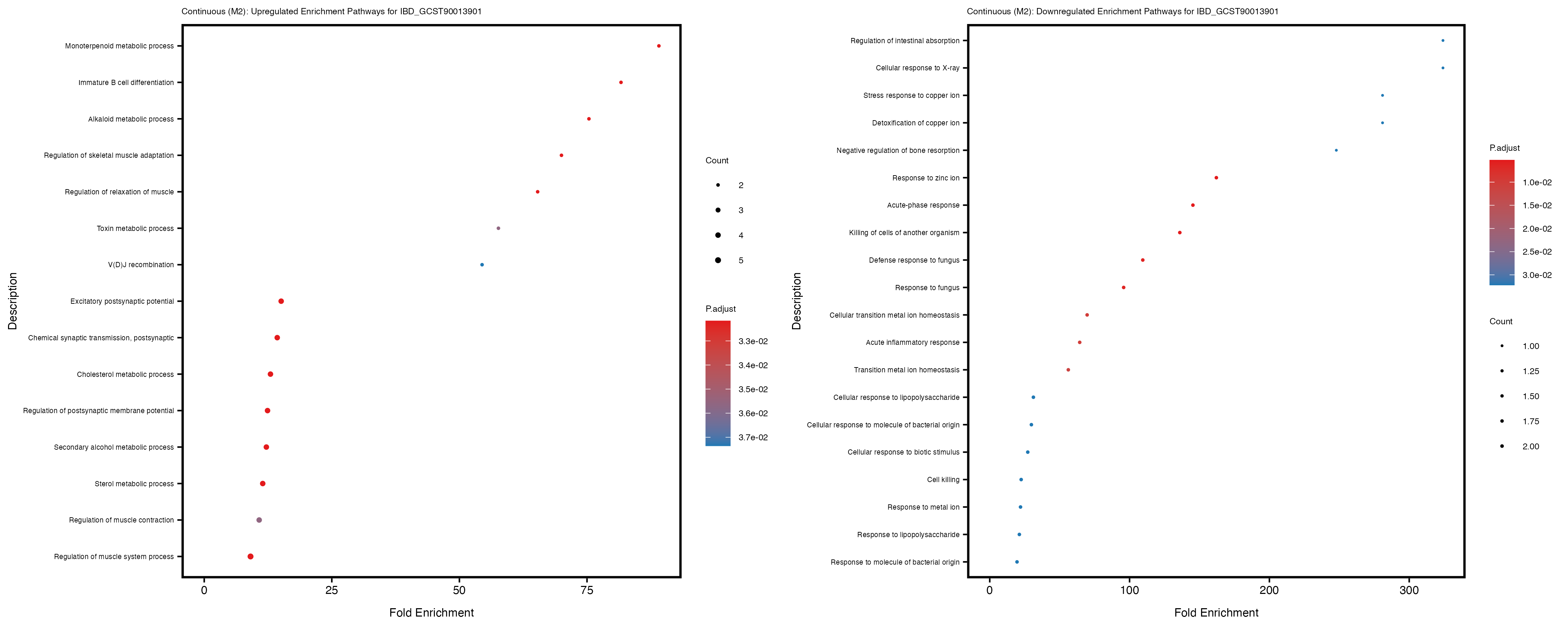 To account for population stratification, we adjusted the model by including the first two genotype principal components (PCs), as they explain most of the genetic variation in the data. For Eosinophil count, we observed that genes were consistently identified as top differentially expressed with and without adjustment. The only difference is that instead of SLC6A9, WFDC2 was detected as top 10 DEGs when adjusting for the first two genotype PCs. WFBC2 is a protease inhibitor with a potential role in innate immune defense (L Bingle, 2006). Although same genes are identified as top DEGs for continuous analysis, additional pathways such as response to inactivity were highlighted when adjusting for the first two genotype PCs.