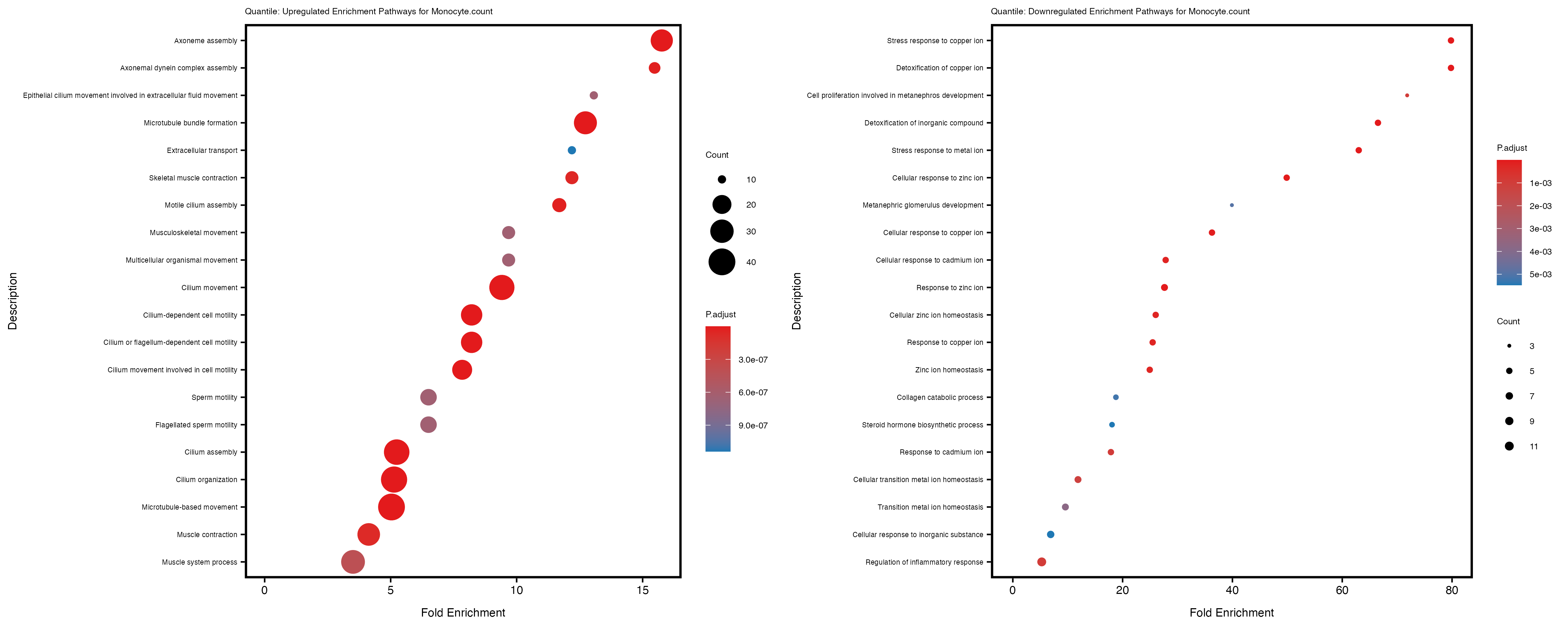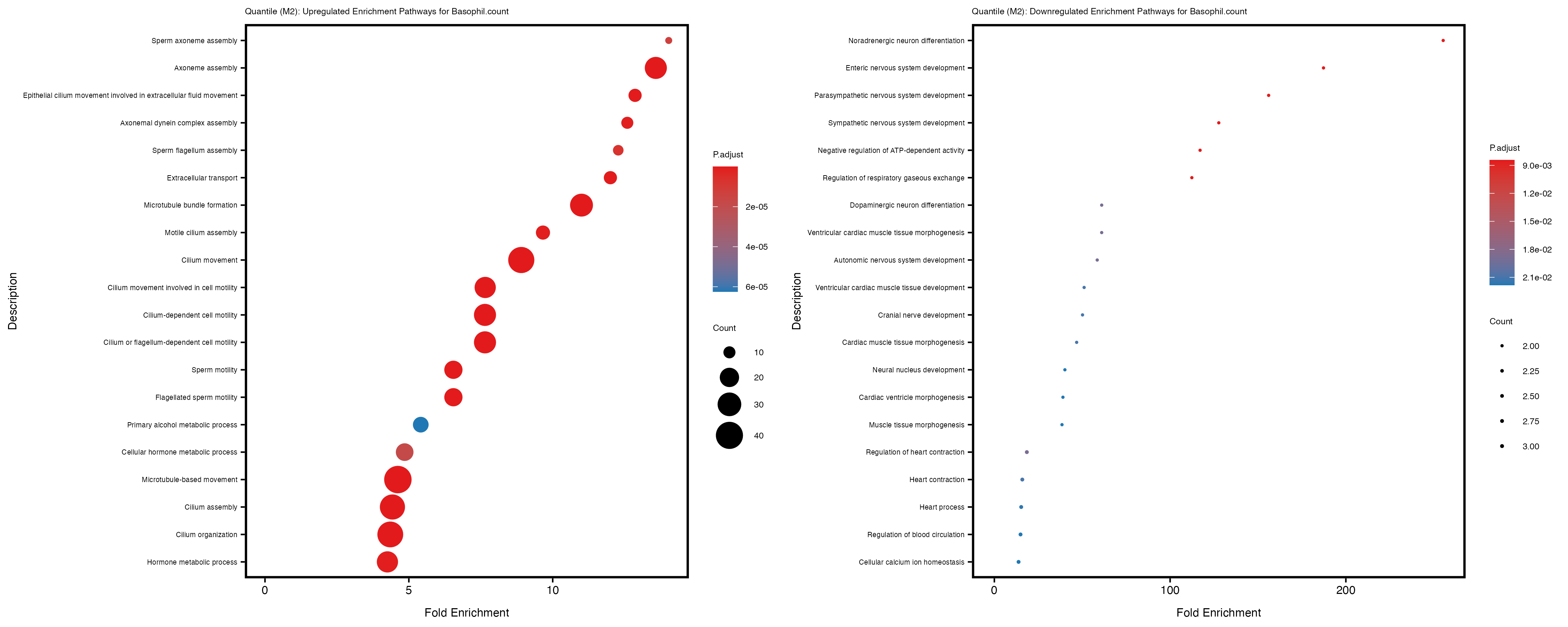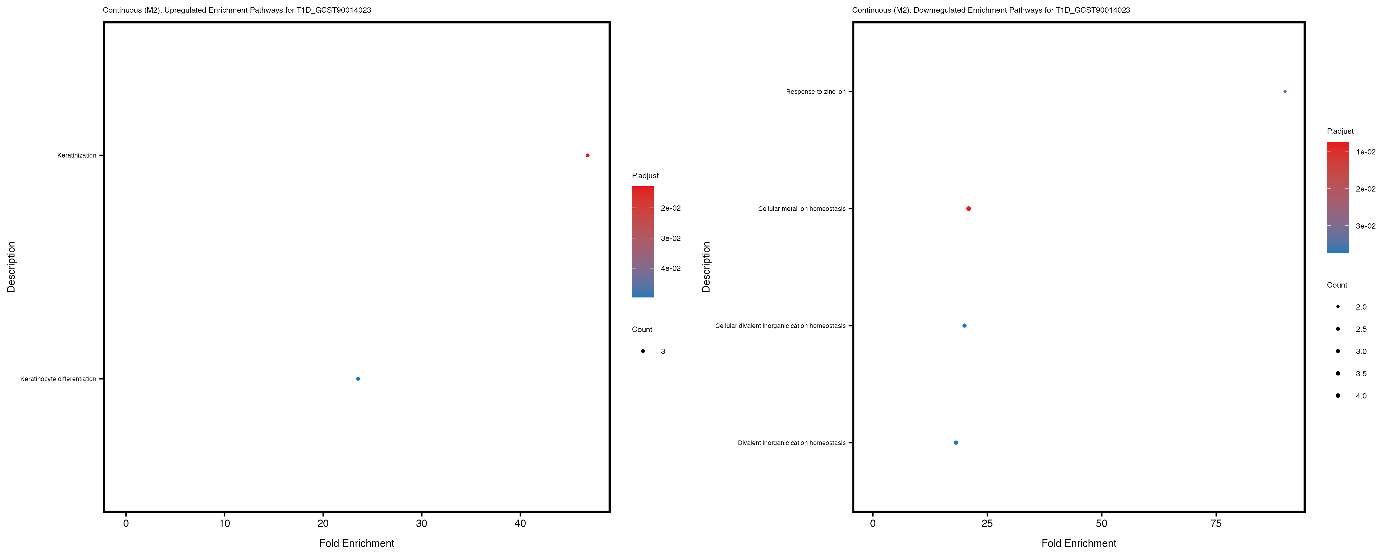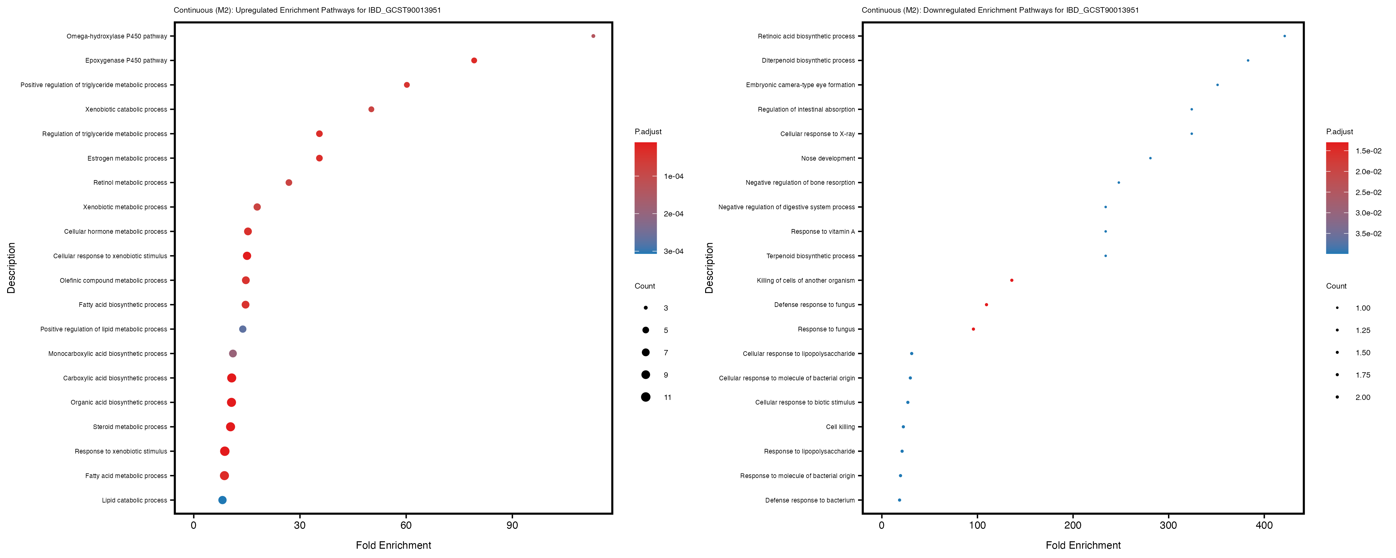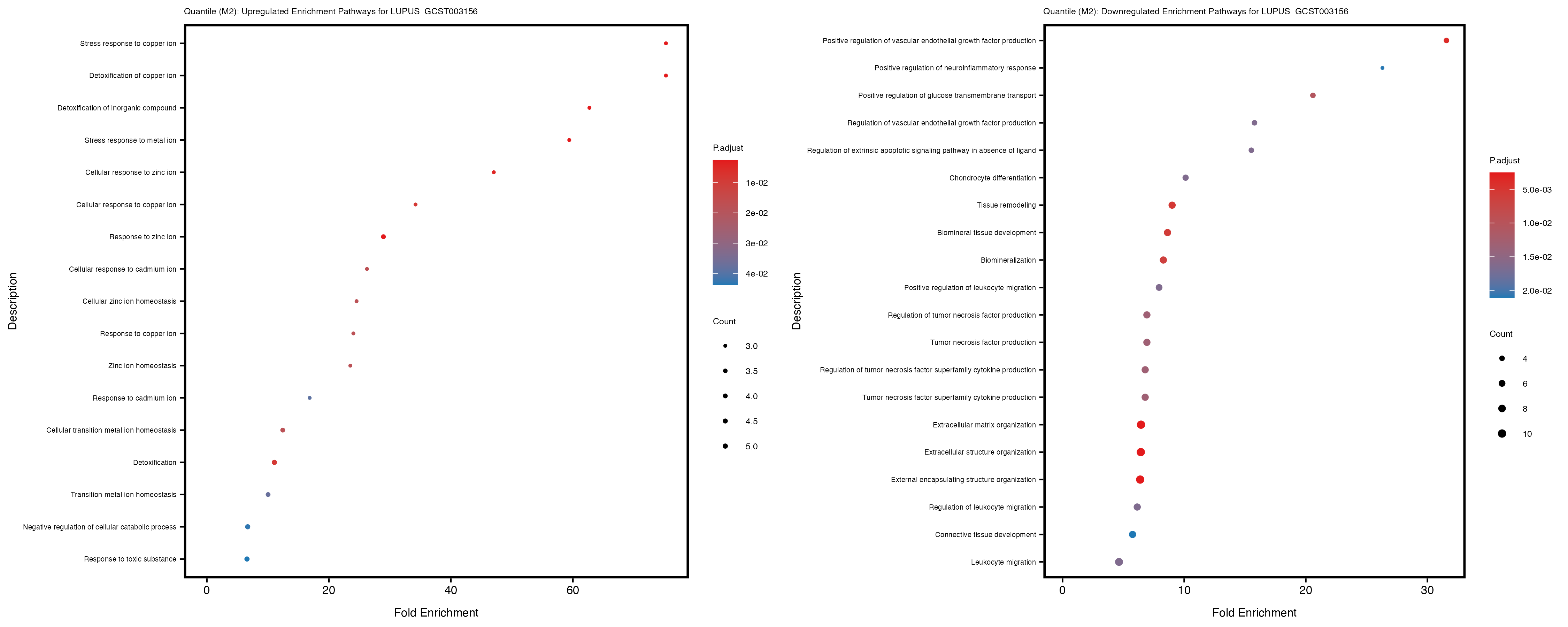To account for population stratification, we adjusted the model by including the first two genotype principal components (PCs), as they explain most of the genetic variation in the data. For Eosinophil count, we observed that genes were consistently identified as top differentially expressed with and without adjustment. The only difference is that instead of SLC6A9, WFDC2 was detected as top 10 DEGs when adjusting for the first two genotype PCs. WFBC2 is a protease inhibitor with a potential role in innate immune defense (L Bingle, 2006). Although same genes are identified as top DEGs for continuous analysis, additional pathways such as response to inactivity were highlighted when adjusting for the first two genotype PCs.