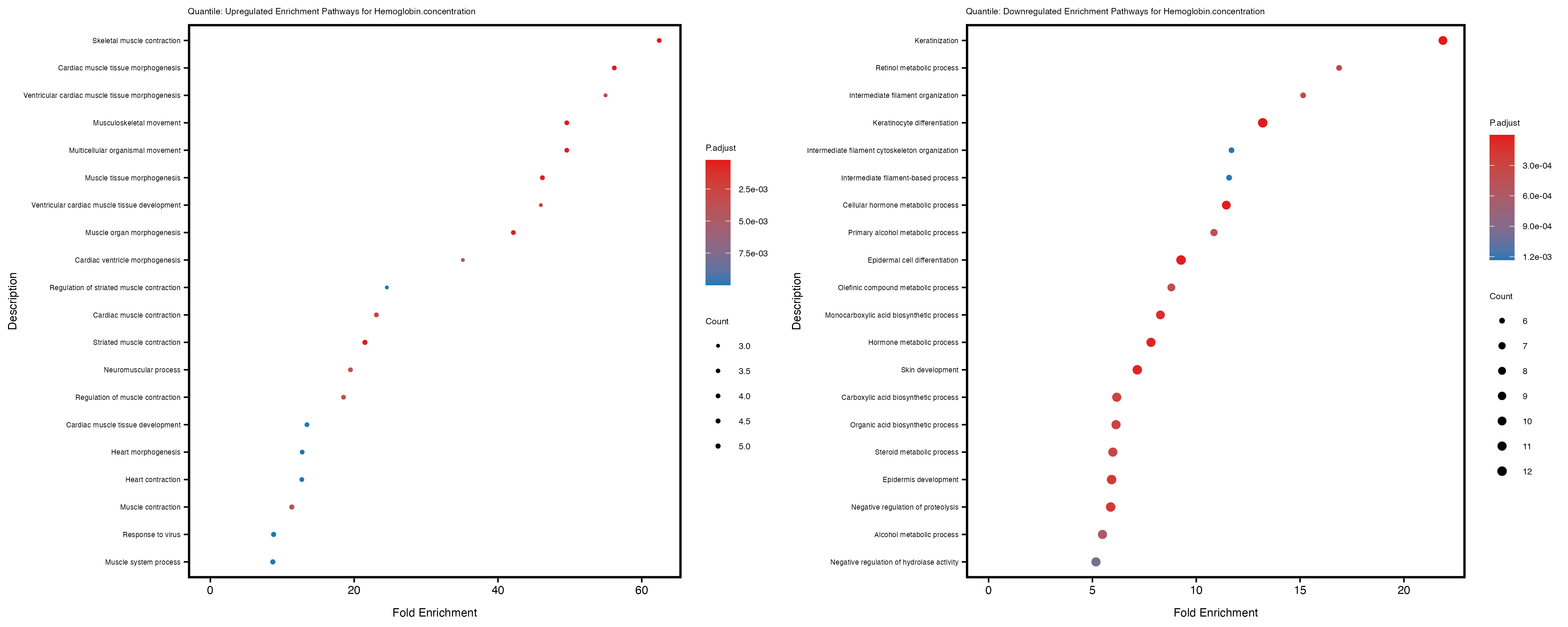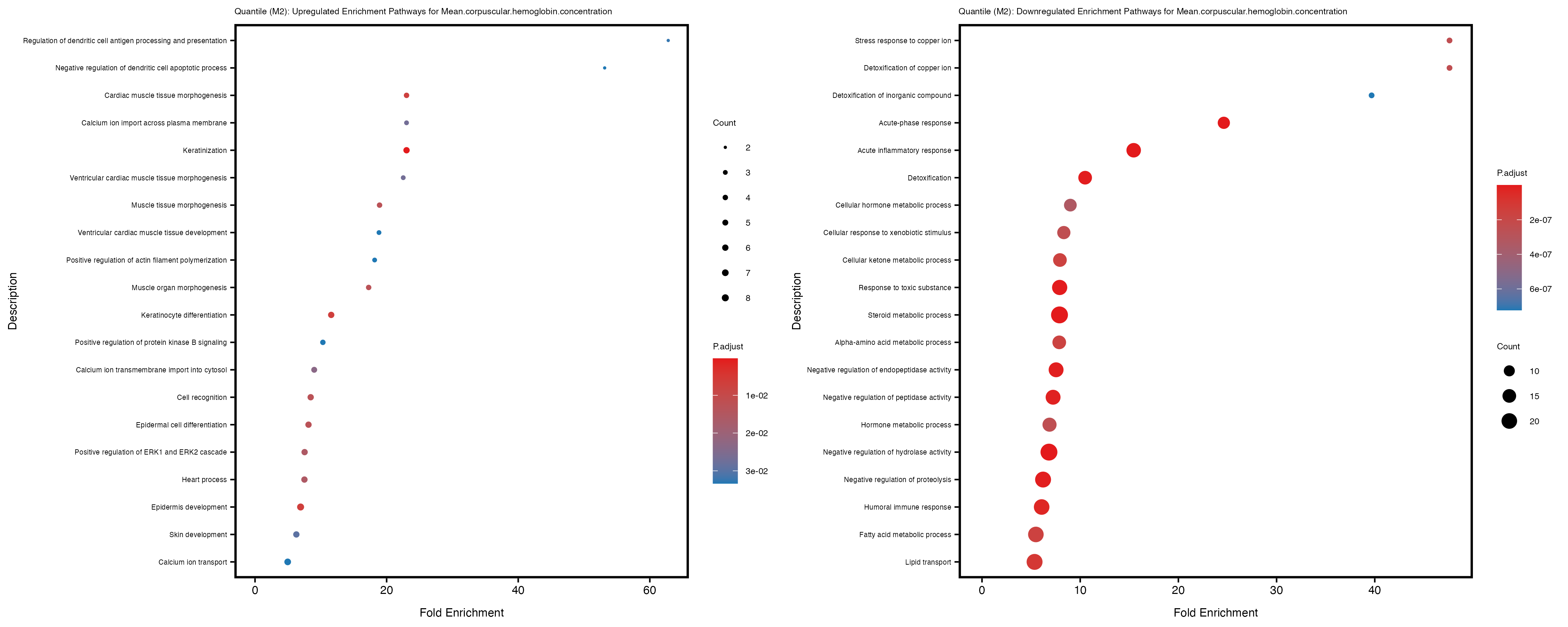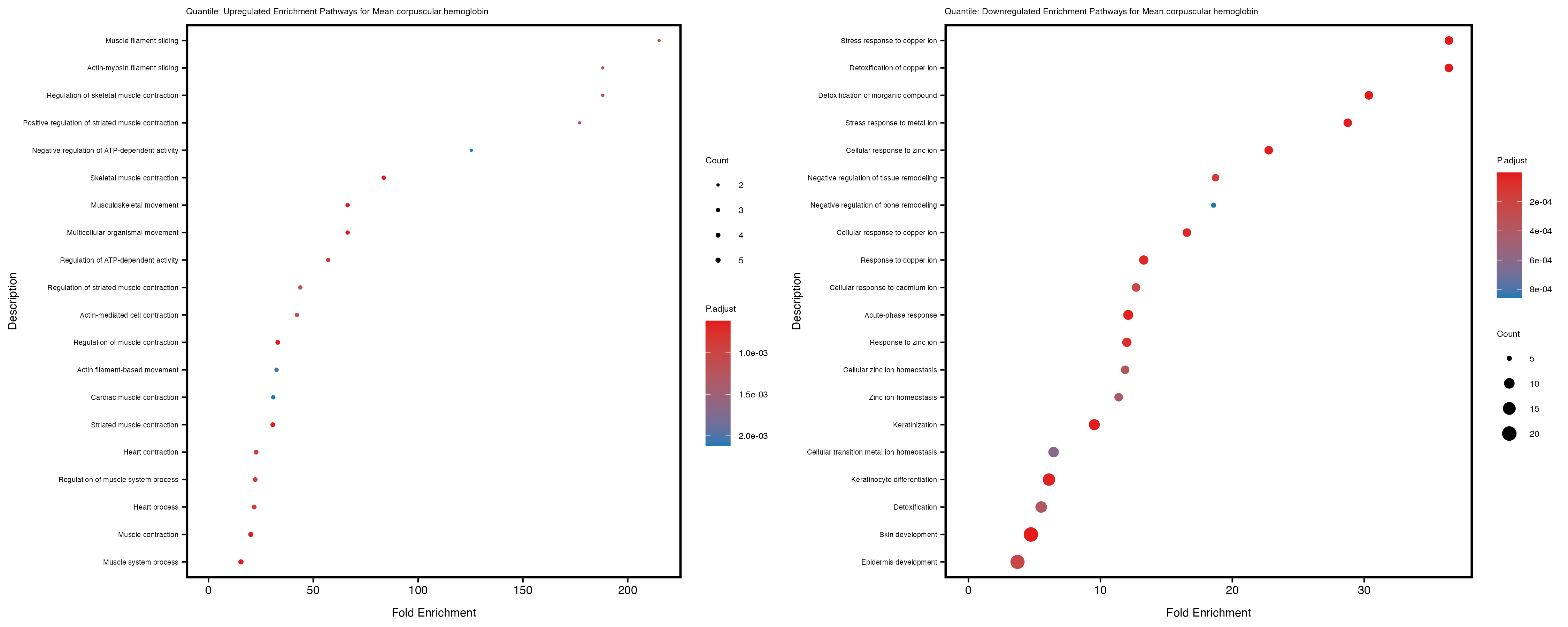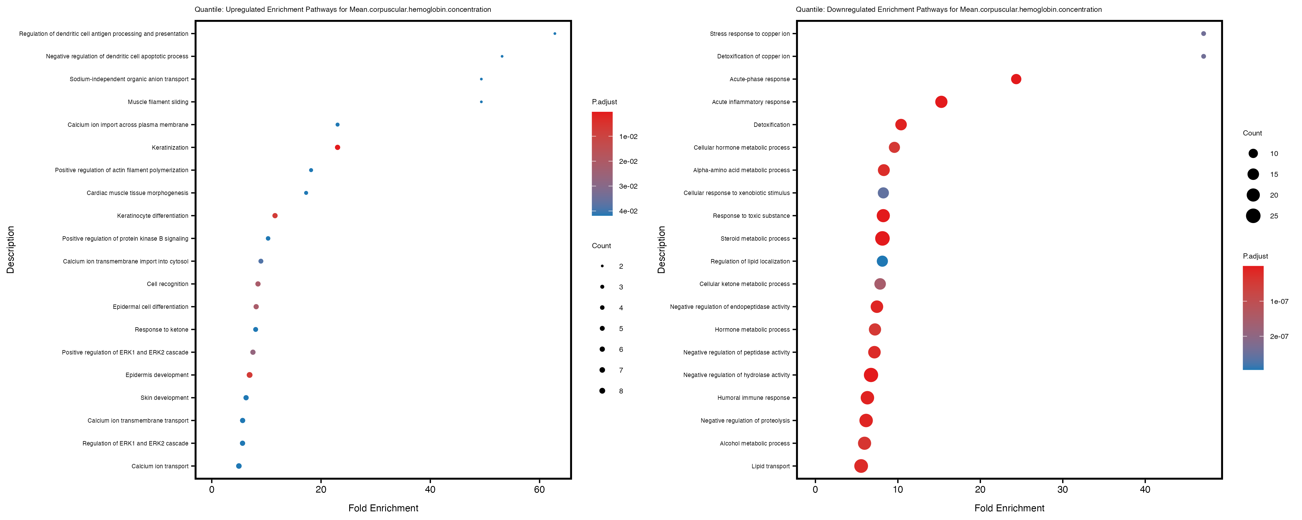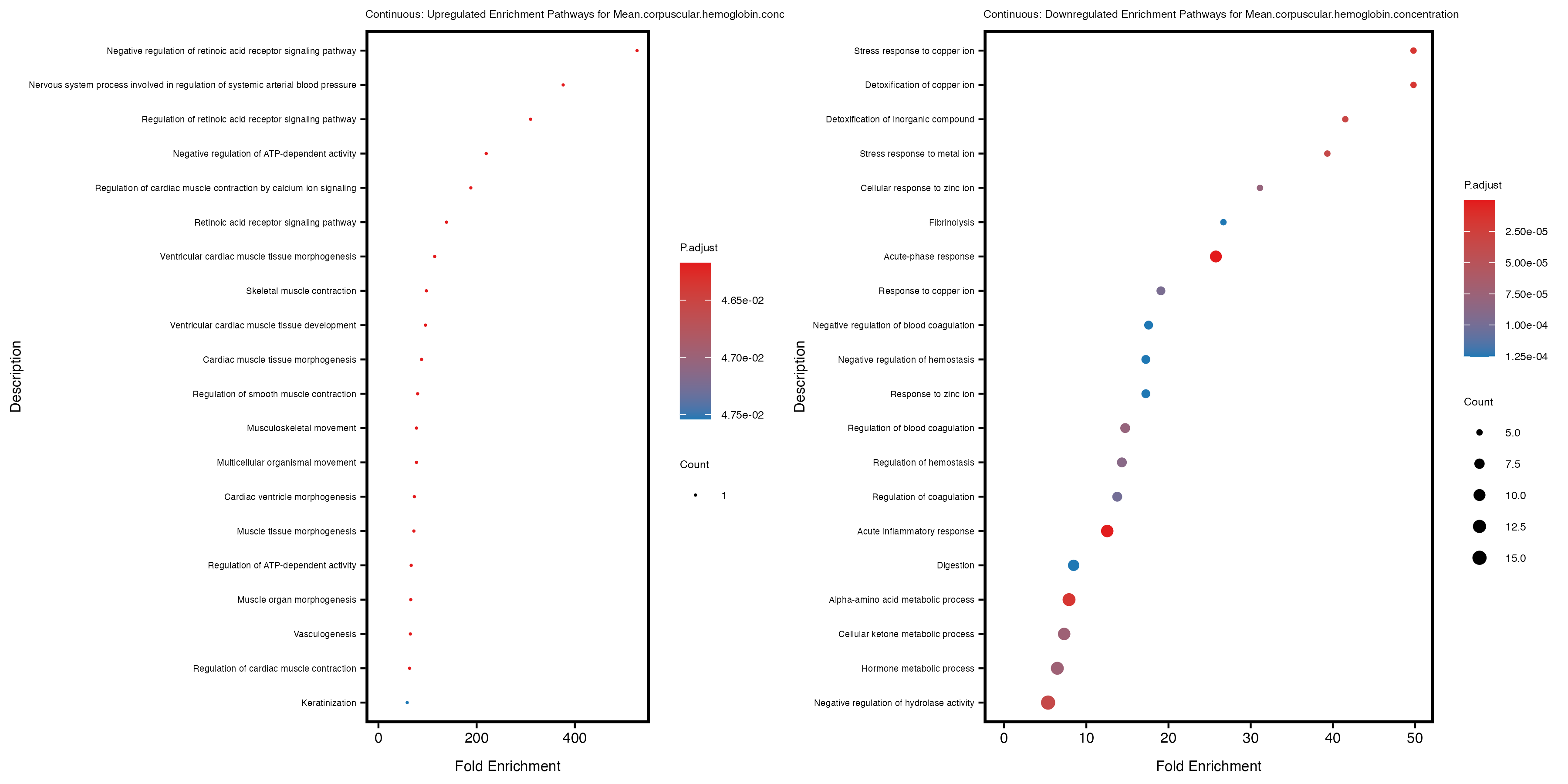 For highly correlated traits, they tend to share similar GO enriched pathways. For example, mean corpuscular hemoglobin and mean corpucular volume are both involved in read blood cell biology, so it’s expected that their GO enrichment would point to similar biological processes, such as hemoglobin metabolism, iron homeostasis and erythropoiesis.