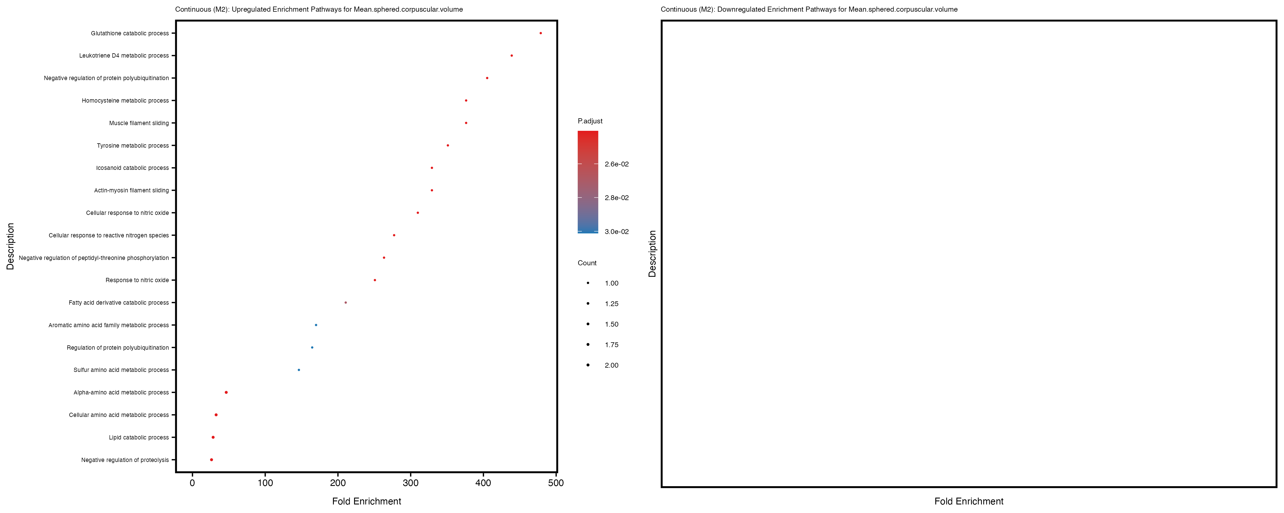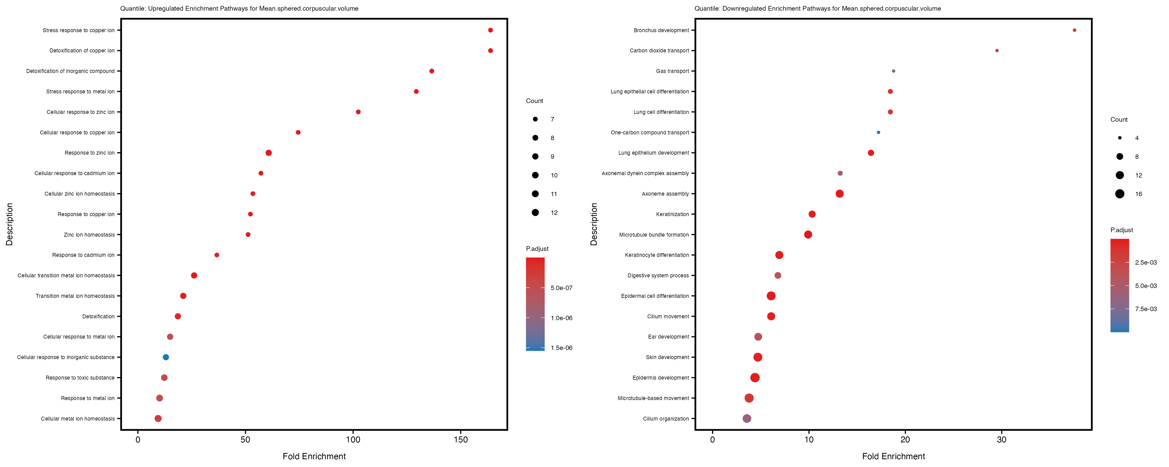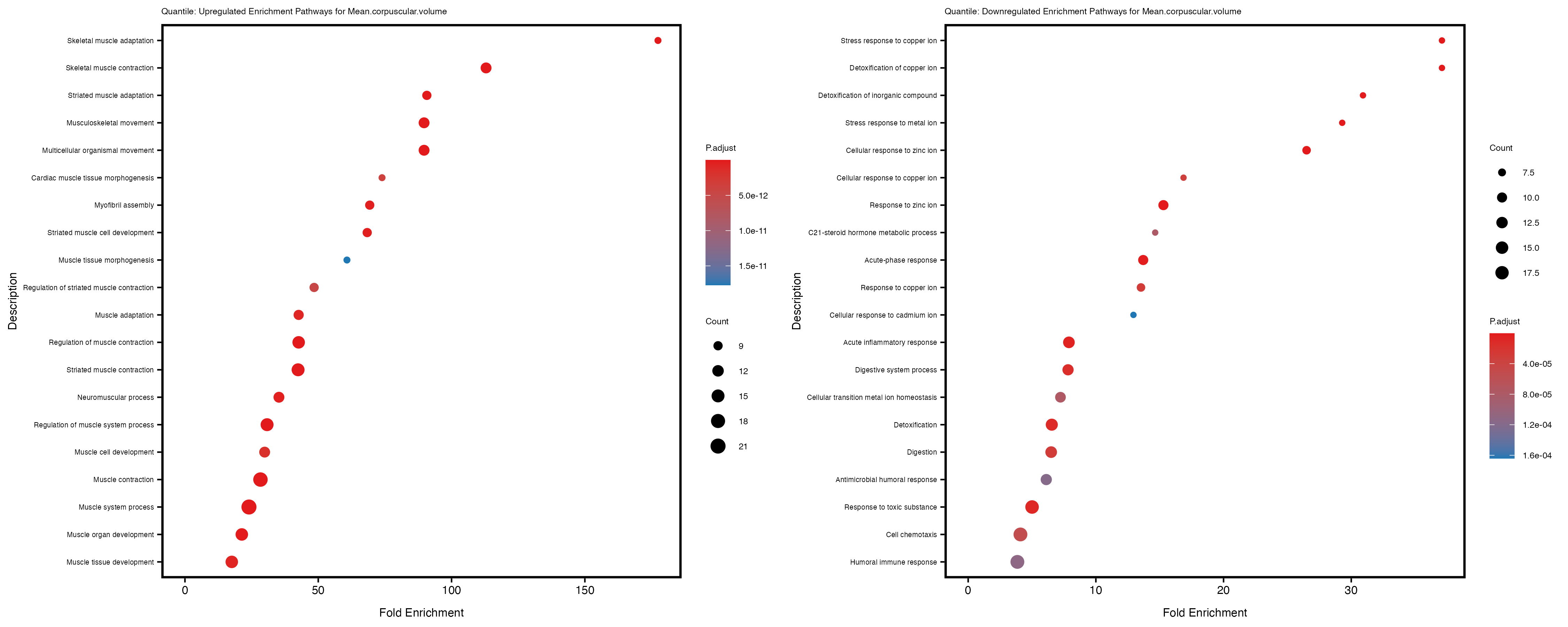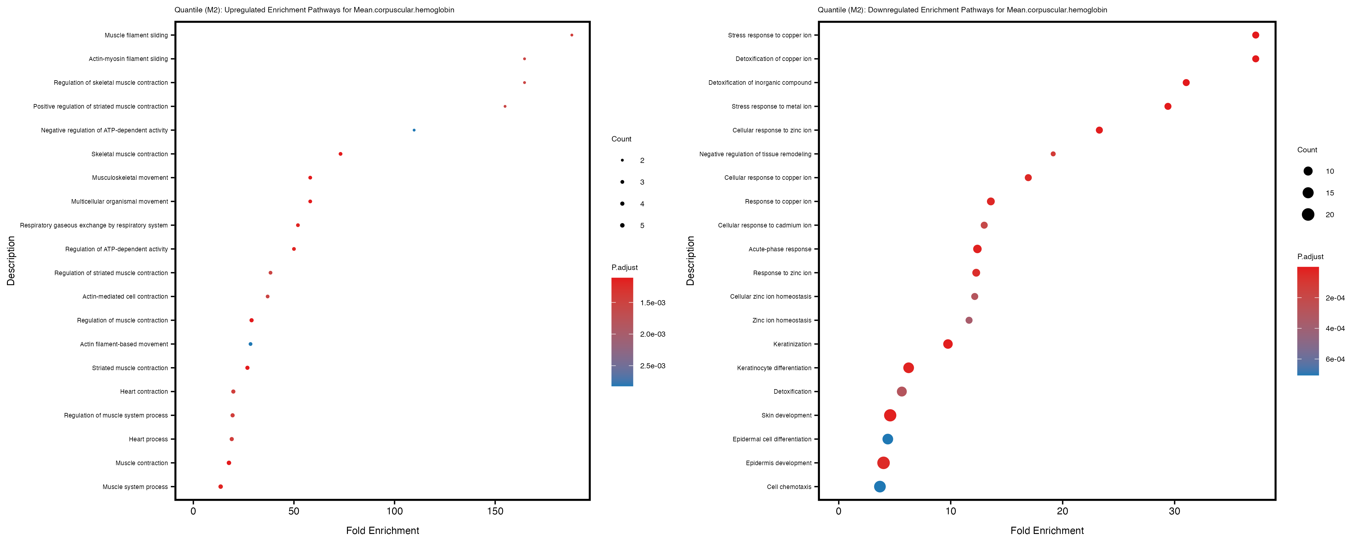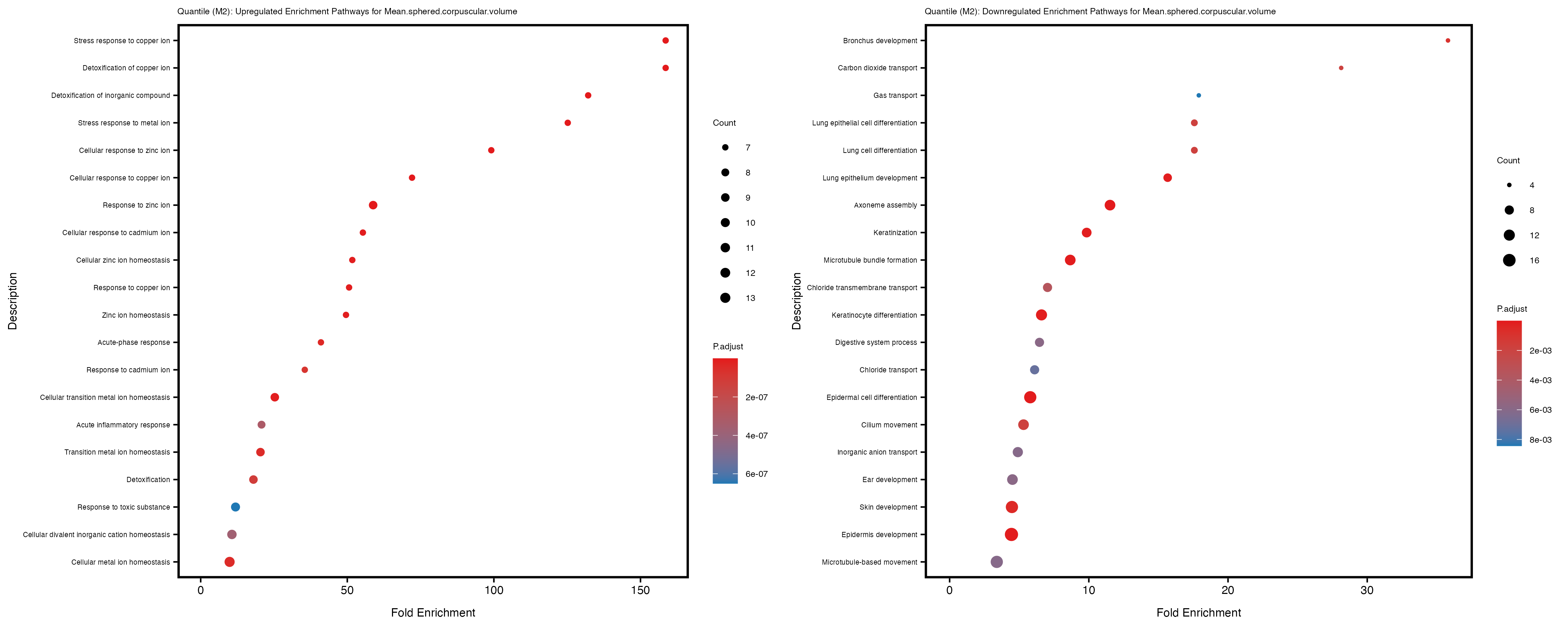 For highly correlated traits, they tend to share similar GO enriched pathways. For example, mean corpuscular hemoglobin and mean corpucular volume are both involved in read blood cell biology, so it’s expected that their GO enrichment would point to similar biological processes, such as hemoglobin metabolism, iron homeostasis and erythropoiesis.