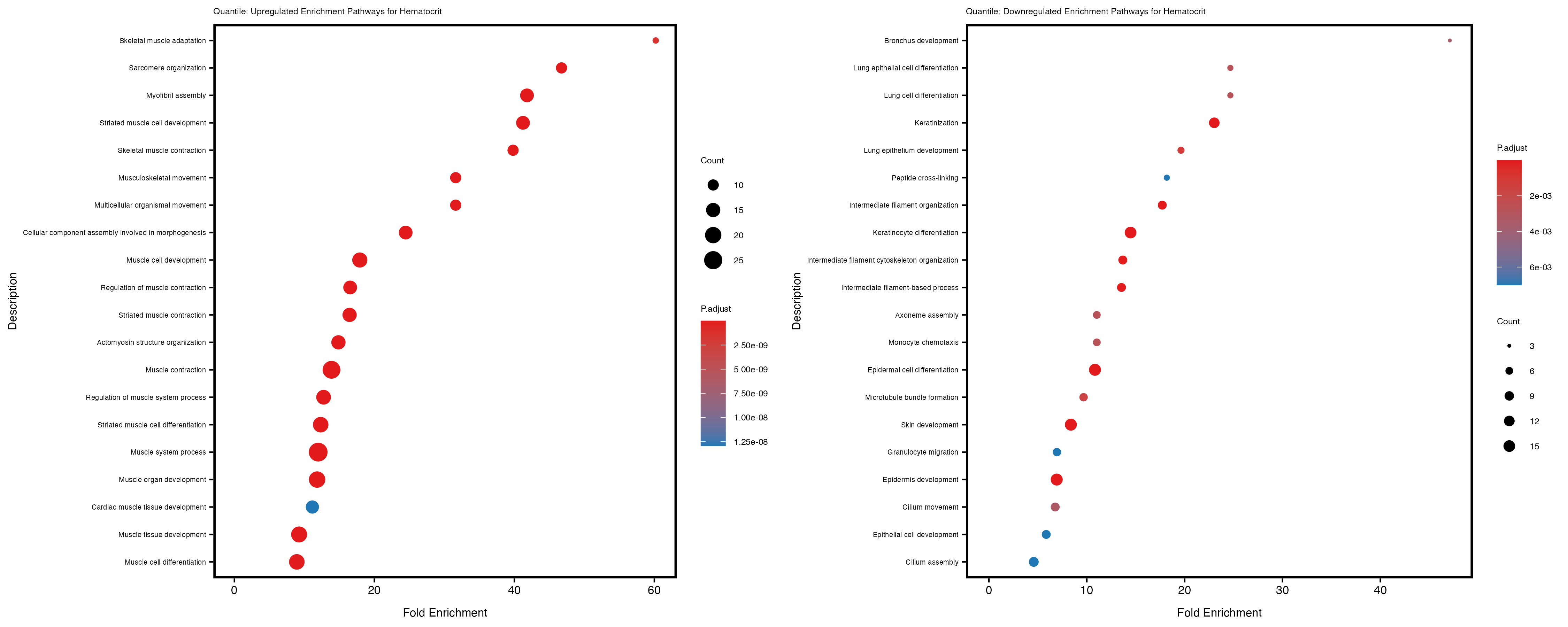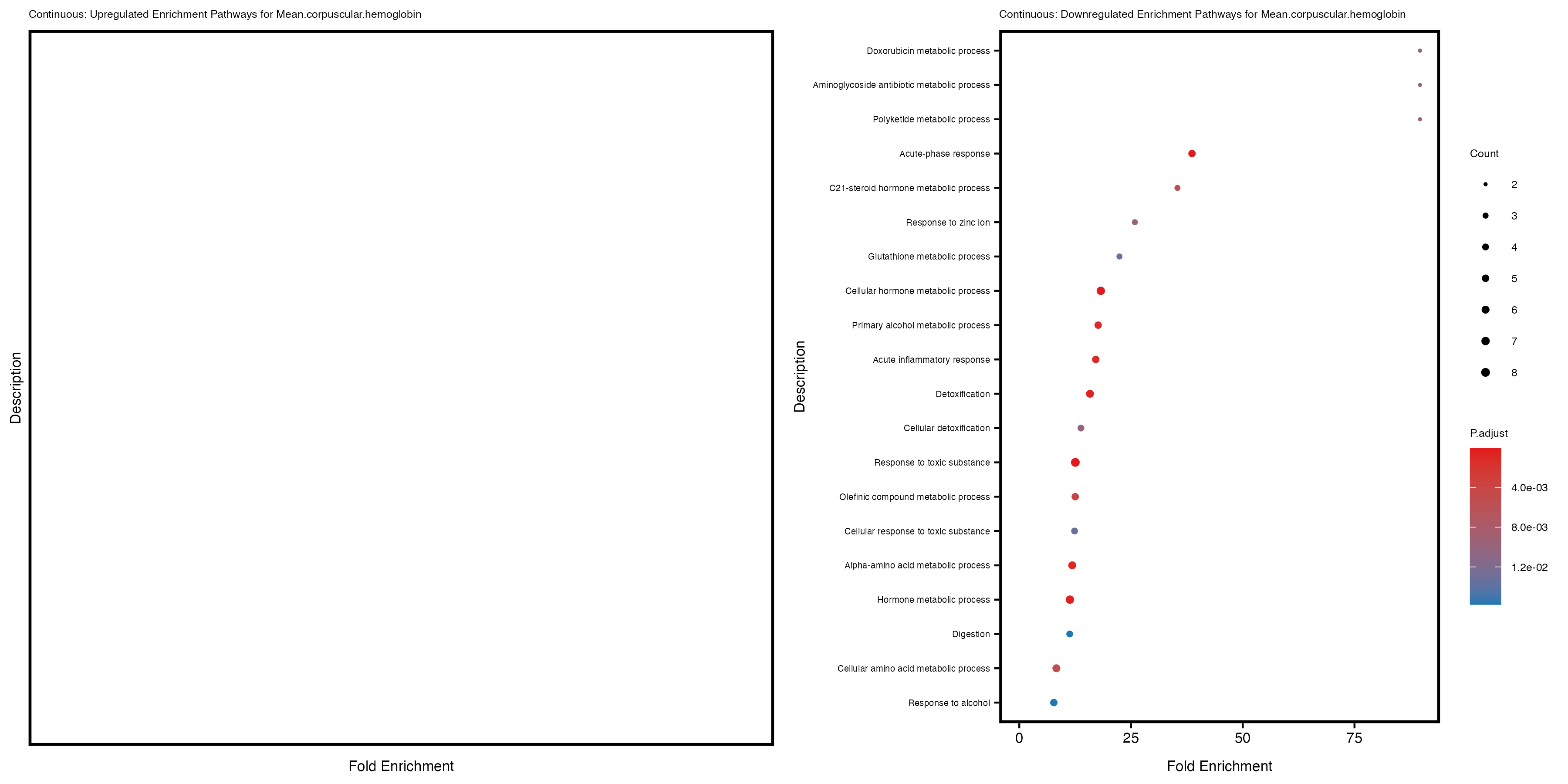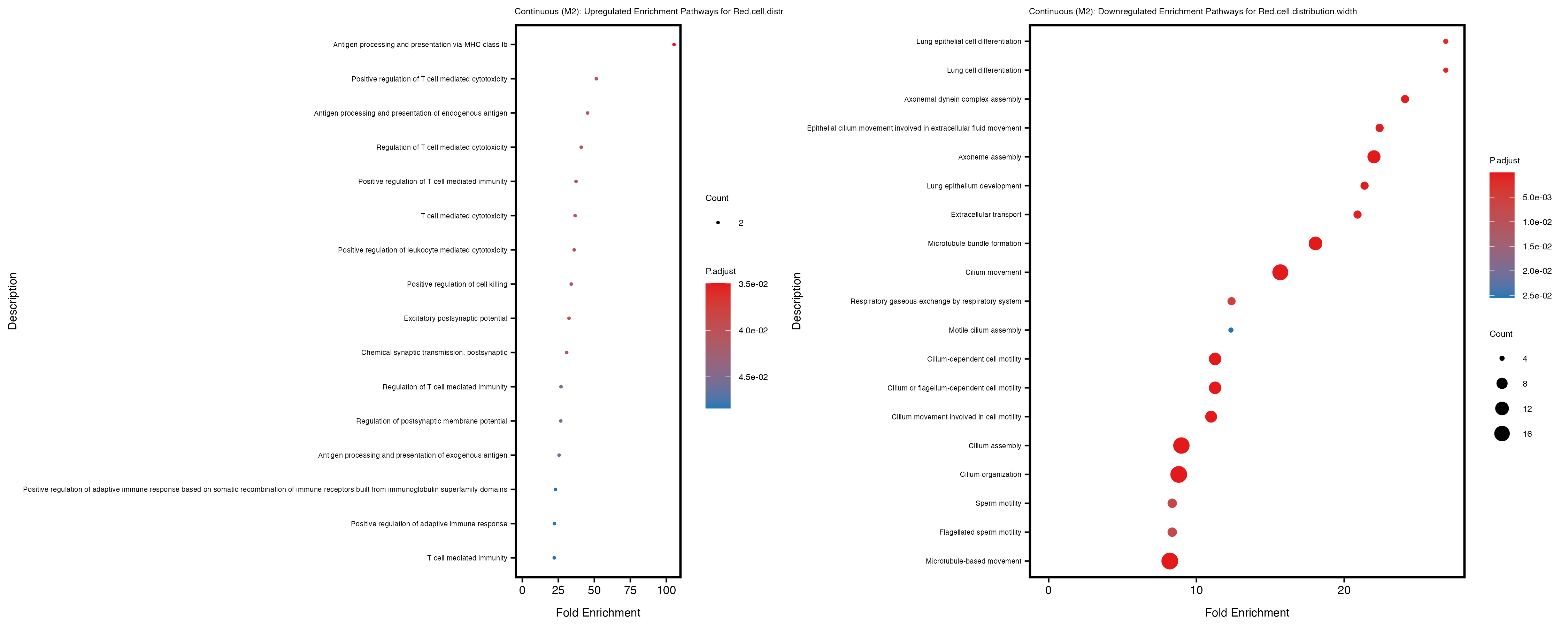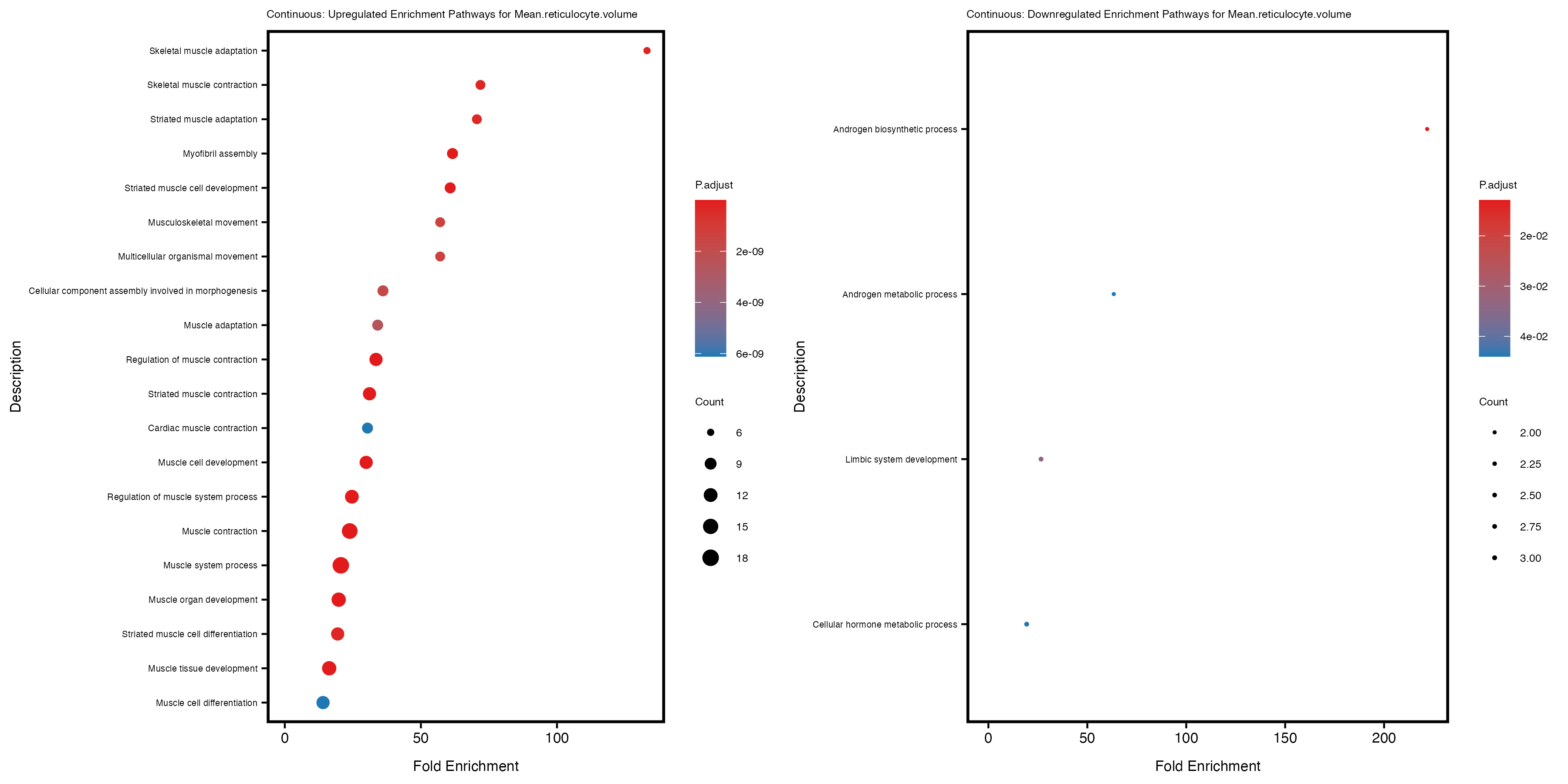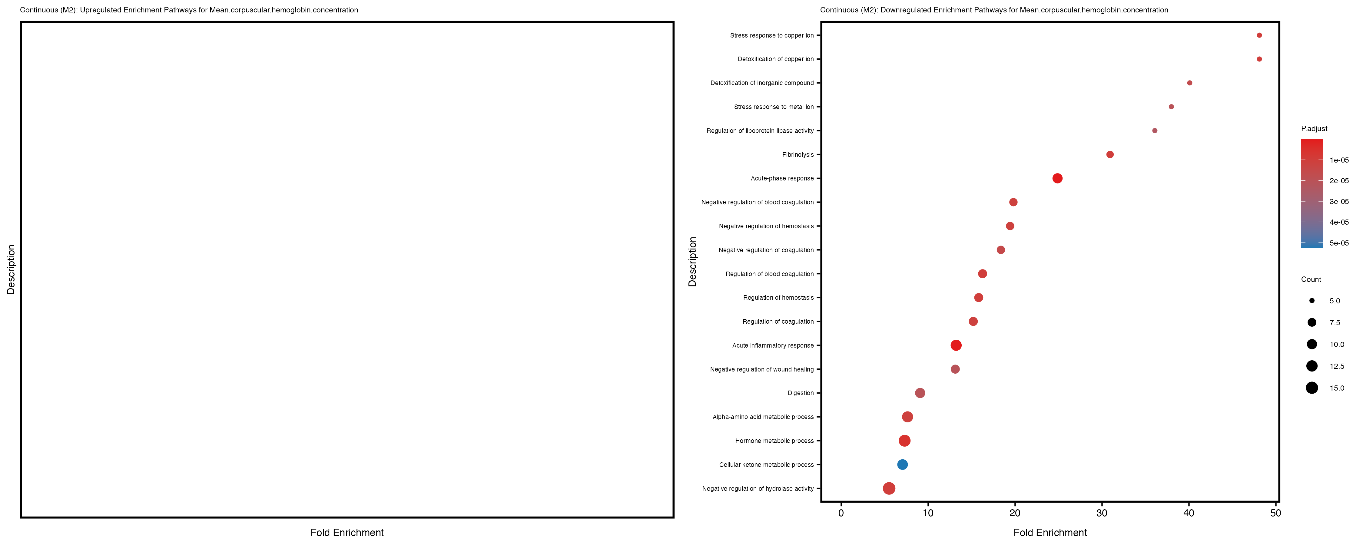 For highly correlated traits, they tend to share similar GO enriched pathways. For example, mean corpuscular hemoglobin and mean corpucular volume are both involved in read blood cell biology, so it’s expected that their GO enrichment would point to similar biological processes, such as hemoglobin metabolism, iron homeostasis and erythropoiesis.