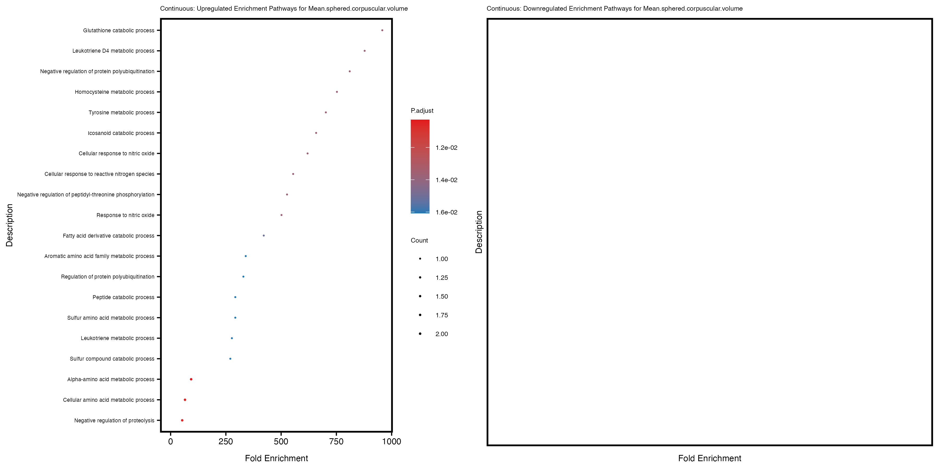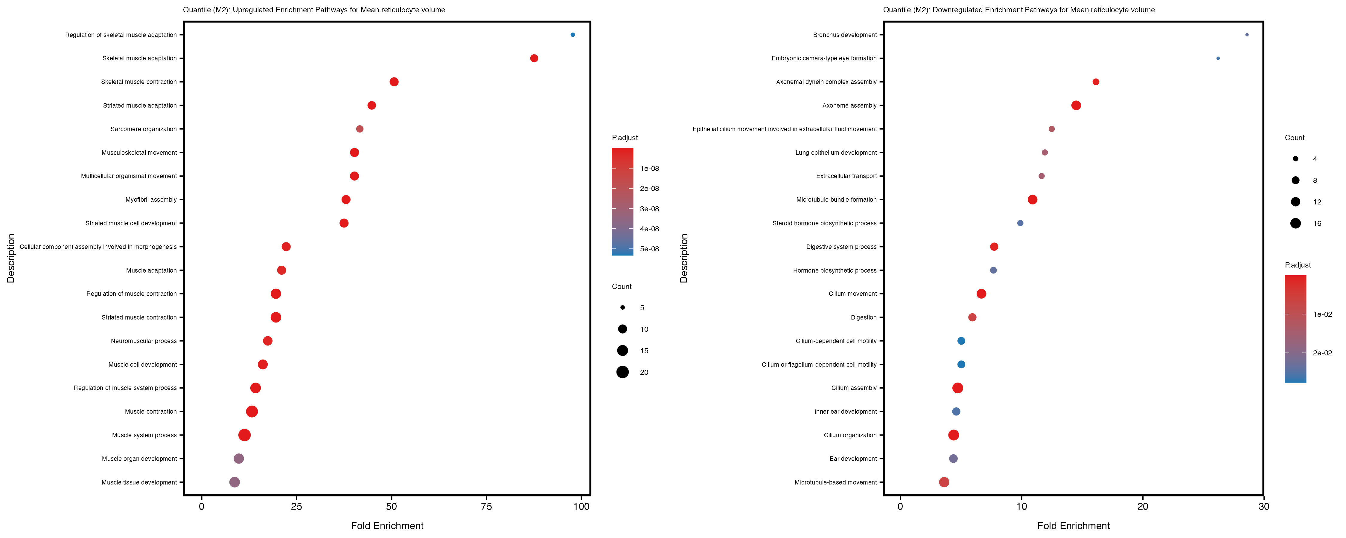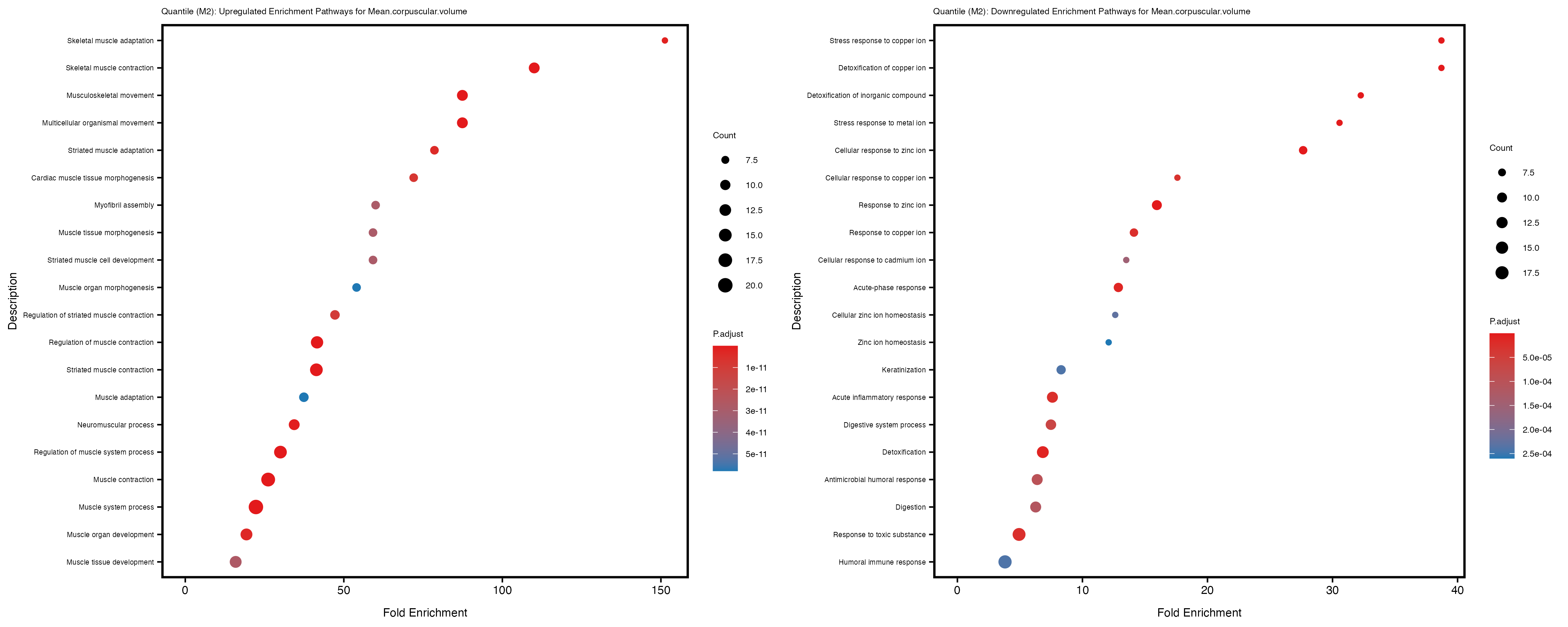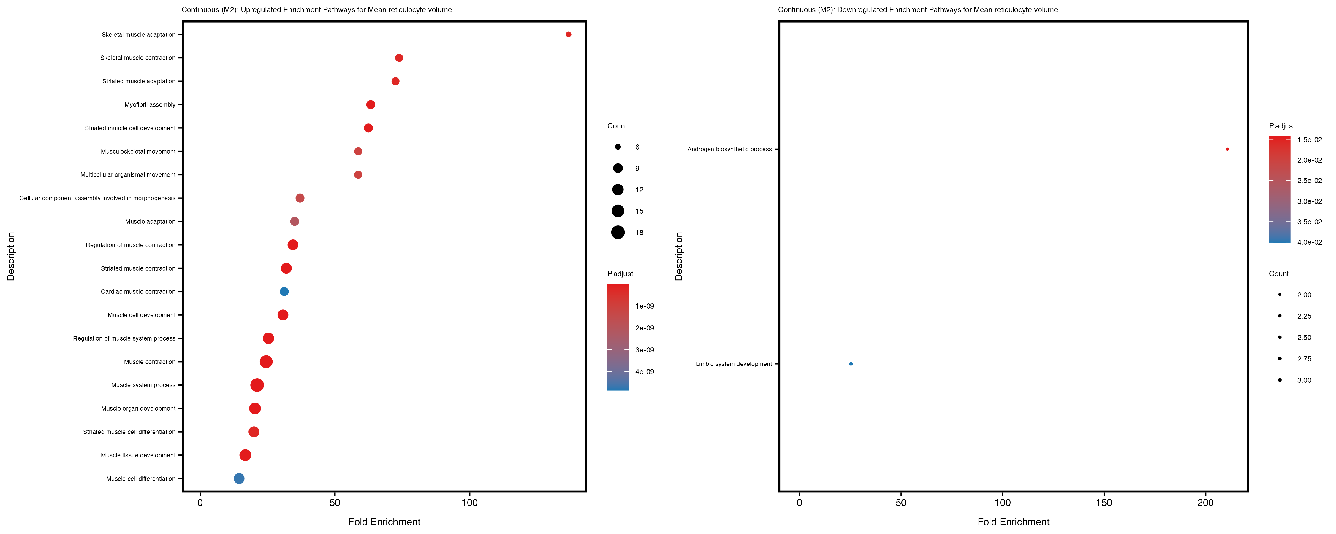 For highly correlated traits, they tend to share similar GO enriched pathways. For example, mean corpuscular hemoglobin and mean corpucular volume are both involved in read blood cell biology, so it’s expected that their GO enrichment would point to similar biological processes, such as hemoglobin metabolism, iron homeostasis and erythropoiesis.