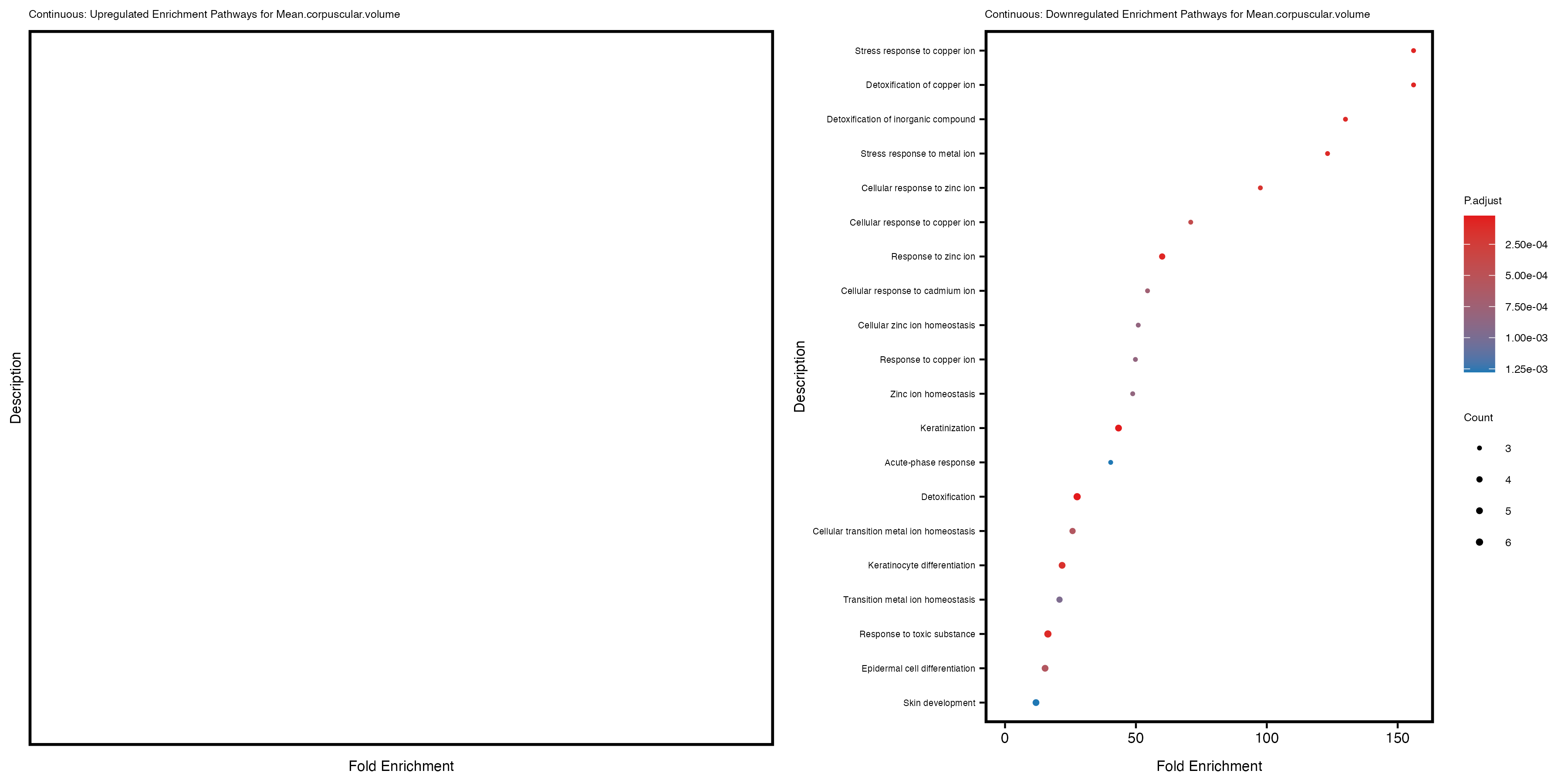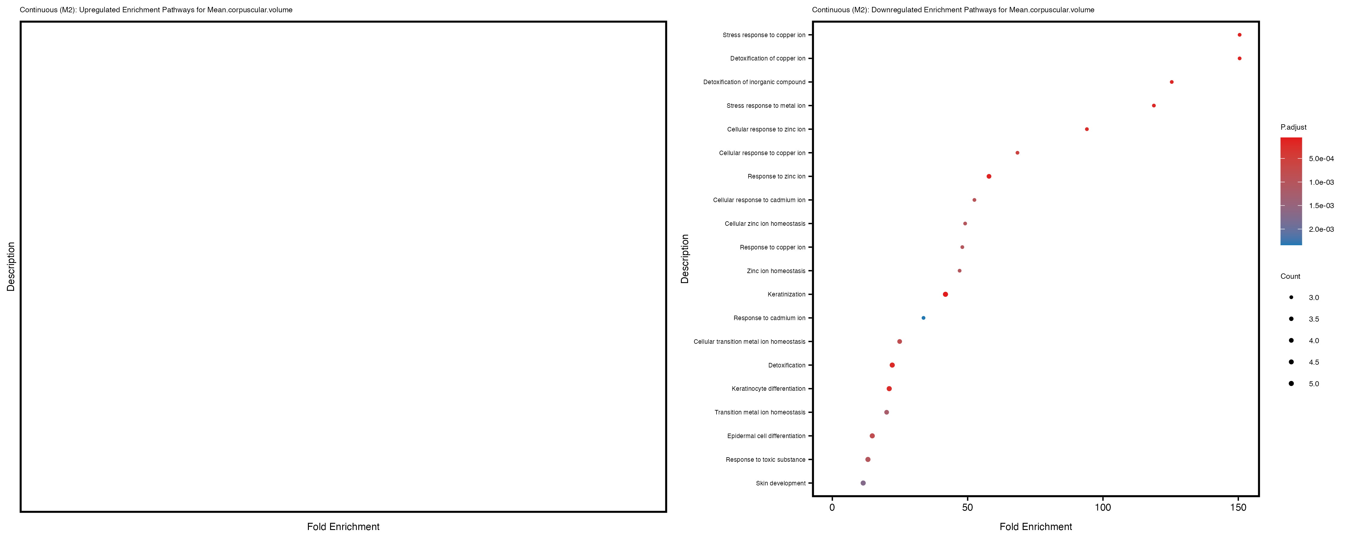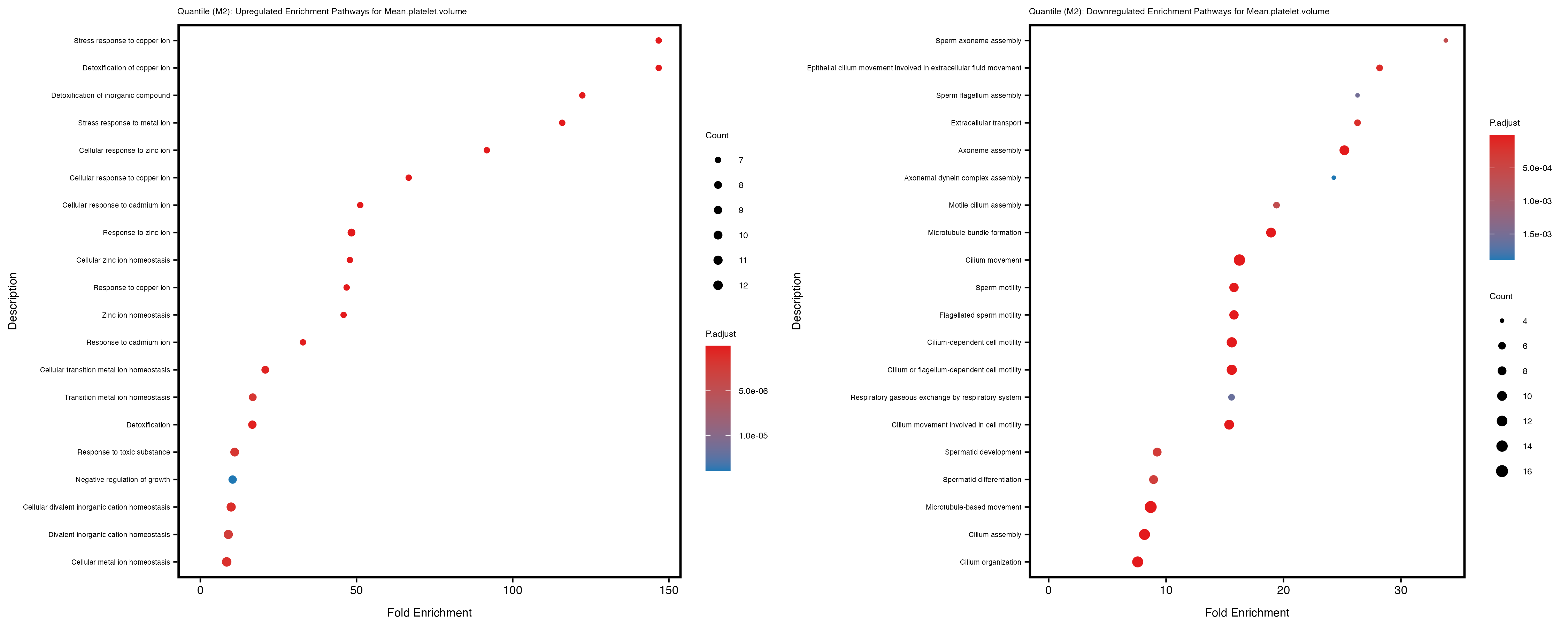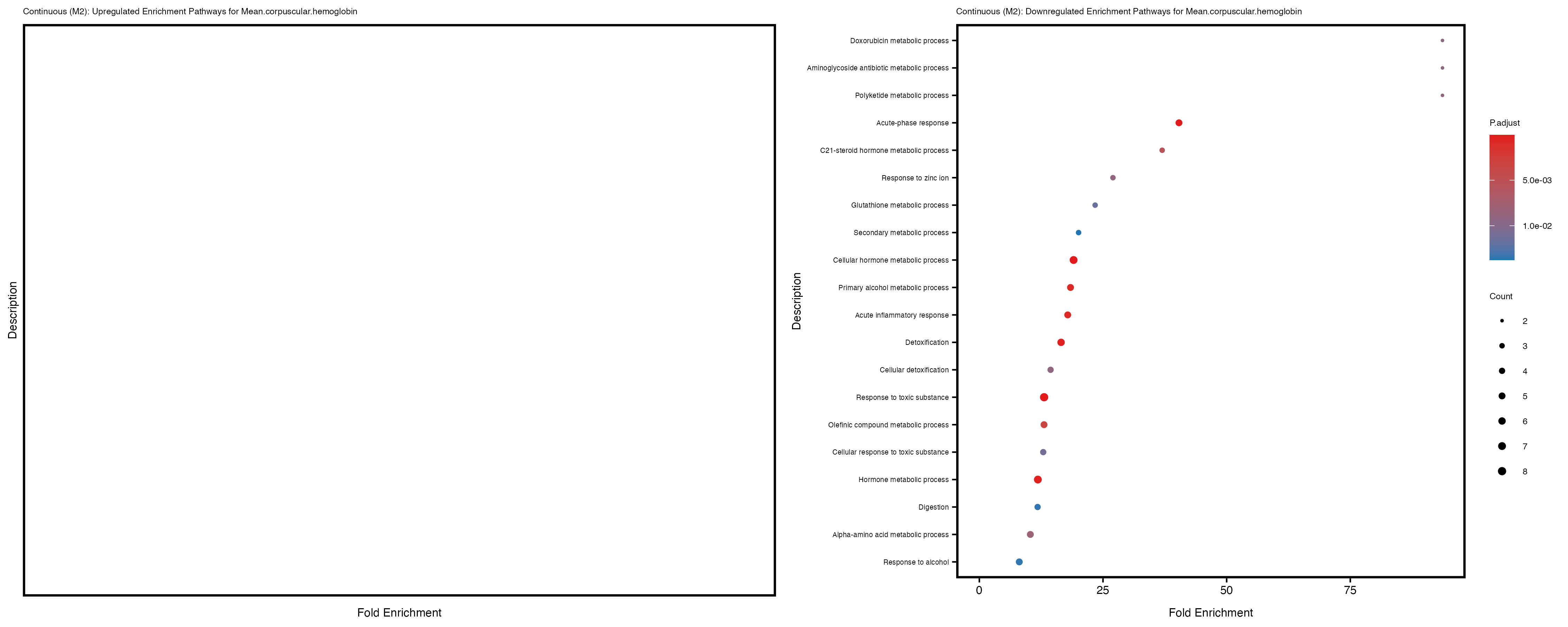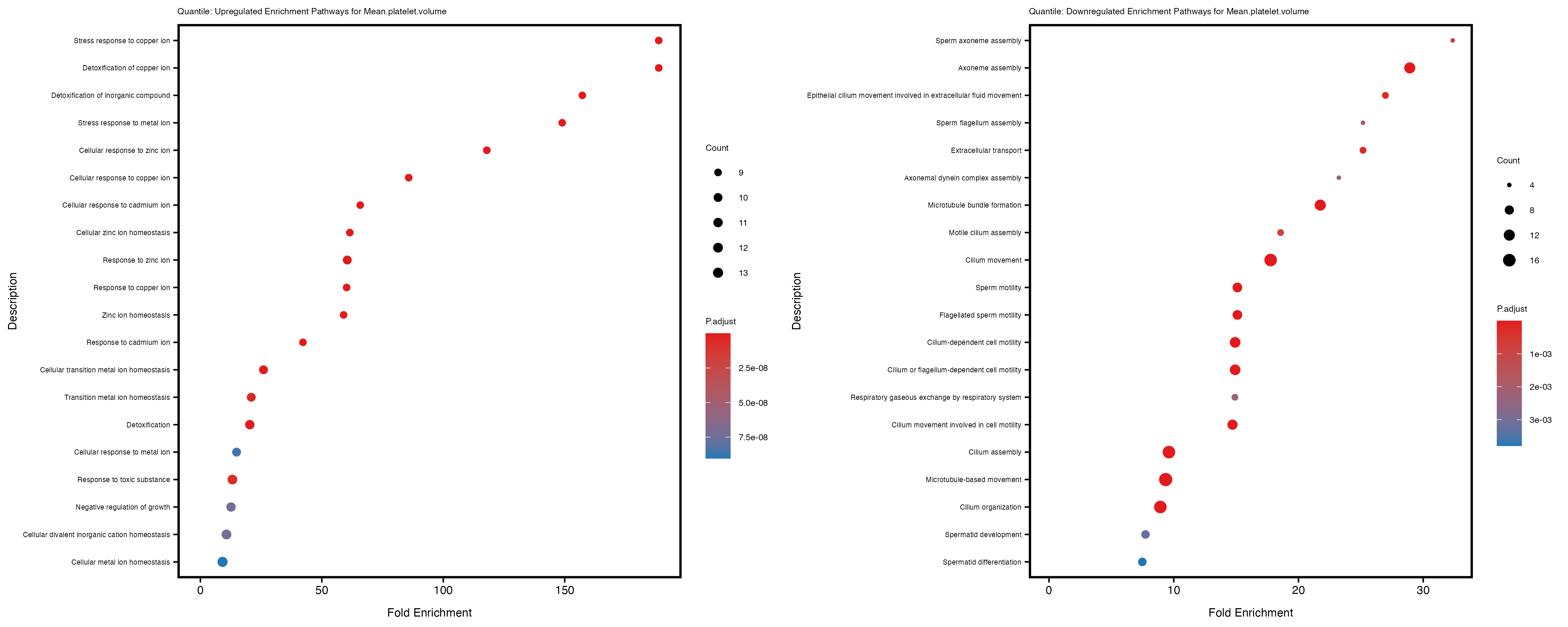 For highly correlated traits, they tend to share similar GO enriched pathways. For example, mean corpuscular hemoglobin and mean corpucular volume are both involved in read blood cell biology, so it’s expected that their GO enrichment would point to similar biological processes, such as hemoglobin metabolism, iron homeostasis and erythropoiesis.