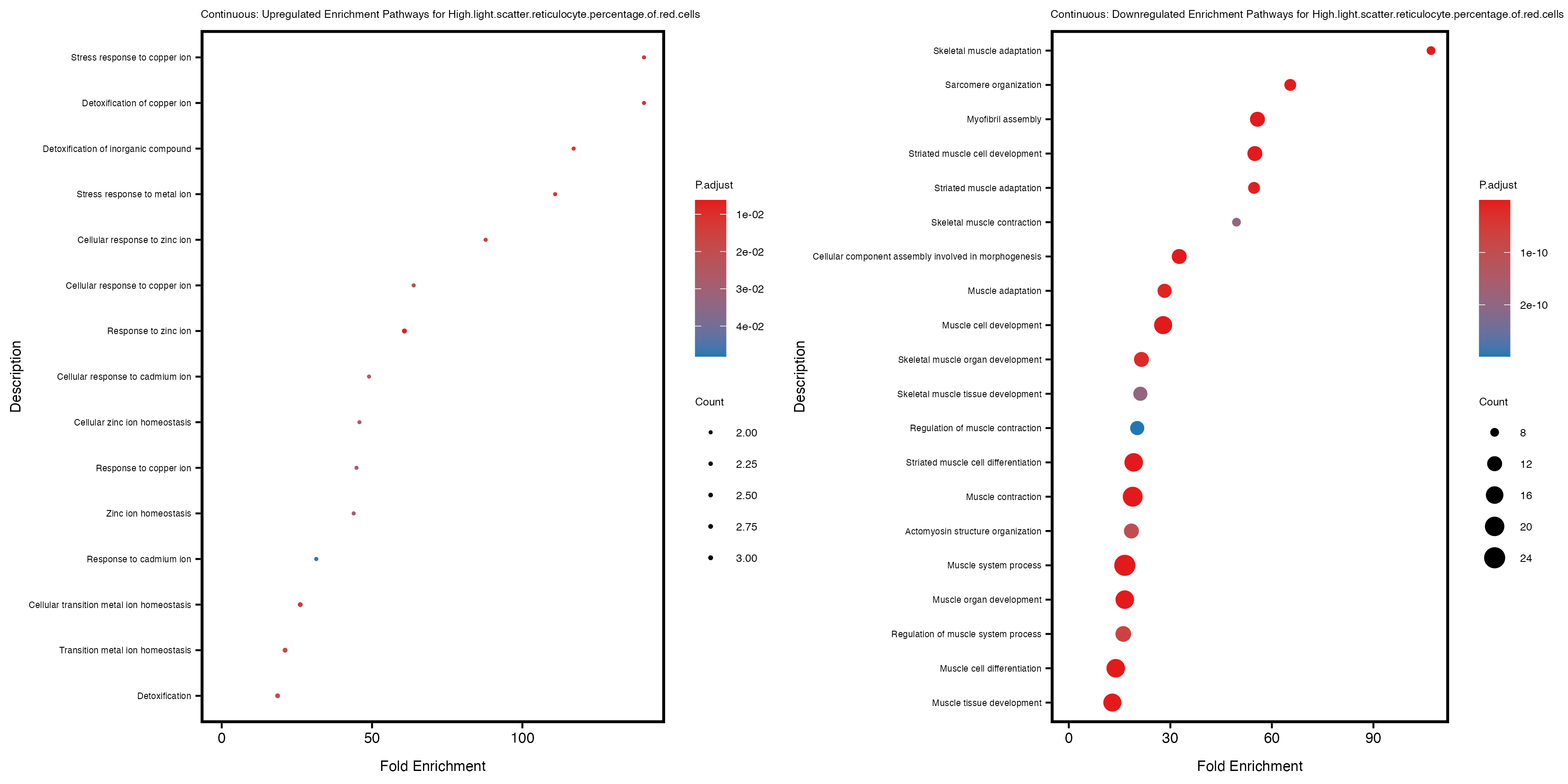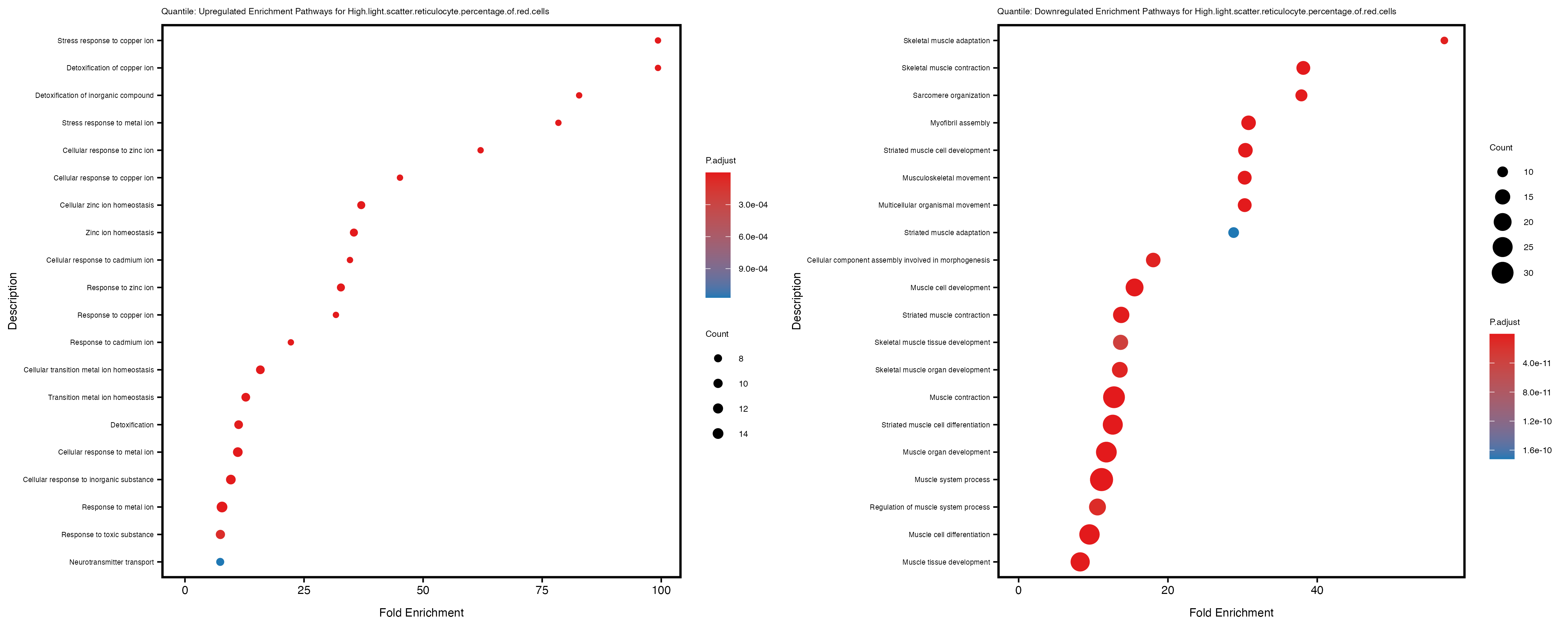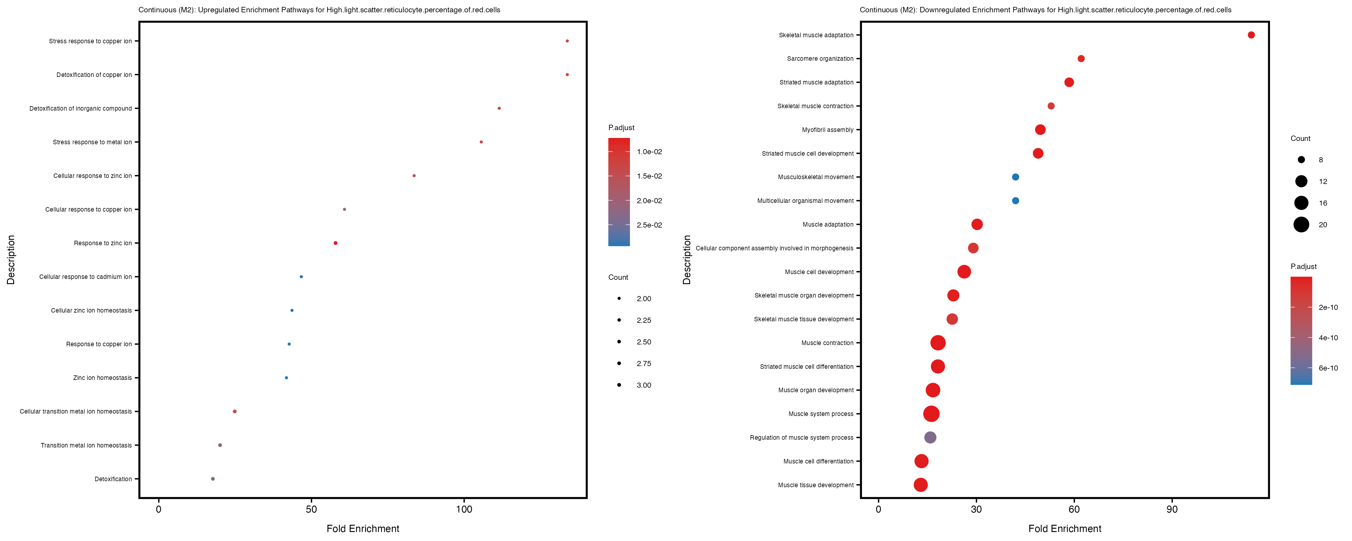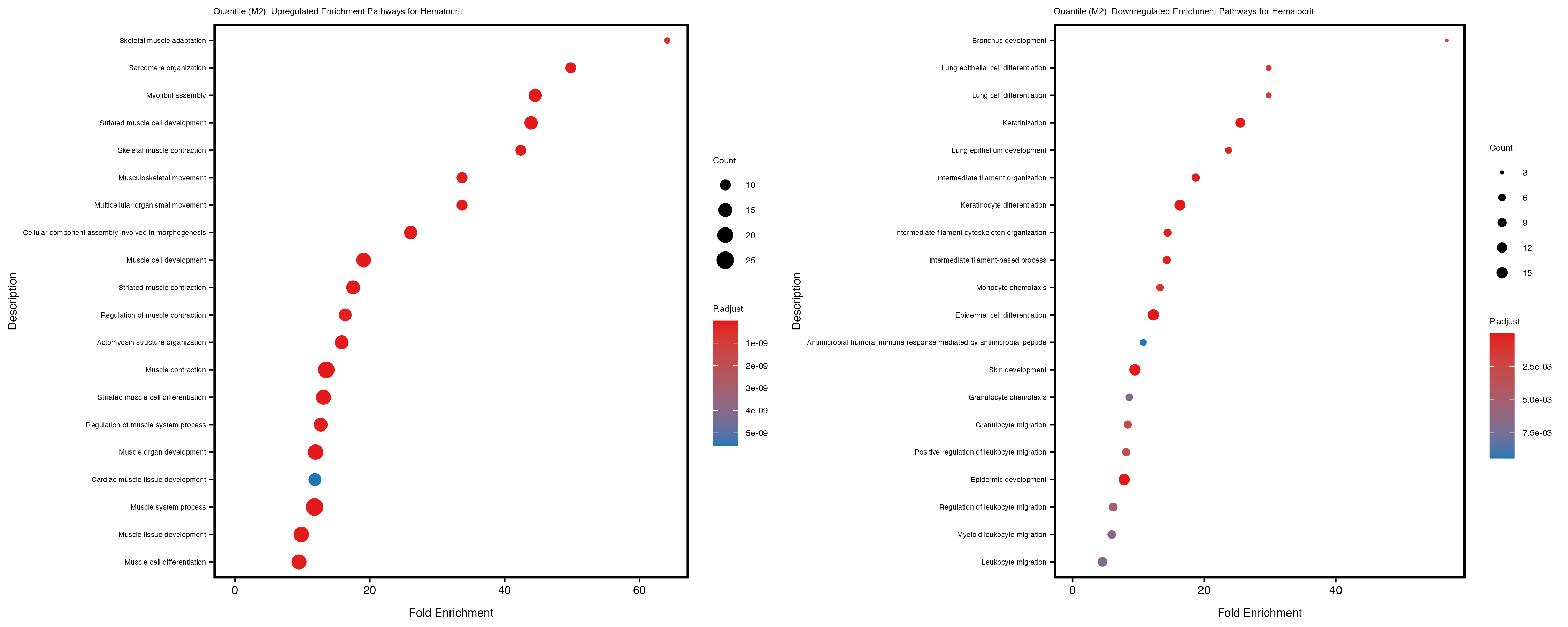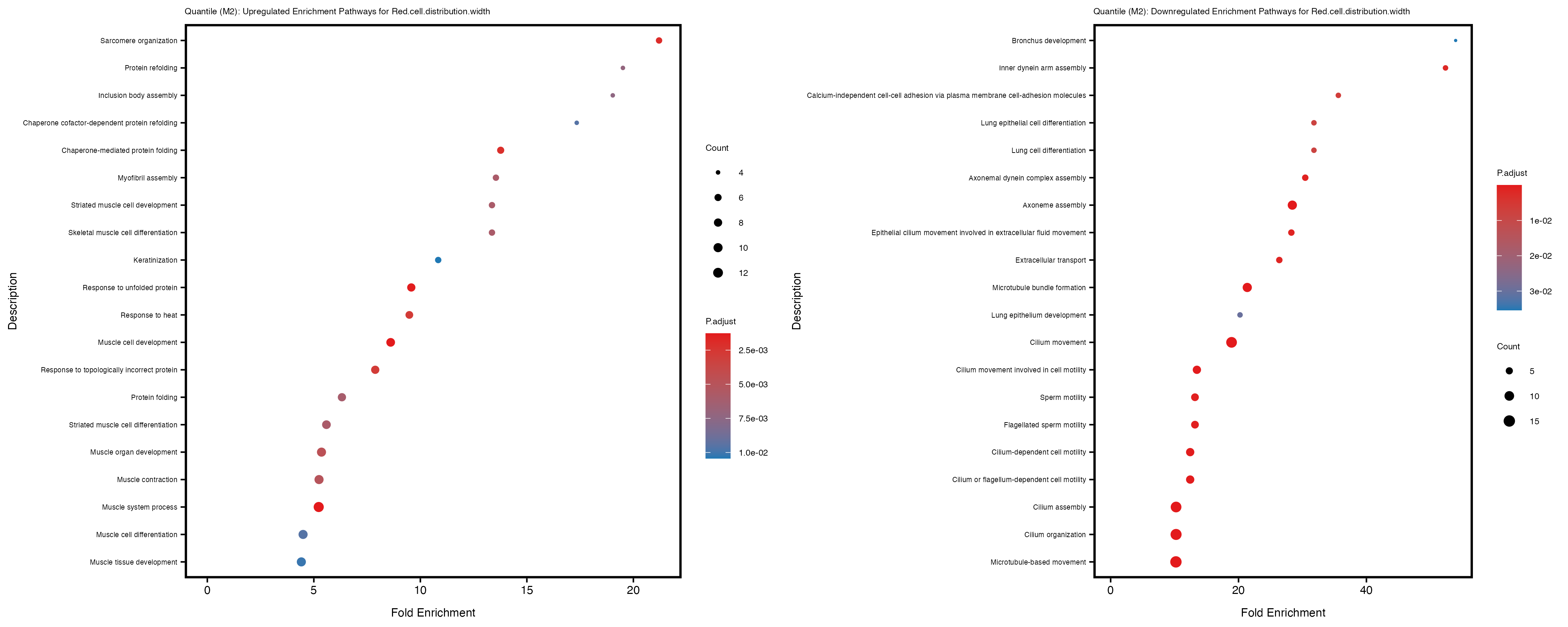 For highly correlated traits, they tend to share similar GO enriched pathways. For example, mean corpuscular hemoglobin and mean corpucular volume are both involved in read blood cell biology, so it’s expected that their GO enrichment would point to similar biological processes, such as hemoglobin metabolism, iron homeostasis and erythropoiesis.