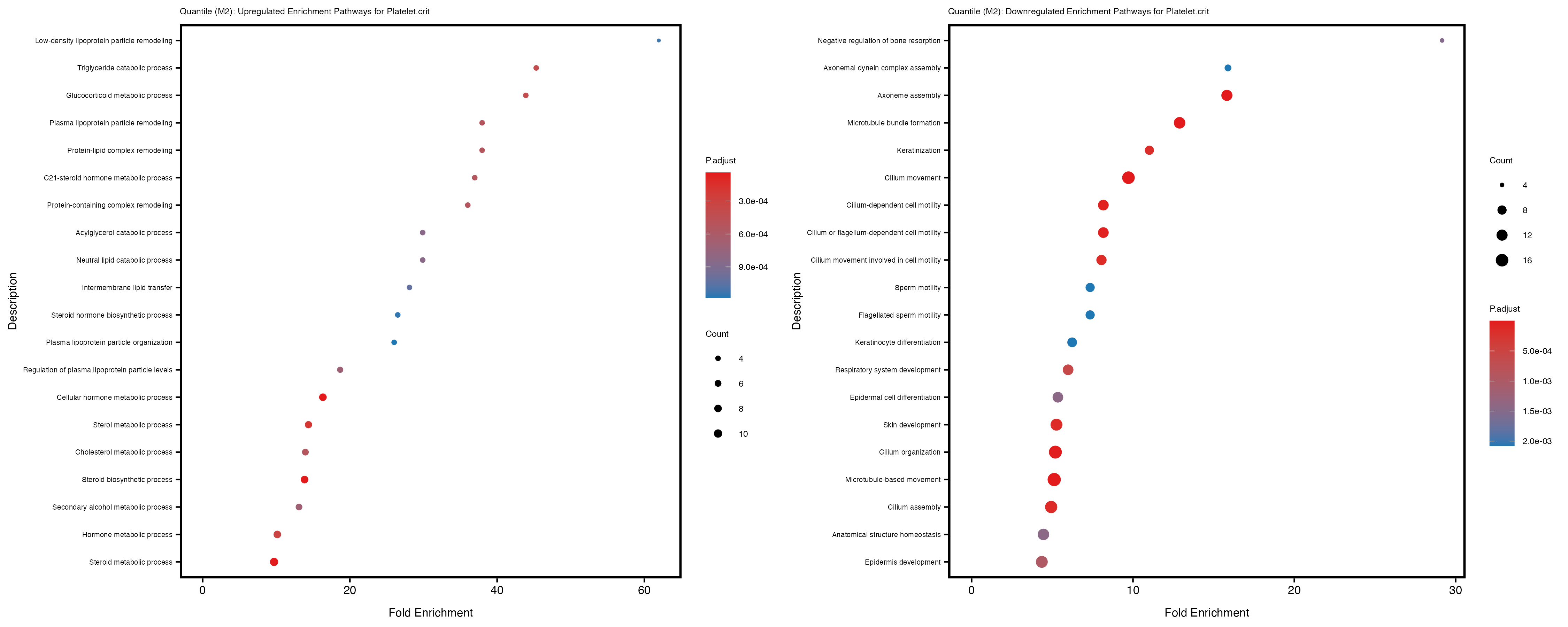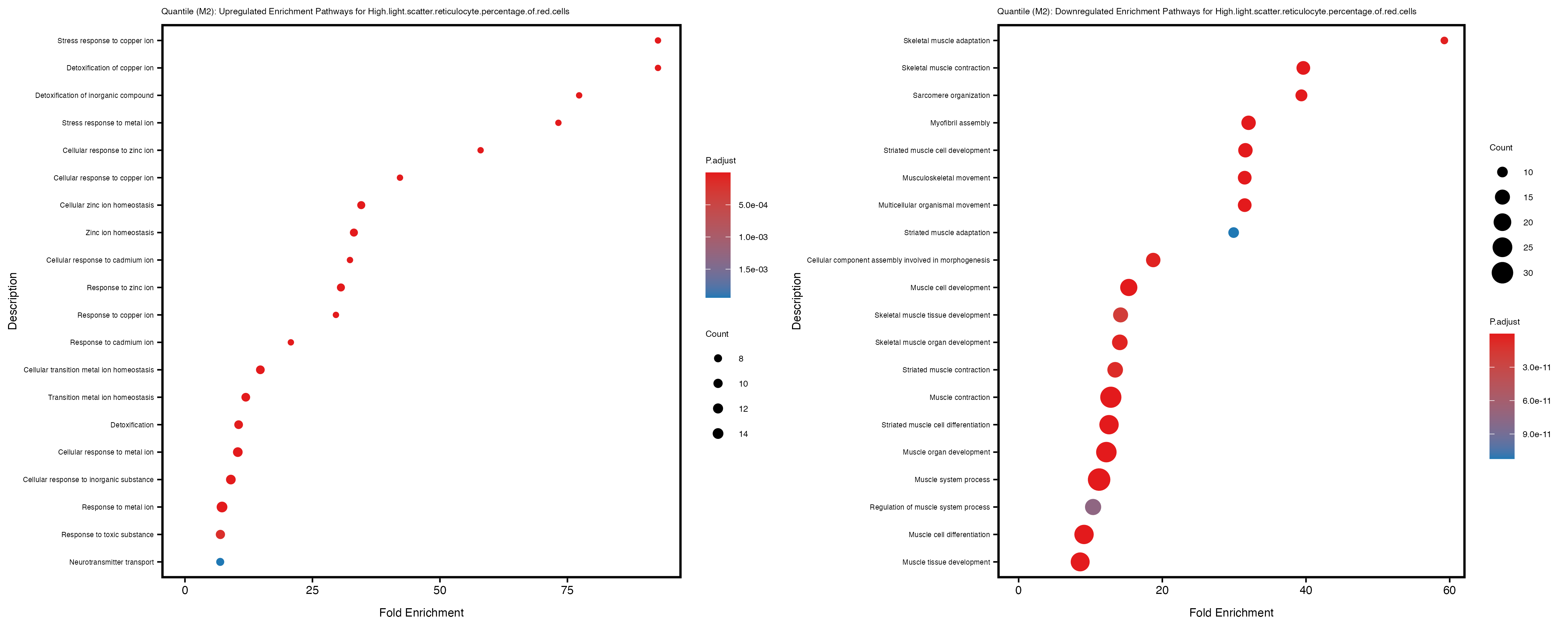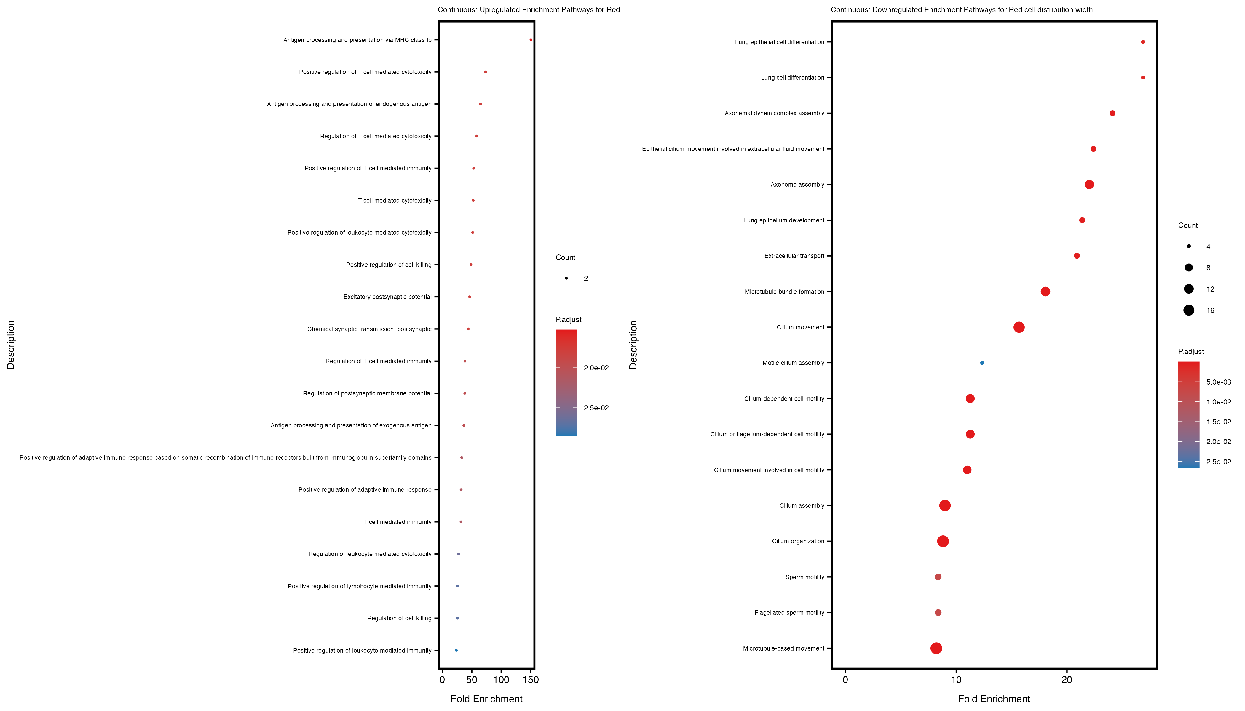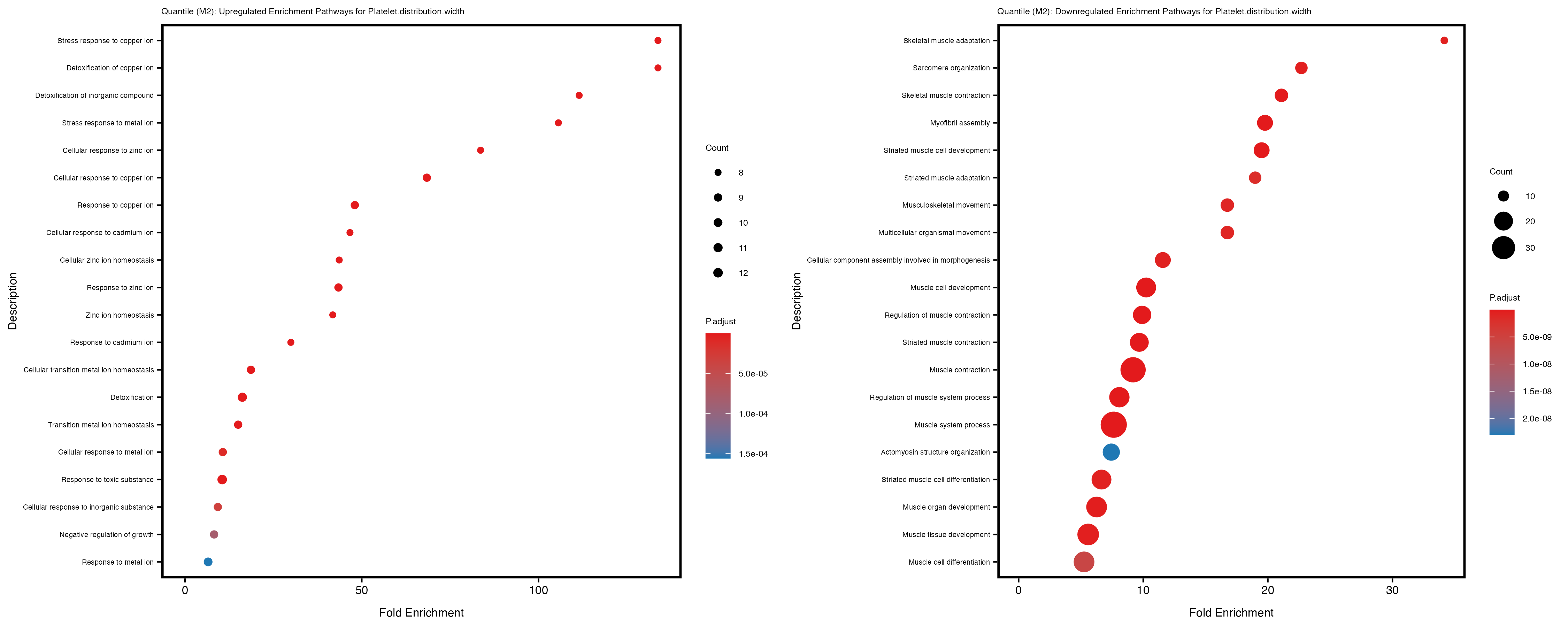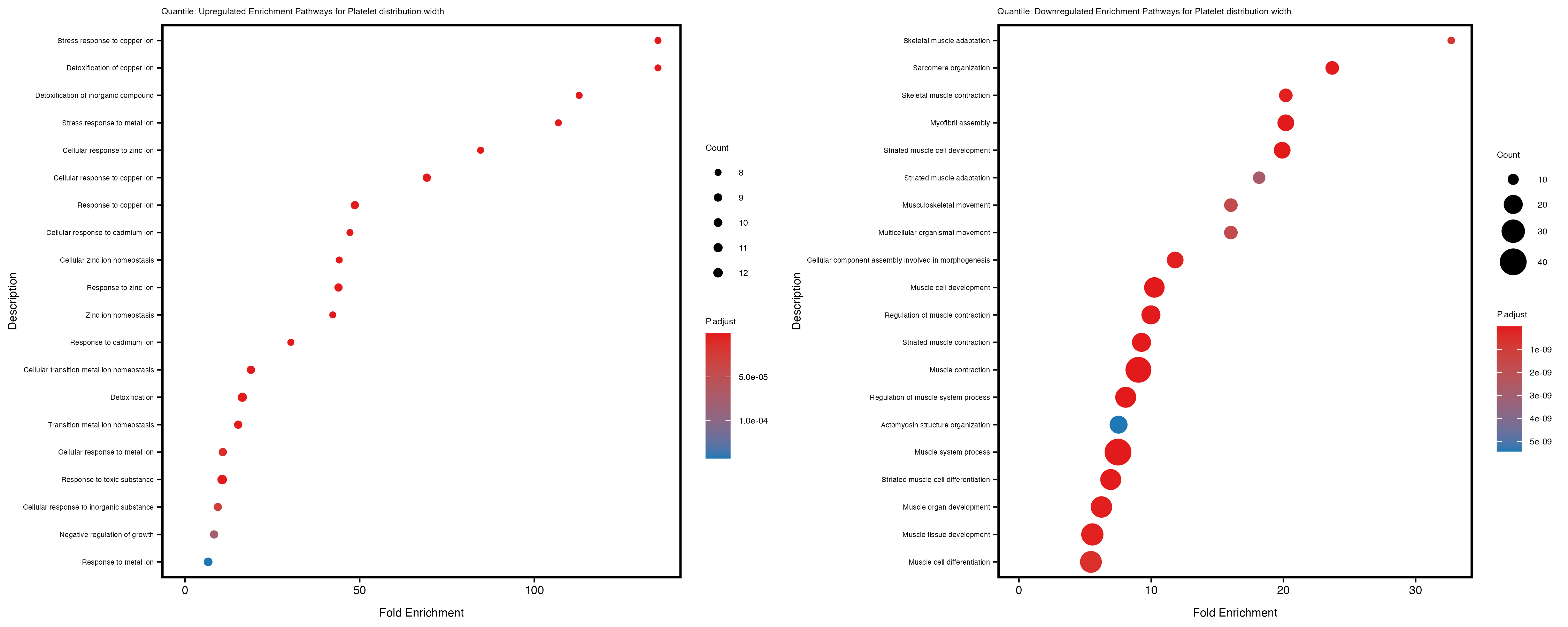 For highly correlated traits, they tend to share similar GO enriched pathways. For example, mean corpuscular hemoglobin and mean corpucular volume are both involved in read blood cell biology, so it’s expected that their GO enrichment would point to similar biological processes, such as hemoglobin metabolism, iron homeostasis and erythropoiesis.