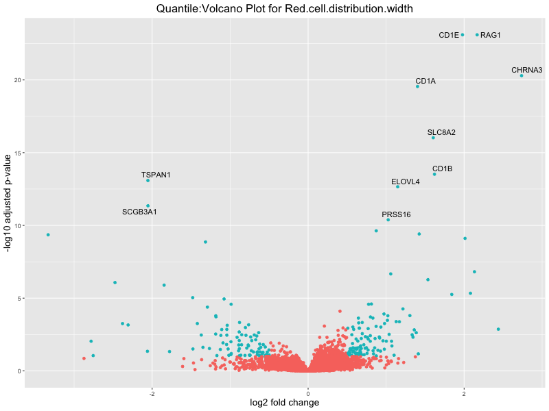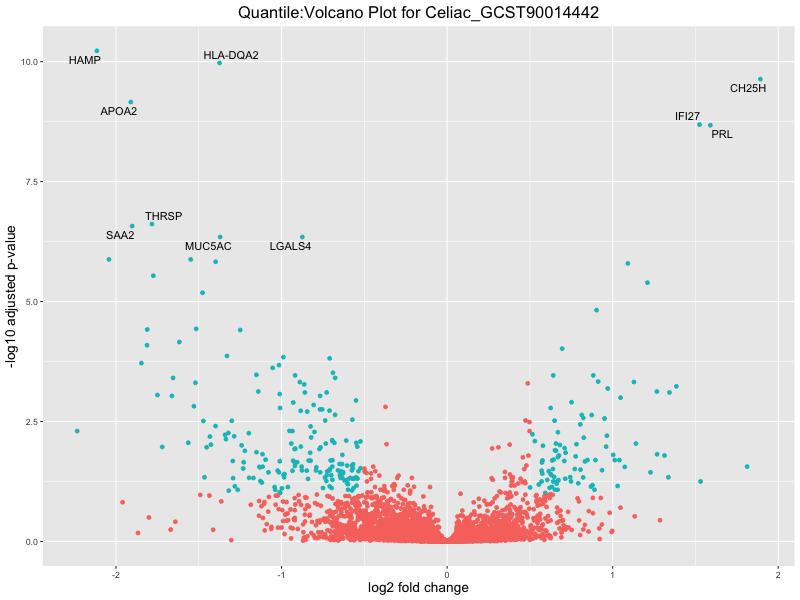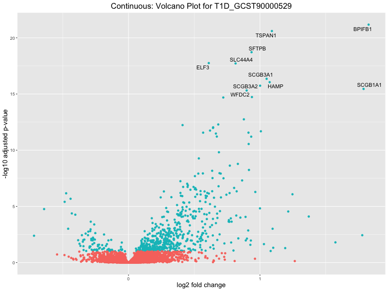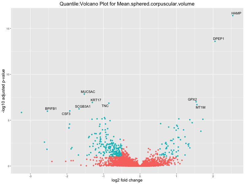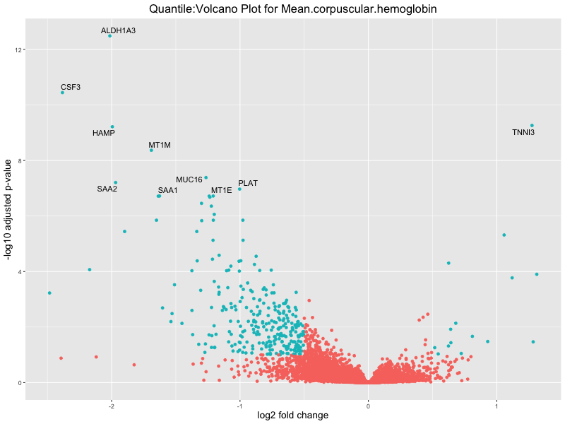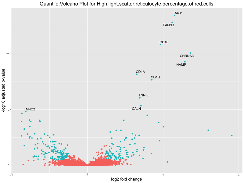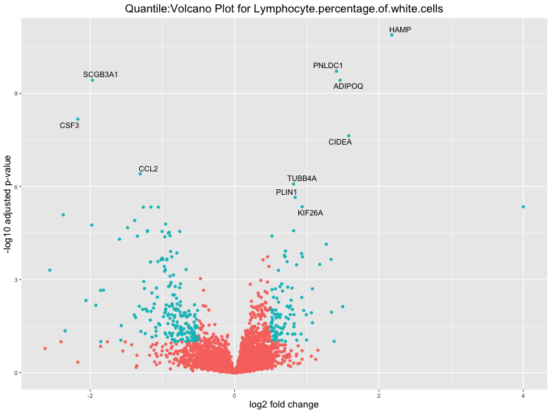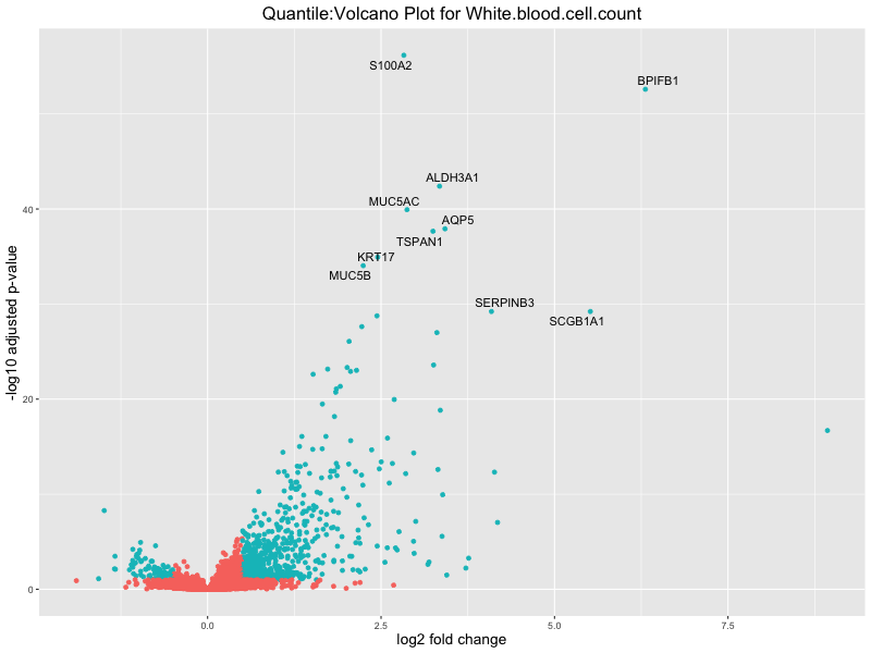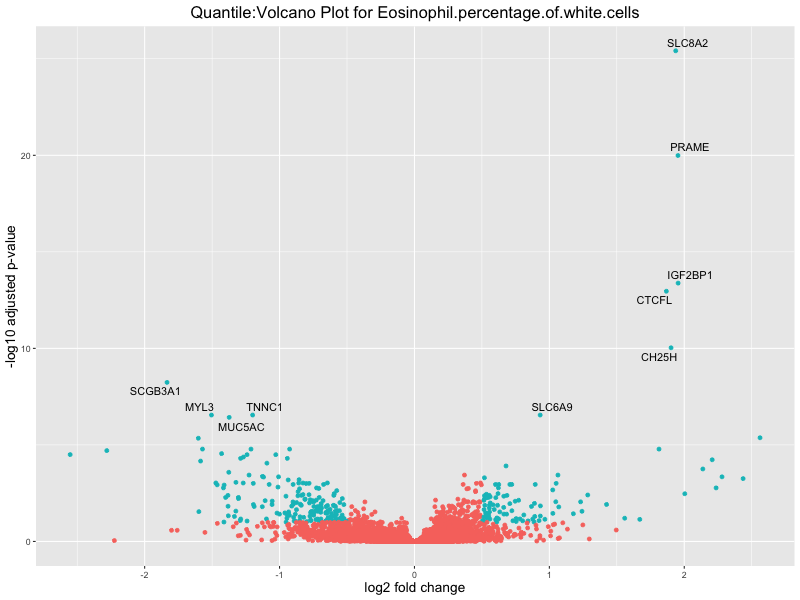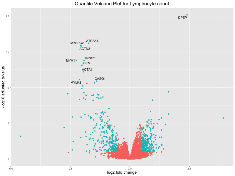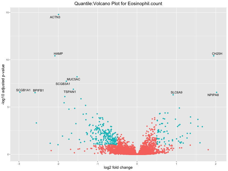 In the quantile analysis, the number of significant differential expressed genes is generally higher compared to the continuous analysis, which suggests that stratifying by PRS (top 25%) may identify more genes with stronger associations to the traits. We observed that certain genes were identified in both the continuous and quantile PRS analyses, though not all genes overlapped. Specifically, for the Eosinophil count trait, ACTN3, HAMP, SCGB3A1, CH25H, and NPIPA8 appeared among the top 10 DEGs across both analyses, suggesting that these genes might play a key role in the trait regardless of the analysis approach. For example:
