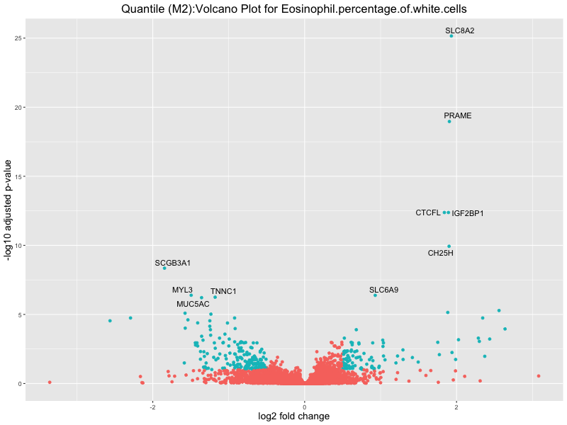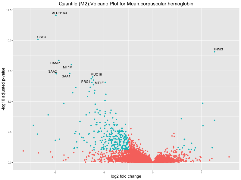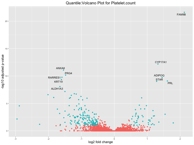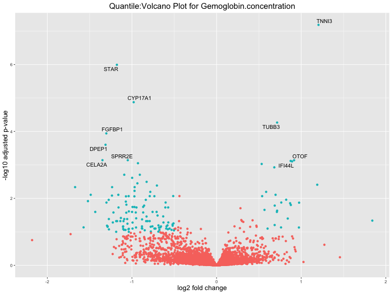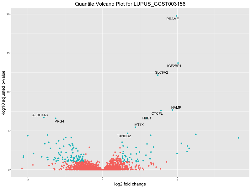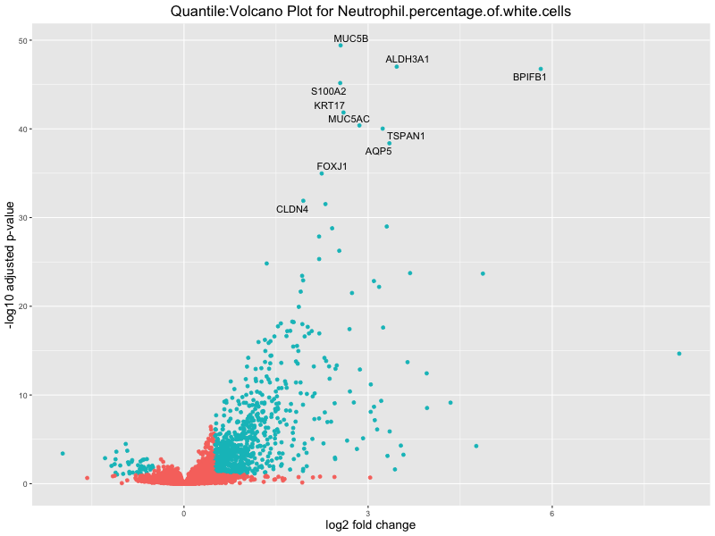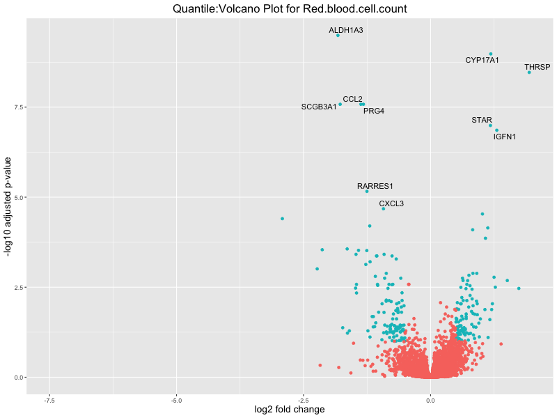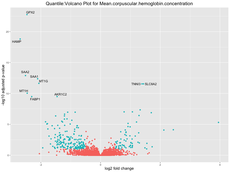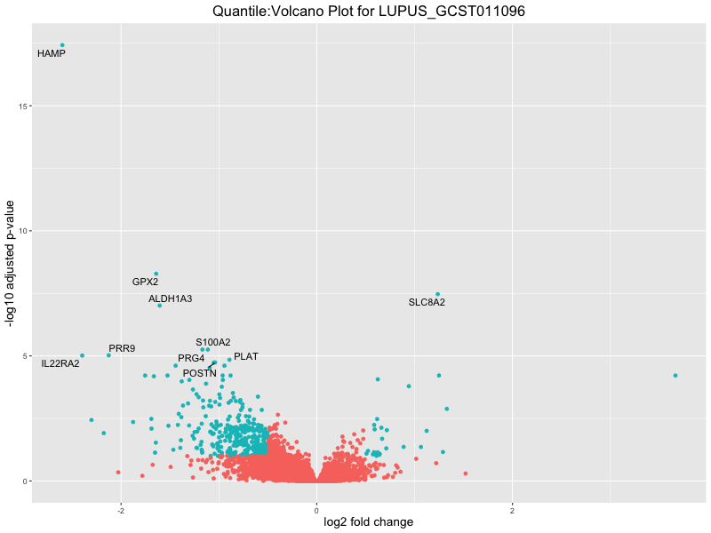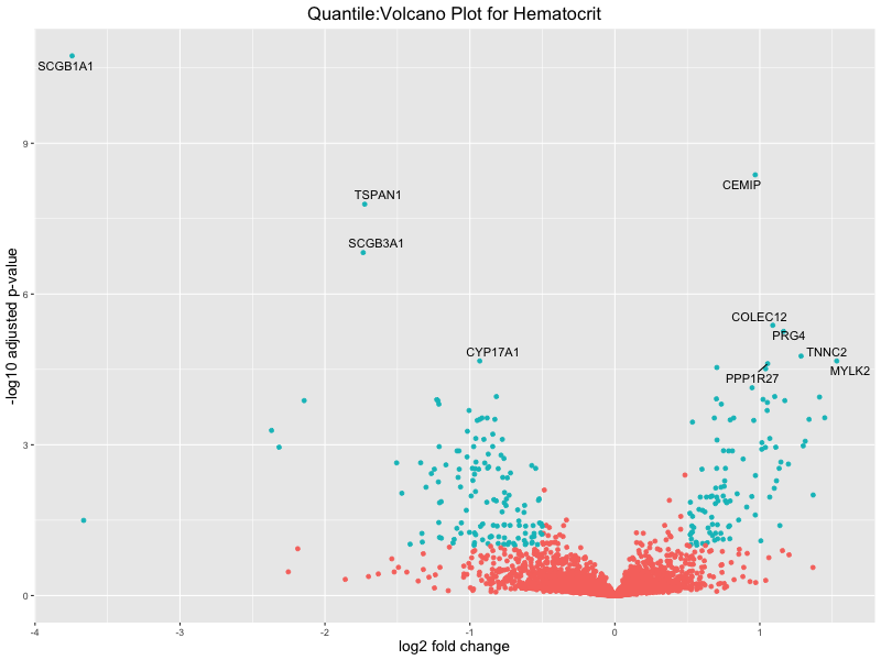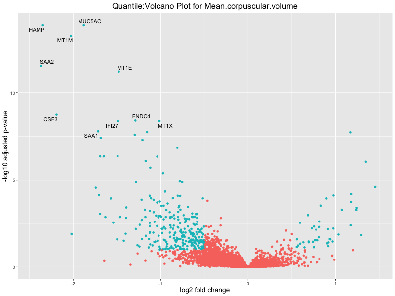 In the quantile analysis, the number of significant differential expressed genes is generally higher compared to the continuous analysis, which suggests that stratifying by PRS (top 25%) may identify more genes with stronger associations to the traits. We observed that certain genes were identified in both the continuous and quantile PRS analyses, though not all genes overlapped. Specifically, for the Eosinophil count trait, ACTN3, HAMP, SCGB3A1, CH25H, and NPIPA8 appeared among the top 10 DEGs across both analyses, suggesting that these genes might play a key role in the trait regardless of the analysis approach. For example: