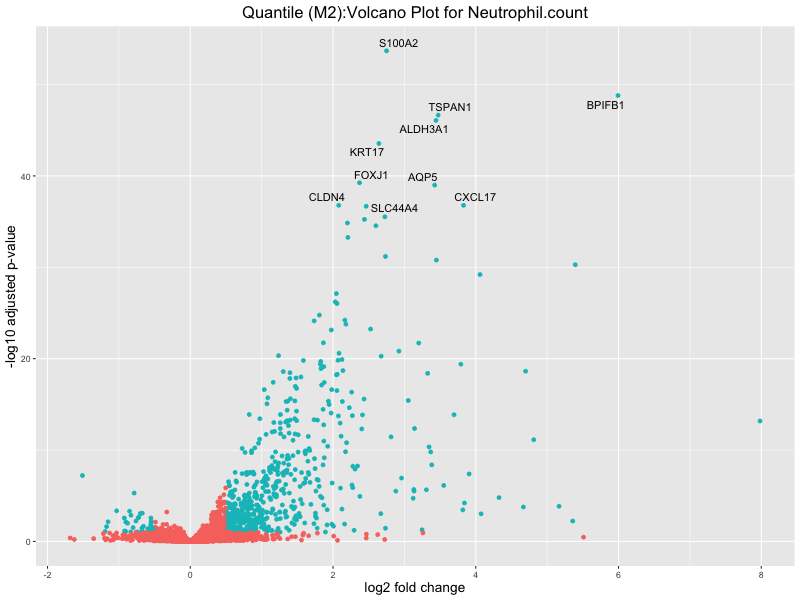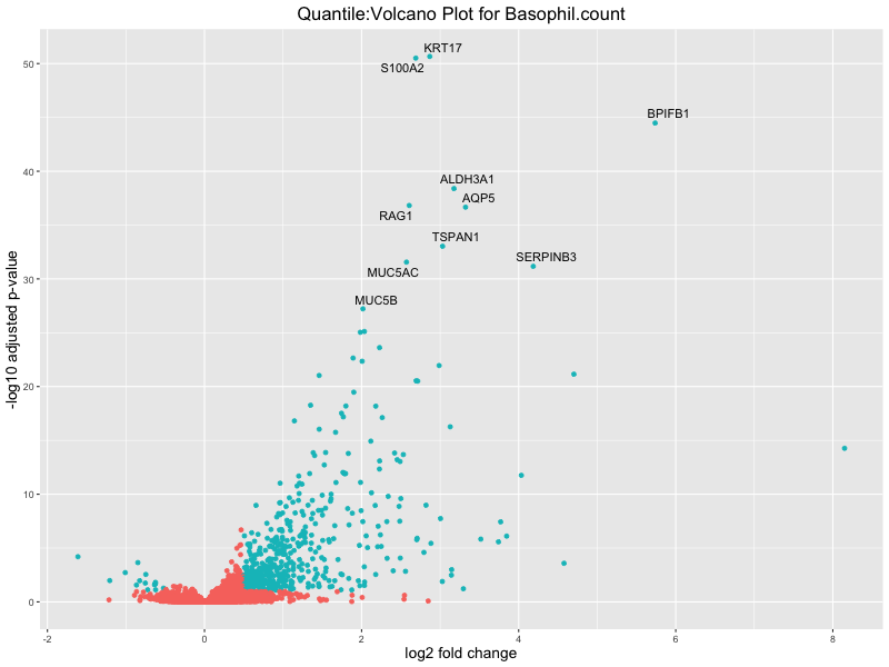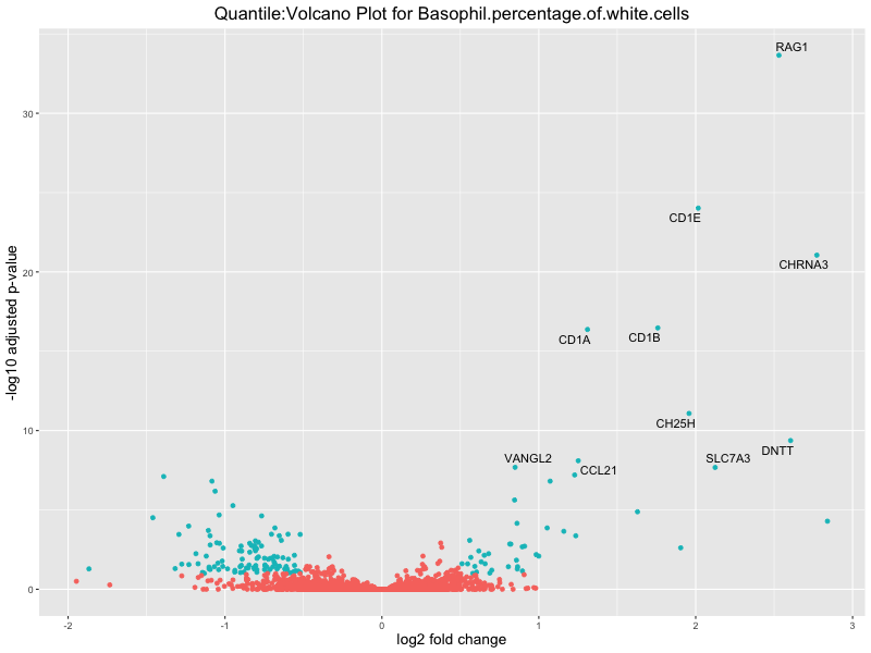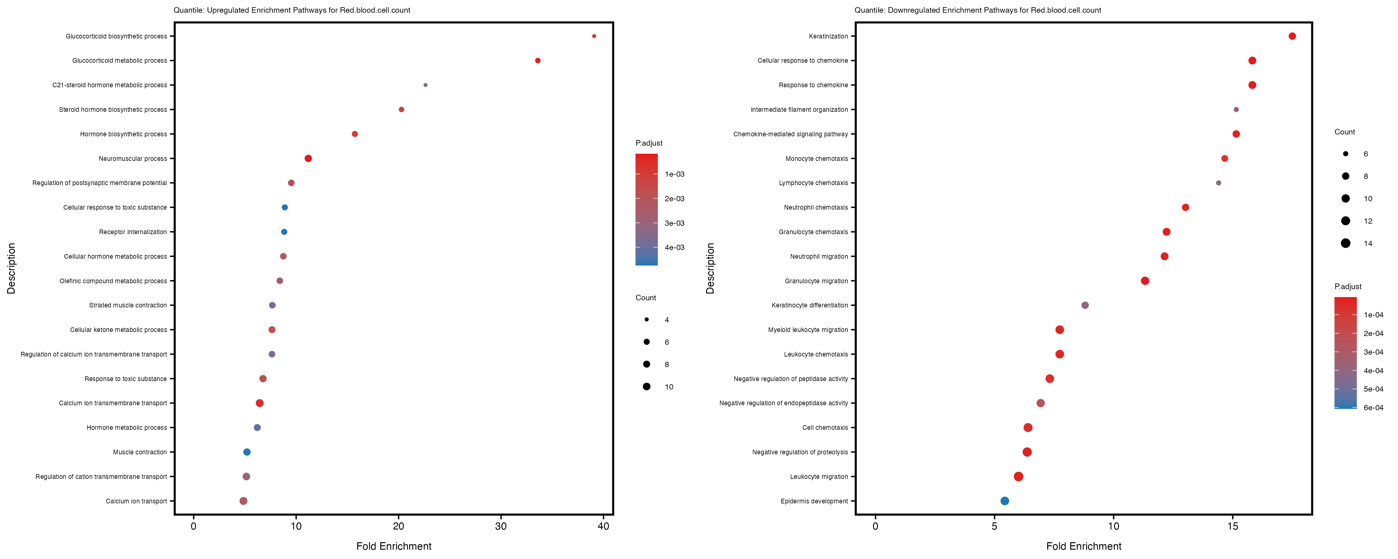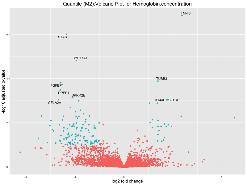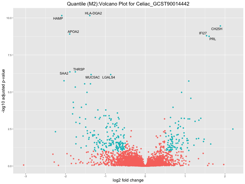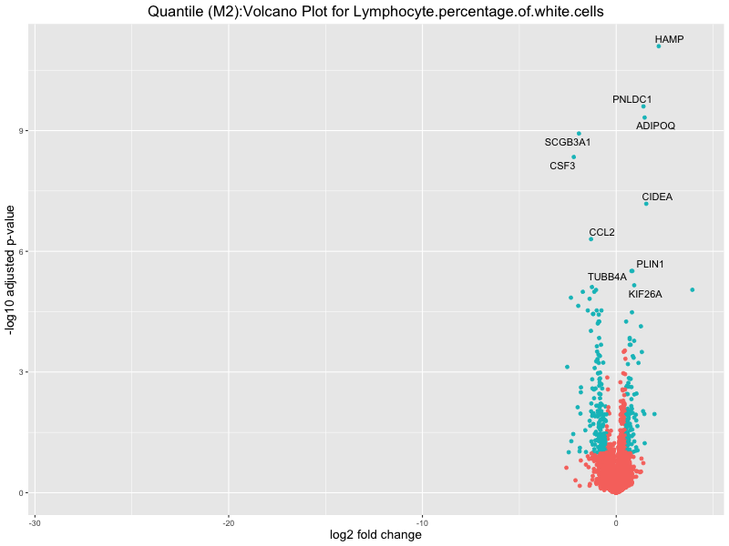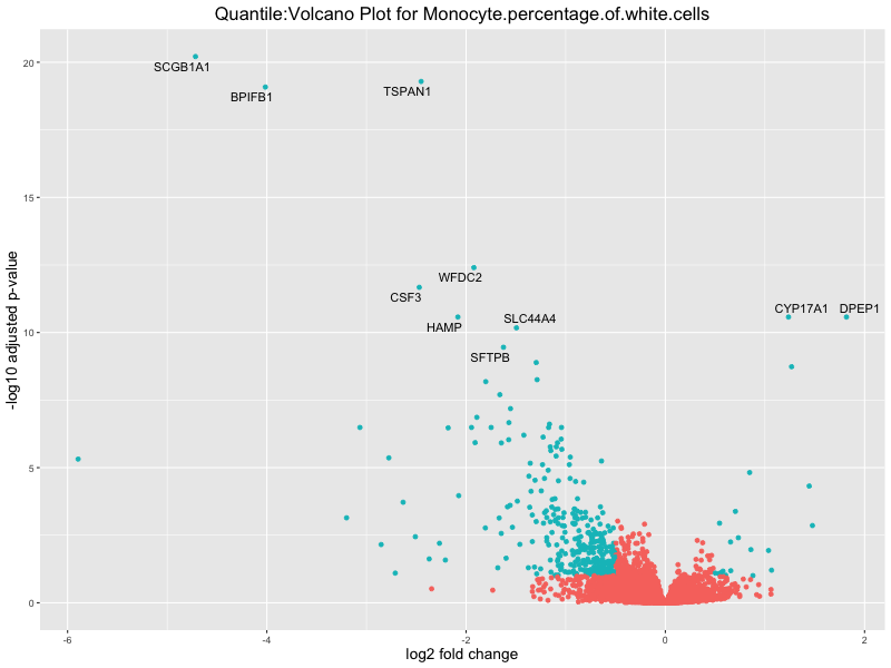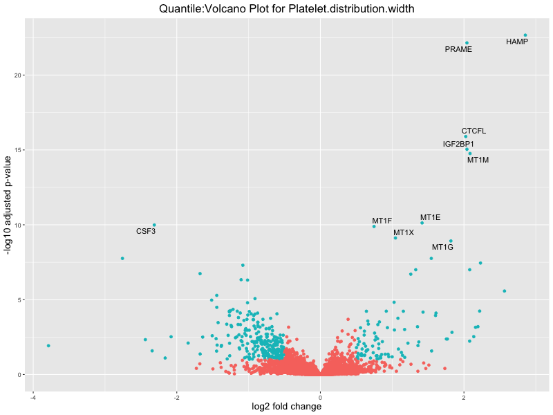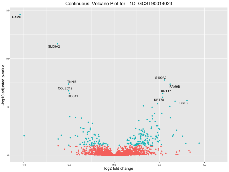 In the quantile analysis, the number of significant differential expressed genes is generally higher compared to the continuous analysis, which suggests that stratifying by PRS (top 25%) may identify more genes with stronger associations to the traits. We observed that certain genes were identified in both the continuous and quantile PRS analyses, though not all genes overlapped. Specifically, for the Eosinophil count trait, ACTN3, HAMP, SCGB3A1, CH25H, and NPIPA8 appeared among the top 10 DEGs across both analyses, suggesting that these genes might play a key role in the trait regardless of the analysis approach. For example: