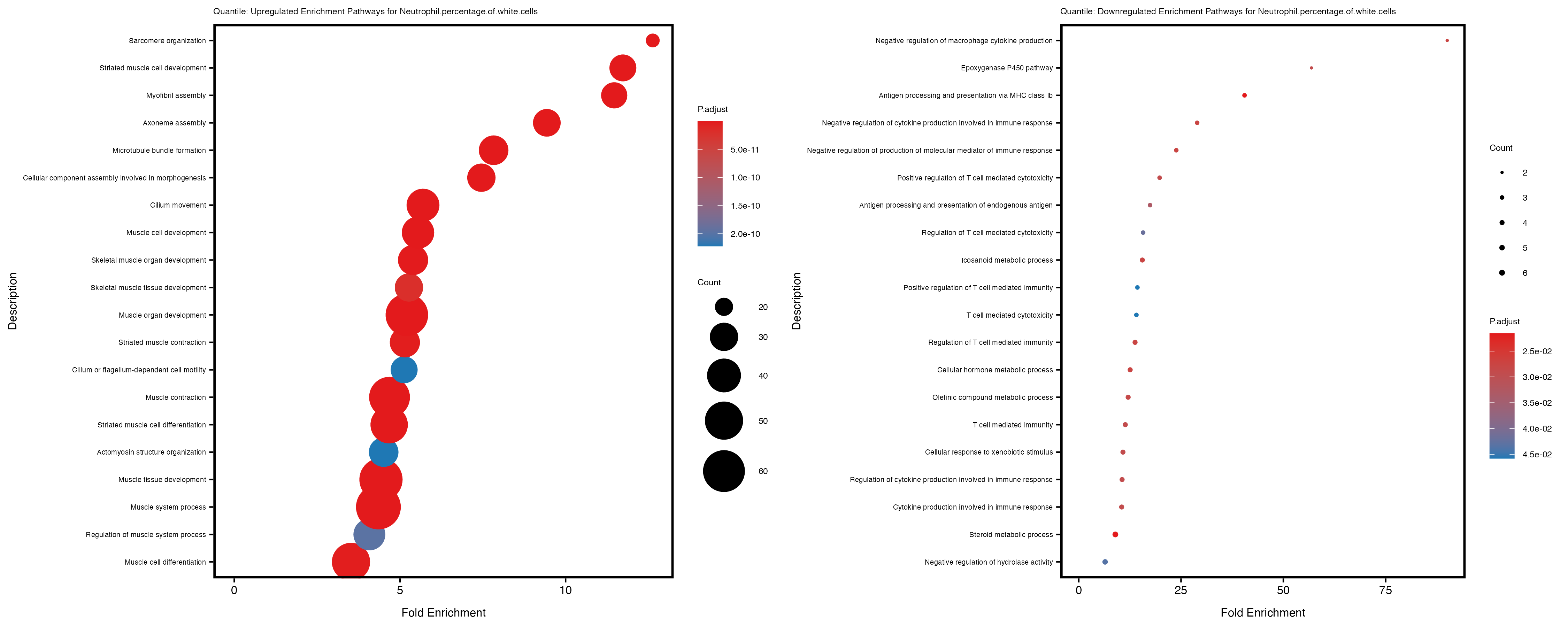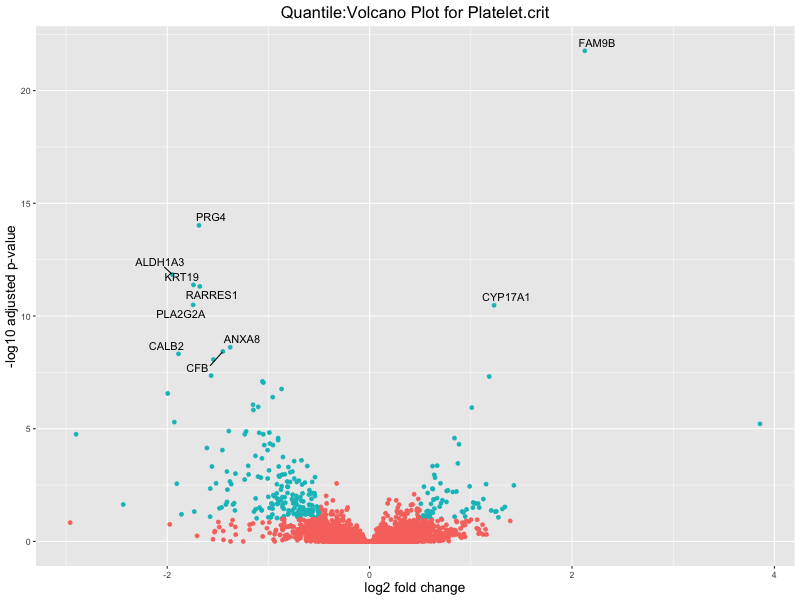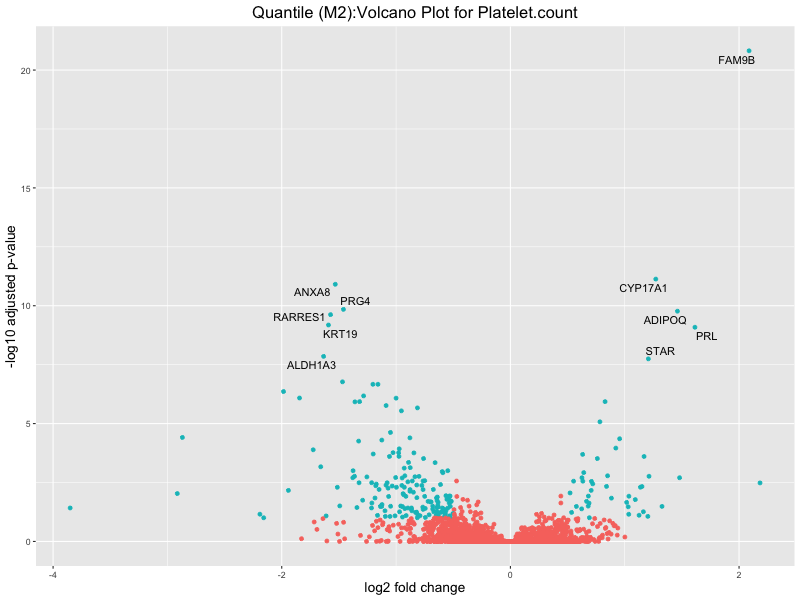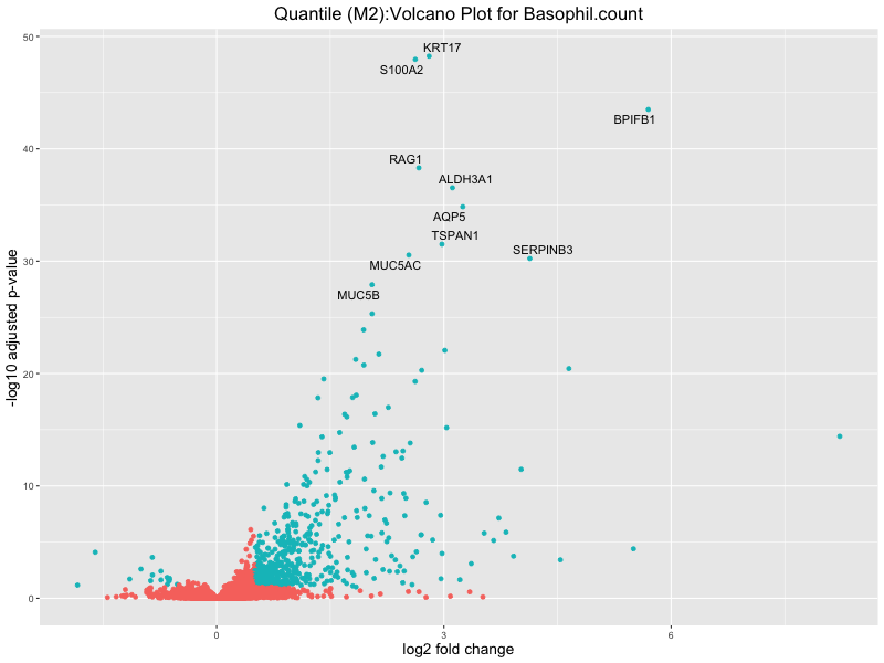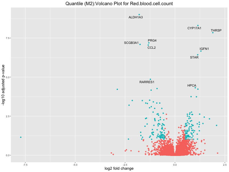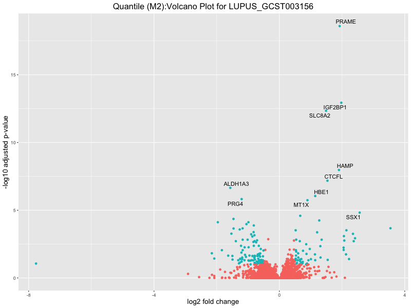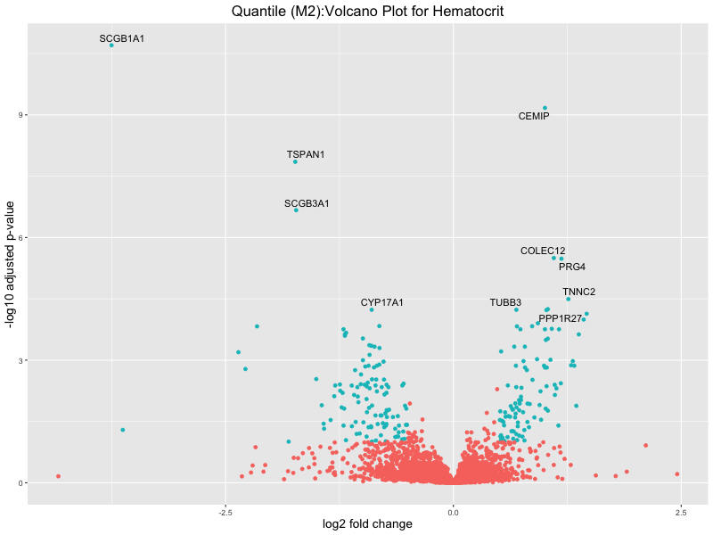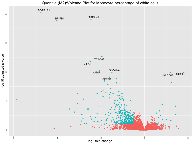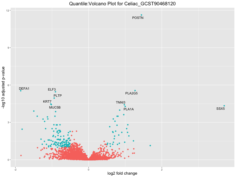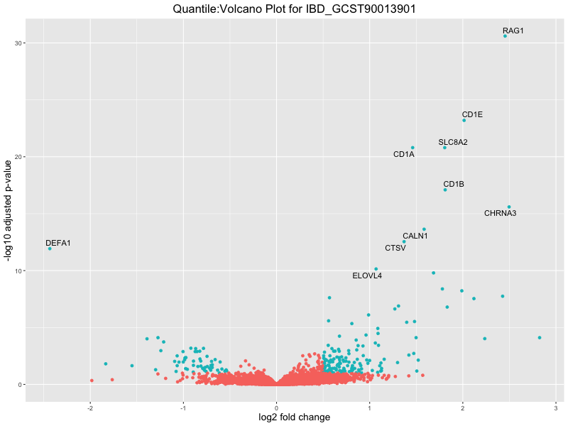 In the quantile analysis, the number of significant differential expressed genes is generally higher compared to the continuous analysis, which suggests that stratifying by PRS (top 25%) may identify more genes with stronger associations to the traits. We observed that certain genes were identified in both the continuous and quantile PRS analyses, though not all genes overlapped. Specifically, for the Eosinophil count trait, ACTN3, HAMP, SCGB3A1, CH25H, and NPIPA8 appeared among the top 10 DEGs across both analyses, suggesting that these genes might play a key role in the trait regardless of the analysis approach. For example: