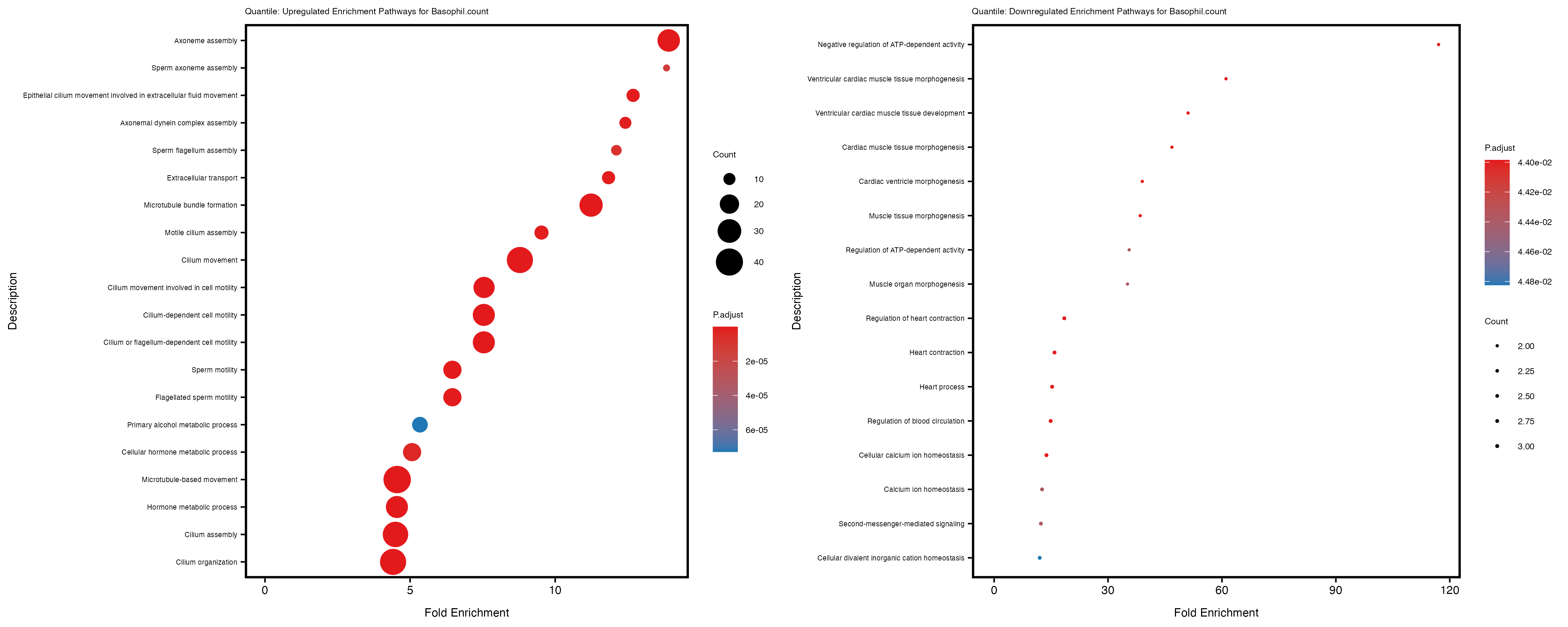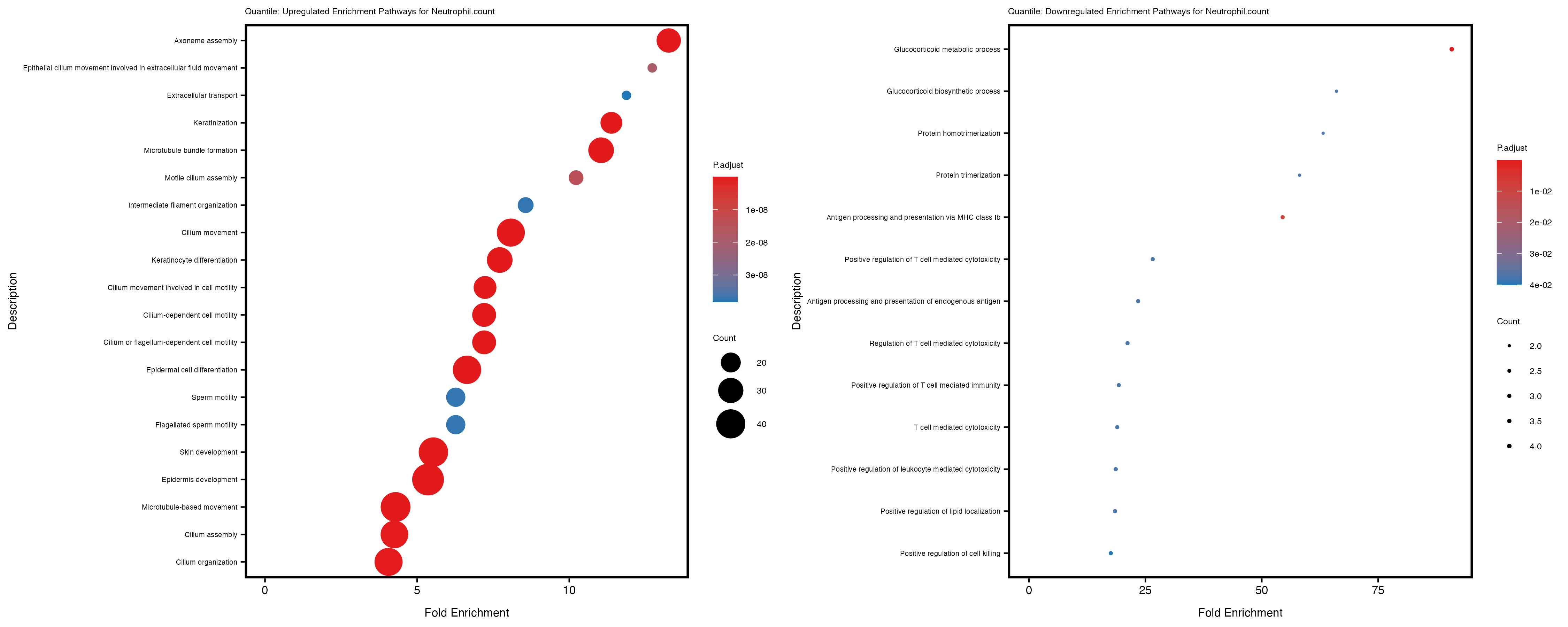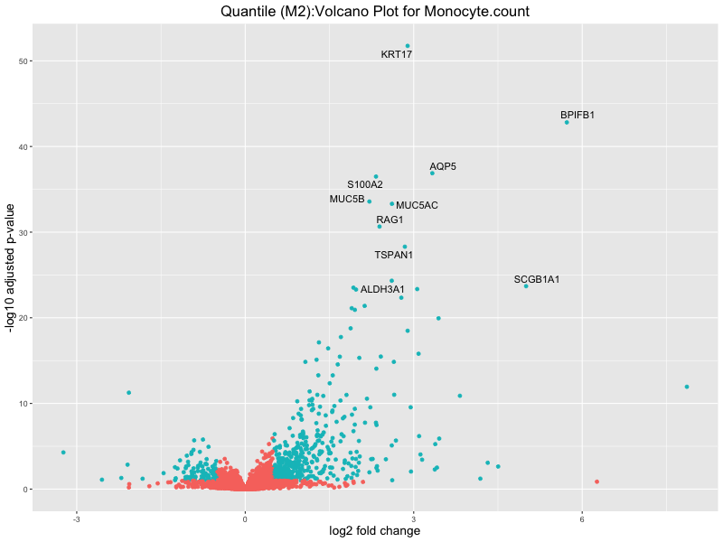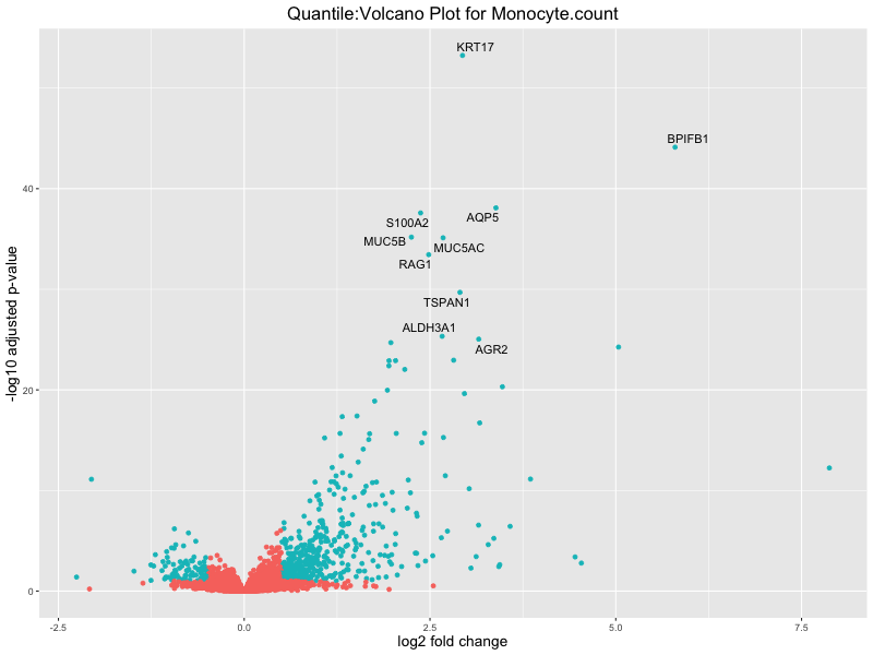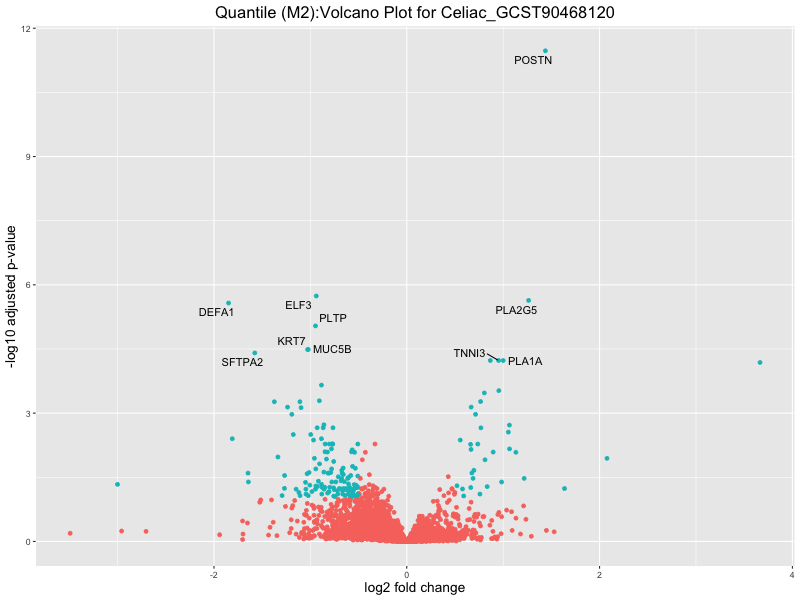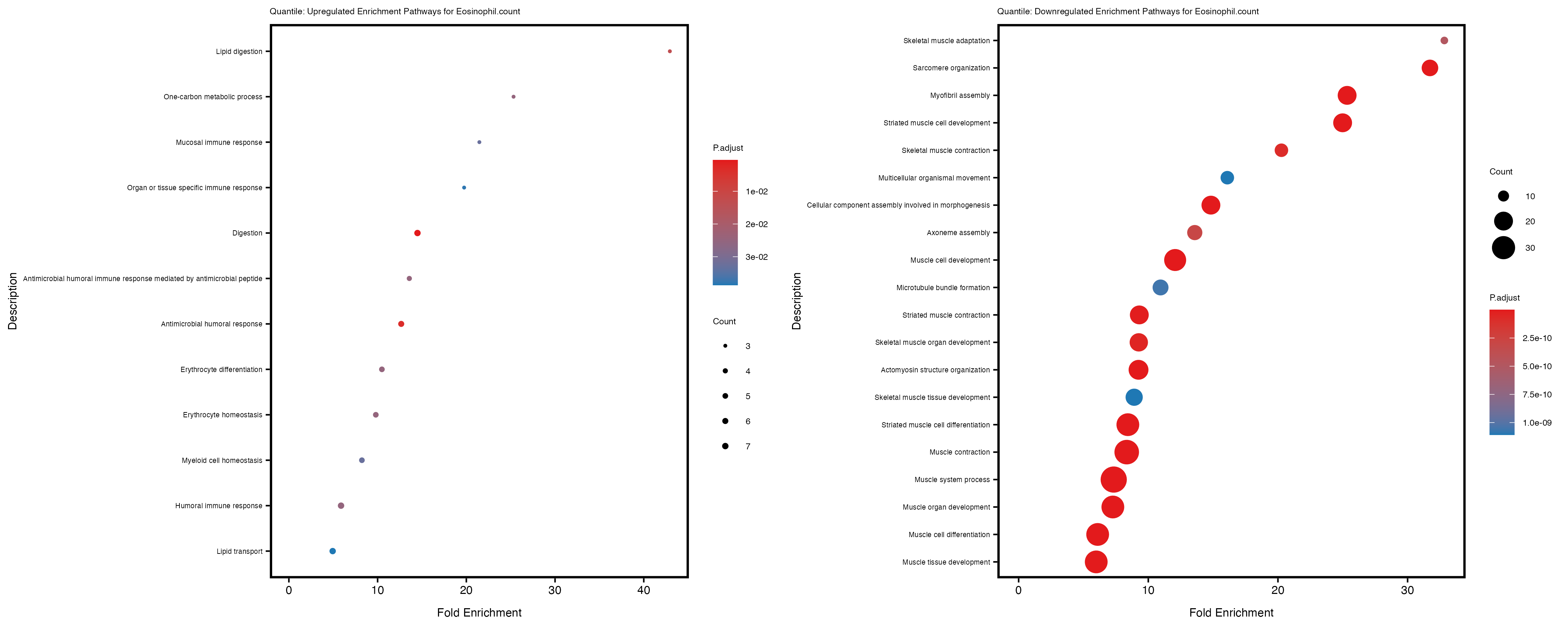 In the quantile analysis, the number of significant differential expressed genes is generally higher compared to the continuous analysis, which suggests that stratifying by PRS (top 25%) may identify more genes with stronger associations to the traits. We observed that certain genes were identified in both the continuous and quantile PRS analyses, though not all genes overlapped. Specifically, for the Eosinophil count trait, ACTN3, HAMP, SCGB3A1, CH25H, and NPIPA8 appeared among the top 10 DEGs across both analyses, suggesting that these genes might play a key role in the trait regardless of the analysis approach. For example: