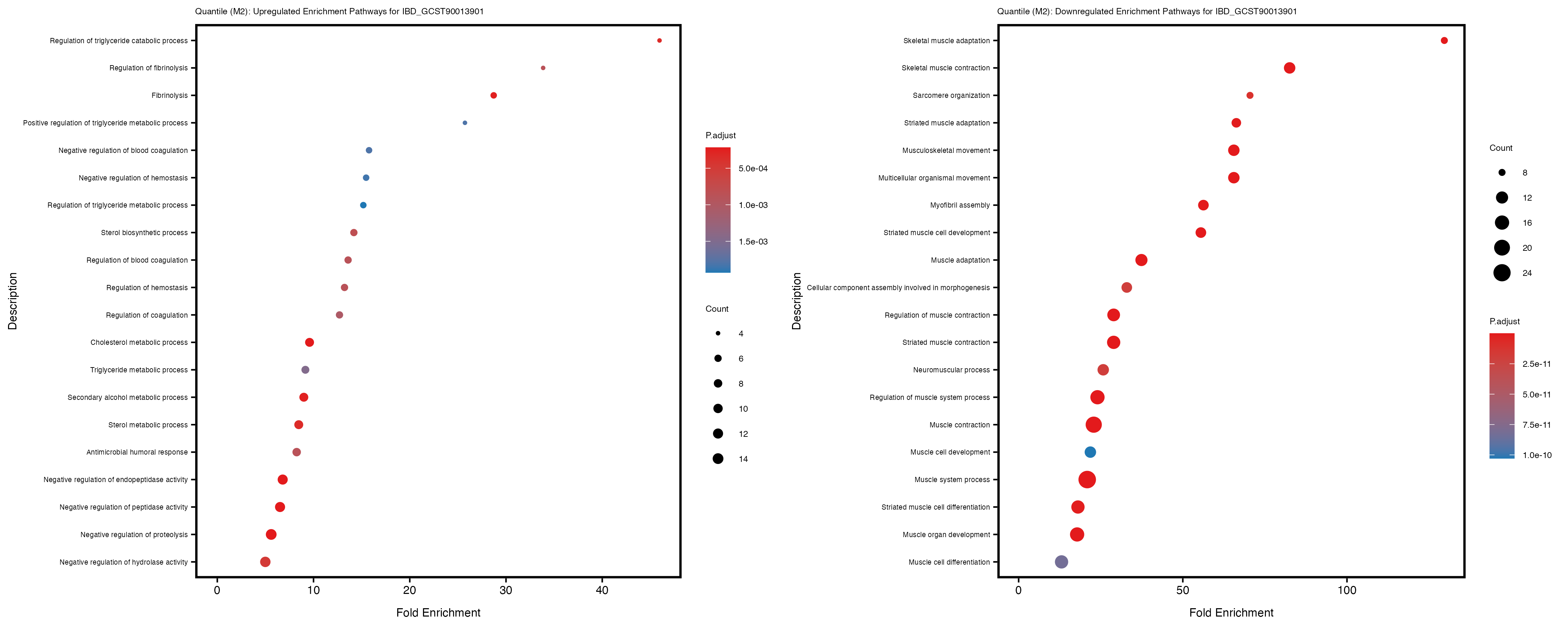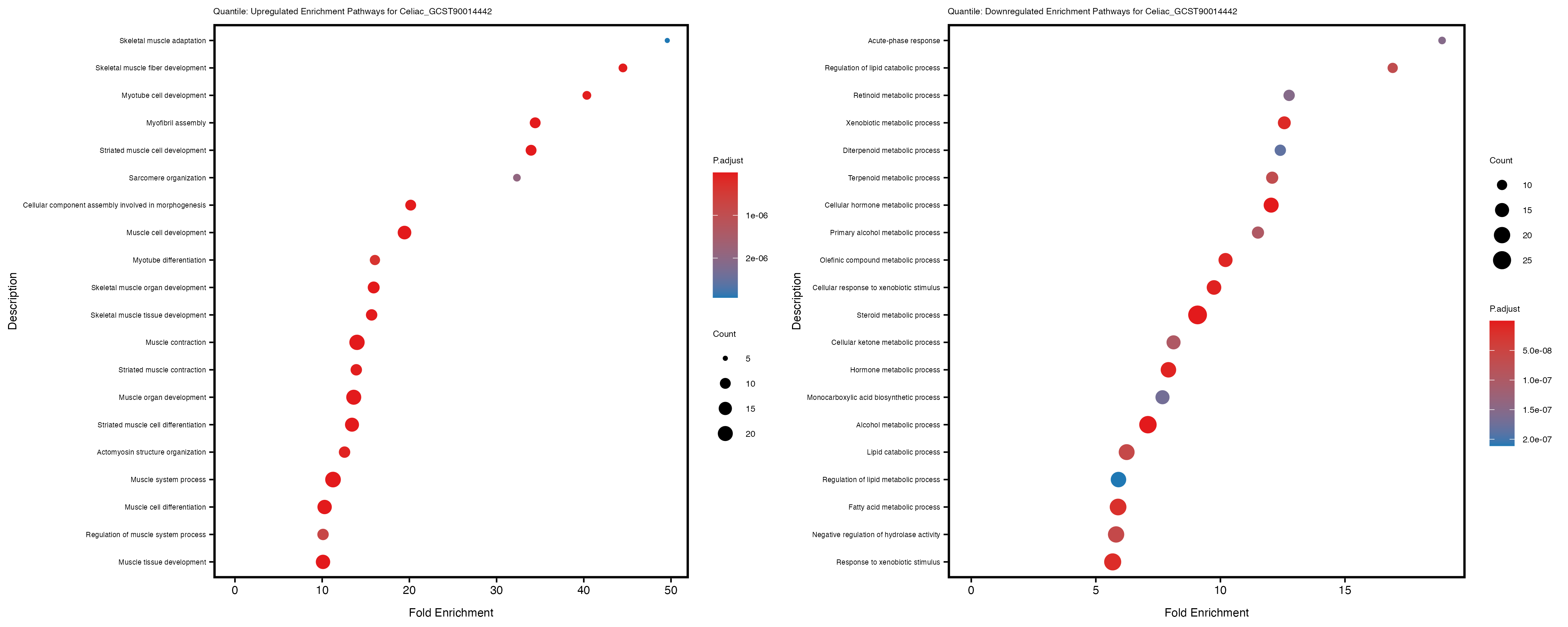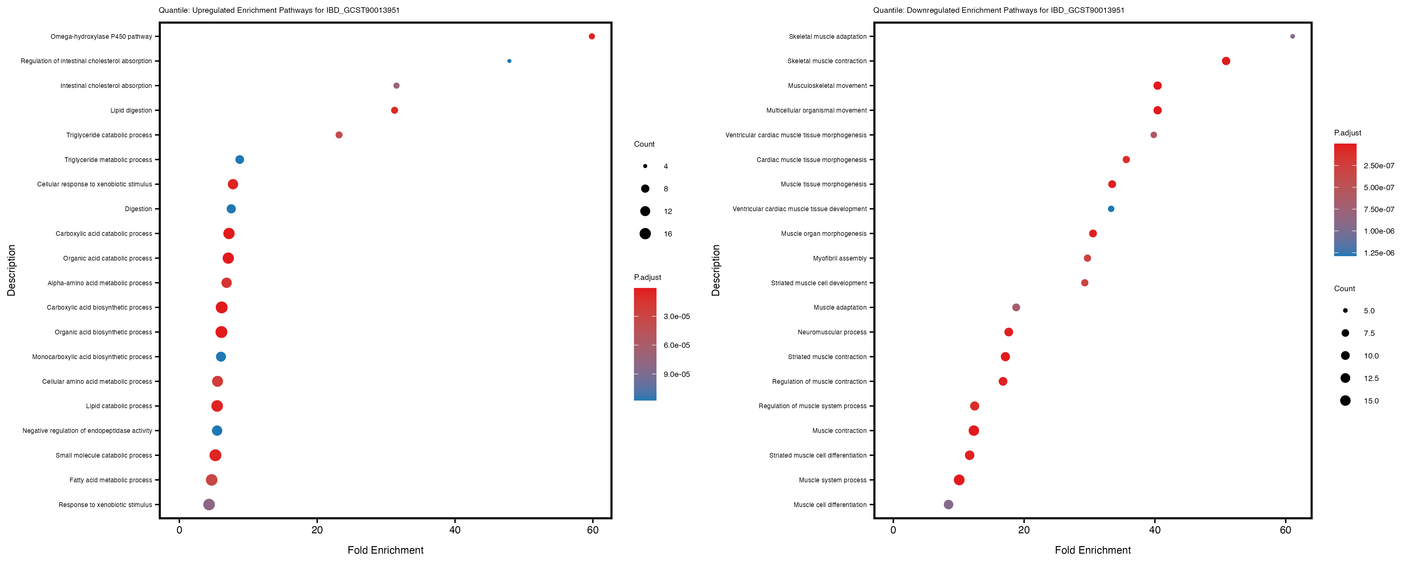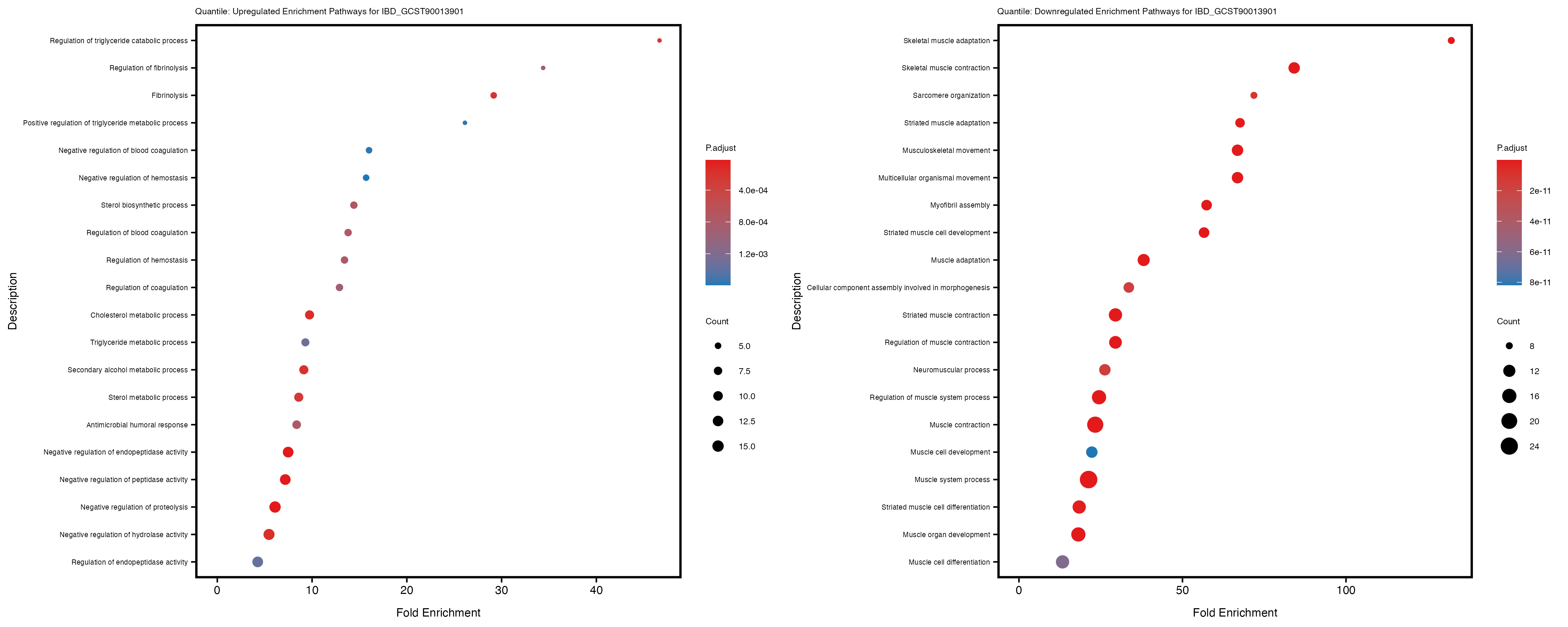 Additionally, the GO enrichment analysis provides insights into the biological pathways and processes that are potentially involved in these traits. BgRatio is the ratio of the total number of genes in a specific pathway (GO term) to the total number of genes. GeneRatio is the ratio of the number of genes enriched in specific pathway to the number of genes that were tested in the analysis. FoldEnrichment is the ratio of GeneRatio to BgRatio, showing how much more enriched a pathway is in your genes of interest compared to the total gene set. Higher FoldEnrichment values indicate that a particular GO term is overrepresented in your gene set compared to the general gene pool, suggesting it may be biologically relevant for the trait. Some traits show higher pathway enrichment in the quantile analysis, indicating that stratification by PRS may provide more biologically meaningful results.