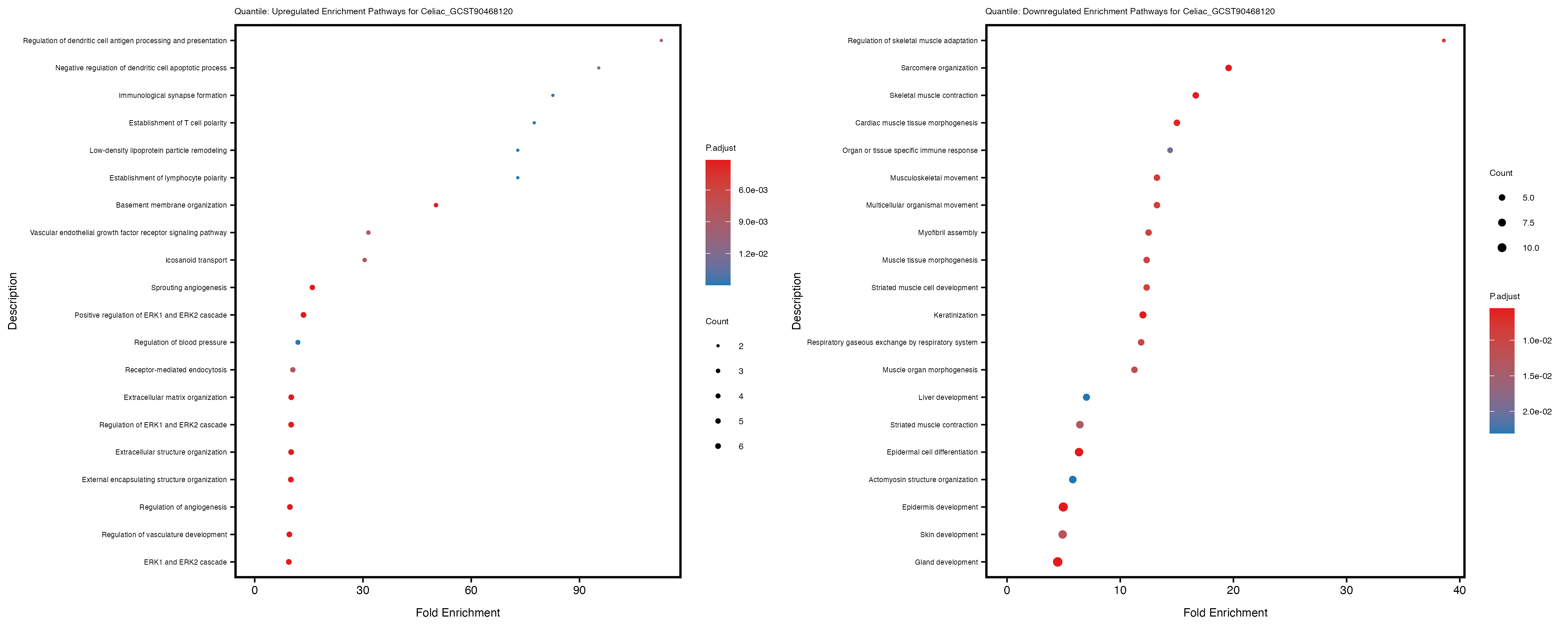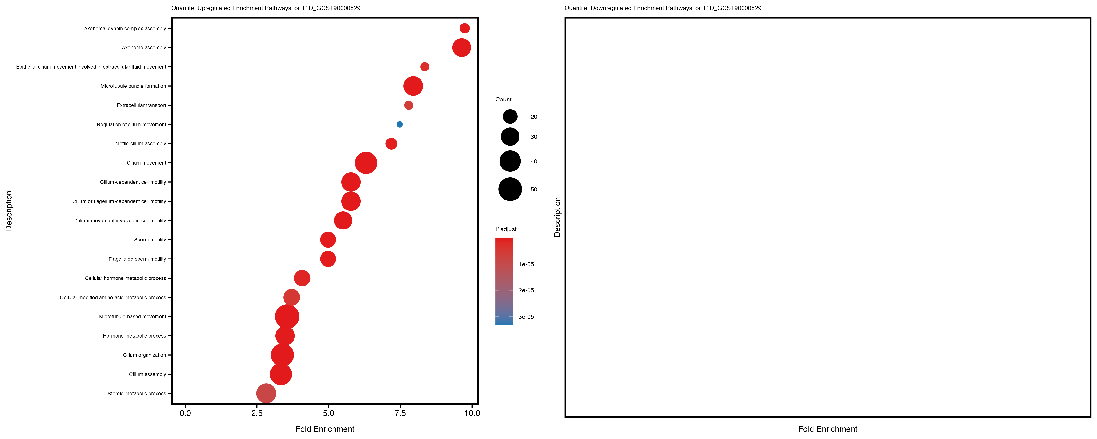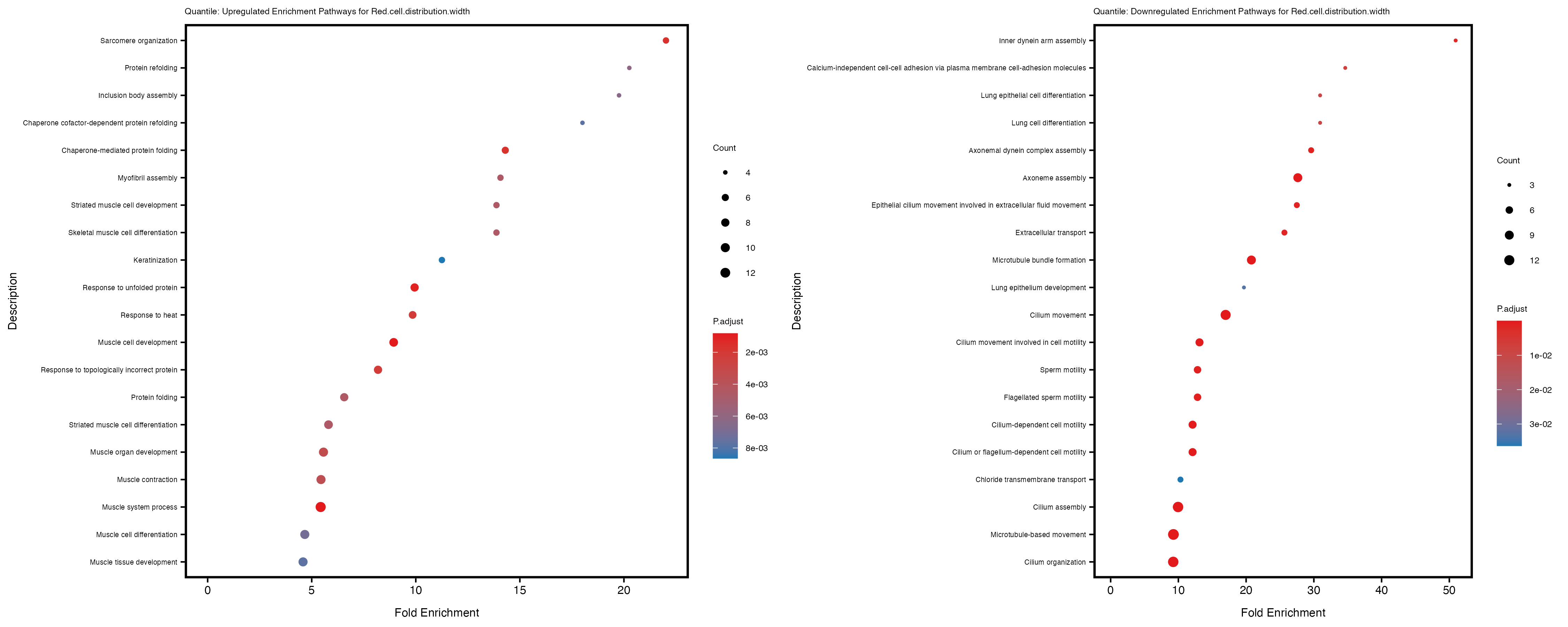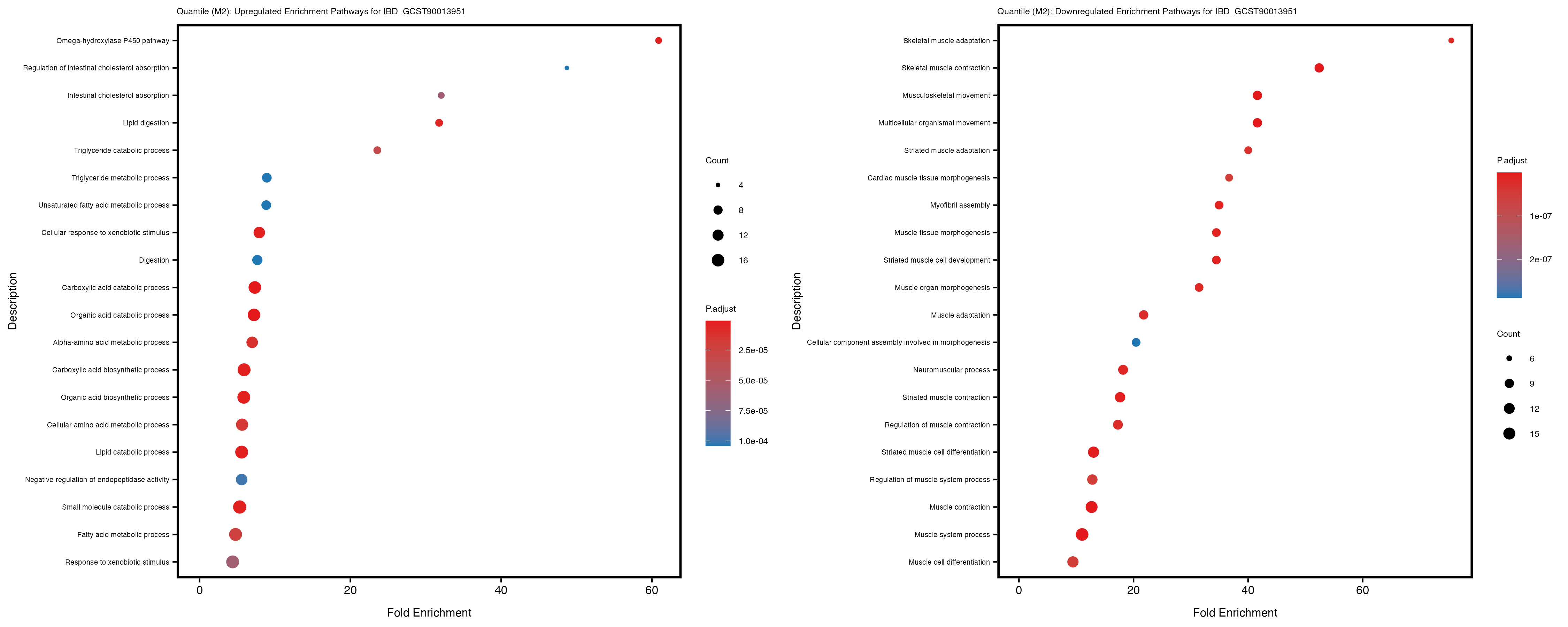 Additionally, the GO enrichment analysis provides insights into the biological pathways and processes that are potentially involved in these traits. BgRatio is the ratio of the total number of genes in a specific pathway (GO term) to the total number of genes. GeneRatio is the ratio of the number of genes enriched in specific pathway to the number of genes that were tested in the analysis. FoldEnrichment is the ratio of GeneRatio to BgRatio, showing how much more enriched a pathway is in your genes of interest compared to the total gene set. Higher FoldEnrichment values indicate that a particular GO term is overrepresented in your gene set compared to the general gene pool, suggesting it may be biologically relevant for the trait. Some traits show higher pathway enrichment in the quantile analysis, indicating that stratification by PRS may provide more biologically meaningful results.