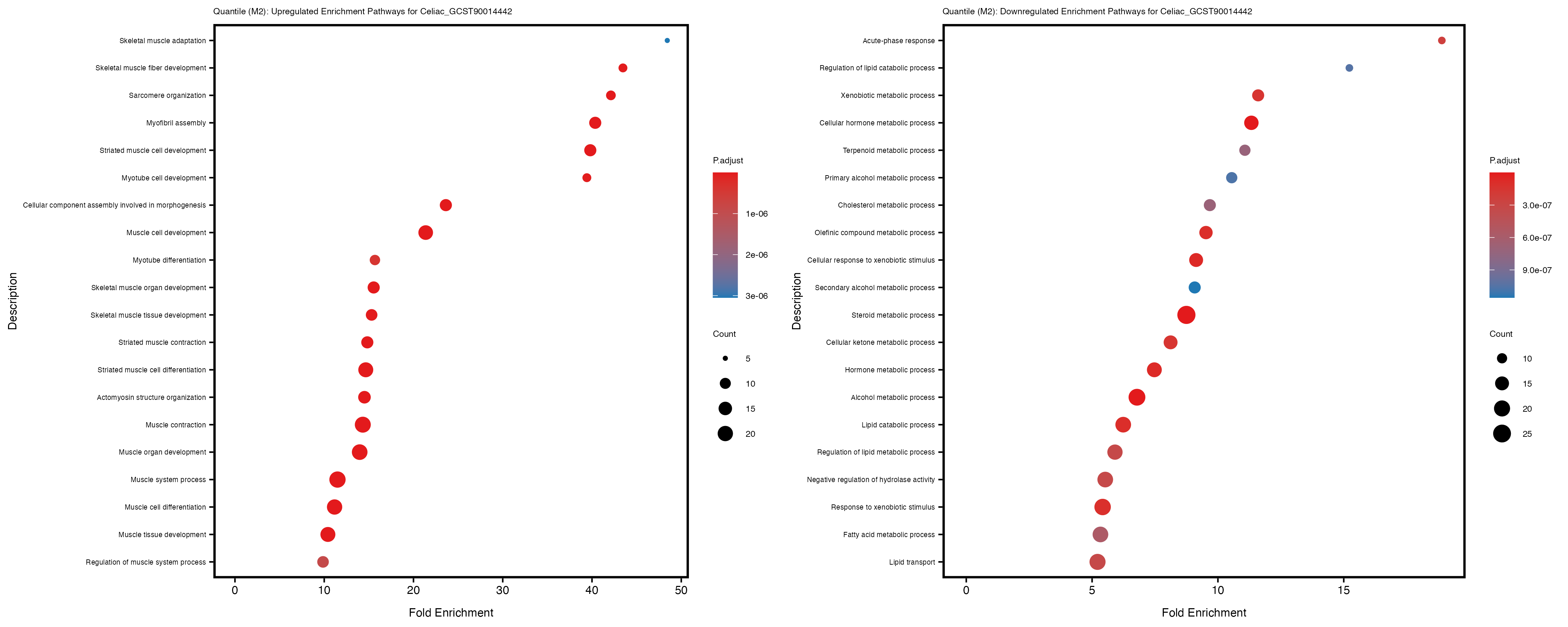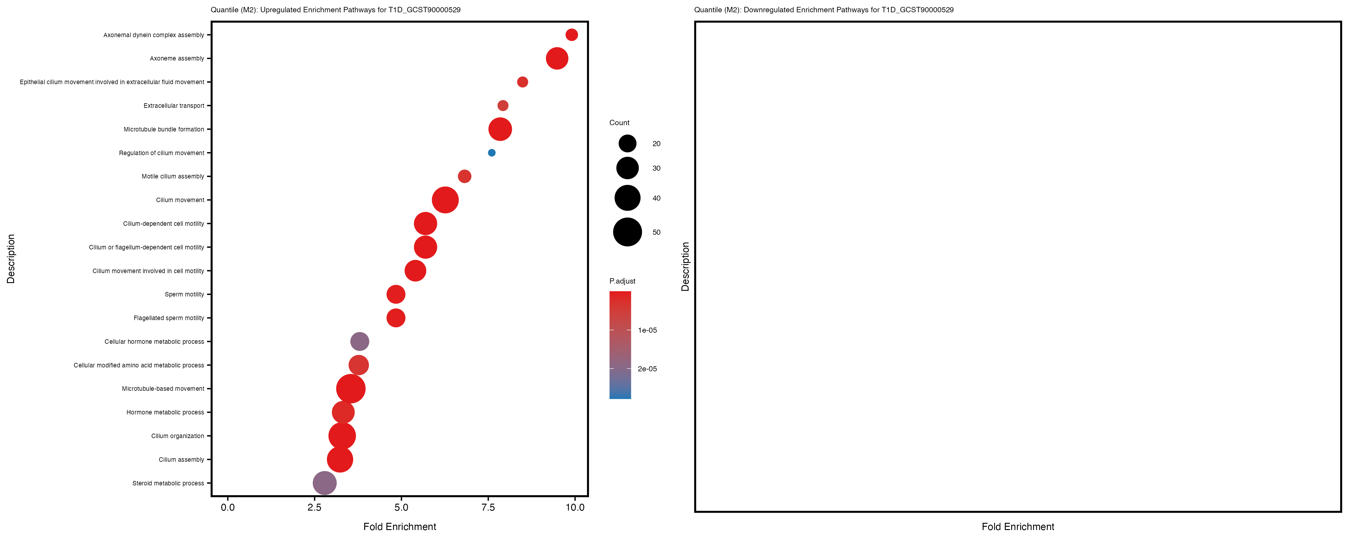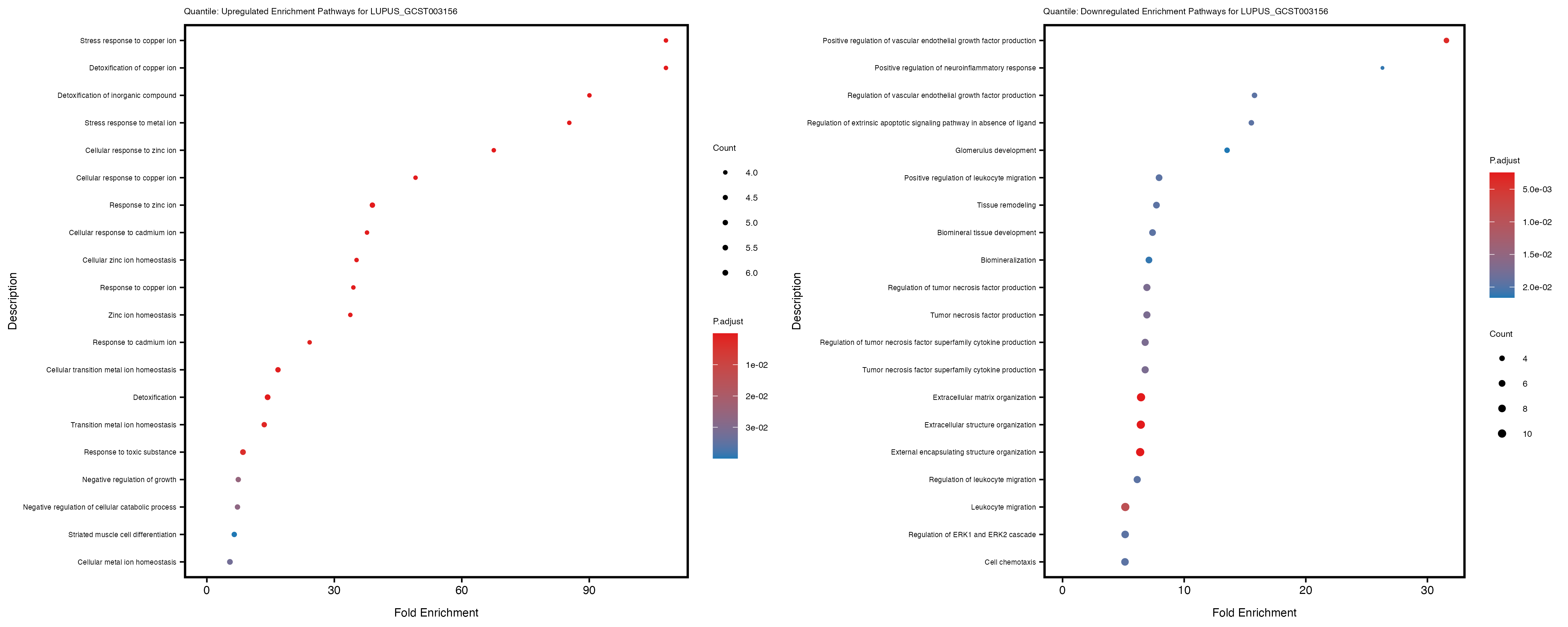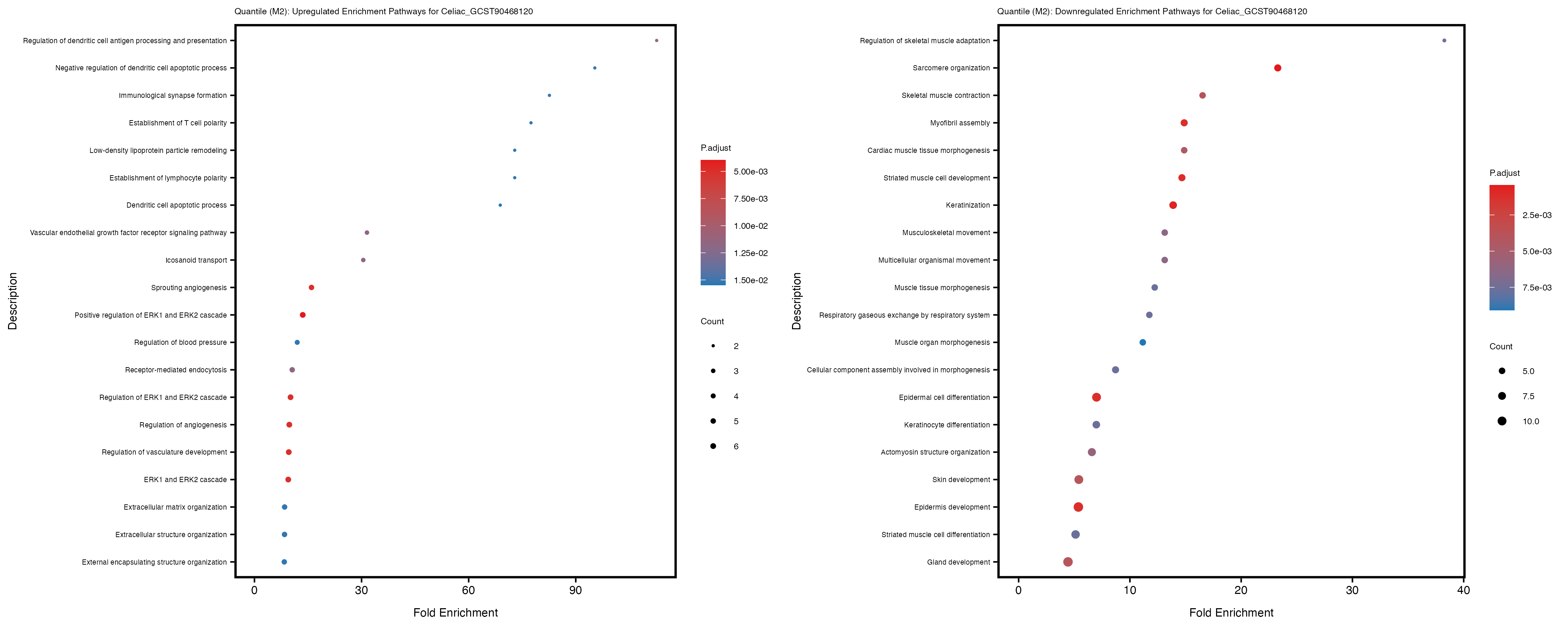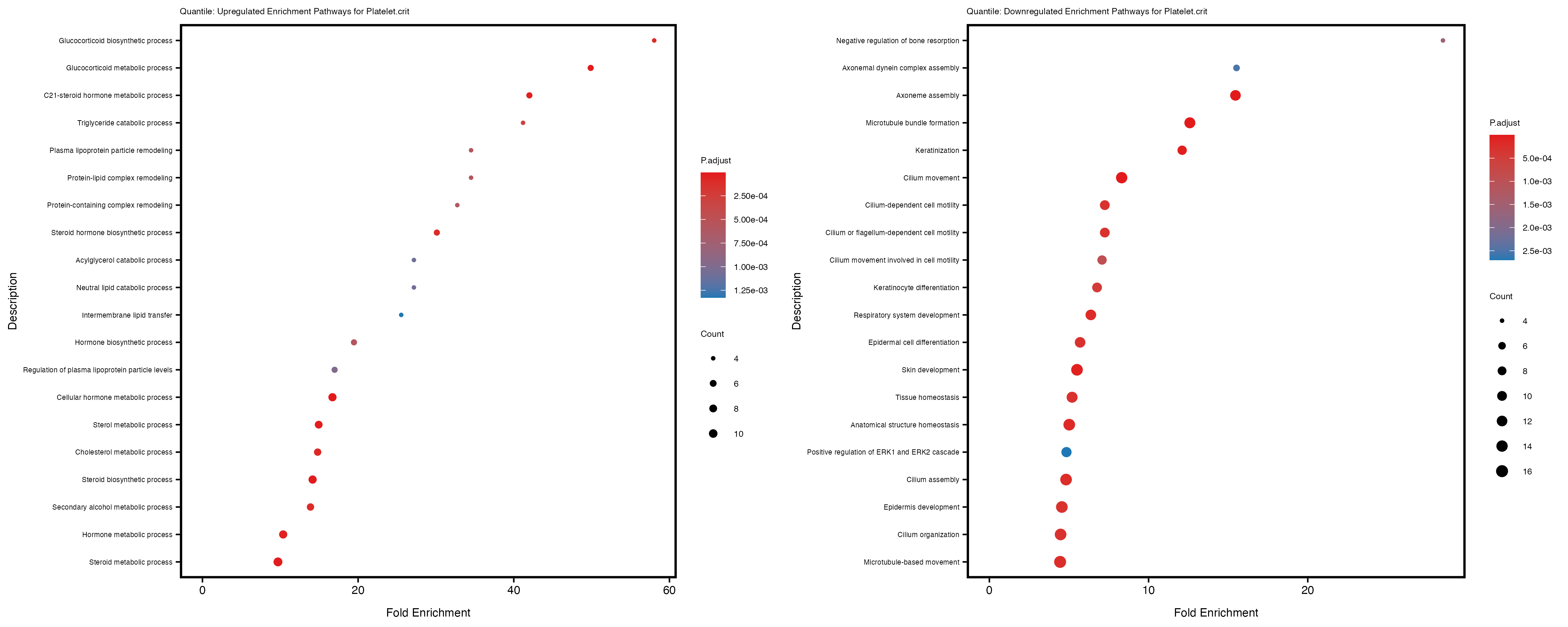 Additionally, the GO enrichment analysis provides insights into the biological pathways and processes that are potentially involved in these traits. BgRatio is the ratio of the total number of genes in a specific pathway (GO term) to the total number of genes. GeneRatio is the ratio of the number of genes enriched in specific pathway to the number of genes that were tested in the analysis. FoldEnrichment is the ratio of GeneRatio to BgRatio, showing how much more enriched a pathway is in your genes of interest compared to the total gene set. Higher FoldEnrichment values indicate that a particular GO term is overrepresented in your gene set compared to the general gene pool, suggesting it may be biologically relevant for the trait. Some traits show higher pathway enrichment in the quantile analysis, indicating that stratification by PRS may provide more biologically meaningful results.