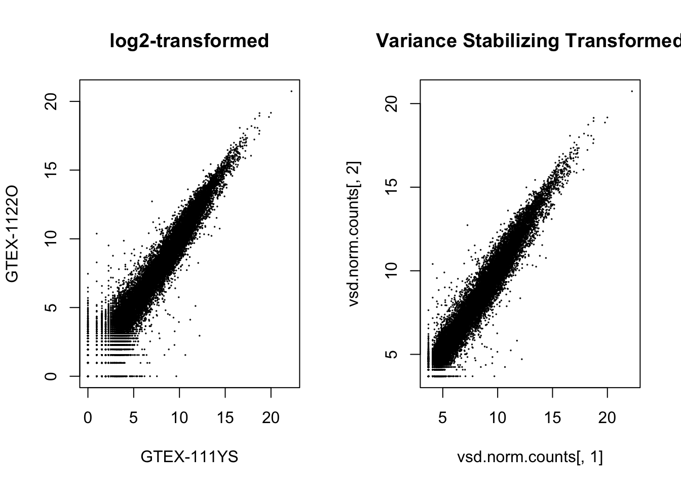 plot(vsd.norm.counts[,1], vsd.norm.counts[,2], cex=.1, main = "Variance Stabilizing Transformed",
