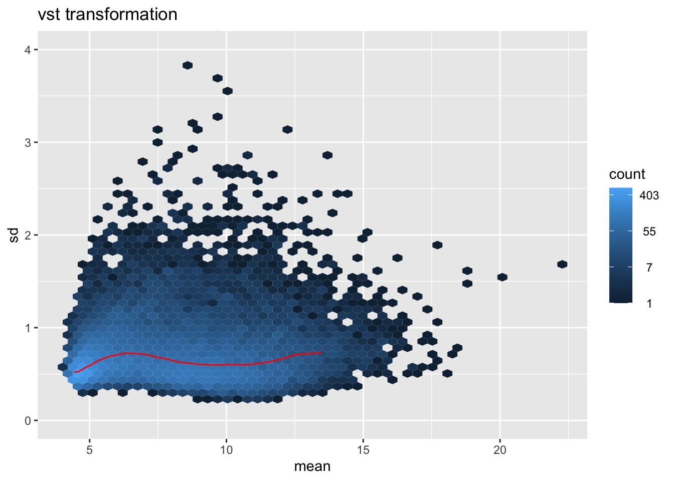 msd_plot <- vsn::meanSdPlot(vsd.norm.counts, ranks=FALSE, plot = FALSE)