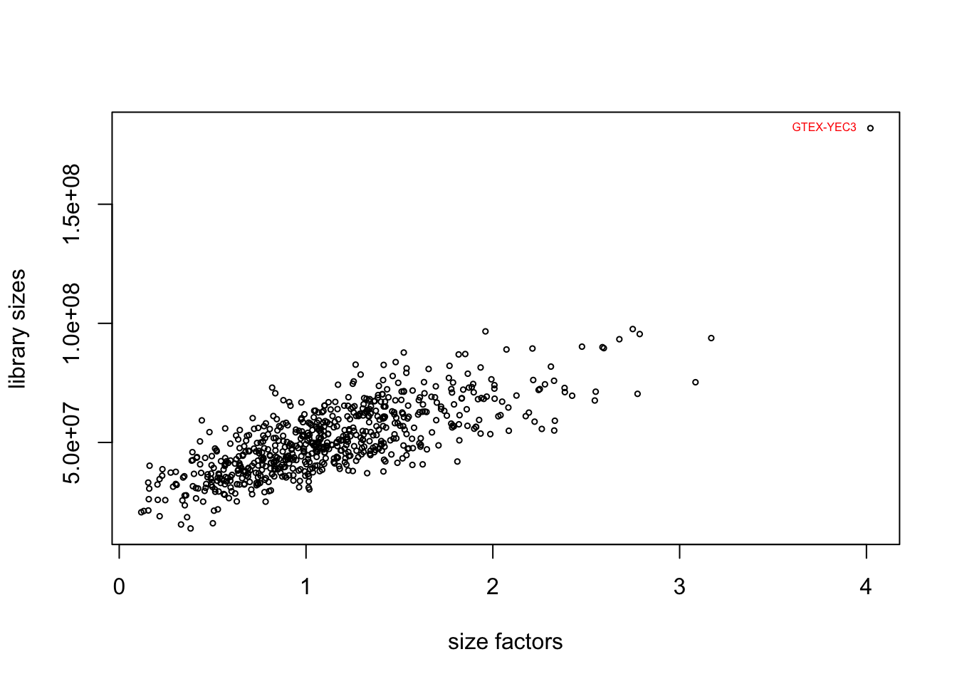 The plot suggests a positive correlation between the library sizes and size factors, indicating that samples with higher total counts tend to have higher size factors. The sample GTEX-YEC3 is an outlier. GTEX-YEC3 may have significantly different sequencing characteristics, leading to a higher library size and size factor compared to the other samples.