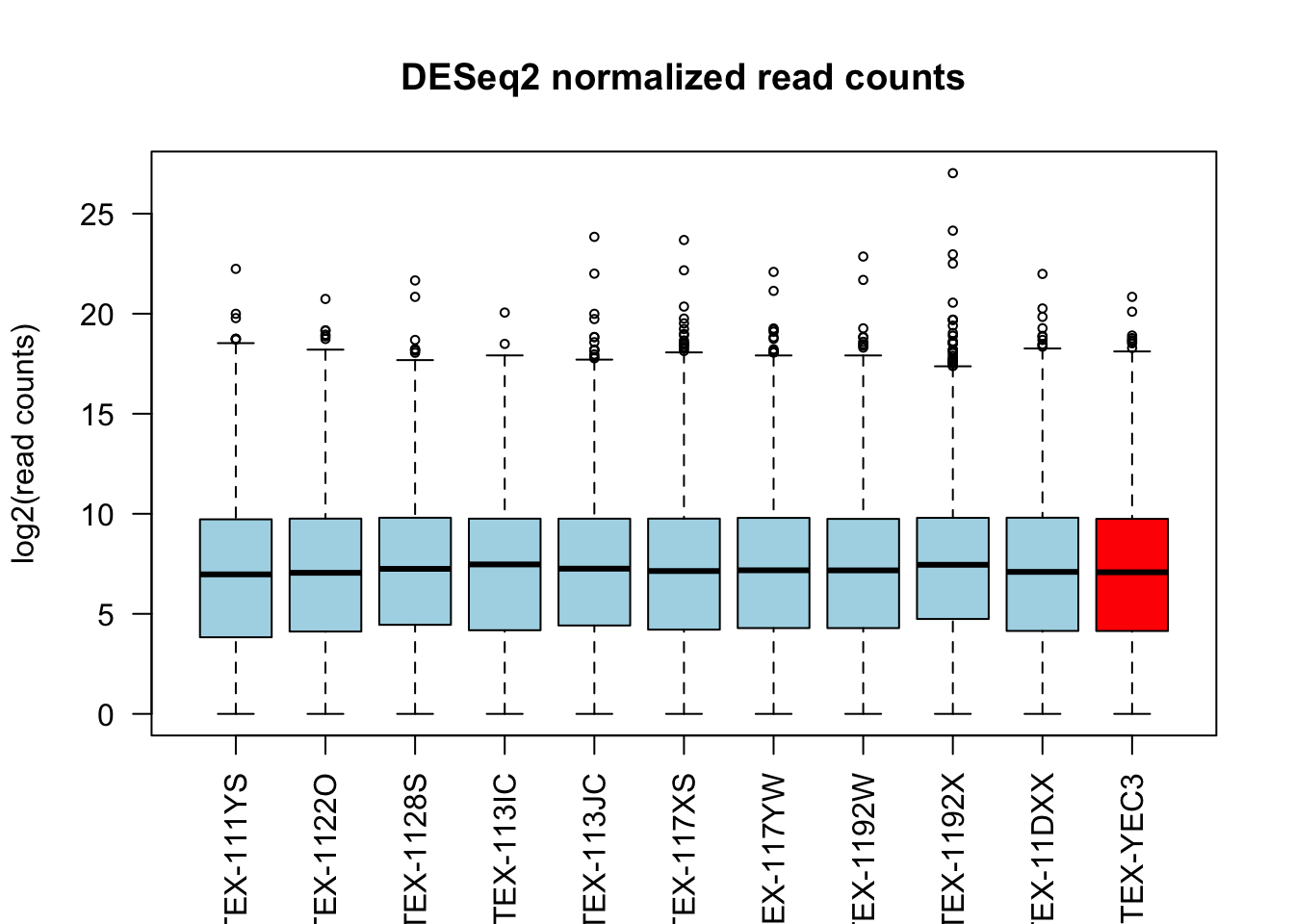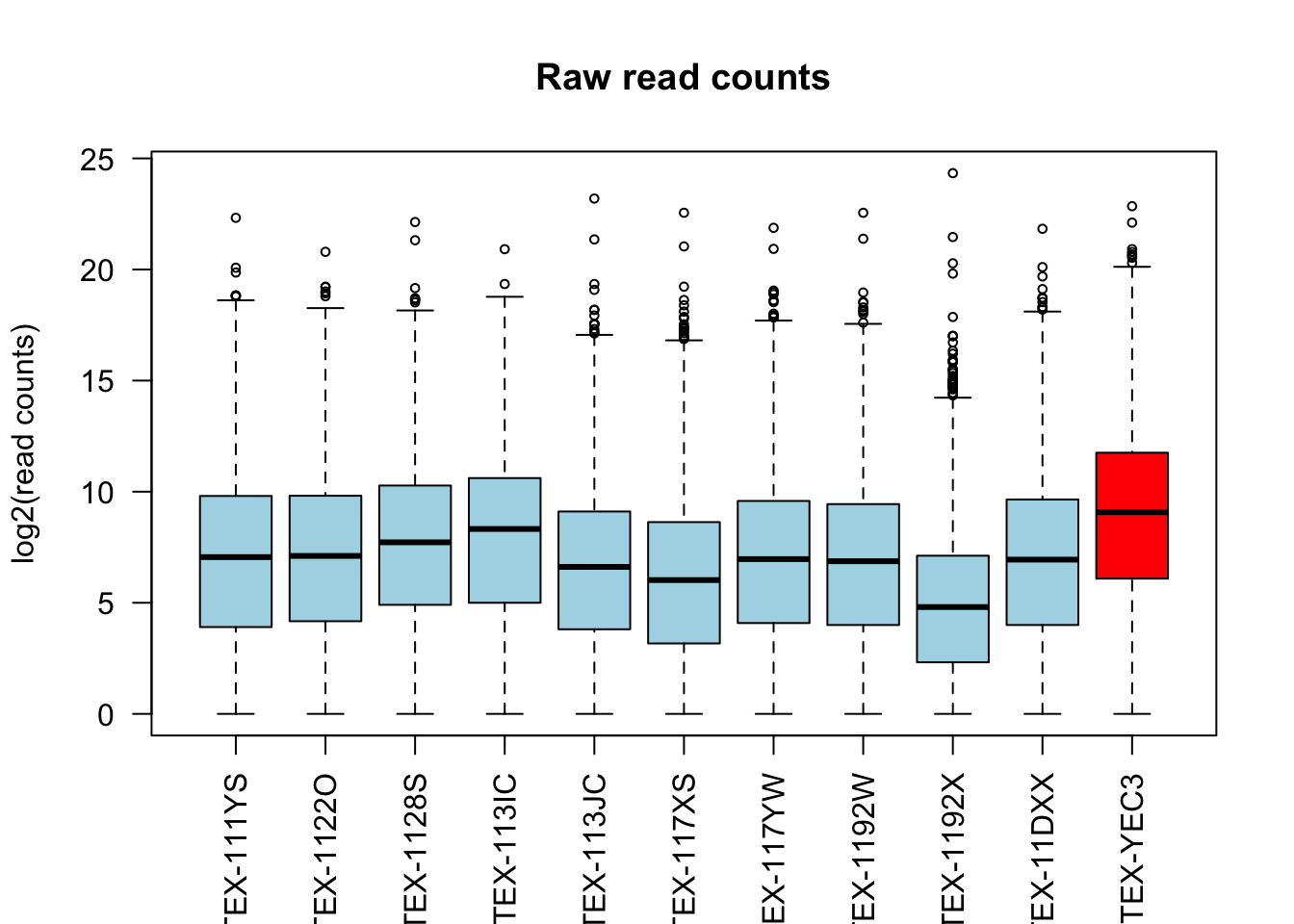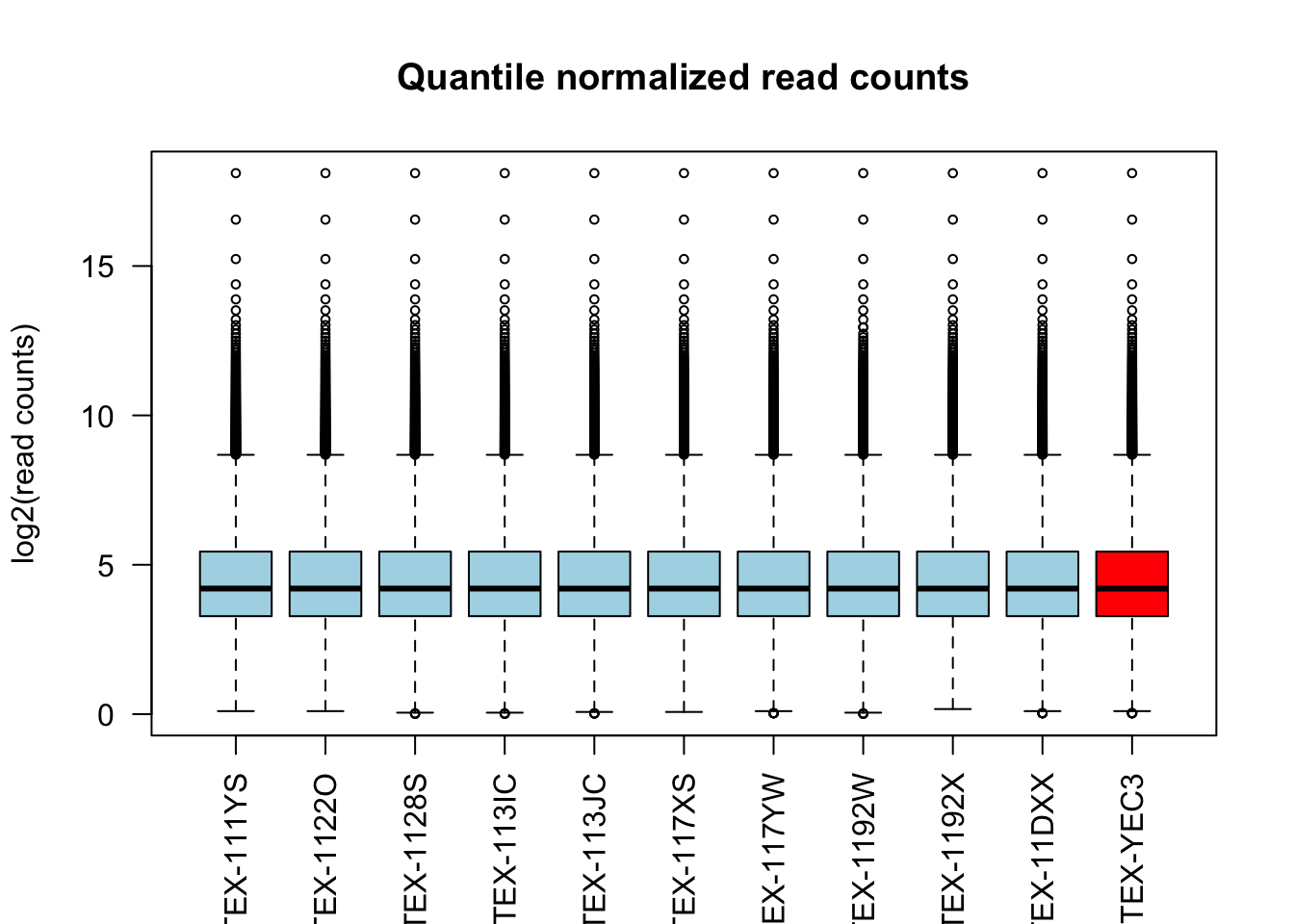 boxplot(log2(qn_counts + 1)[, c(1:10, outliers)],