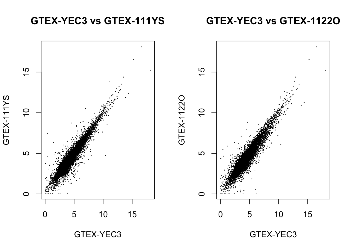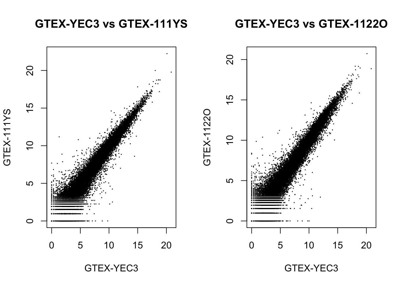 main = "GTEX-YEC3 vs GTEX-111YS", xlab = "GTEX-YEC3", ylab = "GTEX-111YS")