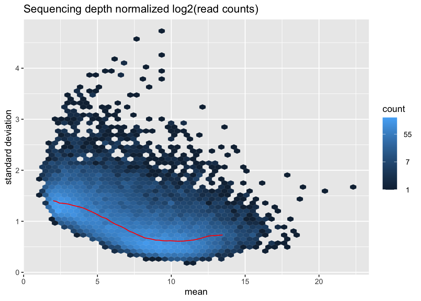 From the DESeq2 normalization plot, we see a fanning out pattern for points before \(2^5 = 32\), suggesting that read counts correlate less well when they are low. The observation also implies that the standard deviation of the expression levels may depend on the mean: the lower the mean read counts per gene, the higher the standard deviation.